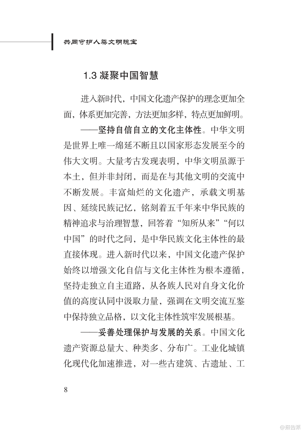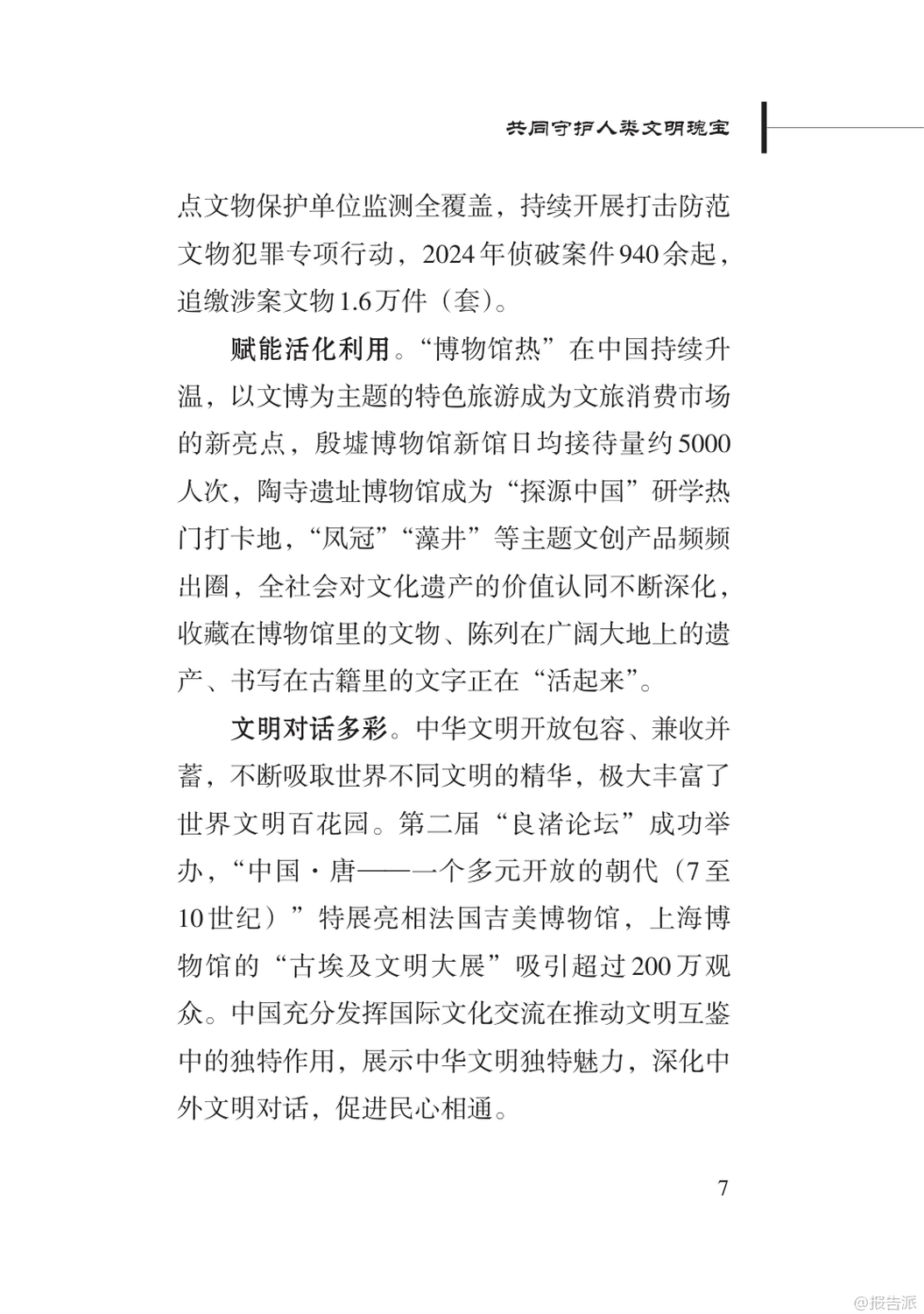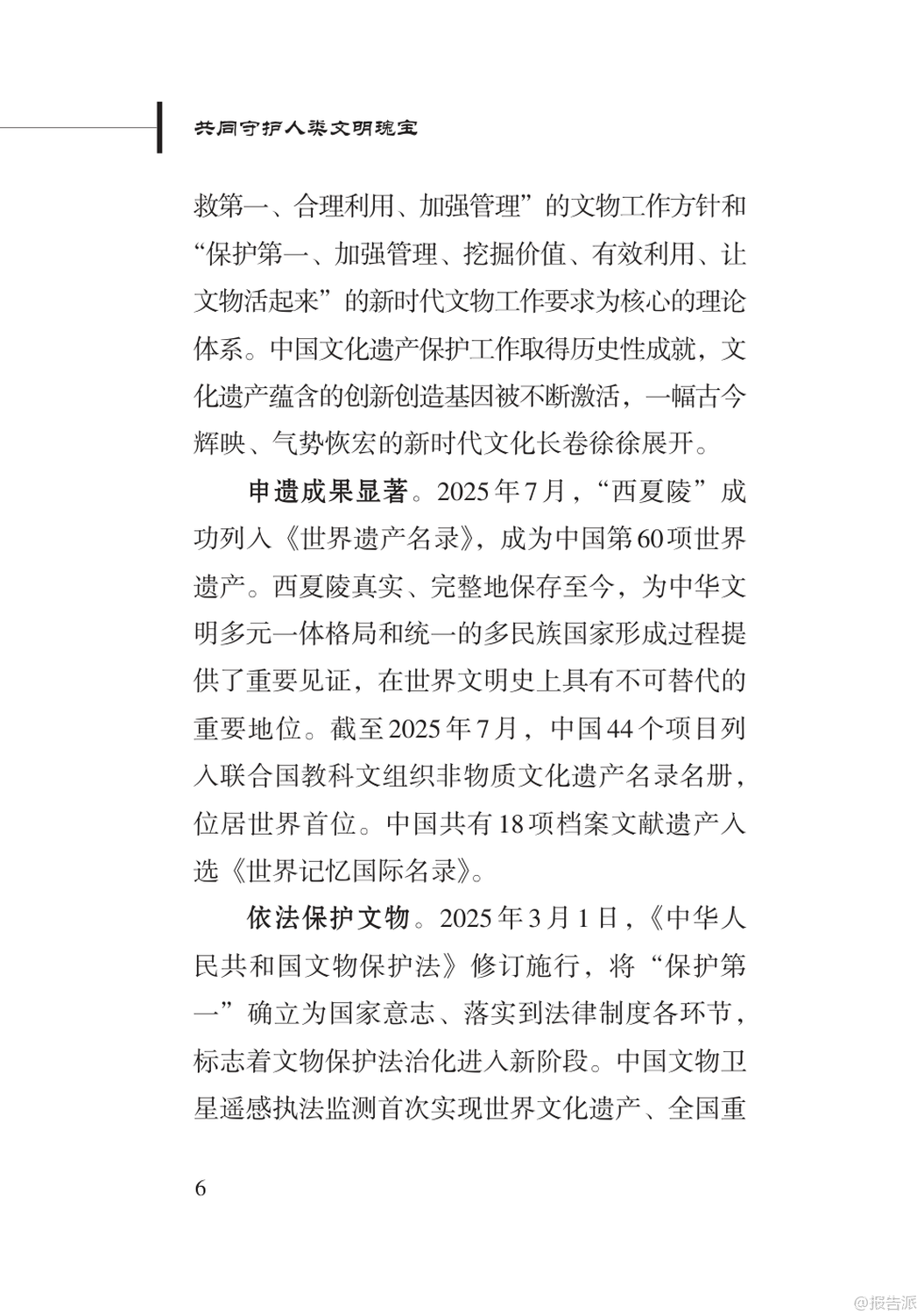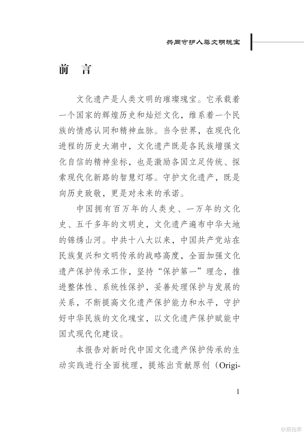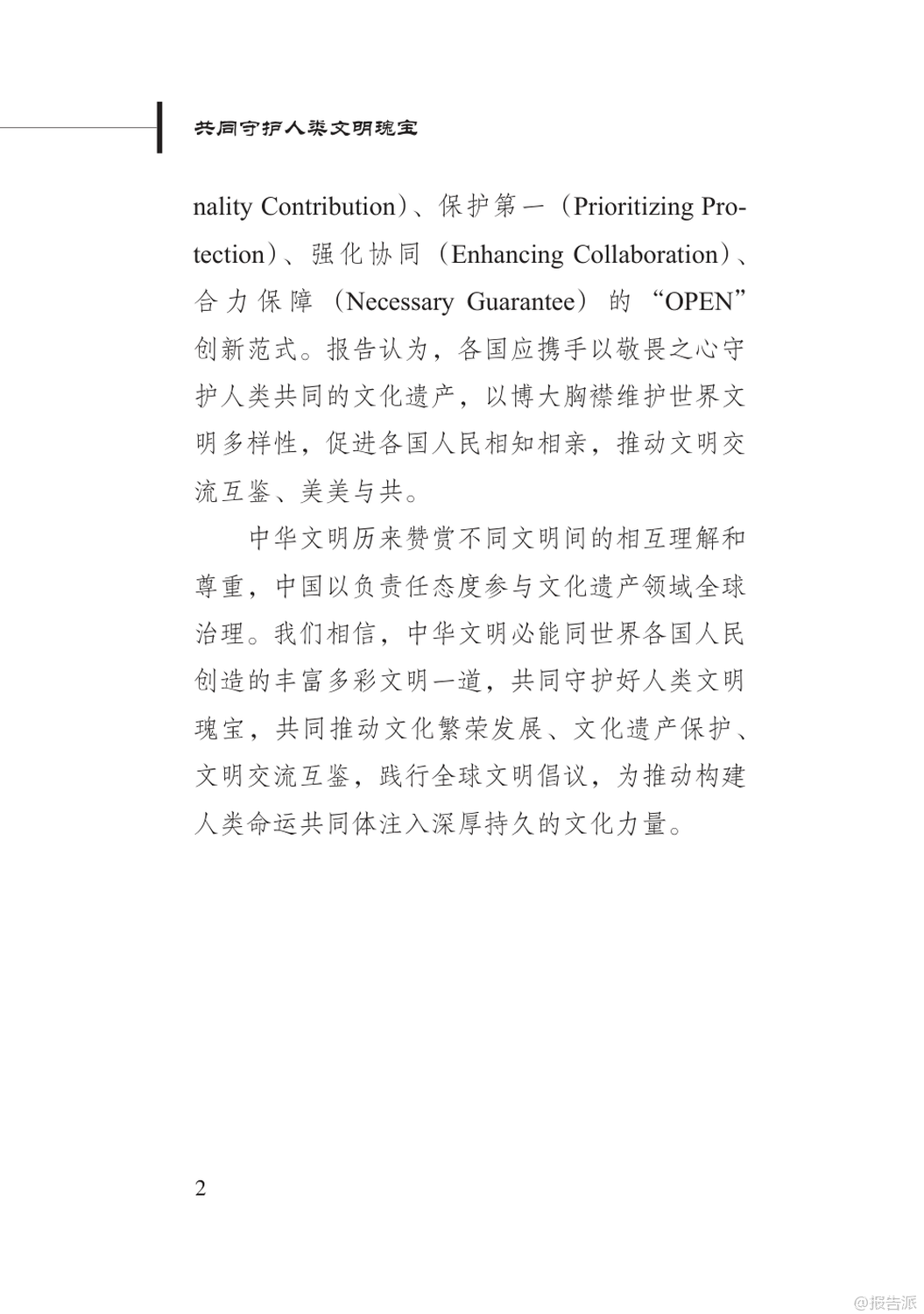 | 在新时代背景下,中国文化遗产保护事业正迈向系统化、科技化与全民共享的新阶段。 这份由新华社研究院发布的《共同守护人类文明瑰宝——新时代中国文化遗产保护的理念与实践》报告,全面梳理了党的十八大以来我国在文化遗产保护领域的理念创新与生动实践,提炼出“OPEN”创新范式,即贡献原创(Originality Contribution)、保护第一(Prioritizing Protection)、强化协同(Enhancing Collaboration)、合力保障(Necessary Guarantee),为全球文化遗产保护贡献了可复制、可推广的中国方案。 报告指出,中国作为文化遗产大国,拥有76万多处不可移动文物、1.08亿件(套)国有可移动文物,非遗资源总量近87万项。 近年来,中国坚持“保护为主、抢救第一、合理利用、加强管理”的文物工作方针,推动文化遗产从“静态保存”走向“活态传承”。 2025年《中华人民共和国文物保护法》修订施行,首次将“保护第一”写入法律,确立“先考古、后出让”等保护前置机制,构建起层次分明、重点突出的法治体系。 同年,“西夏陵”成功列入《世界遗产名录》,中国世界遗产总数达60项,非遗项目以44项居全球首位,彰显出中国文化遗产的国际影响力。 在实践层面,中国积极探索文化遗产与现代生活的融合路径。 通过“博物馆热”“文博+旅游”“非遗+研学”等模式,让文物“活起来”。 殷墟博物馆新馆日均接待超5000人次,舞蹈诗剧《只此青绿》、电视节目《唐宫夜宴》火爆出圈,北京中轴线、大运河、长城等文化遗产成为城市文化名片。 科技赋能也成为一大亮点,“数字敦煌”“元境博域”文旅元宇宙、AI文物修复系统等新技术广泛应用,实现文化遗产的数字化留存与沉浸式传播。 三星堆考古运用深海探测技术,鼓浪屿、西安等多地建立文化遗产数字化档案库,推动保护工作迈向智能化。 更值得关注的是,中国将文化遗产保护融入国家战略,推动成果全民共享。 通过“先考古、后出让”“避开老城建新城”等模式,实现保护与发展的动态平衡。 平遥古城、苏州平江历史街区、景德镇陶溪川等案例显示,文化遗产正成为乡村振兴、城市更新的重要引擎。 凤堰古梯田移民生态博物馆、喀什古城非遗工坊等项目,让居民在家门口增收,实现文化传承与民生改善双赢。 报告还强调中国在全球文化遗产治理中的责任担当。 中国已从遗产保护的“参与者”转变为“引领者”,在柬埔寨、尼泊尔、乌兹别克斯坦等国实施文物修复援助项目,牵头成立亚洲文化遗产保护联盟,设立“中国信托基金(泉州)”支持非洲遗产保护,并与多国联合申遗,推动文明交流互鉴。 这不仅体现了“守护全人类共同珍宝”的天下情怀,也为构建人类命运共同体注入文化力量。 总体而言,这份报告系统展现了新时代中国文化遗产保护的顶层设计、实践路径与世界意义,标志着中国正以高度的文化自觉与制度创新,书写文明传承的当代答卷。 出品方:新华社 发布时间:2025年 文档页数:65页