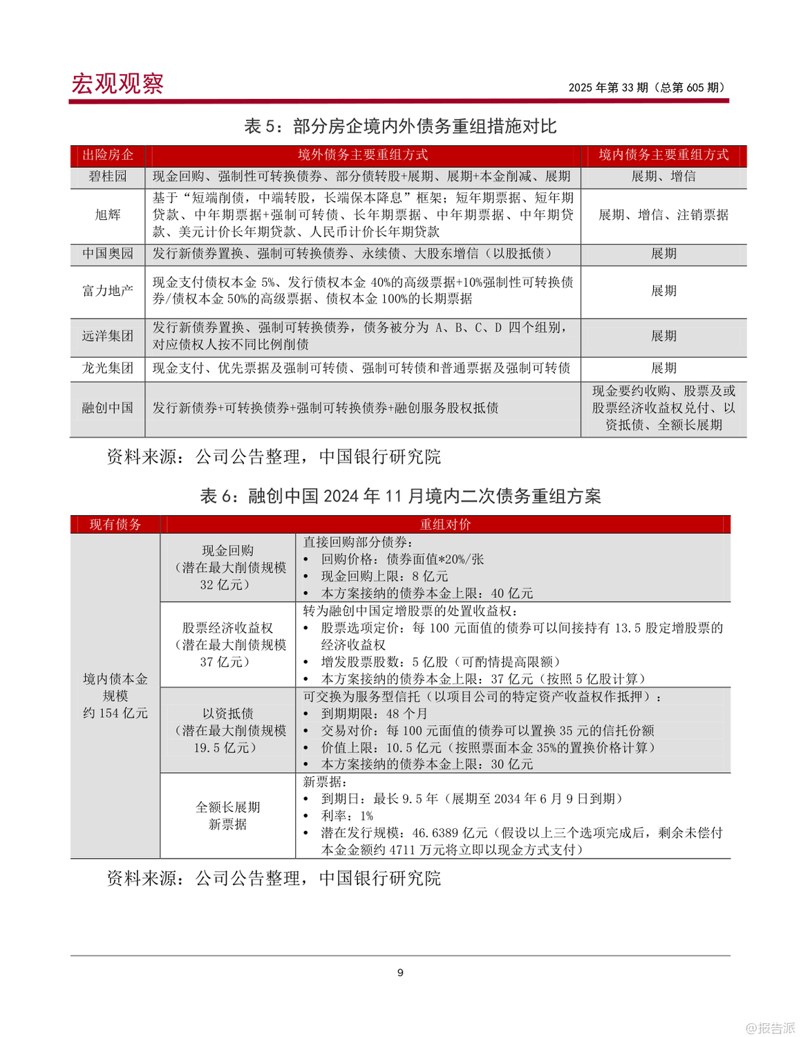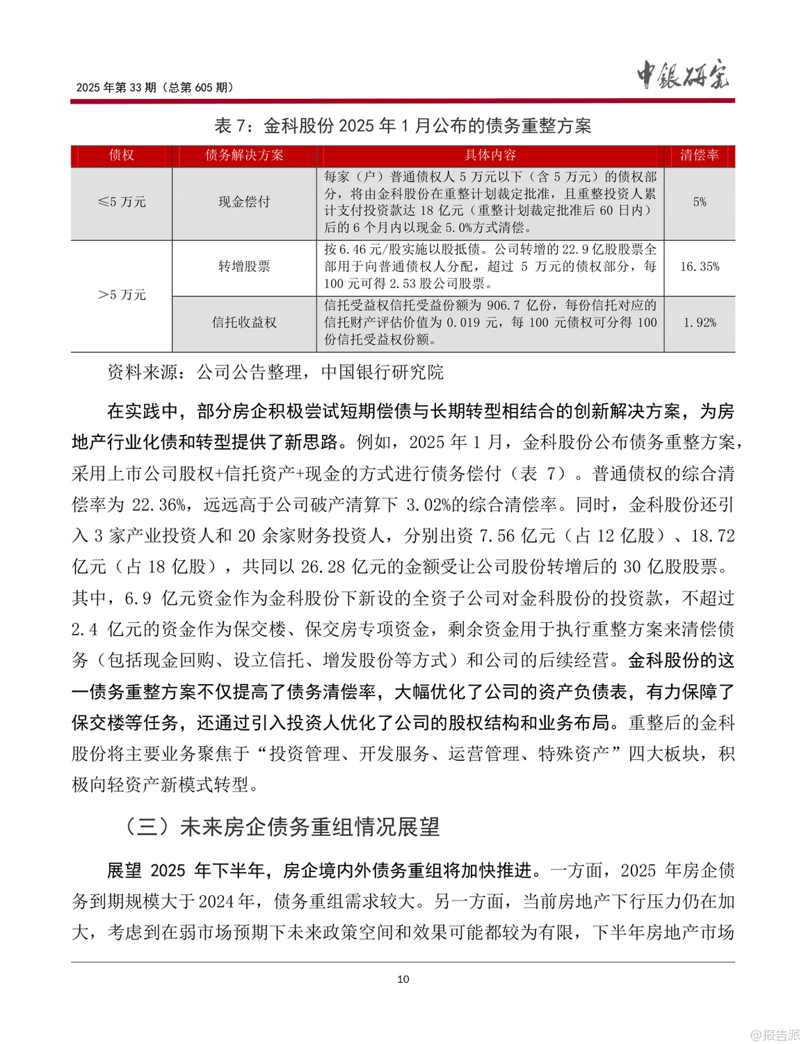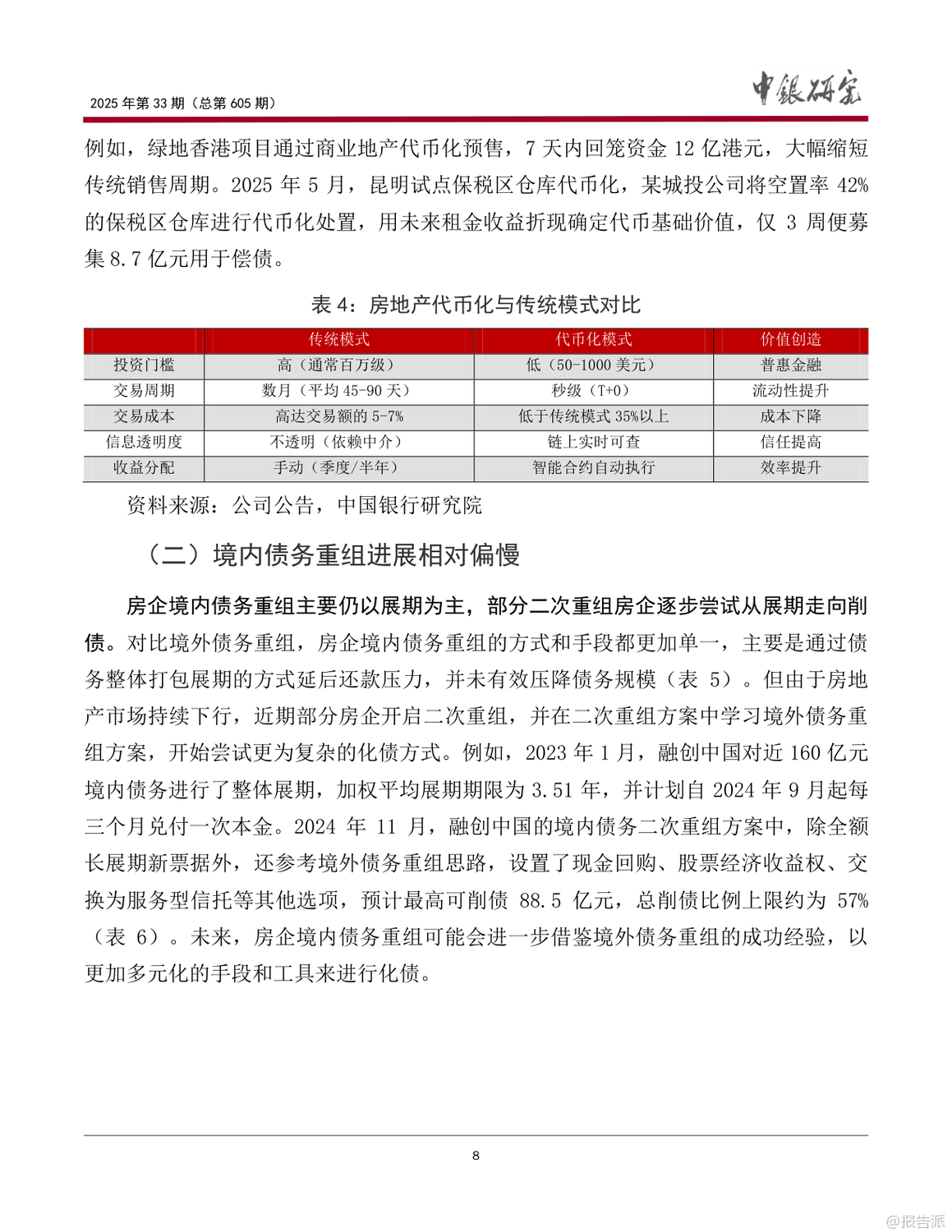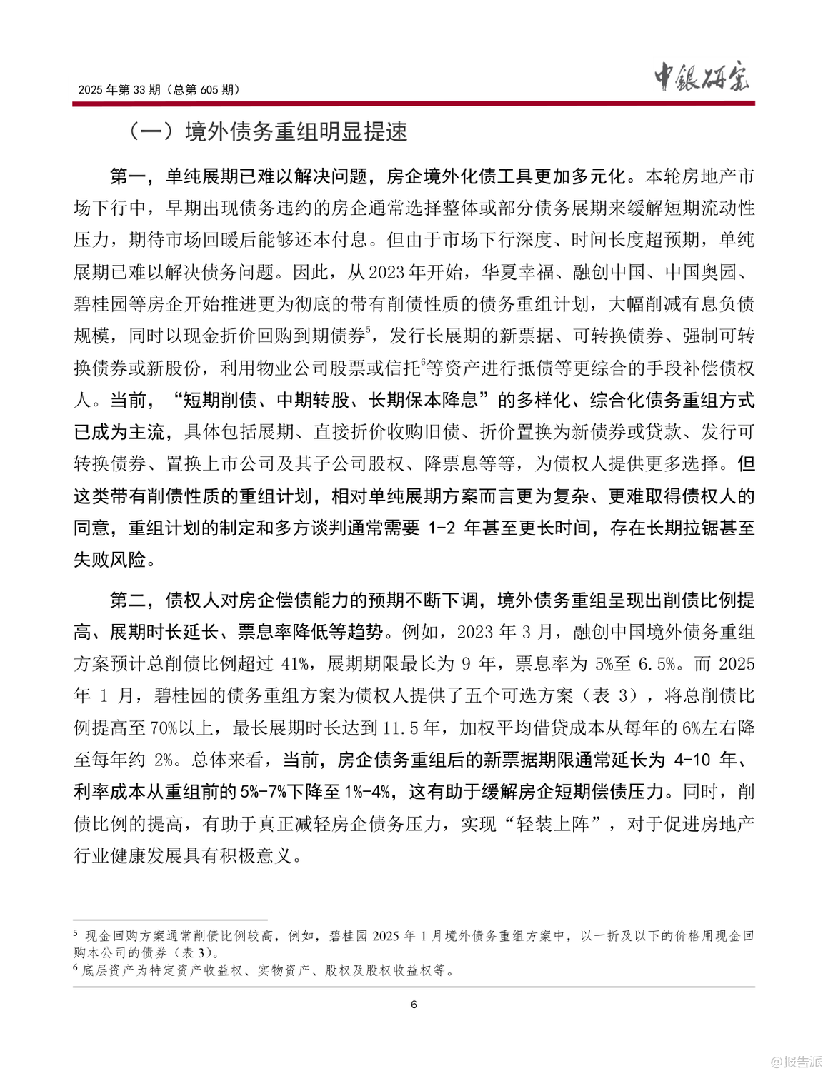 | 2025年,我国房地产行业仍处于深度调整期,房企信用风险持续暴露,债务到期高峰叠加融资环境收紧,流动性压力显著加剧。 根据中银研究院发布的最新报告,2025年房企债券到期规模达5257亿元,高于2024年的4828亿元,其中第三季度为偿债高峰期,到期金额约1574亿元。 在此背景下,房企债务重组进程明显加快,尤其是境外债务重组呈现多元化、深度化趋势。 当前房企融资整体仍处收缩状态。 2025年1-8月,房地产企业到位资金同比下降8%,销售下滑持续拖累现金流。 尽管国内贷款小幅增长0.2%,主要得益于“白名单”制度、开发贷支持及经营性物业贷款等政策推动,但债券与股权融资依旧低迷。 1-7月,65家典型房企融资总额同比减少26.6%,境内债发行成本虽降至2.63%,但民企融资难度依然巨大;境外债发行规模仅259亿元,净偿还达1176亿元,且融资成本反弹至8.6%,远高于历史平均水平,反映出市场对房企偿债能力的信心不足。 面对严峻的偿债压力,越来越多房企启动债务重组。 截至2025年8月,已有42家房企披露重组进展,其中16家已完成部分或全部重组方案。 境外重组方面,已从早期的简单展期转向“削债+转股+降息+展期”组合模式。 以碧桂园为例,其2025年1月提出的境外债重组方案涵盖现金回购(削债超90%)、强制可转债、债转股、本金削减等多种选项,整体削债比例超70%,最长展期达11.5年,加权平均利率降至约2%。 融创中国也完成近百亿美元境外债重组,推行“全额债权转股权”,凸显债转股正成为主流化债工具。 与此同时,资产代币化等金融创新开始崭露头角。 通过区块链技术将不动产权益数字化,提升流动性、降低投资门槛,已在绿地香港、昆明城投等项目中实现快速回款,为房企开辟了新型融资路径。 相较之下,境内债务重组进展偏慢,仍以展期为主,缺乏实质性债务压降。 但部分企业如融创中国、金科股份已开启二次重组,尝试引入现金回购、股票收益权、服务型信托等多元手段。 金科股份通过“现金+股权+信托”三位一体方案,综合清偿率达22.36%,远高于破产清算的3.02%,并引入产业与财务投资人注资26.28亿元,推动业务向轻资产模式转型。 展望下半年,随着市场预期进一步走弱,债权人对房企偿债能力的判断将持续下调,预计债务重组将呈现“削债幅度更大、利率更低、展期更长”的特征。 然而,当前重组多缓解短期流动性压力,尚难根本修复房企造血能力。 若销售无法回暖、经营性现金流不能转正,仍存二次违约风险。 报告建议:房企应统筹短期化债与长期转型,加快资产处置、优化业务结构;债权人需理性调整回收预期,避免僵持导致更大损失;金融机构应发挥AMC专业优势,探索共益债、置换债等工具;政府则需加大税费减免、信息共享与政策协同力度,构建高效、透明的债务化解机制,助力行业实现软着陆与新模式转型。 出品方:中银研究院 发布时间:2025年