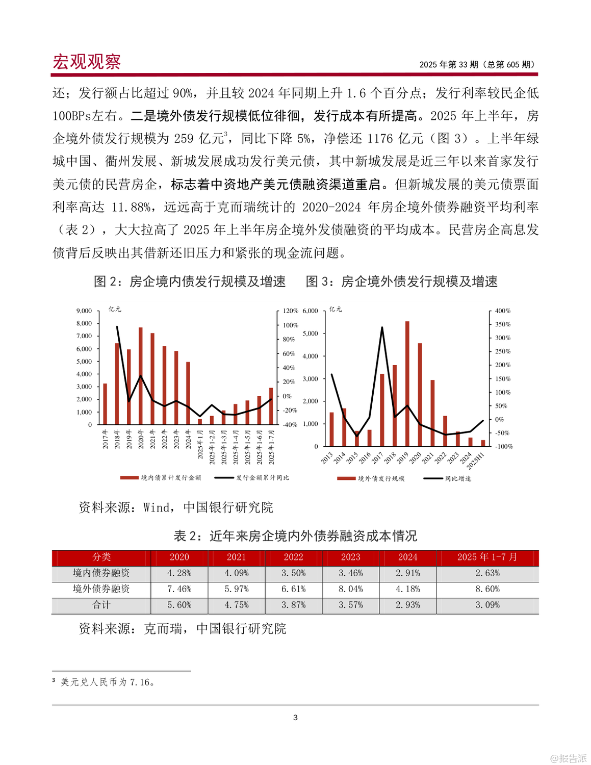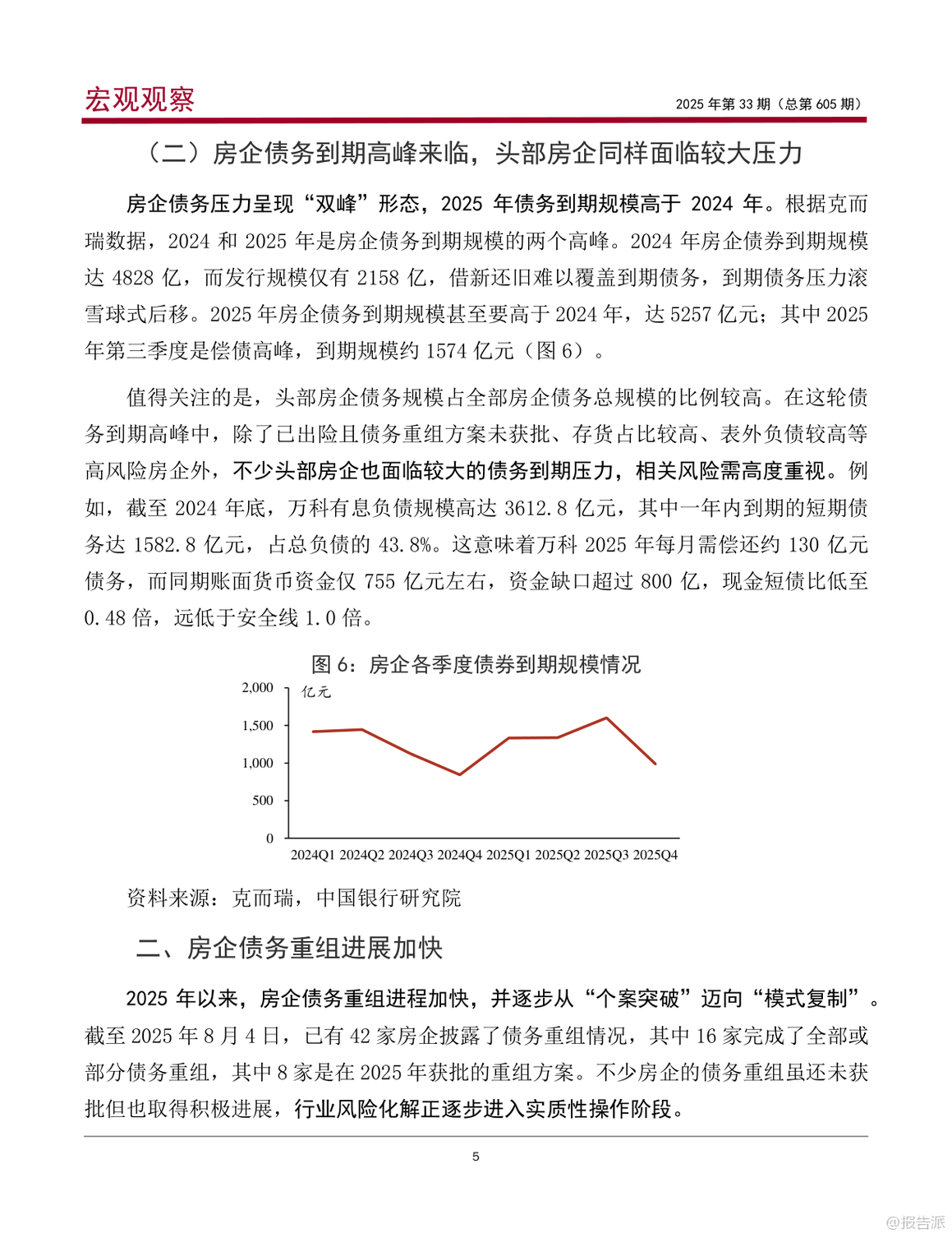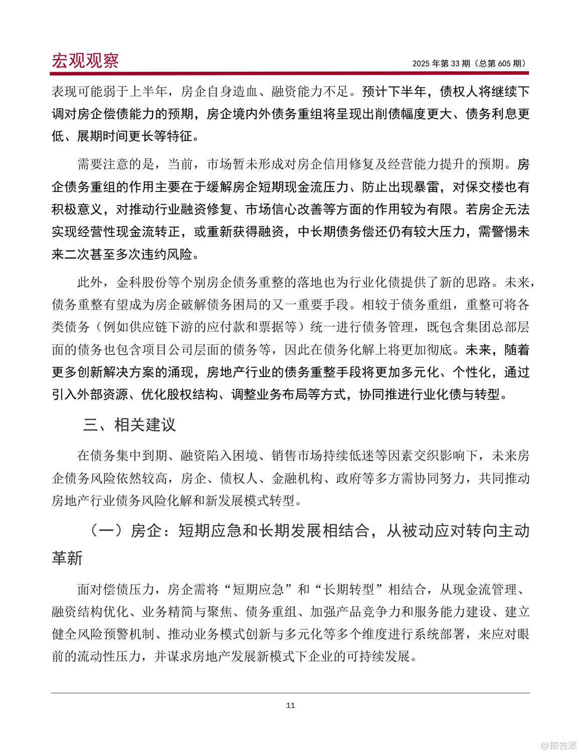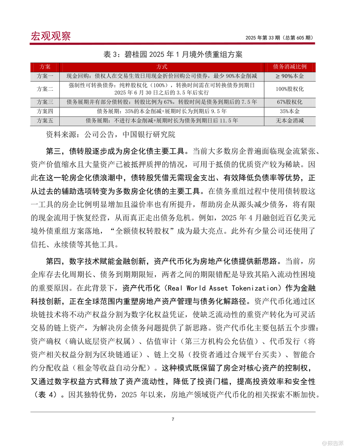 | 2025年,我国房地产行业仍处于深度调整期,房企信用风险持续暴露,债务到期高峰叠加融资环境收紧,流动性压力显著加剧。 根据中银研究院发布的最新报告,2025年房企债券到期规模达5257亿元,高于2024年的4828亿元,其中第三季度为偿债高峰期,到期金额约1574亿元。 在此背景下,房企债务重组进程明显加快,尤其是境外债务重组呈现多元化、深度化趋势。 当前房企融资整体仍处收缩状态。 2025年1-8月,房地产企业到位资金同比下降8%,销售下滑持续拖累现金流。 尽管国内贷款小幅增长0.2%,主要得益于“白名单”制度、开发贷支持及经营性物业贷款等政策推动,但债券与股权融资依旧低迷。 1-7月,65家典型房企融资总额同比减少26.6%,境内债发行成本虽降至2.63%,但民企融资难度依然巨大;境外债发行规模仅259亿元,净偿还达1176亿元,且融资成本反弹至8.6%,远高于历史平均水平,反映出市场对房企偿债能力的信心不足。 面对严峻的偿债压力,越来越多房企启动债务重组。 截至2025年8月,已有42家房企披露重组进展,其中16家已完成部分或全部重组方案。 境外重组方面,已从早期的简单展期转向“削债+转股+降息+展期”组合模式。 以碧桂园为例,其2025年1月提出的境外债重组方案涵盖现金回购(削债超90%)、强制可转债、债转股、本金削减等多种选项,整体削债比例超70%,最长展期达11.5年,加权平均利率降至约2%。 融创中国也完成近百亿美元境外债重组,推行“全额债权转股权”,凸显债转股正成为主流化债工具。 与此同时,资产代币化等金融创新开始崭露头角。 通过区块链技术将不动产权益数字化,提升流动性、降低投资门槛,已在绿地香港、昆明城投等项目中实现快速回款,为房企开辟了新型融资路径。 相较之下,境内债务重组进展偏慢,仍以展期为主,缺乏实质性债务压降。 但部分企业如融创中国、金科股份已开启二次重组,尝试引入现金回购、股票收益权、服务型信托等多元手段。 金科股份通过“现金+股权+信托”三位一体方案,综合清偿率达22.36%,远高于破产清算的3.02%,并引入产业与财务投资人注资26.28亿元,推动业务向轻资产模式转型。 展望下半年,随着市场预期进一步走弱,债权人对房企偿债能力的判断将持续下调,预计债务重组将呈现“削债幅度更大、利率更低、展期更长”的特征。 然而,当前重组多缓解短期流动性压力,尚难根本修复房企造血能力。 若销售无法回暖、经营性现金流不能转正,仍存二次违约风险。 报告建议:房企应统筹短期化债与长期转型,加快资产处置、优化业务结构;债权人需理性调整回收预期,避免僵持导致更大损失;金融机构应发挥AMC专业优势,探索共益债、置换债等工具;政府则需加大税费减免、信息共享与政策协同力度,构建高效、透明的债务化解机制,助力行业实现软着陆与新模式转型。 出品方:中银研究院 发布时间:2025年