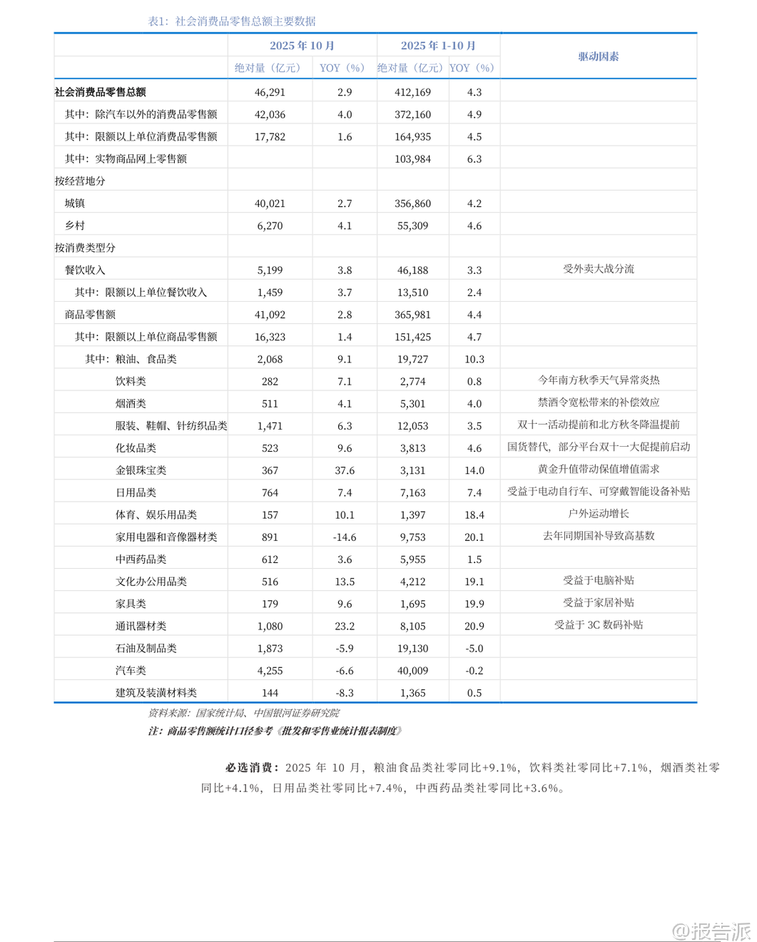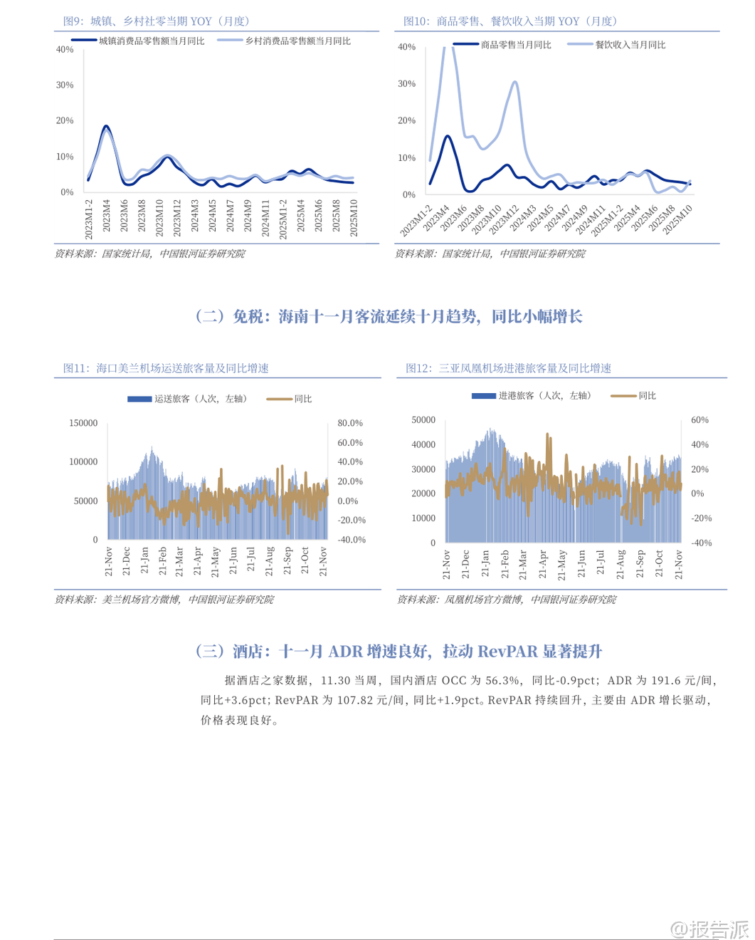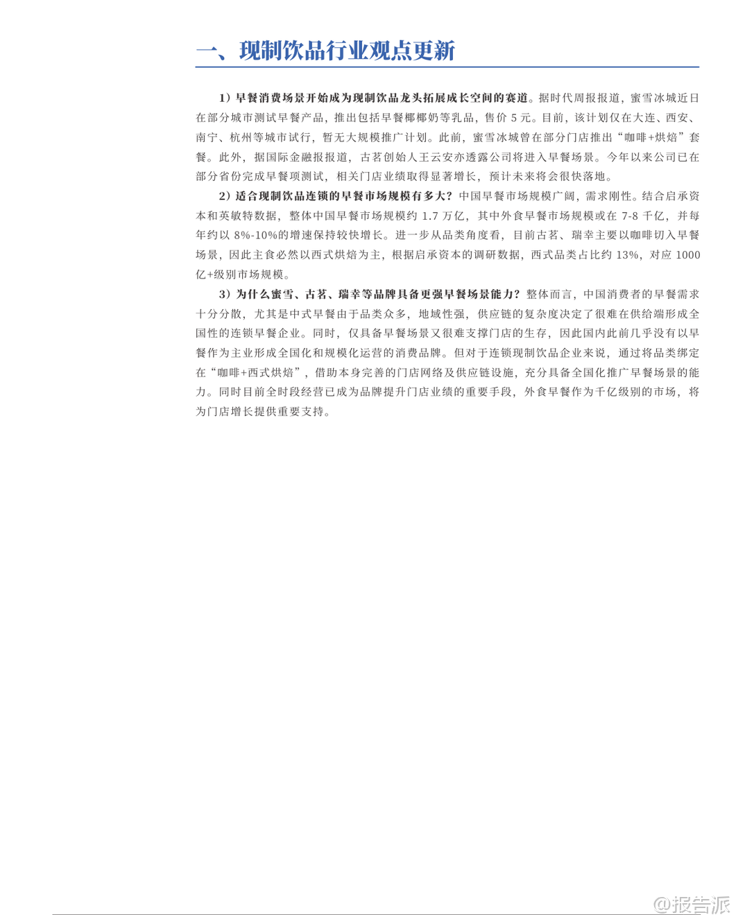 | 2025年12月,银河证券发布《社会服务行业12月投资前瞻》报告,聚焦现制饮品、免税、酒店、餐饮等多个细分领域的最新动态与投资机会。 整体来看,社服行业本月上涨1.23%,其中酒店餐饮板块表现亮眼,涨幅达8.73%,教育板块上涨4.28%,而旅游及景区、专业服务则表现平平或回调。 核心观点之一是现制饮品企业正加速布局早餐市场,成为新的增长突破口。 蜜雪冰城已在大连、西安、南宁、杭州等城市试点推出“早餐椰椰奶”等乳品,售价仅5元,并曾尝试“咖啡+烘焙”套餐;古茗创始人王云安也明确表示将进入早餐赛道,相关测试门店业绩已显著提升。 瑞幸则持续以“咖啡+西式烘焙”模式切入该场景。 这一趋势的背后,是中国庞大的早餐消费市场支撑——据启承资本和英敏特数据,中国早餐市场规模约1.7万亿元,外食早餐规模达7000~8000亿元,年增速8%~10%。 其中,适合连锁茶饮品牌的“咖啡+西式烘焙”品类市场规模超千亿元。 为何茶饮品牌更具优势?报告指出,中式早餐地域性强、品类分散,供应链复杂,难以形成全国性连锁品牌;而茶饮企业依托已有的成熟门店网络、强大供应链体系以及全时段经营策略,能够高效复制“咖啡+西式烘焙”模式,实现规模化扩张。 此举不仅能提升单店坪效,也为品牌打开了千亿级的增量空间。 从行业数据看,2025年10月社会消费品零售总额同比增长2.9%,但增速持续放缓,主要受国补退坡影响。 必选消费中,粮油食品类增长9.1%,饮料类增长7.1%;可选消费中,金银珠宝类同比大增37.6%,显示保值需求旺盛,而家电类同比下降14.6%,受去年同期高基数影响明显。 线上零售仍保持领先,累计增速达9.6%。 在细分领域方面,海南离岛免税新政实施首周吸金5.06亿元,同比增长34.86%,显示出政策红利对消费的强劲拉动。 澳门博彩11月收入恢复至2019年同期的92.2%,创疫后新高,高端客群回流趋势明显。 酒店行业RevPAR(每间可售房收入)持续回升,主要由ADR(平均房价)增长驱动,价格表现良好,反映出商旅与休闲需求稳健。 餐饮门店扩张势头不减。 截至11月底,瑞幸咖啡门店达30283家,月增888家,同比增速高达40%;库迪咖啡达15964家,同比增81.6%;古茗达13391家,同比增39.2%;蜜雪冰城达43957家,稳居行业第一。 相比之下,霸王茶姬11月未新增门店,茶百道增速放缓至3.3%,反映行业竞争加剧下的分化格局。 演出与旅游市场持续回暖。 11月演出票房同比增长59.4%,观演人次增长76.5%,场次增长102%,尽管平均票价同比下降9.7%,但市场活跃度显著提升。 国内旅游方面,2025年三季度出游人次达17.13亿,同比增长13.3%,旅游花费1.7万亿元,同比增长4.9%。 多地推行“秋假”“雪假”制度,有效激活了传统淡季市场。 政策层面,国家推动基础设施REITs扩容至酒店、体育场馆等领域,为资产盘活提供新路径。 江苏发文支持体育企业上市,提振赛事经济。 文旅部强调推动非遗进景区、进街区,发展“跟着演出去旅行”等融合消费场景,促进供需适配。 资本市场方面,社服板块11月跑赢沪深300指数3.69个百分点,排名第9。 个股中,君亭酒店、科德教育、华住集团、沪上阿姨等涨幅居前,而安车检测、岭南控股、呷哺呷哺等出现回调。 港股通持仓数据显示,天立国际控股、同程旅行、古茗等获外资增持。 重点公司盈利预测显示,蜜雪集团、古茗、茶百道等茶饮品牌2025年PE估值普遍在10~30倍区间,具备较强成长性。 携程、同程旅行国际业务表现强劲,入境游预订量大幅增长,AI技术投入持续深化,长期竞争力稳固。 总体而言,社会服务行业在经历短期波动后展现出较强韧性。 茶饮龙头通过拓展早餐场景打开第二增长曲线,酒店与免税受益于出行复苏,演出与旅游需求稳步释放。 尽管面临宏观经济下行、竞争加剧等风险,但在政策支持与消费升级趋势下,具备强大运营能力和品牌势能的企业有望持续释放增长潜力。 本文由【报告派】研读,输出观点仅作为行业分析! 原文标题:原文标题:银河证券-社会服务行业12月投资前瞻:茶饮龙头拓展早餐场景,增长潜力有望释放 发布时间:2025年 报告出品方:银河证券 文档页数:49页