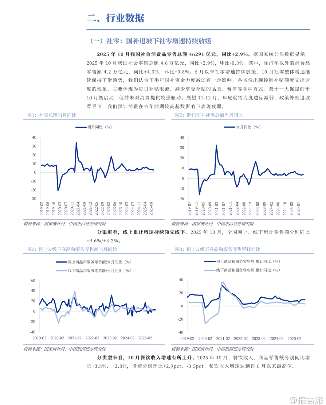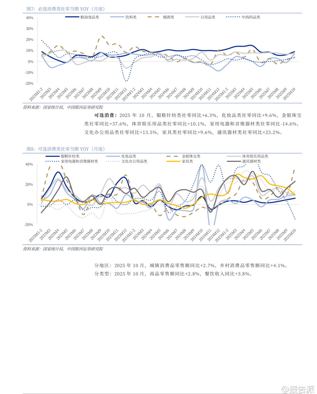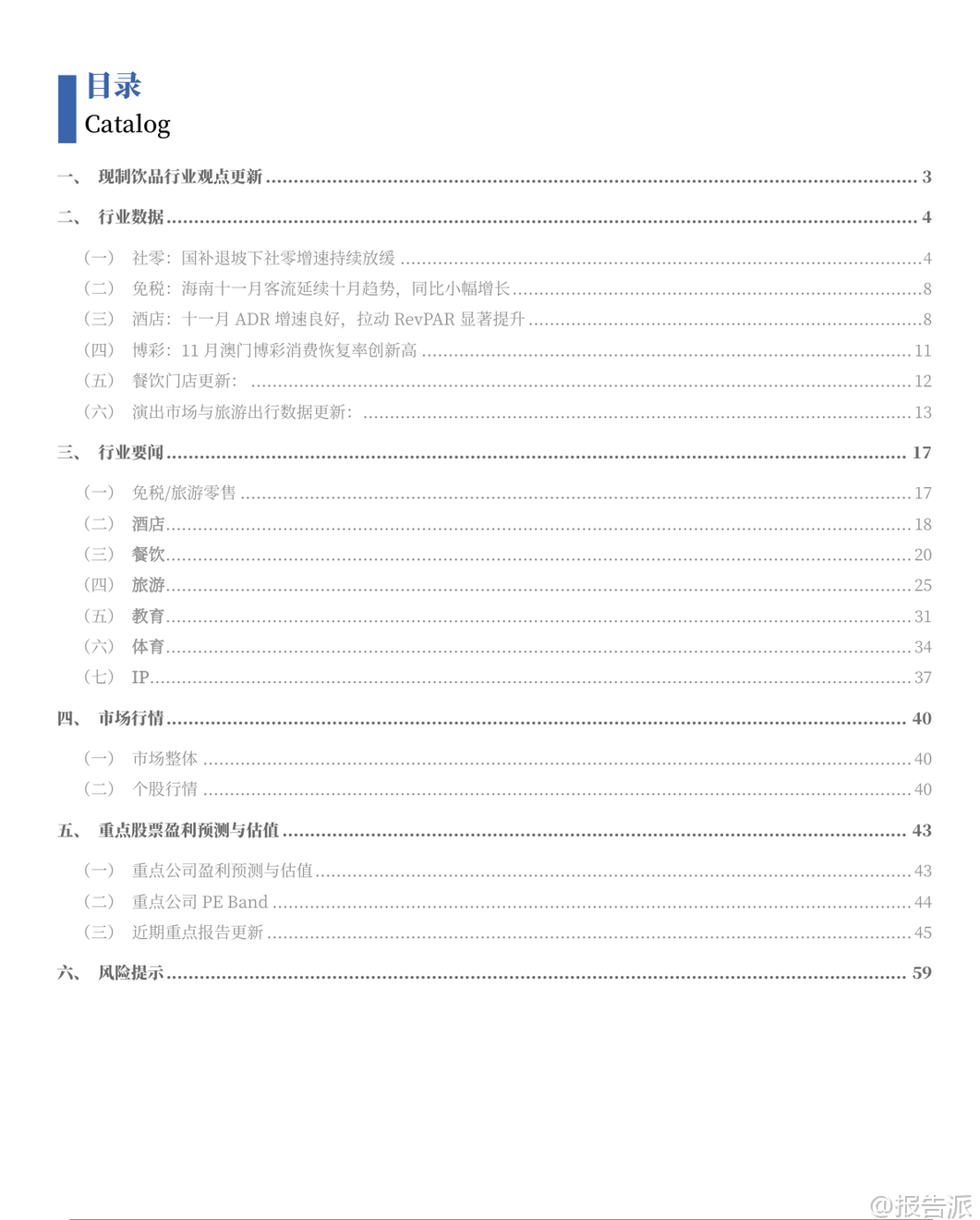 | 2025年12月,银河证券发布《社会服务行业12月投资前瞻》报告,聚焦现制饮品、免税、酒店、餐饮等多个细分领域的最新动态与投资机会。 整体来看,社服行业本月上涨1.23%,其中酒店餐饮板块表现亮眼,涨幅达8.73%,教育板块上涨4.28%,而旅游及景区、专业服务则表现平平或回调。 核心观点之一是现制饮品企业正加速布局早餐市场,成为新的增长突破口。 蜜雪冰城已在大连、西安、南宁、杭州等城市试点推出“早餐椰椰奶”等乳品,售价仅5元,并曾尝试“咖啡+烘焙”套餐;古茗创始人王云安也明确表示将进入早餐赛道,相关测试门店业绩已显著提升。 瑞幸则持续以“咖啡+西式烘焙”模式切入该场景。 这一趋势的背后,是中国庞大的早餐消费市场支撑——据启承资本和英敏特数据,中国早餐市场规模约1.7万亿元,外食早餐规模达7000~8000亿元,年增速8%~10%。 其中,适合连锁茶饮品牌的“咖啡+西式烘焙”品类市场规模超千亿元。 为何茶饮品牌更具优势?报告指出,中式早餐地域性强、品类分散,供应链复杂,难以形成全国性连锁品牌;而茶饮企业依托已有的成熟门店网络、强大供应链体系以及全时段经营策略,能够高效复制“咖啡+西式烘焙”模式,实现规模化扩张。 此举不仅能提升单店坪效,也为品牌打开了千亿级的增量空间。 从行业数据看,2025年10月社会消费品零售总额同比增长2.9%,但增速持续放缓,主要受国补退坡影响。 必选消费中,粮油食品类增长9.1%,饮料类增长7.1%;可选消费中,金银珠宝类同比大增37.6%,显示保值需求旺盛,而家电类同比下降14.6%,受去年同期高基数影响明显。 线上零售仍保持领先,累计增速达9.6%。 在细分领域方面,海南离岛免税新政实施首周吸金5.06亿元,同比增长34.86%,显示出政策红利对消费的强劲拉动。 澳门博彩11月收入恢复至2019年同期的92.2%,创疫后新高,高端客群回流趋势明显。 酒店行业RevPAR(每间可售房收入)持续回升,主要由ADR(平均房价)增长驱动,价格表现良好,反映出商旅与休闲需求稳健。 餐饮门店扩张势头不减。 截至11月底,瑞幸咖啡门店达30283家,月增888家,同比增速高达40%;库迪咖啡达15964家,同比增81.6%;古茗达13391家,同比增39.2%;蜜雪冰城达43957家,稳居行业第一。 相比之下,霸王茶姬11月未新增门店,茶百道增速放缓至3.3%,反映行业竞争加剧下的分化格局。 演出与旅游市场持续回暖。 11月演出票房同比增长59.4%,观演人次增长76.5%,场次增长102%,尽管平均票价同比下降9.7%,但市场活跃度显著提升。 国内旅游方面,2025年三季度出游人次达17.13亿,同比增长13.3%,旅游花费1.7万亿元,同比增长4.9%。 多地推行“秋假”“雪假”制度,有效激活了传统淡季市场。 政策层面,国家推动基础设施REITs扩容至酒店、体育场馆等领域,为资产盘活提供新路径。 江苏发文支持体育企业上市,提振赛事经济。 文旅部强调推动非遗进景区、进街区,发展“跟着演出去旅行”等融合消费场景,促进供需适配。 资本市场方面,社服板块11月跑赢沪深300指数3.69个百分点,排名第9。 个股中,君亭酒店、科德教育、华住集团、沪上阿姨等涨幅居前,而安车检测、岭南控股、呷哺呷哺等出现回调。 港股通持仓数据显示,天立国际控股、同程旅行、古茗等获外资增持。 重点公司盈利预测显示,蜜雪集团、古茗、茶百道等茶饮品牌2025年PE估值普遍在10~30倍区间,具备较强成长性。 携程、同程旅行国际业务表现强劲,入境游预订量大幅增长,AI技术投入持续深化,长期竞争力稳固。 总体而言,社会服务行业在经历短期波动后展现出较强韧性。 茶饮龙头通过拓展早餐场景打开第二增长曲线,酒店与免税受益于出行复苏,演出与旅游需求稳步释放。 尽管面临宏观经济下行、竞争加剧等风险,但在政策支持与消费升级趋势下,具备强大运营能力和品牌势能的企业有望持续释放增长潜力。 本文由【报告派】研读,输出观点仅作为行业分析! 原文标题:原文标题:银河证券-社会服务行业12月投资前瞻:茶饮龙头拓展早餐场景,增长潜力有望释放 发布时间:2025年 报告出品方:银河证券 文档页数:49页