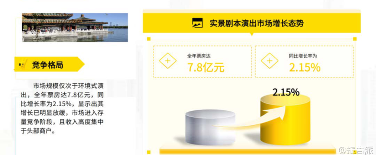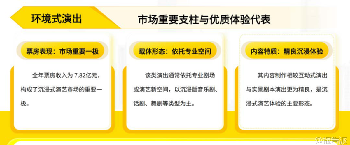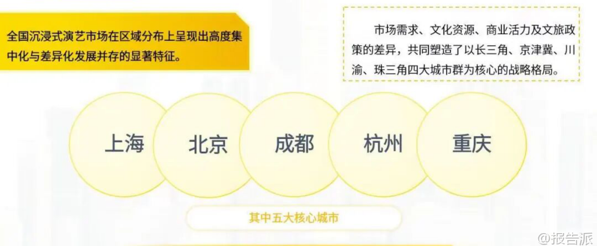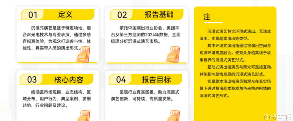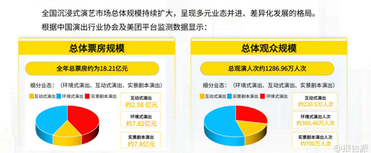 | 《2025年沉浸式演艺行业深度报告》由中国演出行业协会与美团联合发布,全面剖析了当前沉浸式演艺行业的市场规模、用户画像、典型案例及未来发展趋势,揭示了这一新兴文化消费形态的蓬勃生机与多元格局。 该报告指出,沉浸式演艺正从形式创新向内容深耕转型,成为推动文化消费升级、城市更新和数字经济发展的重要力量。 在市场规模方面,全国沉浸式演艺市场持续扩大,展现出强劲的增长潜力。 2024年全年票房达到132.1亿元,总体观众规模突破9125万人次,显示出大众对新型观演体验的高度认可。 其中,互动式演出表现尤为亮眼,票房约2.58亿元,同比增长高达112.97%,成为增长最快的细分赛道,反映出观众对于参与感和交互性的强烈需求。 环境式演出则凭借依托专业剧场空间营造的高品质沉浸氛围,成为市场的重要支柱,而实景剧本类演出也因其融合角色扮演、社交协作等特点,在年轻群体中广泛流行。 从区域分布来看,沉浸式演艺市场呈现出以长三角、京津冀、川渝、珠三角四大城市群为核心的战略格局。 上海作为“创新策源地”和商业孵化高地,引领着全国沉浸式内容的创意风潮;北京依托丰富的文化IP资源和深厚的文艺底蕴,聚焦内容深挖与原创孵化,形成与上海错位发展的新格局;成都与重庆则通过“文化+演艺”深度融合,打造具有地域特色的文旅融合项目,成为西部市场的标杆。 杭州、重庆等中心城市也在不断强化其区域辐射能力,借助数字经济优势推动沉浸式业态升级。 用户画像分析显示,沉浸式演艺的核心受众高度集中于年轻群体,年龄主要分布在20至35岁之间,其中18-25岁的Z世代是探索新体验的先锋力量。 性别结构上,女性用户整体占主导地位,占比达67%,尤其在环境式演出中更偏好情感共鸣、叙事细腻与氛围营造的内容。 相比之下,男性用户则更倾向于互动性强、规则明确、角色代入感强的实景剧本杀类项目,此类业态成功打破了传统演出市场的性别壁垒,实现了男女用户的均衡参与。 此外,亲子家庭也成为新兴消费力量,预示着沉浸式内容正向全龄化拓展。 消费行为方面,不同业态的客单价差异显著,整体呈上升趋势。 环境式演出因制作精良、舞美复杂,客单价相对较高;而互动式与实景剧本类则通过“门票+餐饮+衍生消费”的融合模式提升综合收益。 数据显示,沉浸式演出观众年均观演频次达1.65次,较传统演出高出1.9个百分点,表明高频消费习惯正在逐步形成。 决策动因方面,“内容为王、体验至上”成为核心驱动力,观众不仅关注剧情质量与艺术表现力,也高度重视社交属性、口碑评价与打卡分享价值。 报告还深入剖析了三大典型业态的代表案例。 在实景剧本演出领域,“头部效应”明显,少数优质品牌占据大部分市场份额,其成功要素包括规模化标准化运营、数字化管理工具应用、极致用户体验设计以及成功的品牌营销策略。 互动式演出方面,《九号秘事》作为悬疑IP沉浸化改编的标杆,展示了高概念叙事如何通过互动机制实现转译;UMEPLAY则以“影幻作真实”为核心理念,打造了融合科技与戏剧的先锋互动娱乐体验。 环境式演出中,驻场品牌《桑塔露琪亚》构建了可持续的生态化演艺模式;《时光代理人》作为国漫IP的沉浸式改编范例,实现了跨媒介联动与场景重构,打通粉丝经济链路。 展望未来,报告提出三大发展趋势:一是内容创新与IP化运营将成为核心驱动力,经典文学、历史题材的沉浸式重塑正构建新的文化消费场景,同时跨媒介IP联动将加速流量转化与价值释放,但原创人才短缺与改编质量参差仍是行业挑战。 二是科技赋能体验升级,VR/AR/MR技术正从虚拟展示迈向深度交互,多维声光电与全景舞美技术广泛应用,极大增强了现场感官冲击力。 三是业态融合与场景拓展持续推进,“演艺+”模式成为重要引擎,尤其是“演出+餐饮娱乐”的融合显著提升了客单价与整体收入。 与此同时,演出场景正从专业剧场延伸至历史文化空间、公共空间乃至自然景观,“知音号”等项目证明了一切皆可成为舞台的可能性。 结语强调,沉浸式演艺不仅是满足人民群众多样化精神文化需求的重要载体,更是助力城市更新、激活文旅产业、推动数字经济发展的重要动能。 当前行业正处于从“规模扩张”向“质量提升”转型的关键阶段,唯有坚持高质量发展为核心,以内容创新为驱动,深化科技融合与跨界协同,才能在全球文化产业变革中把握机遇,为中国式现代化注入源源不断的文化活力。 本文由【报告派】研读,输出观点仅作为行业分析! 原文标题:原文标题:2025-12-04-中国演出行业协会&美团-沉浸式演艺行业观察报告 发布时间:2025年 出品方:美团