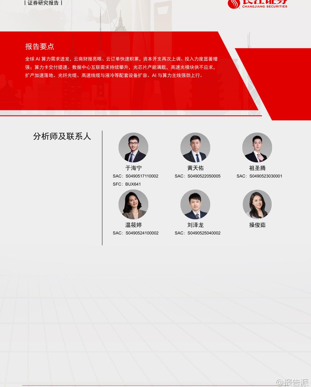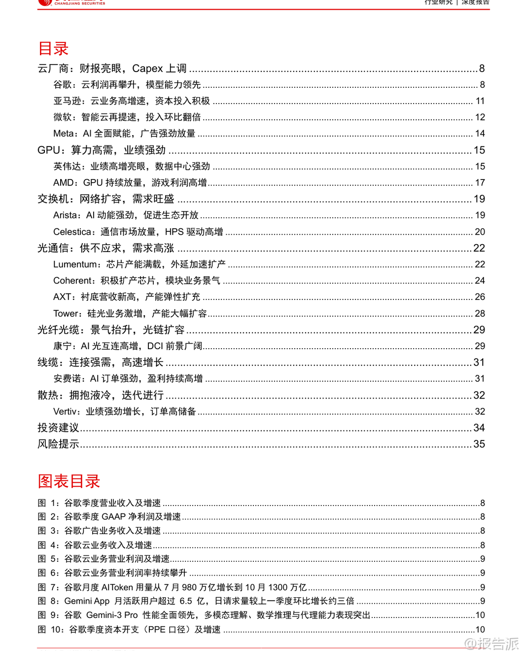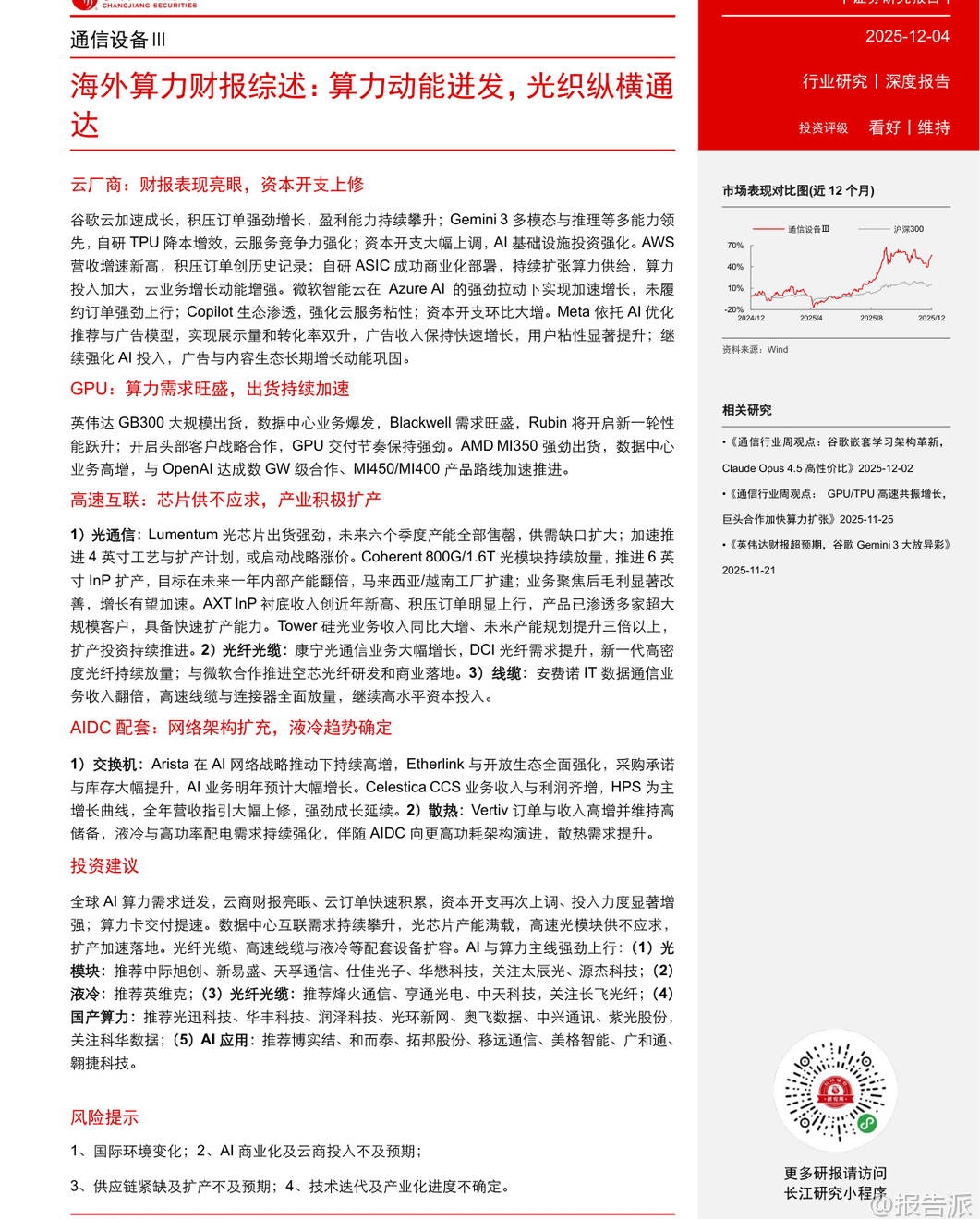 | 全球AI算力需求持续爆发,成为推动通信设备行业高速发展的核心引擎。 根据长江证券发布的《通信设备行业海外算力财报综述:算力动能迸发,光织纵横通达》报告,2025年第三季度,以谷歌、亚马逊、微软、Meta为代表的云服务厂商(云商)业绩全面超预期,资本开支大幅上调,AI基础设施投入力度显著增强,带动整个算力产业链进入高景气周期。 在云商层面,财报表现亮眼,增长动能强劲。 谷歌2025年Q3营收达1023.5亿美元,同比增长15.9%,净利润同比大增33%。 其云业务(GCP)收入同比增长33.5%,营业利润同比飙升84.6%,利润率提升至23.7%,创下新高。 积压订单环比增长46%,达到1550亿美元,显示出强劲的客户需求。 谷歌Gemini 3模型在多模态理解、数学推理和代理能力上全面领先,月活用户超6.5亿,日请求量环比增长三倍,AI生态加速扩展。 为支撑AI发展,谷歌将2025年全年资本开支指引从850亿美元大幅上调至910-930亿美元,主要用于服务器(含AI算力)和数据中心建设。 亚马逊同样表现抢眼,AWS云服务收入同比增长20.2%,创近11个季度以来最高增速,积压订单高达2000亿美元。 其自研的Trainium 2 AI芯片性价比高出市场30%-40%,已被客户全部预订,本季度收入环比增长150%。 亚马逊2025年Q3资本开支达351亿美元,全年预计约1250亿美元,持续加码AI与基础设施“双线”投入。 微软智能云在Azure AI的拉动下实现加速增长,FY26Q1智能云收入同比增长28%。 生成式AI已深度融入Microsoft 365 Copilot等核心产品,用户粘性显著提升。 其资本支出(含融资租赁)达349亿美元,环比翻倍增长,创下历史新高,凸显其对AI基础设施的迫切需求。 Meta则通过AI全面赋能广告系统,优化推荐算法,使广告展示量和平均单价双双提升,推动广告收入同比增长26%。 公司预计2025年全年资本开支将达到700-720亿美元,高于此前指引,持续强化AI训练与推理能力。 在GPU层面,算力需求旺盛,出货持续加速。 英伟达FY26Q3营收达570.1亿美元,同比增长62.5%,数据中心业务贡献了512亿美元,其中GB300大规模出货,Blackwell架构需求强劲。 公司与OpenAI、Anthropic等AI领军者建立战略合作,未来数个季度交付量有望持续攀升。 AMD方面,MI350系列GPU强劲出货,数据中心业务高增,同时与OpenAI达成数GW级合作,MI450/MI400产品路线图清晰,竞争力不断增强。 在高速互联领域,光通信芯片供不应求,产业积极扩产。 Lumentum的光芯片产能满载,未来六个季度产能已全部售罄,供需缺口扩大,并计划启动战略涨价。 Coherent的800G/1.6T光模块持续放量,正在推进6英寸InP晶圆扩产,目标一年内产能翻倍。 AXT的磷化铟衬底收入创近年新高,积压订单明显上行。 Tower硅光业务收入同比大增,未来产能规划提升三倍以上。 光纤光缆方面,康宁光通信业务大幅增长,DCI(数据中心互联)光纤需求提升,新一代高密度光纤持续放量,并与微软合作推进空芯光纤研发。 安费诺的高速线缆与连接器全面放量,IT数据通信业务收入同比翻倍。 在AIDC(AI数据中心)配套方面,网络架构和散热需求同步升级。 交换机厂商Arista在AI网络战略推动下持续高增,采购承诺与库存大幅提升。 Celestica的CCS业务(含交换机)收入与利润齐增,HPS(高性能系统)为主增长曲线。 散热领域,Vertiv订单与收入高增,液冷与高功率配电需求持续强化,伴随AIDC向更高功耗演进,液冷已成为确定性趋势。 综合来看,全球AI算力主线强劲上行,从上游云商资本开支扩张,到中游GPU算力卡交付提速,再到下游光模块、光纤光缆、高速线缆、液冷、交换机等配套设备全面扩容,整个产业链呈现出供需两旺的繁荣景象。 长江证券建议重点关注光模块、液冷、光纤光缆、国产算力及AI应用等方向的投资机会。 然而,报告也提示需关注国际环境变化、AI商业化不及预期、供应链紧缺及技术迭代等风险。 本文由【报告派】研读,输出观点仅作为行业分析! 原文标题:原文标题:长江证券-通信设备行业海外算力财报综述:算力动能迸发,光织纵横通达 发布时间:2025年 报告出品方:长江证券 文档页数:98页