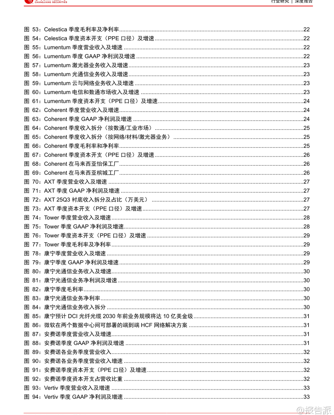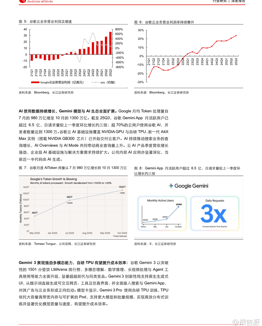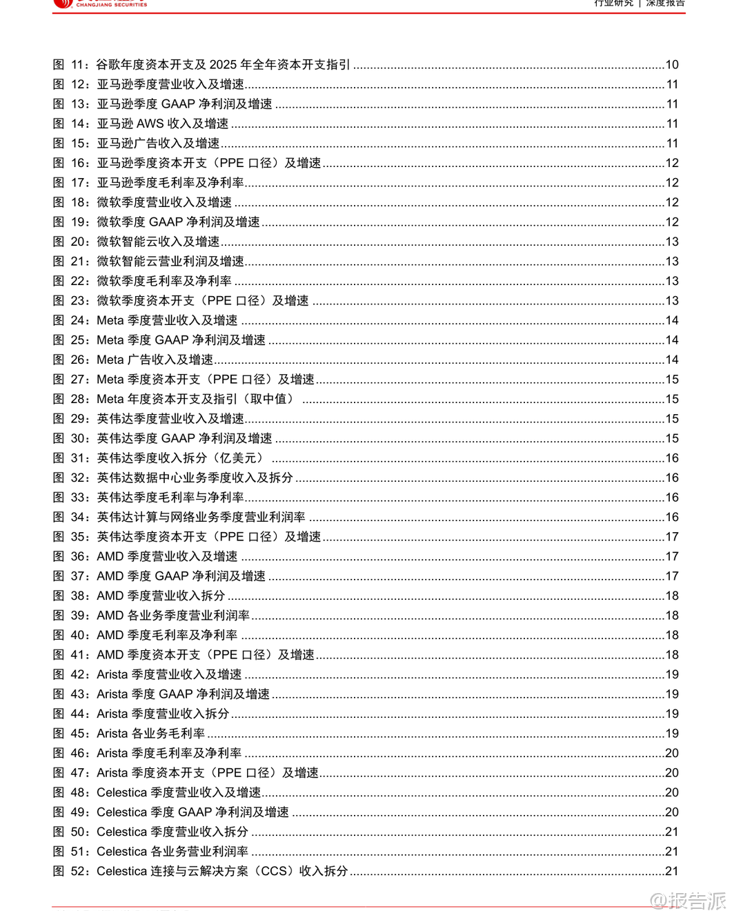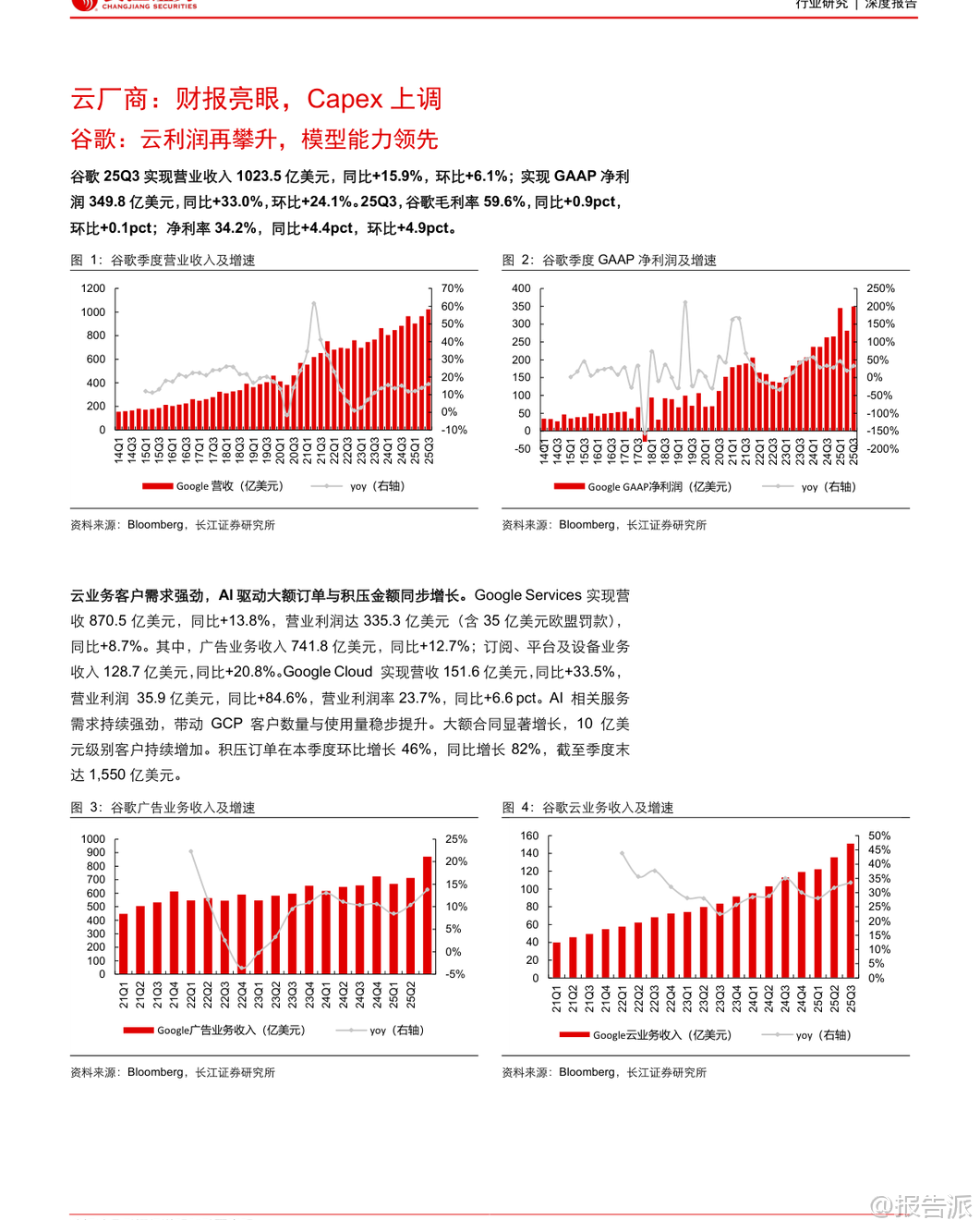 | 全球AI算力需求持续爆发,成为推动通信设备行业高速发展的核心引擎。 根据长江证券发布的《通信设备行业海外算力财报综述:算力动能迸发,光织纵横通达》报告,2025年第三季度,以谷歌、亚马逊、微软、Meta为代表的云服务厂商(云商)业绩全面超预期,资本开支大幅上调,AI基础设施投入力度显著增强,带动整个算力产业链进入高景气周期。 在云商层面,财报表现亮眼,增长动能强劲。 谷歌2025年Q3营收达1023.5亿美元,同比增长15.9%,净利润同比大增33%。 其云业务(GCP)收入同比增长33.5%,营业利润同比飙升84.6%,利润率提升至23.7%,创下新高。 积压订单环比增长46%,达到1550亿美元,显示出强劲的客户需求。 谷歌Gemini 3模型在多模态理解、数学推理和代理能力上全面领先,月活用户超6.5亿,日请求量环比增长三倍,AI生态加速扩展。 为支撑AI发展,谷歌将2025年全年资本开支指引从850亿美元大幅上调至910-930亿美元,主要用于服务器(含AI算力)和数据中心建设。 亚马逊同样表现抢眼,AWS云服务收入同比增长20.2%,创近11个季度以来最高增速,积压订单高达2000亿美元。 其自研的Trainium 2 AI芯片性价比高出市场30%-40%,已被客户全部预订,本季度收入环比增长150%。 亚马逊2025年Q3资本开支达351亿美元,全年预计约1250亿美元,持续加码AI与基础设施“双线”投入。 微软智能云在Azure AI的拉动下实现加速增长,FY26Q1智能云收入同比增长28%。 生成式AI已深度融入Microsoft 365 Copilot等核心产品,用户粘性显著提升。 其资本支出(含融资租赁)达349亿美元,环比翻倍增长,创下历史新高,凸显其对AI基础设施的迫切需求。 Meta则通过AI全面赋能广告系统,优化推荐算法,使广告展示量和平均单价双双提升,推动广告收入同比增长26%。 公司预计2025年全年资本开支将达到700-720亿美元,高于此前指引,持续强化AI训练与推理能力。 在GPU层面,算力需求旺盛,出货持续加速。 英伟达FY26Q3营收达570.1亿美元,同比增长62.5%,数据中心业务贡献了512亿美元,其中GB300大规模出货,Blackwell架构需求强劲。 公司与OpenAI、Anthropic等AI领军者建立战略合作,未来数个季度交付量有望持续攀升。 AMD方面,MI350系列GPU强劲出货,数据中心业务高增,同时与OpenAI达成数GW级合作,MI450/MI400产品路线图清晰,竞争力不断增强。 在高速互联领域,光通信芯片供不应求,产业积极扩产。 Lumentum的光芯片产能满载,未来六个季度产能已全部售罄,供需缺口扩大,并计划启动战略涨价。 Coherent的800G/1.6T光模块持续放量,正在推进6英寸InP晶圆扩产,目标一年内产能翻倍。 AXT的磷化铟衬底收入创近年新高,积压订单明显上行。 Tower硅光业务收入同比大增,未来产能规划提升三倍以上。 光纤光缆方面,康宁光通信业务大幅增长,DCI(数据中心互联)光纤需求提升,新一代高密度光纤持续放量,并与微软合作推进空芯光纤研发。 安费诺的高速线缆与连接器全面放量,IT数据通信业务收入同比翻倍。 在AIDC(AI数据中心)配套方面,网络架构和散热需求同步升级。 交换机厂商Arista在AI网络战略推动下持续高增,采购承诺与库存大幅提升。 Celestica的CCS业务(含交换机)收入与利润齐增,HPS(高性能系统)为主增长曲线。 散热领域,Vertiv订单与收入高增,液冷与高功率配电需求持续强化,伴随AIDC向更高功耗演进,液冷已成为确定性趋势。 综合来看,全球AI算力主线强劲上行,从上游云商资本开支扩张,到中游GPU算力卡交付提速,再到下游光模块、光纤光缆、高速线缆、液冷、交换机等配套设备全面扩容,整个产业链呈现出供需两旺的繁荣景象。 长江证券建议重点关注光模块、液冷、光纤光缆、国产算力及AI应用等方向的投资机会。 然而,报告也提示需关注国际环境变化、AI商业化不及预期、供应链紧缺及技术迭代等风险。 本文由【报告派】研读,输出观点仅作为行业分析! 原文标题:原文标题:长江证券-通信设备行业海外算力财报综述:算力动能迸发,光织纵横通达 发布时间:2025年 报告出品方:长江证券 文档页数:98页