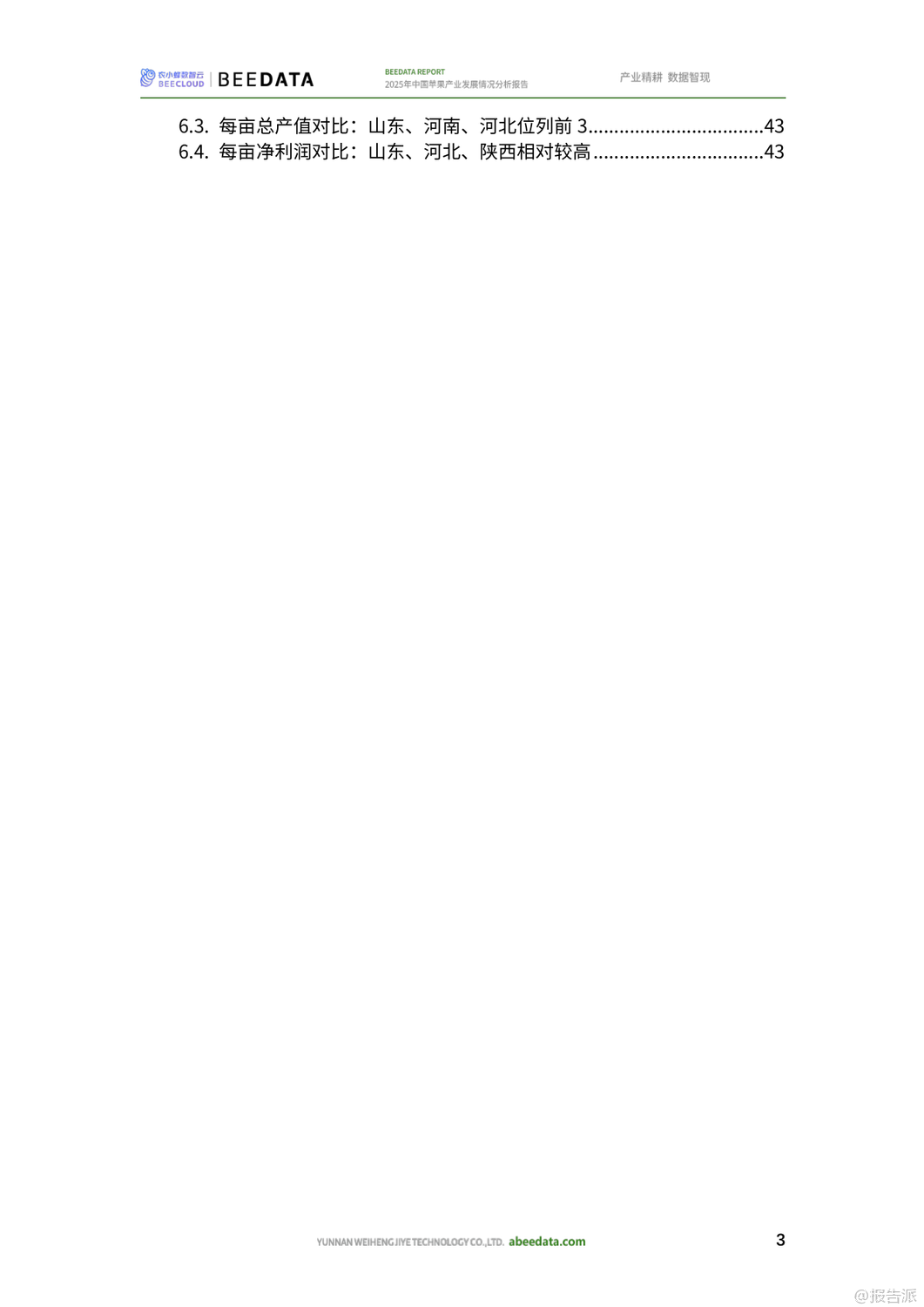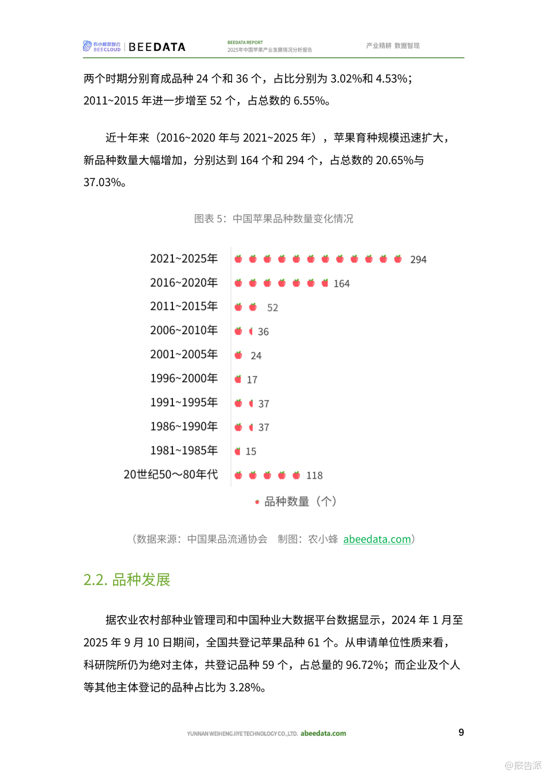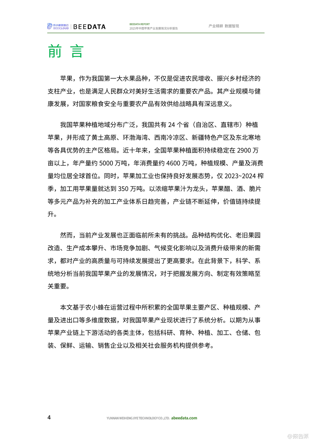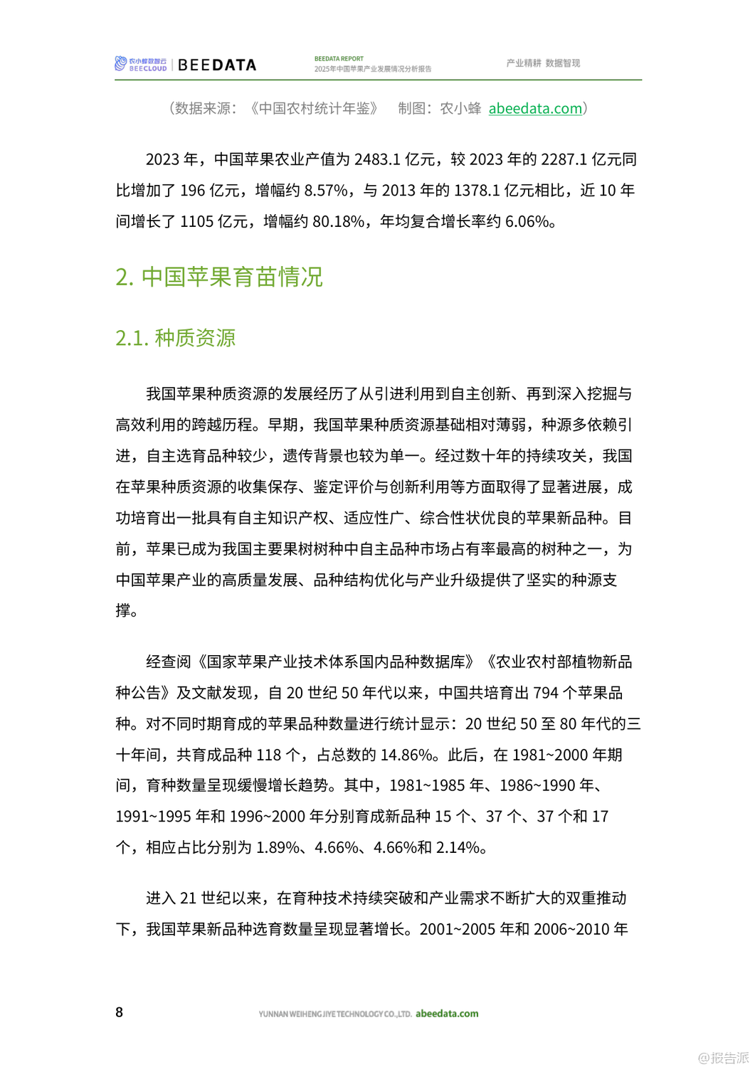 | 中国苹果产业正以稳健的步伐持续领跑全球。 根据《2025年中国苹果产业发展情况分析报告》,我国苹果种植面积稳定在2900万亩左右,2024年产量突破5128.51万吨,占全球总产量的55.16%,消费量同样位居世界第一,展现出强大的生产与市场韧性。 这一成绩的背后,是品种改良、科技赋能和区域集聚协同发力的结果。 从区域格局看,产业高度集中于十大主产省——陕西、山东、甘肃、山西、河南、辽宁、河北、新疆、四川和云南,其2023年产量合计占全国总量的95.6%。 其中,陕西以1375.12万吨的产量稳居榜首,山东紧随其后,甘肃则凭借近十年种植面积增长70.25%、产量增长超3倍的迅猛势头跃居全国第三。 值得注意的是,陕西洛川县“洛川苹果”品牌价值高达883.26亿元,成为全国果品区域公用品牌的标杆,彰显了产地品牌化发展的巨大潜力。 在种业创新方面,科研机构仍是主力。 2024年1月至2025年9月,全国登记苹果新品种61个,其中96.72%由科研院所培育,反映出我国苹果育种仍处于科研主导阶段。 与此同时,苗木繁育呈现明显的区域化特征,陕西千阳县凭借3万亩育苗基地、年产能超3000万株,成为全国最大的矮砧苹果苗木繁育中心,海升、华圣等龙头企业引领着标准化、工厂化育苗潮流。 对外贸易上,中国苹果呈现显著净出口格局。 2024年,出口量达152.27万吨,进口仅11.12万吨,实现贸易顺差16.69亿美元。 主要出口商品为鲜苹果,最大外销市场是越南,而美国则是第二大市场且出口单价更高,凸显高端市场竞争力。 进口方面,新西兰是最大来源地,占进口总额超七成,反映出国内消费者对高品质、反季节苹果的需求旺盛。 成本与收益方面,2023年全国苹果种植每亩总成本为5063.87元,人工成本(家庭用工+雇工)占比接近70%,成为最大支出项。 山东、河南、北京等地成本偏高,但山东、河北、陕西三省凭借较高的亩产值和净利润,成为效益最优产区,其中山东亩均净利润高达8583.1元。 这表明,尽管面临成本压力,通过提升单产和品质,产业仍具备可观盈利空间。 总体来看,中国苹果产业已形成“大生产、大消费、强出口”的全球主导格局。 未来,如何加快企业育种创新步伐、推动老旧果园改造升级、应对气候变化风险、满足多元化消费需求,将成为实现高质量发展的关键所在。 出品方:农小蜂 发布时间:2025年 文档页数:49页