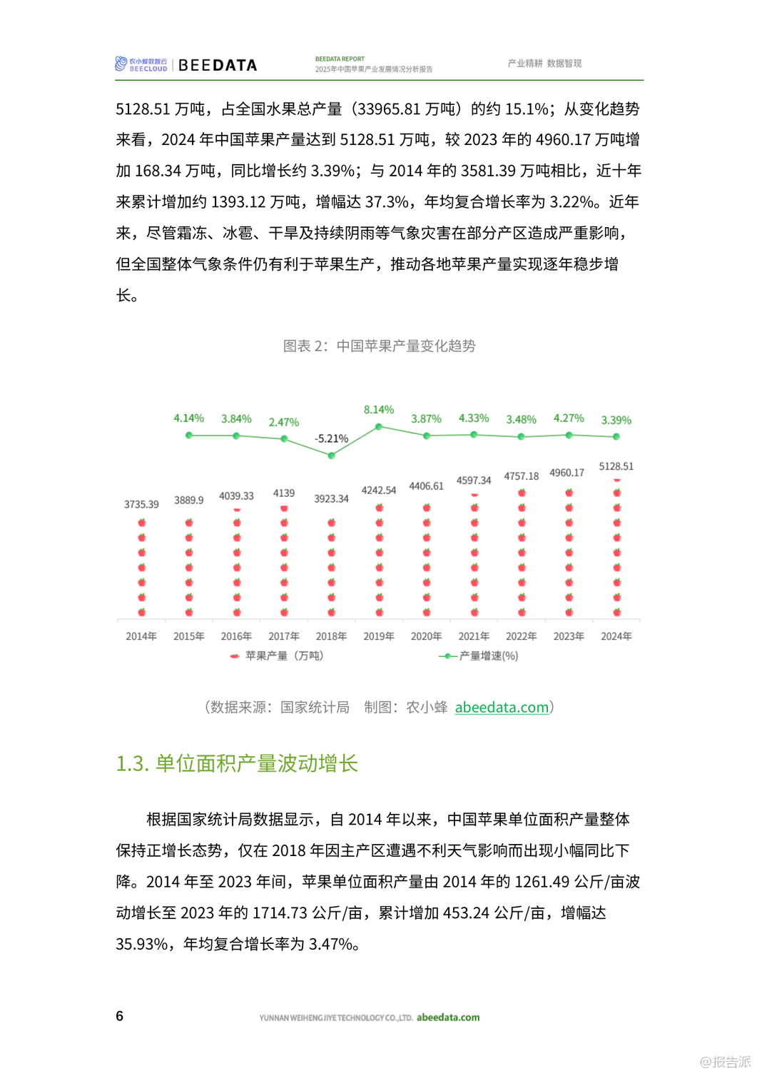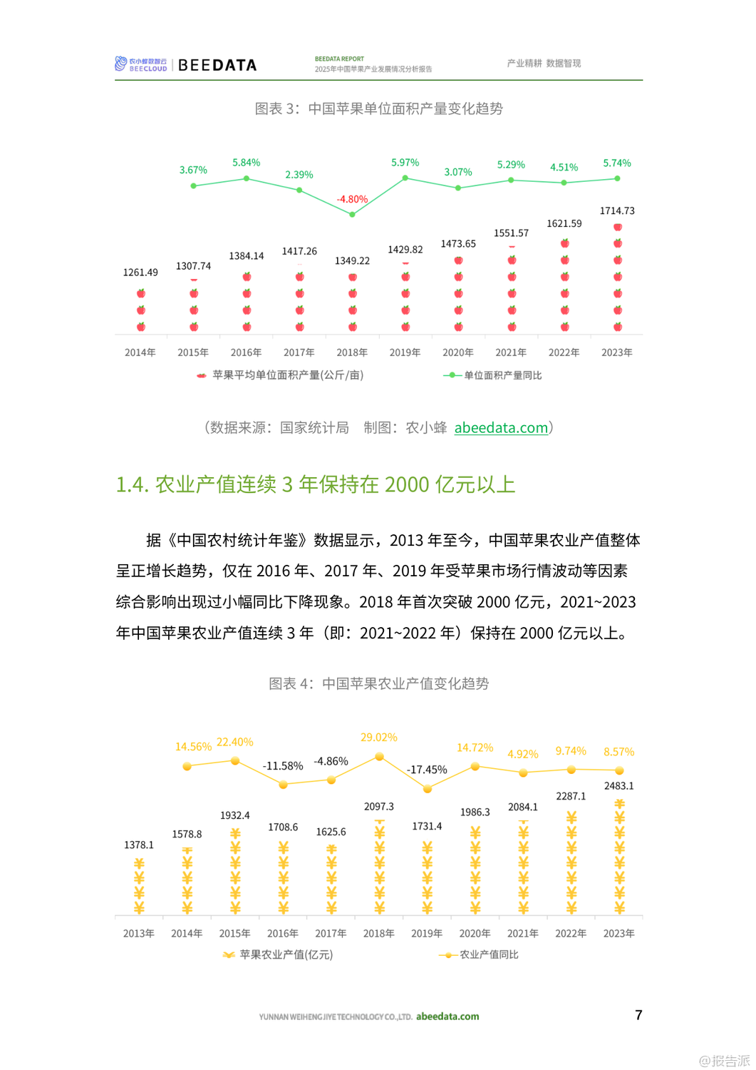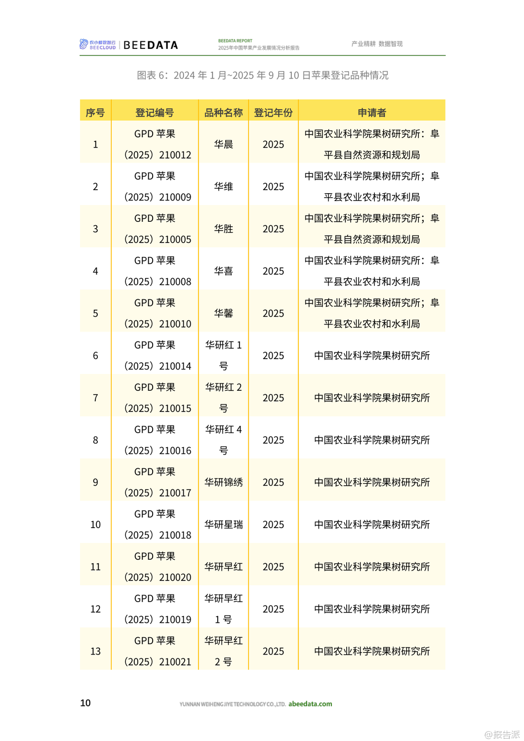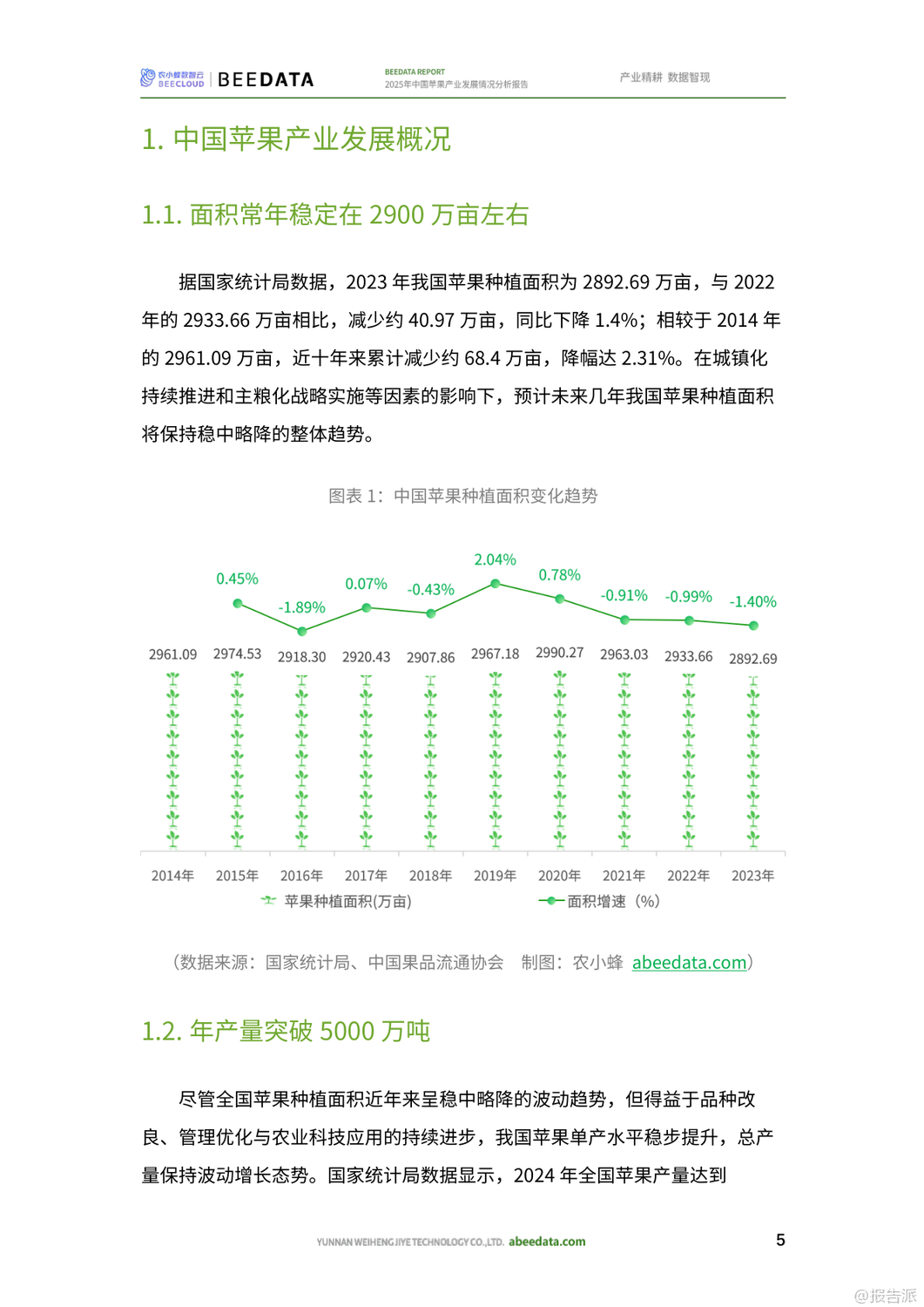 | 中国苹果产业正以稳健的步伐持续领跑全球。 根据《2025年中国苹果产业发展情况分析报告》,我国苹果种植面积稳定在2900万亩左右,2024年产量突破5128.51万吨,占全球总产量的55.16%,消费量同样位居世界第一,展现出强大的生产与市场韧性。 这一成绩的背后,是品种改良、科技赋能和区域集聚协同发力的结果。 从区域格局看,产业高度集中于十大主产省——陕西、山东、甘肃、山西、河南、辽宁、河北、新疆、四川和云南,其2023年产量合计占全国总量的95.6%。 其中,陕西以1375.12万吨的产量稳居榜首,山东紧随其后,甘肃则凭借近十年种植面积增长70.25%、产量增长超3倍的迅猛势头跃居全国第三。 值得注意的是,陕西洛川县“洛川苹果”品牌价值高达883.26亿元,成为全国果品区域公用品牌的标杆,彰显了产地品牌化发展的巨大潜力。 在种业创新方面,科研机构仍是主力。 2024年1月至2025年9月,全国登记苹果新品种61个,其中96.72%由科研院所培育,反映出我国苹果育种仍处于科研主导阶段。 与此同时,苗木繁育呈现明显的区域化特征,陕西千阳县凭借3万亩育苗基地、年产能超3000万株,成为全国最大的矮砧苹果苗木繁育中心,海升、华圣等龙头企业引领着标准化、工厂化育苗潮流。 对外贸易上,中国苹果呈现显著净出口格局。 2024年,出口量达152.27万吨,进口仅11.12万吨,实现贸易顺差16.69亿美元。 主要出口商品为鲜苹果,最大外销市场是越南,而美国则是第二大市场且出口单价更高,凸显高端市场竞争力。 进口方面,新西兰是最大来源地,占进口总额超七成,反映出国内消费者对高品质、反季节苹果的需求旺盛。 成本与收益方面,2023年全国苹果种植每亩总成本为5063.87元,人工成本(家庭用工+雇工)占比接近70%,成为最大支出项。 山东、河南、北京等地成本偏高,但山东、河北、陕西三省凭借较高的亩产值和净利润,成为效益最优产区,其中山东亩均净利润高达8583.1元。 这表明,尽管面临成本压力,通过提升单产和品质,产业仍具备可观盈利空间。 总体来看,中国苹果产业已形成“大生产、大消费、强出口”的全球主导格局。 未来,如何加快企业育种创新步伐、推动老旧果园改造升级、应对气候变化风险、满足多元化消费需求,将成为实现高质量发展的关键所在。 出品方:农小蜂 发布时间:2025年 文档页数:49页