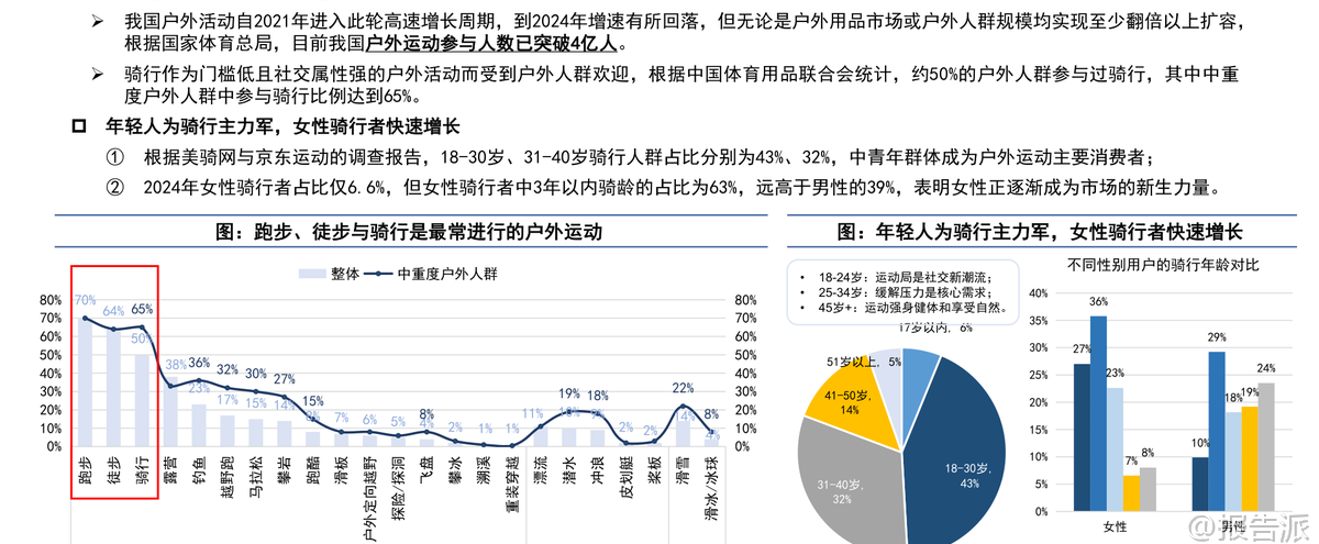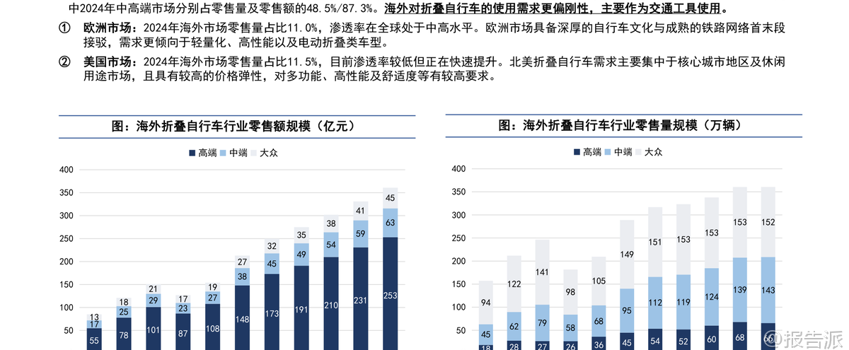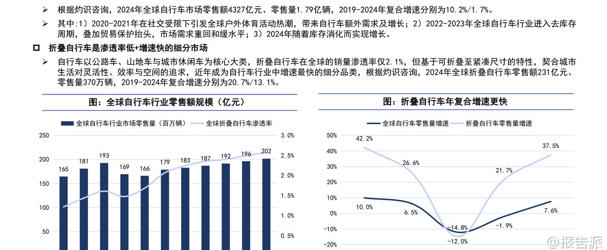 | 折叠自行车正从一项小众爱好演变为城市生活方式的新符号。 根据国信证券最新发布的行业研究报告,这一细分品类已成为耐用消费品中增长最快、最具活力的赛道之一。 2019至2024年,全球折叠自行车零售额复合增速高达20.7%,零售量增速达13.1%,远超传统自行车品类的整体平稳表现。 尽管目前折叠车在全球自行车销量中的渗透率仅为2.1%,但其轻巧便携、适应城市生活的核心优势,正在推动它从小众工具向主流消费载体快速转型。 中国市场尤为突出,展现出“高增速+高集中度”的双重特征。 2019年至2024年,我国折叠自行车零售额从4亿元飙升至18亿元,年均复合增长率高达35.1%;零售量也从33万辆增至81万辆,CAGR为19.9%。 市场呈现出明显的“一超多强”格局,大行(DAHON)以26.3%的零售量份额和36.5%的零售额份额稳居第一,形成绝对领导地位。 高端市场则由英国品牌Brompton(小布)主导,凭借1.8万元的均价和强大的品牌文化,占据25.7%的零售额份额,排名第二。 迪卡侬、凤凰、永久等品牌分别在中端与大众市场展开竞争。 驱动行业爆发的核心动力来自三大趋势:首先是使用场景的多元化扩展。 折叠自行车已不再局限于“最后一公里”通勤,而是延伸至“4+2出行”(汽车+自行车)、郊野休闲、时尚穿搭、宠物携带乃至社群社交等丰富场景。 尤其是在一线城市,“Pop Rider”等骑行社群迅速扩张,骑行成为年轻人释放压力、建立社交连接的重要方式。 其次是消费人群的显著“破圈”。 用户从核心骑行爱好者扩展至追求生活品质的年轻群体和女性消费者。 数据显示,女性骑行者中超过60%的骑龄在三年以内,显示出强劲的新客涌入势头。 名人效应也加速了这一进程,马云、雷军等公众人物骑行小布的画面广泛传播,使折叠车成为一种“社交货币”。 技术迭代是另一关键因素。 早期折叠车因结构妥协而存在骑行体验差的问题,如今通过“快车道”、“马甲线”、“超级下管”等创新技术,大行等品牌显著提升了车架刚性和踩踏效率。 Brompton则推出G Line Gravel车型,首次赋予折叠车轻度越野能力。 碳纤维材料的应用也让高端产品实现极致轻量化。 与此同时,电助力(E-Bike)成为下一个重要增量。 海外发达国家电助力自行车渗透率普遍在50%以上,而国内尚不足2%,发展空间巨大。 折叠电助力结合了便携性与省力特性,正蓄势待发。 全球市场方面,格局相对分散。 按零售额计,前五大品牌合计市占率仅12.0%,Brompton以6.2%位居第一,大行以2.9%排名第二。 美国亚马逊平台数据显示,电动自行车是线上绝对主力,占比近70%,而折叠车占比较低,但大行等中国品牌在该渠道增长迅猛。 Google Trends显示,大行品牌的全球搜索热度正与Brompton差距收窄,出海潜力巨大。 投资层面,大行科工作为全球前二、中国第一的龙头企业,未来增长路径清晰:一是持续拓宽产品矩阵,向上冲击高端三折市场,向下通过新品牌切入下沉市场;二是发力电助力新品类,开辟第二增长曲线;三是加速海外市场布局,尤其是欧美电助力市场。 当前行业仍处高景气周期,渗透率提升空间广阔,龙头企业有望持续受益于行业的扩容与破圈。 本文由【报告派】研读,输出观点仅作为行业分析! 原文标题:2025-12-04-国信证券-国信证券-耐用消费品行业户外新消费研究:折叠自行车行业专题,高景气新消费赛道,龙头引领扩容与破圈 发布时间:2025年 报告出品方:国信证券