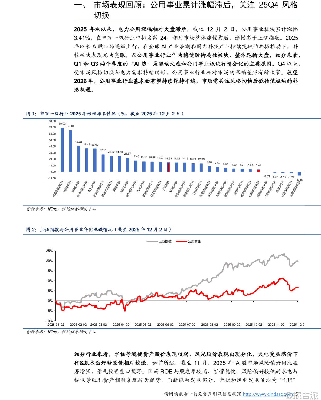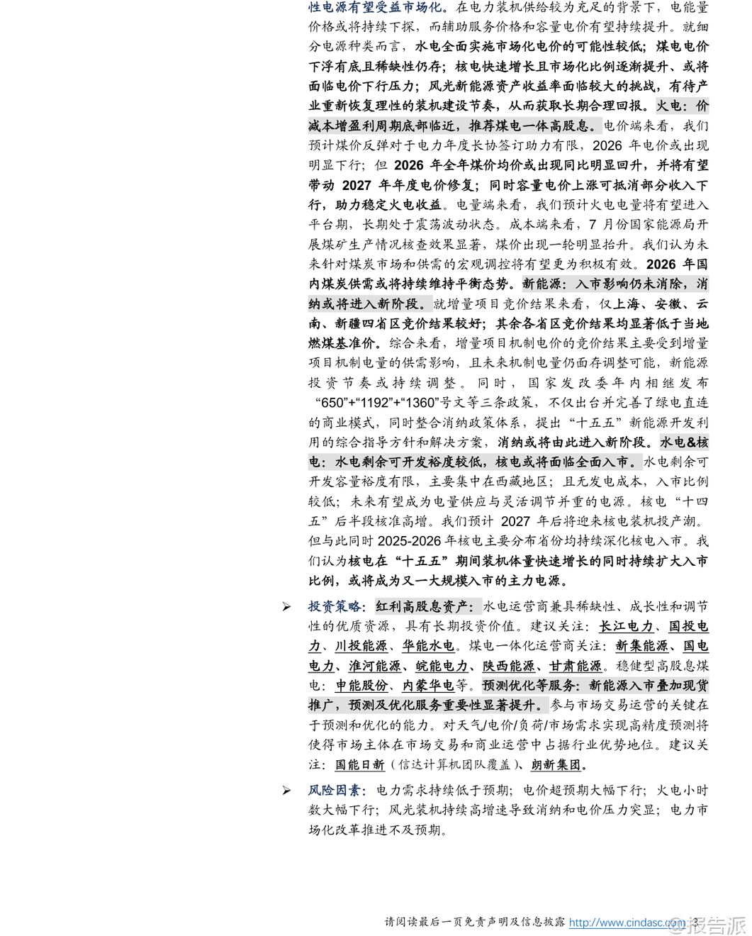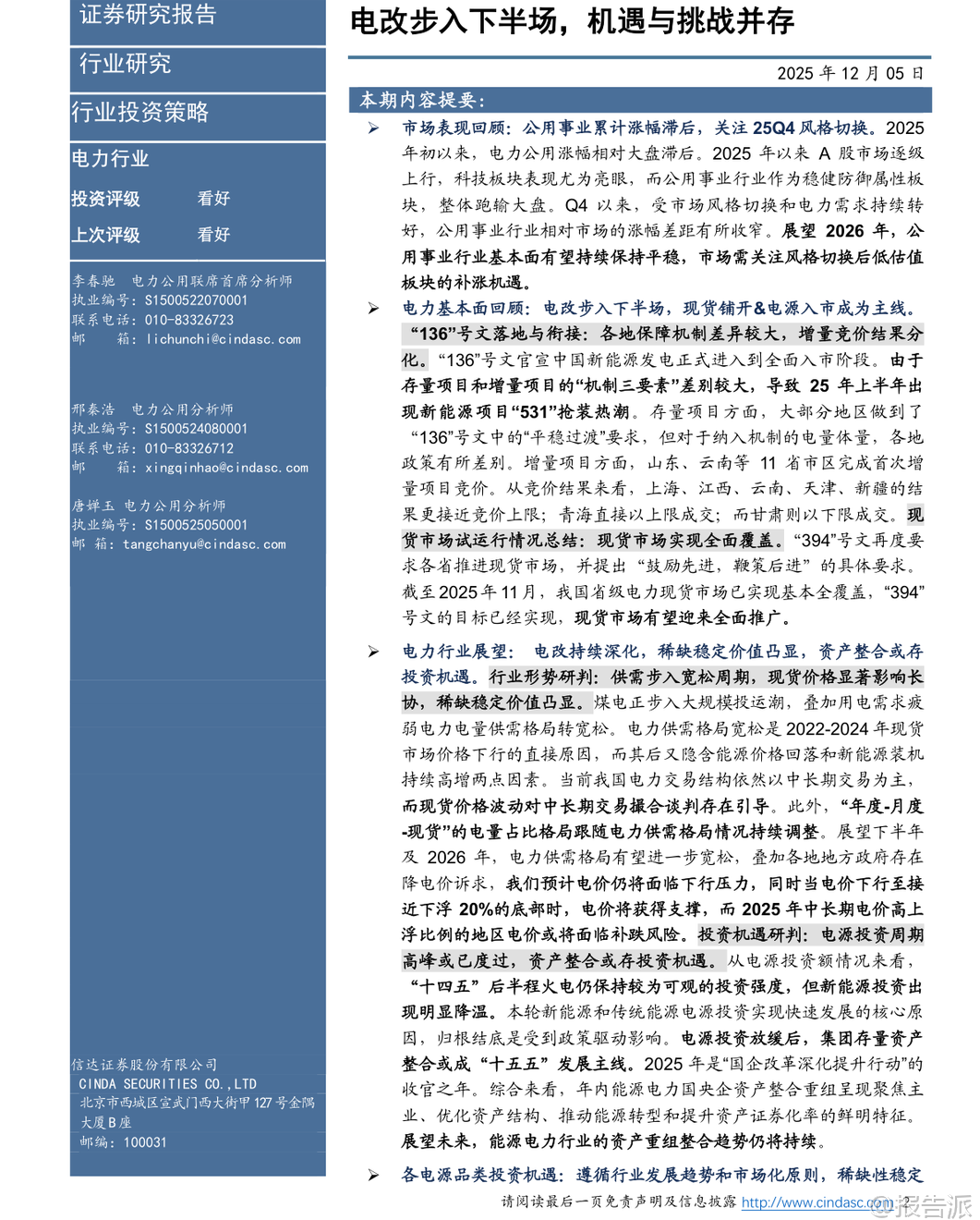 | 2025年即将收官,电力行业正迎来深刻变革的关键节点。 根据信达证券最新发布的《2026电力行业年度策略报告》,我国电力体制改革已正式步入“下半场”,市场化改革加速推进,供需格局、电价机制、电源结构和投资逻辑均发生显著变化。 本篇报告从市场表现、基本面回顾、未来展望及投资策略四个维度,系统梳理了当前电力行业的核心趋势与潜在机遇。 在市场表现方面,2025年以来,公用事业板块整体涨幅落后于大盘,主要受科技股行情主导的市场风格影响。 然而进入四季度后,随着市场风格切换以及电力需求回暖,公用事业板块相对收益差距有所收窄。 展望2026年,行业基本面预计保持平稳,低估值、高股息的电力资产有望迎来补涨机会,成为防御性配置的重要选择。 电力体制改革是贯穿全年的主线。 标志性政策“136号文”的落地,意味着新能源发电全面进入市场化交易时代。 该政策对存量和增量项目实行差异化待遇,导致2025年上半年出现“531抢装潮”。 数据显示,1-5月光伏新增装机达197.85GW,同比增长近150%;风电新增46.28GW,同比增长超134%。 但6月之后,随着政策分界点到来,新能源装机量断崖式下滑,反映出市场对增量项目缺乏保底收益的担忧。 增量项目的机制电量、电价和执行期限均由市场竞争决定,收益不确定性大幅上升。 与此同时,电力现货市场建设取得突破性进展。 “394号文”推动下,截至2025年11月,全国省级电力现货市场已实现基本全覆盖。 现货价格波动对中长期合同形成显著引导作用,电价形成机制更加市场化。 当前电力交易以“年度-月度-现货”三级结构为主,其中年度长协锁定大部分电量,但现货市场的价格信号正逐步影响全年电价水平。 行业供需格局正转向宽松。 一方面,煤电迎来新一轮投运高峰,火电核准与投产规模持续攀升;另一方面,用电需求增长放缓。 叠加能源价格回落和新能源装机高增,电力供大于求的趋势日益明显。 这一背景直接导致现货市场价格下行,并传导至中长期电价。 报告指出,2026年电价仍面临下行压力,尤其是此前中长期电价上浮较多的地区,存在“补跌”风险。 不过,当电价接近下浮20%的政策底线时,将获得一定支撑。 从投资角度看,电源投资周期高峰可能已经过去。 2023-2024年火电投资维持高位,而新能源投资自2025年起明显降温。 这背后是政策驱动向市场驱动的转变。 随着“十四五”收官,电源大规模投资阶段或将结束,未来“十五五”期间,能源央企的资产整合与结构优化将成为重点方向。 2025年作为“国企改革深化提升行动”收官之年,已有多个电力央企推进资产重组,聚焦主业、提升资产证券化率的趋势明确。 细分电源类型中,各类电源面临不同机遇与挑战。 水电兼具稀缺性、稳定性和调节能力,全面市场化可能性低,长期价值凸显,推荐关注长江电力、国投电力等龙头。 煤电方面,虽然电价面临下行压力,但成本端煤炭供需趋于平衡,且容量电价机制有望增厚收益,特别是煤电一体化企业具备成本优势,推荐关注高股息标的如新集能源、国电电力等。 核电发展提速,市场化比例提升,但同样面临电价下行压力。 风光新能源资产收益率承压,消纳和电价竞争加剧,需等待产业理性回归。 此外,随着电力市场化深入,预测与优化服务的重要性显著提升。 市场主体对天气、负荷、电价的精准预测能力,将成为参与市场交易的核心竞争力。 相关技术服务商有望受益,如国能日新、朗新集团等。 总体来看,2026年电力行业将在“宽松供需+深化改革”的背景下运行。 电价中枢或继续下移,但高股息、稳定性强的电源资产价值更加突出。 投资主线将从单纯的装机扩张转向资产质量优化与运营效率提升,红利型资产和具备整合潜力的平台型企业值得关注。 同时,电力市场配套服务领域也将孕育新的成长机会。 本文由【报告派】研读,输出观点仅作为行业分析! 原文标题:原文标题:2025-12-05-信达证券-信达证券-2026电力行业年度策略报告:电改步入下半场,机遇与挑战并存 发布时间:2025年 报告出品方:信达证券