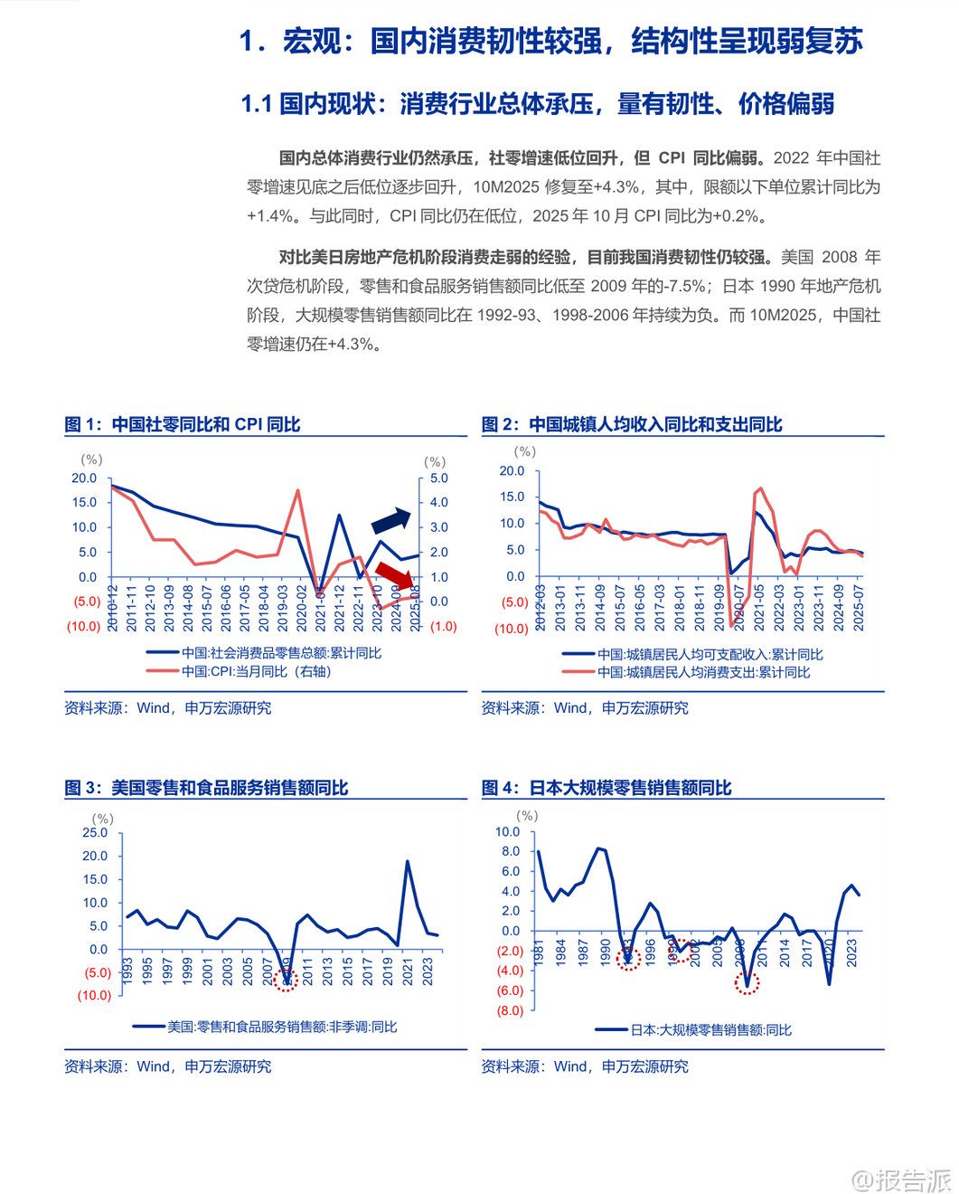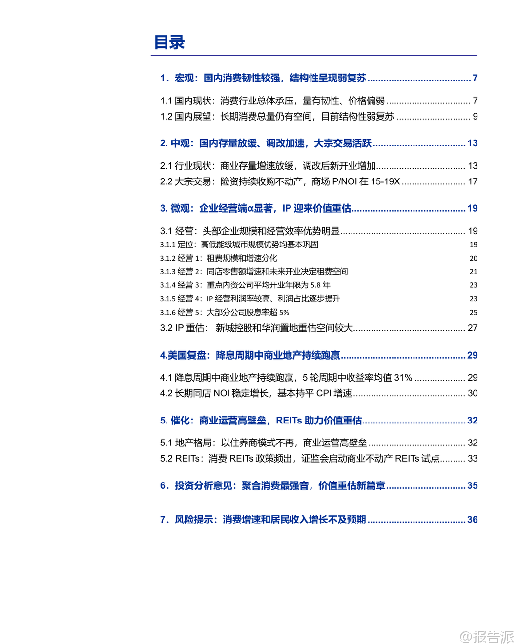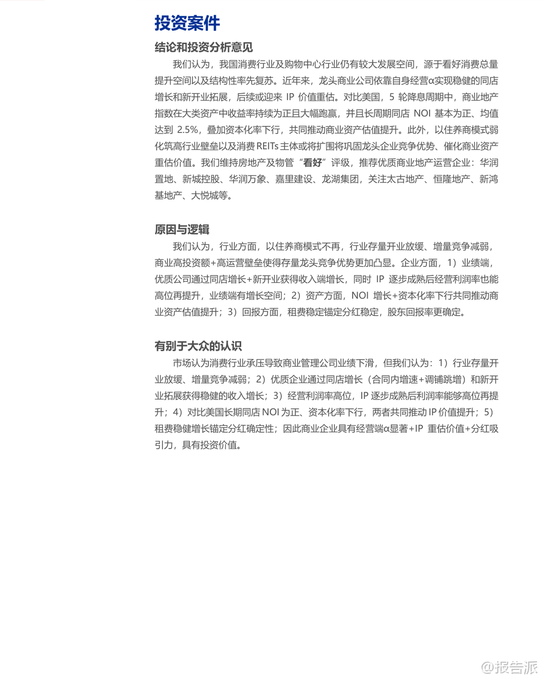 | 在当前宏观经济背景下,中国消费行业虽面临压力,但展现出较强的韧性。 尽管居民资产负债表走弱导致整体消费承压,呈现“量有韧性、价格偏弱”的特征,但实体消费与线上消费增速已趋于同步,表明消费并未出现结构性崩塌。 对比美国与日本地产危机时期的消费下滑,中国的社零增速仍保持正增长,显示出较强的内需基础。 从长期来看,我国消费总量仍有较大提升空间。 随着人均GDP的持续增长,人均零售额和人均商业面积均有望进一步上升。 当前中国人均商业面积仅为0.41平方米,远低于国际主流国家平均0.88平方米的水平,未来增长潜力巨大。 同时,居民资产负债率或已见顶,楼市缩水边际放缓、股市上涨对冲资产缩水,预示着居民消费能力有望逐步修复,带动消费复苏。 在中观层面,国内商业地产进入存量优化阶段。 截至2025年第三季度末,全国集中式商业存量达6.61亿平方米,同比增长4.4%,其中开业5年以上项目占比高达57%。 新开业项目数量创十年新低,但调改后重新开业的比例从2022年的16%提升至2025年三季度的19%,显示行业由增量扩张转向存量改造升级。 业态方面,餐饮、文体娱乐等细分领域延续净开店增长,而零售中的运动户外、潮流数码、IP主题店等也表现亮眼,反映出消费者对体验型、社交型消费的需求增强。 企业经营端α显著,头部商业地产运营商展现出强大竞争力。 2024年Top5商管公司开业面积市占率达19%,零售额集中度更高。 华润置地、龙湖集团、新城控股等企业在租费规模、同店零售额增速、新开业拓展等方面表现突出。 重点公司平均商场开业年限为5.8年,处于成长期黄金阶段,具备较强的成长动能。 IP经营利润率普遍在55%-84%之间,部分企业如恒隆地产、太古地产的IP利润占比超过100%,显示其商业运营的高度成熟与盈利能力。 尤为值得关注的是,优质商业资产正迎来价值重估机遇。 基于公允价值法测算,新城控股和华润置地的IP重估空间分别达39%和33%,具备显著的估值提升潜力。 这一趋势在美国历史经验中亦得到印证:过去五轮降息周期中,NCREIF商业地产房价指数收益率均为正,平均达31%,且长期NOI同店增速稳定在2.5%左右,基本持平CPI涨幅。 资本化率下行叠加NOI增长,推动商业资产估值系统性抬升。 政策催化因素正在显现。 传统“以住养商”模式因住宅开发走弱而难以为继,商业运营的高投入、长周期特性使得行业壁垒更加凸显,存量竞争格局趋于稳定。 与此同时,REITs制度建设加速推进,证监会于2025年11月启动商业不动产REITs试点,将底层资产扩展至办公楼、酒店等,预计未来将覆盖民营企业主体。 目前5只可比消费类REITs的P/FFO均值已达25倍,远高于传统估值水平,若民企资产被纳入,将极大促进商业资产价值显性化。 投资建议方面,报告维持对房地产及物管行业的“看好”评级,推荐具备强运营能力和资产质量的优质商业地产运营商,包括华润置地、新城控股、华润万象、嘉里建设、龙湖集团,并关注太古地产、恒隆地产、新鸿基地产、大悦城等。 这些企业不仅具备稳定的租费收入和分红能力(多数股息率超5%),更受益于行业集中度提升、资产价值重估及REITs带来的流动性溢价。 总体而言,中国购物中心行业正处于从高速增长向高质量发展转型的关键节点。 在消费结构性复苏、存量资产优化、运营能力分化和金融工具创新的多重驱动下,优质商业IP的价值正在被重新认识与定价,或将开启商业地产价值重估的新篇章。 本文由【报告派】研读,输出观点仅作为行业分析! 原文标题:原文标题:2025-12-05-申万宏源-房地产行业商业地产系列报告之二:购物中心价值重估,聚合消费最强音,价值重估新篇章 发布时间:2025年 报告出品方:申万宏源 文档页数:37页