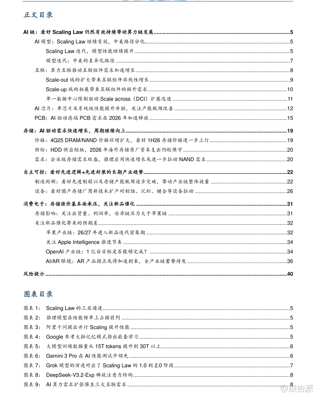 | 华泰证券发布的《2025-2026年科技行业年度策略》报告指出,2026年科技行业的核心主线将围绕AI产业链、存储周期上行以及自主可控加速三大方向展开。 报告认为,尽管面临贸易摩擦与技术发展不确定性等风险,但在全球AI军备竞赛持续升温的背景下,算力需求强劲增长,推动电子行业整体上行。 首先,在AI链方面,Scaling Law依然有效,并已进入2.0阶段,从预训练延伸至后训练和推理环节,显著带动模型性能提升与算力需求释放。 随着英伟达新一代AI服务器平台(如GB300、Rubin)批量出货,以及谷歌、亚马逊、Meta等头部云服务商加速自研ASIC芯片落地,AI算力基础设施投资将持续高增。 据预测,2026年全球八大CSP厂商资本支出同比增速有望达40%,GPU市场规模在2030年或将达到4724亿美元,复合增长率高达35.19%。 这一趋势将直接拉动PCB、光模块、高速交换机等算力组件的需求爆发。 特别是高端PCB市场,受益于AI服务器升级对多层化、高精度、高可靠性产品的更高要求,预计2024-2029年复合增速达20.1%,远超行业平均水平。 未来技术演进还将推动覆铜板材料向M8/M9等级升级,并可能引入CoWoP封装方案,进一步提升PCB价值量。 其次,存储周期正处于明确的上行通道。 受AI数据中心建设加速、HDD供应短缺及企业级SSD需求激增等因素驱动,DRAM与NAND价格自2025年第四季度起显著上涨。 美光、三星、闪迪等原厂陆续发布涨价函,TrendForce上调4Q25 DRAM合约价涨幅至23%-28%。 展望2026年,由于海外原厂资本开支仍较保守(DRAM/NAND分别增长14%/5%),叠加AI推理带来的KV Cache扩容需求,存储供需格局将继续优化,价格具备持续上涨动力。 其中,HBM、高容量DDR5及企业级SSD将成为主要增长点。 国内存储产业链如江波龙、澜起科技、聚辰股份等企业有望在“量价齐升”中充分受益。 第三,自主可控成为长期战略趋势。 在地缘政治波动加剧的背景下,先进制程与存储国产化的重要性日益凸显。 长鑫存储、长江存储持续推进产能扩张和技术迭代,向3D DRAM与高层数NAND迈进。 与此同时,国内晶圆代工龙头中芯国际也在加速追赶台积电的技术节点差距。 这不仅为国产设备商带来巨大机遇——尤其是在高深宽比刻蚀、薄膜沉积、混合键合等关键环节,北方华创、中微公司、拓荆科技等企业将迎来订单放量;同时也将促进先进封装产业的发展,长电科技、通富微电等封测厂商有望借力2.5D/3D封装技术实现量价齐升。 此外,消费电子领域虽受存储涨价影响承压,尤其安卓阵营面临成本上升与出货量下滑双重压力,但2026年有望迎来新品催化拐点。 苹果预计在2026-2027年密集推出折叠屏手机、全玻璃设计iPhone、AI眼镜、桌面机器人等创新产品;OpenAI也计划推出无屏AI终端硬件,目标销量达亿级规模;Meta、谷歌、字节跳动等科技巨头亦在积极布局AR/VR眼镜生态。 这些新产品形态有望打破当前换机疲软局面,带动新一轮硬件创新周期。 综上所述,华泰证券维持对科技与电子行业的“增持”评级,重点推荐聚辰股份、华虹半导体、澜起科技、海光信息、江波龙、寒武纪、沪电股份、中科飞测等标的。 该报告强调,在AI引领的技术变革浪潮下,产业链各环节正迎来结构性成长机遇,投资者应重点关注AI算力链、存储周期复苏及国产替代加速所带来的长期投资价值。 本文由【报告派】研读,输出观点仅作为行业分析! 原文标题:原文标题:2025-12-05-华泰证券-华泰证券-科技行业年度策略:持续看好AI链,关注存储周期影响 发布时间:2025年 报告出品方:华泰证券 文档页数:43页