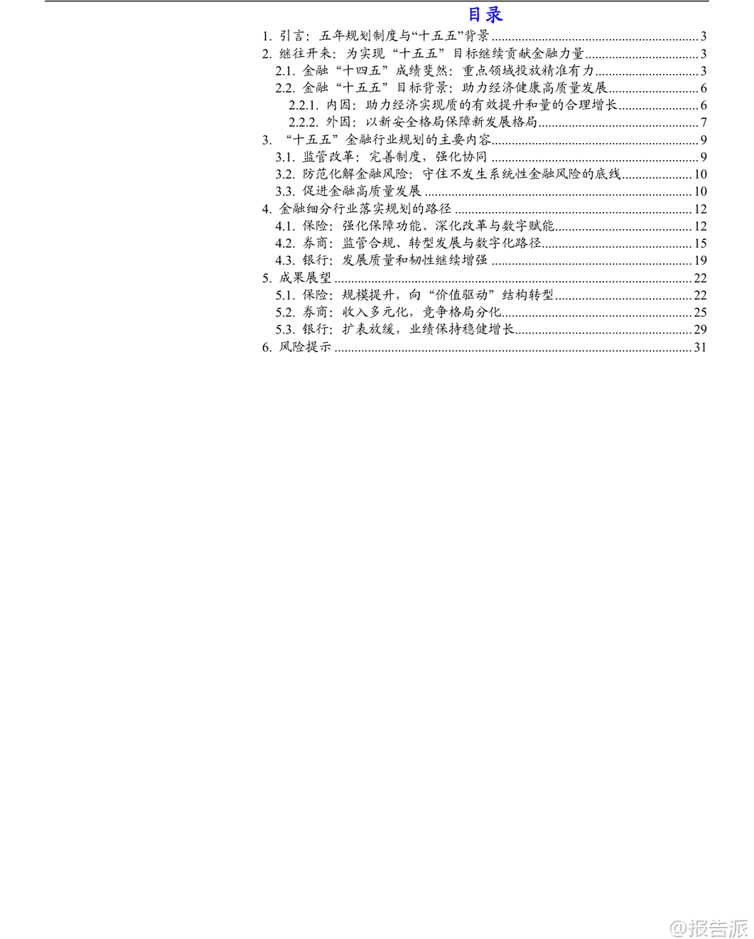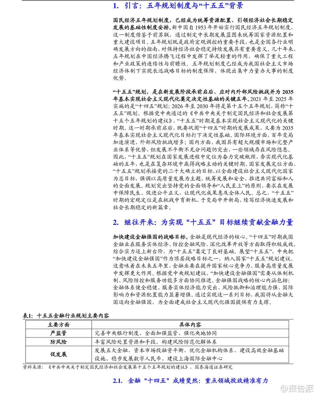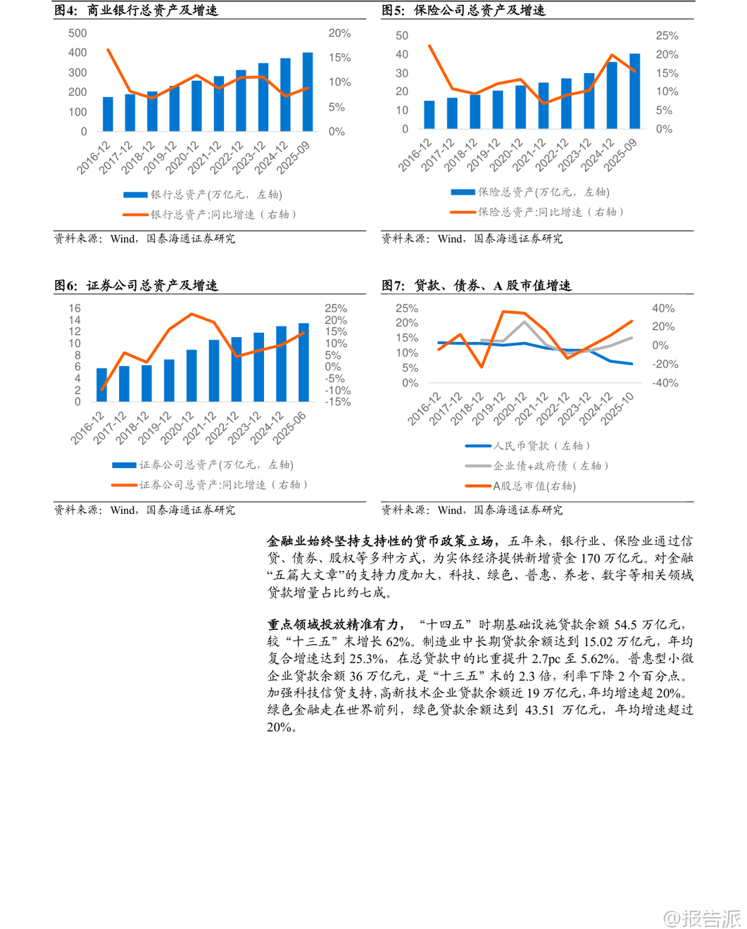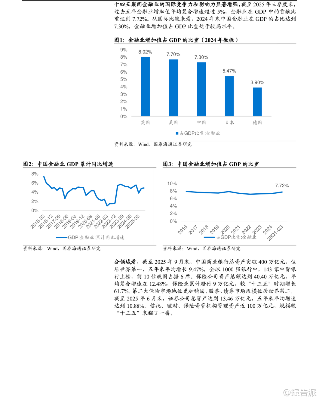 | 在“十四五”取得显著成果的基础上,中国金融业正迈向关键的“十五五”时期(2026-2030年),其核心目标是“加快建设金融强国”。 这一战略定位不仅是对过去五年发展的总结与延续,更是应对内外部挑战、服务国家现代化大局的关键部署。 整体来看,“十五五”金融规划将以“严监管、防风险、促发展”为三大主线,推动银行业、保险业、证券业实现从规模扩张向质量提升的深刻转型。 回顾“十四五”,中国金融业实现了量质齐升。 截至2025年三季度,金融业增加值占GDP比重达7.72%,在全球主要经济体中位居前列。 商业银行总资产突破400万亿元,稳居世界第一;保险公司总资产达40.4万亿元,年均复合增速高达12.48%;证券公司总资产达13.46万亿元,资本市场规模稳居世界第二。 更重要的是,金融资源精准投向重点领域,科技、绿色、普惠、养老、数字等“五篇大文章”相关贷款增量占比约七成,有力支撑了实体经济转型升级。 面向“十五五”,金融行业的发展逻辑发生根本性转变。 外部环境上,百年变局加速演进,防范化解房地产、地方政府债务和中小金融机构风险成为重中之重。 内部要求上,经济需实现“质的有效提升和量的合理增长”,这要求金融必须从“速度型”转向“价值型”发展。 在此背景下,各细分领域的发展路径清晰明确。 保险业将坚守保障本源,深化“价值驱动”转型。 寿险业务将彻底告别“规模至上”的旧模式,通过压缩短期理财型产品、大力发展长期期交、健康养老等高价值产品,实现结构优化。 车险在综合改革后进入高质量发展阶段,竞争焦点转向以大数据、车联网为核心的风控与服务能力。 行业将鼓励专业化经营,形成“大型综合集团+专业特色公司+互联网险企”的多元化生态。 预计到2030年,保费收入有望达到8万亿元,总资产突破60万亿元,更好地发挥经济“减震器”和社会“稳定器”功能。 证券业将坚持服务实体与合规并重,强化直接融资功能。 不同券商将走差异化发展道路:头部券商依托资本和牌照优势,打造“投行+投资+研究”的综合金融服务能力,向万亿级航母迈进;中小券商则聚焦区域或特定领域,如科创投行、财富管理等,形成“小而美”的精品特色。 行业将全力支持科技创新,助力A股IPO和再融资年均规模维持高位,并通过财富管理转型,引导更多中长期资金入市,让普通居民分享经济增长红利。 数字化赋能将成为普遍趋势,AI技术将在智能投顾、风险管理等领域广泛应用。 银行业将淡化规模情结,转向高质量、精细化经营。 资产扩张速度将放缓,预计年均增速回落至6%-8%,信贷结构将持续优化,向制造业、科技创新、绿色经济等“新质生产力”领域倾斜。 面对净息差收窄压力,银行将通过优化资产负债结构、降低运营成本、大力发展中收业务(如财富管理代销)来稳住盈利能力。 国有大行的“压舱石”作用将更加凸显,而中小银行则深耕本地市场,形成错位竞争格局。 资产质量和风险抵御能力保持稳健,拨备覆盖率处于历史高位,为未来发展提供充足安全垫。 展望未来,“十五五”末的中国金融体系将呈现出崭新图景:一个规模更大、结构更优、韧性更强、国际竞争力显著提升的现代金融体系将基本成型。 保险业不再是简单的理财产品销售商,而是风险管理的专业服务商;证券业不再是依赖行情波动的“靠天吃饭”者,而是连接资本与创新的核心枢纽;银行业不再是粗放扩张的信贷机器,而是精耕细作的综合金融服务商。 三者协同发力,共同构建起与社会主义现代化强国相匹配的金融新格局。 当然,前行之路并非坦途。 宏观经济波动、重点领域风险处置不及预期以及监管政策超预期调整,仍是悬在头顶的“达摩克利斯之剑”。 但可以预见,在顶层设计的引领下,中国金融业正坚定地驶向高质量发展的深水区,其最终目标不仅是自身强大,更是为全体人民的美好生活和国家的长治久安提供坚实支撑。 本文由【报告派】研读,输出观点仅作为行业分析! 原文标题:原文标题:2025-12-05-国泰海通证券-国泰海通证券-金融行业“十五五”展望:领航高质量发展 发布时间:2025年 报告出品方:国泰海通 文档页数:32页