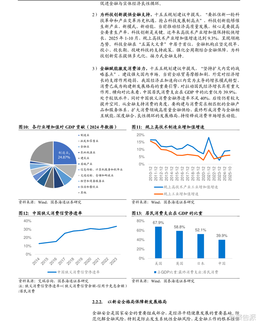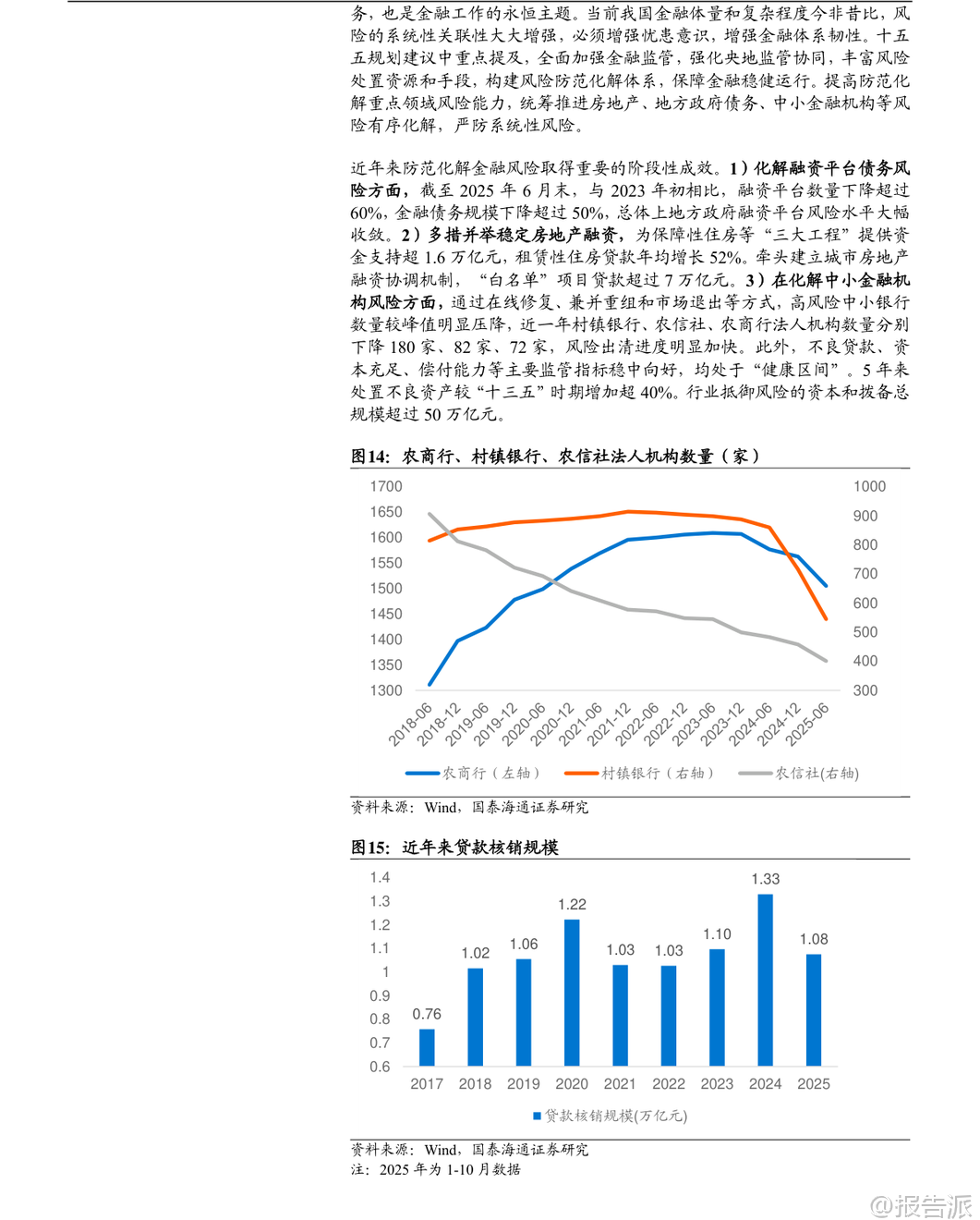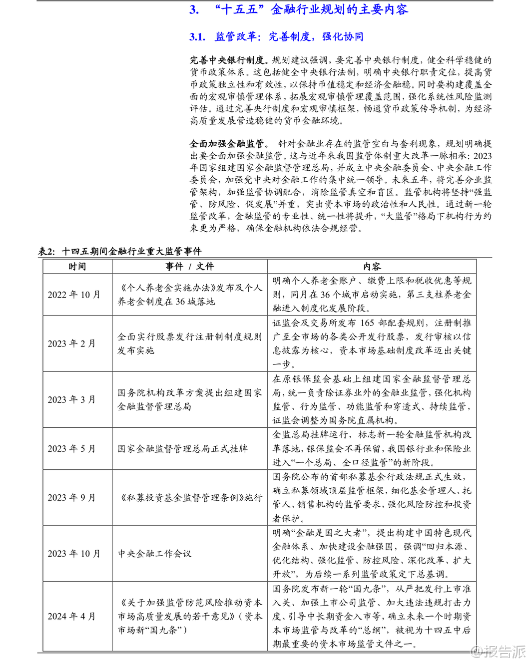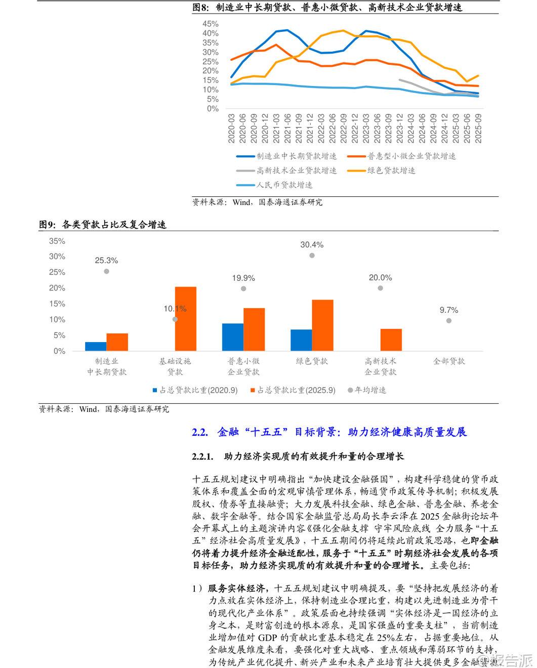 | 在“十四五”取得显著成果的基础上,中国金融业正迈向关键的“十五五”时期(2026-2030年),其核心目标是“加快建设金融强国”。 这一战略定位不仅是对过去五年发展的总结与延续,更是应对内外部挑战、服务国家现代化大局的关键部署。 整体来看,“十五五”金融规划将以“严监管、防风险、促发展”为三大主线,推动银行业、保险业、证券业实现从规模扩张向质量提升的深刻转型。 回顾“十四五”,中国金融业实现了量质齐升。 截至2025年三季度,金融业增加值占GDP比重达7.72%,在全球主要经济体中位居前列。 商业银行总资产突破400万亿元,稳居世界第一;保险公司总资产达40.4万亿元,年均复合增速高达12.48%;证券公司总资产达13.46万亿元,资本市场规模稳居世界第二。 更重要的是,金融资源精准投向重点领域,科技、绿色、普惠、养老、数字等“五篇大文章”相关贷款增量占比约七成,有力支撑了实体经济转型升级。 面向“十五五”,金融行业的发展逻辑发生根本性转变。 外部环境上,百年变局加速演进,防范化解房地产、地方政府债务和中小金融机构风险成为重中之重。 内部要求上,经济需实现“质的有效提升和量的合理增长”,这要求金融必须从“速度型”转向“价值型”发展。 在此背景下,各细分领域的发展路径清晰明确。 保险业将坚守保障本源,深化“价值驱动”转型。 寿险业务将彻底告别“规模至上”的旧模式,通过压缩短期理财型产品、大力发展长期期交、健康养老等高价值产品,实现结构优化。 车险在综合改革后进入高质量发展阶段,竞争焦点转向以大数据、车联网为核心的风控与服务能力。 行业将鼓励专业化经营,形成“大型综合集团+专业特色公司+互联网险企”的多元化生态。 预计到2030年,保费收入有望达到8万亿元,总资产突破60万亿元,更好地发挥经济“减震器”和社会“稳定器”功能。 证券业将坚持服务实体与合规并重,强化直接融资功能。 不同券商将走差异化发展道路:头部券商依托资本和牌照优势,打造“投行+投资+研究”的综合金融服务能力,向万亿级航母迈进;中小券商则聚焦区域或特定领域,如科创投行、财富管理等,形成“小而美”的精品特色。 行业将全力支持科技创新,助力A股IPO和再融资年均规模维持高位,并通过财富管理转型,引导更多中长期资金入市,让普通居民分享经济增长红利。 数字化赋能将成为普遍趋势,AI技术将在智能投顾、风险管理等领域广泛应用。 银行业将淡化规模情结,转向高质量、精细化经营。 资产扩张速度将放缓,预计年均增速回落至6%-8%,信贷结构将持续优化,向制造业、科技创新、绿色经济等“新质生产力”领域倾斜。 面对净息差收窄压力,银行将通过优化资产负债结构、降低运营成本、大力发展中收业务(如财富管理代销)来稳住盈利能力。 国有大行的“压舱石”作用将更加凸显,而中小银行则深耕本地市场,形成错位竞争格局。 资产质量和风险抵御能力保持稳健,拨备覆盖率处于历史高位,为未来发展提供充足安全垫。 展望未来,“十五五”末的中国金融体系将呈现出崭新图景:一个规模更大、结构更优、韧性更强、国际竞争力显著提升的现代金融体系将基本成型。 保险业不再是简单的理财产品销售商,而是风险管理的专业服务商;证券业不再是依赖行情波动的“靠天吃饭”者,而是连接资本与创新的核心枢纽;银行业不再是粗放扩张的信贷机器,而是精耕细作的综合金融服务商。 三者协同发力,共同构建起与社会主义现代化强国相匹配的金融新格局。 当然,前行之路并非坦途。 宏观经济波动、重点领域风险处置不及预期以及监管政策超预期调整,仍是悬在头顶的“达摩克利斯之剑”。 但可以预见,在顶层设计的引领下,中国金融业正坚定地驶向高质量发展的深水区,其最终目标不仅是自身强大,更是为全体人民的美好生活和国家的长治久安提供坚实支撑。 本文由【报告派】研读,输出观点仅作为行业分析! 原文标题:原文标题:2025-12-05-国泰海通证券-国泰海通证券-金融行业“十五五”展望:领航高质量发展 发布时间:2025年 报告出品方:国泰海通 文档页数:32页