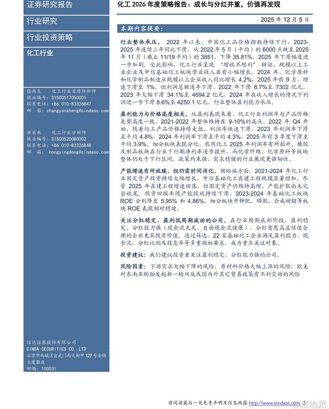 : 本文由【报告派】研读,输出观点仅作为行业分析!原文标题:2025-12-05-信达证券-信达证券-化工行业2026年度策略报告:成长与分红并重,价值再发现发布时间:2025年出品方:信达证券文档页数:34页 以上截图为原文 ...