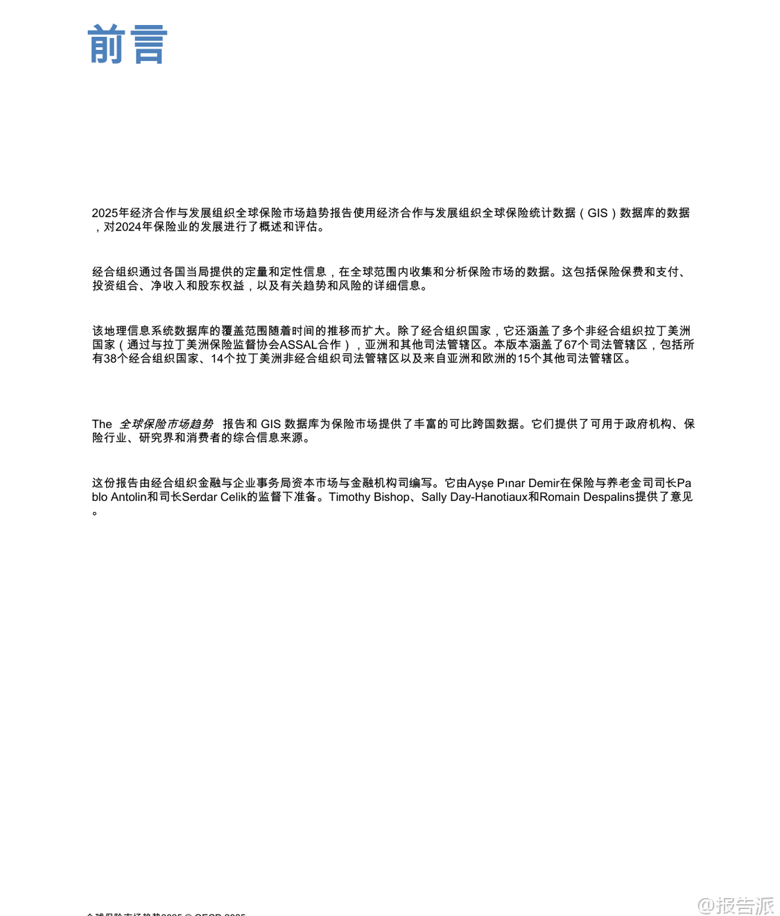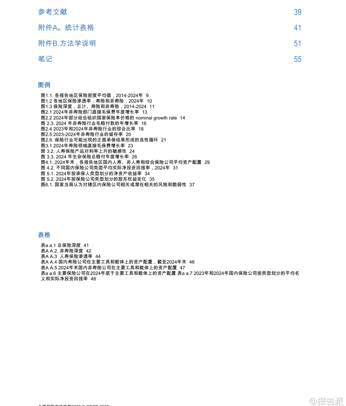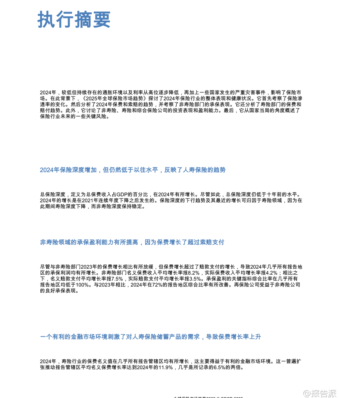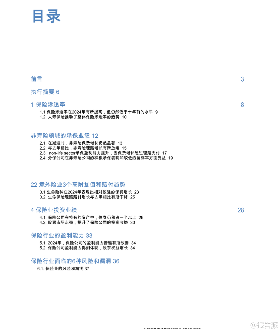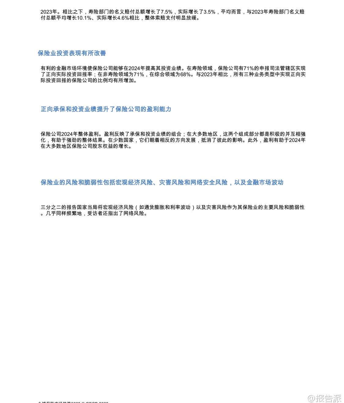 | 根据经济合作与发展组织(OECD)发布的《全球保险市场趋势 2025》报告,2024年全球保险市场在通胀放缓、利率高位回落以及自然灾害频发的背景下展现出整体复苏态势。 报告基于覆盖67个司法管辖区的全球保险统计数据(GIS),全面分析了保险渗透率、承保业绩、投资回报、盈利能力及未来风险等关键维度。 总体来看,2024年全球保险渗透率(总保费占GDP比重)有所回升,经合组织国家平均从2023年的6.0%上升至6.2%,所有报告地区平均从5.3%升至5.4%。 然而,这一水平仍低于十年前,主要受人寿保险渗透率波动影响。 非寿险渗透率在过去十年保持相对稳定,维持在2.1%至2.5%之间,而寿险渗透率的下降是导致此前几年整体下滑的主要原因。 尽管如此,2024年人寿保险业务表现强劲,成为推动总保费增长的核心动力。 在非寿险领域,虽然保费增长率较2023年的高基数有所放缓,但名义平均增长仍达8.2%(实际增长4.2%),显著高于赔款支付的名义增长率7.5%(实际增长3.5%)。 这使得非寿险行业的综合比率(衡量承保盈利能力的关键指标)在绝大多数地区低于100%,承保利润普遍改善。 保费上涨主要受持续通胀推动,导致维修成本、医疗费用和车辆价值上升,保险公司通过提高保单价格将成本转嫁。 此外,新车销售增加、建筑项目扩张以及企业与家庭风险意识提升也促进了保单销量增长。 值得注意的是,再保险公司受益于直接保险公司的良好承保表现和留存率下降,其综合比率进一步优化,形成良性循环。 人寿保险部门在2024年实现了强劲反弹,平均名义保费增长率高达11.9%,几乎是2023年6.5%的两倍,实际增长也达到7.8%。 这一增长主要得益于有利的金融市场环境:一方面,高利率提升了储蓄型人寿产品(如固定年金)的吸引力;另一方面,全球股市走强带动了单位连结等投资型产品的市场需求。 多个国家如法国、墨西哥、美国和英国均报告年金或储蓄型产品需求显著回升。 此外,监管改革(如荷兰养老金体系转型)和消费者对财务安全的关注也推动了保费增长。 与此同时,寿险赔付总额的增长速度明显放缓,名义增长7.5%(实际增长3.5%),远低于2023年10.1%的水平,部分归因于退保率下降和死亡率回归常态。 从资产配置看,债券仍是保险公司的核心持仓,占总投资组合的半数以上。 其中,寿险公司平均持有60.7%的债券,非寿险为52.2%,综合保险公司则高达64.6%。 股票、现金及存款、集体投资计划和其他另类资产构成其余部分。 不同国家和地区存在显著差异,例如瑞典寿险公司股票配置比例高达44.5%,而匈牙利和巴拉圭的“其他”类别占比突出,反映其对基础设施、私募股权等长期资产的投资偏好。 投资业绩方面,2024年保险公司整体实现正向净投资回报。 在有利的利率和资本市场环境下,71%的人寿保险公司和非寿险公司、68%的综合保险公司录得正的实际投资回报率,较2023年明显改善。 挪威、秘鲁等国回报率领先,而土耳其因本币贬值等因素面临负回报。 盈利能力方面,2024年保险公司整体盈利状况增强。 净资产收益率(ROE)在多数司法管辖区为正,且股东权益普遍增长,反映出承保利润与投资收益的双重驱动效应。 尽管少数国家出现承保与投资表现相抵的情况,但整体趋势向好。 展望未来,各国监管机构普遍认为宏观经济风险(如通胀与利率波动)、自然灾害风险、网络安全风险以及金融市场波动是保险业面临的主要挑战。 超过三分之二的受访当局将前两者列为首要风险。 此外,偿付能力、流动性及声誉风险亦不容忽视。 EIOPA的保险风险仪表板显示,尽管整体前景稳定,但宏观经济、市场、ESG及数字化相关风险正在加剧。 该报告为政策制定者、行业参与者和研究机构提供了权威的跨国比较数据和趋势洞察。 本文由【报告派】研读,输出观点仅作为行业分析! 原文标题:2025-12-06-OECD-全球保险行业市场趋势2025(英译中) 发布时间:2025年 报告出品方:OECD 文档页数:55页