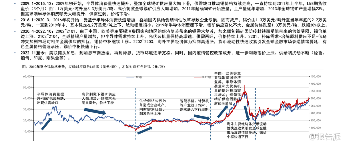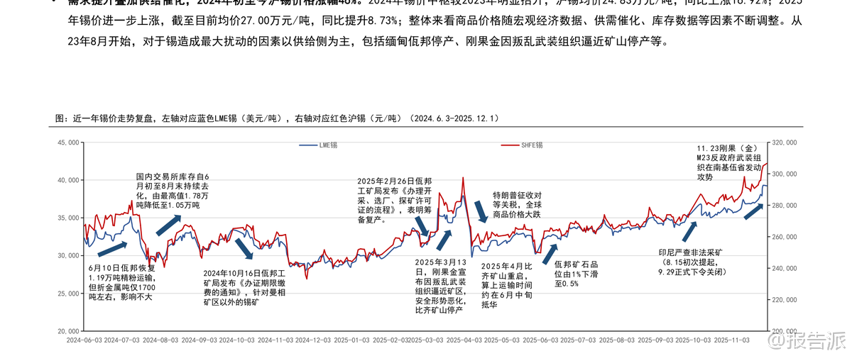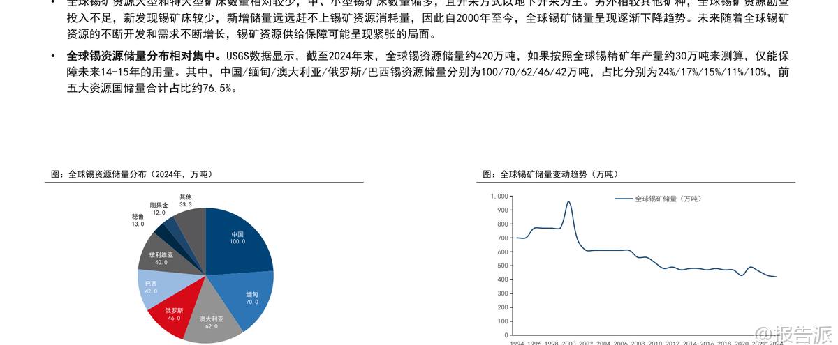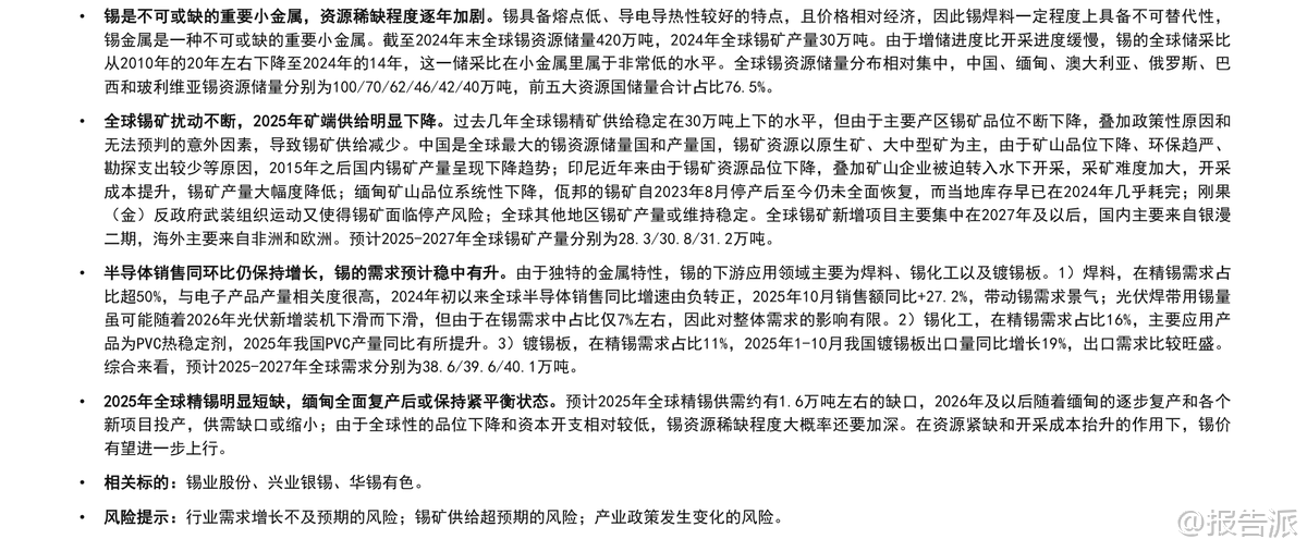 | 锡作为不可或缺的重要小金属,近年来资源稀缺程度持续加剧。 根据国信证券发布的《锡行业专题:矿端紧缺,库存低位》报告,截至2024年末,全球锡资源储量为420万吨,当年全球锡矿产量约为30万吨,储采比已下降至14年,远低于2010年的20年水平,在各类小金属中属于极低水平。 全球锡资源分布高度集中,中国、缅甸、澳大利亚、俄罗斯和巴西合计占比达76.5%,其中中国以100万吨储量位居第一。 供给端扰动频繁,成为影响锡价的核心变量。 2025年全球锡矿产量预计为28.3万吨,较2024年明显下滑。 主要产锡国均面临不同程度的供应压力:中国作为最大产锡国,受矿山品位下降、环保趋严及勘探投入不足影响,锡矿产量自2015年起呈长期下降趋势,2024年产量为6.9万吨;印尼因锡矿品位下降,企业被迫转入水下开采,成本上升,叠加政府打击非法采矿,产量大幅回落,2024年产量仅5万吨;缅甸佤邦自2023年8月停产以来至今未全面恢复,其锡矿品位也从1%降至0.5%,导致2024年中国自缅进口锡矿量锐减,2025年进口仍处低位;刚果(金)因M23反政府武装冲突,核心矿区比齐矿山在2025年3月一度停产,虽4月复产但地缘风险持续存在。 此外,全球新增锡矿项目多集中在2027年以后投产,短期内难以缓解供给紧张局面。 需求端则呈现稳中有升态势。 2024年全球精锡消费量约37.8万吨,同比增长2.8%;预计2025年将达38.6万吨,同比增长2.1%。 下游应用中,焊料占比超50%,与半导体、电子产业景气度高度相关。 2025年以来,全球半导体销售同比增速由负转正,10月销售额同比大增27.2%,显著拉动锡需求。 光伏领域用锡虽占比较小(约7%),且未来增速可能放缓,但对整体需求影响有限。 锡化工主要用于PVC热稳定剂,2025年国内PVC产量同比提升,带动锡化工需求小幅增长。 镀锡板方面,2025年前10个月我国出口量同比增长19%,出口需求旺盛,支撑锡需求景气。 供需格局方面,2025年全球精锡预计将出现约1.6万吨的短缺,2026年后随着缅甸逐步复产及新项目释放,或转向紧平衡状态。 当前全球交易所显性库存已从2024年高点的2.2万吨以上回落至2025年11月的约9500吨,接近2022年水平,库存压力显著缓解。 同时,冶炼加工费从2024年的1.16万元/吨降至2025年的8200元/吨左右,反映矿端紧缺程度加剧。 在资源稀缺、开采成本抬升、资本开支不足的背景下,锡价有望延续上行趋势。 报告推荐关注三条投资主线:一是资源储备丰富、产业链完整的龙头企业锡业股份;二是拥有优质国内外矿山资产、未来增量明确的兴业银锡;三是区域龙头华锡有色。 主要风险包括:下游电子、光伏等领域需求不及预期;锡矿供给恢复超预期;以及产业政策发生重大变化等。 总体来看,锡行业正处在“矿端紧缺、库存低位”的关键周期,供给约束强化了锡的资源属性,为价格提供坚实支撑。 本文由【报告派】研读,输出观点仅作为行业分析! 原文标题:原文标题:2025-12-10-国信证券-国信证券-锡行业专题:矿端紧缺,库存低位 发布时间:2025年 报告出品方:国信证券