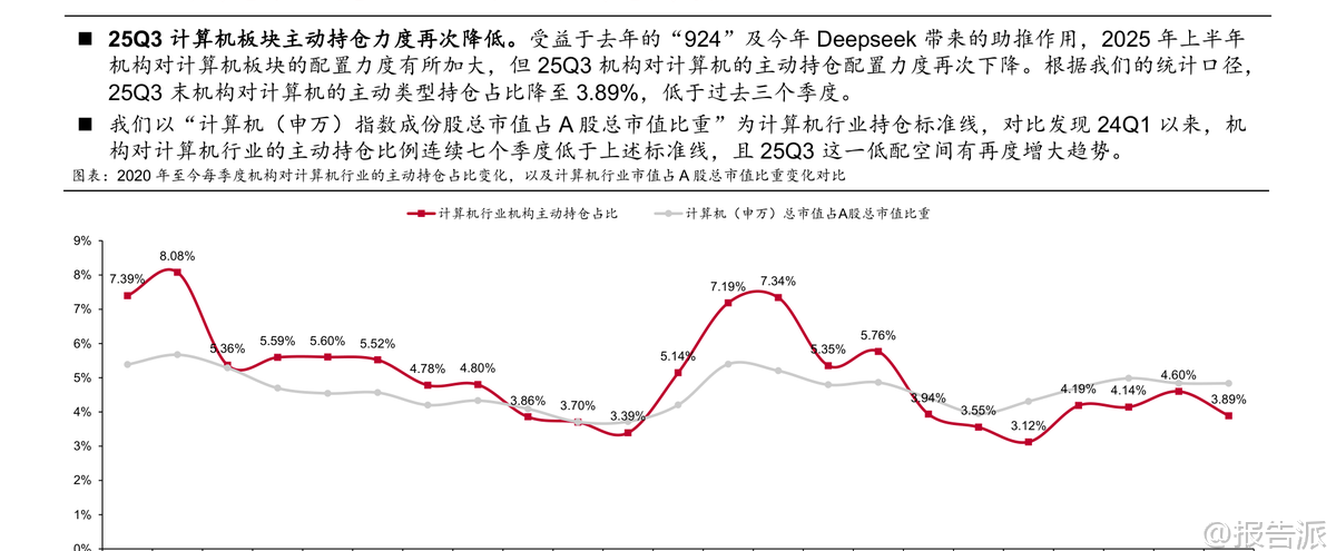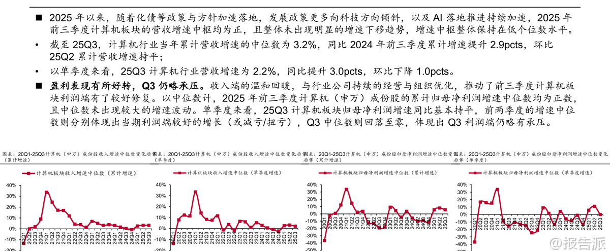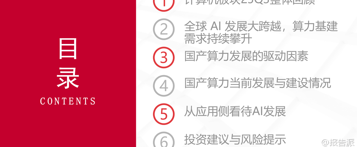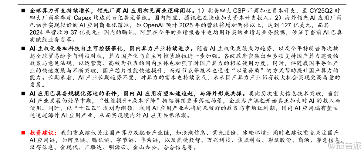 | 在人工智能技术迅猛发展的背景下,算力作为支撑AI大模型训练与推理的核心基础设施,已成为全球科技竞争的关键领域。 中泰证券发布的《知常明变,守正创新——再论算力与AI》研究报告全面剖析了当前全球及中国算力产业的发展趋势、国产化进程、应用落地情况以及未来投资方向。 全球四大云服务厂商(CSP)——微软、谷歌、亚马逊和Meta,在2025年第二季度的资本开支均已达到百亿美元量级,其中亚马逊单季Capex高达314亿美元,显示出海外科技巨头对AI基础设施的持续加码。 与此同时,英伟达自2022年底以来营收保持高速增长,反映出生成式AI带来的强劲算力需求。 国内方面,阿里巴巴宣布未来将投入3800亿元建设AI基础设施,腾讯2025年Q2资本开支同比激增119%至191.1亿元,表明中国企业也在加速布局算力赛道。 从底层数据看,全球大模型Token调用量在过去一年内增长近17倍,中国公有云大模型调用量在2025年上半年已达536.7万亿Tokens,较2024年全年增长近400%,印证了AI应用正在快速进入规模化落地阶段。 OpenAI预计2025年营收将突破127亿美元,是2024年的三倍以上;Anthropic预测2027年营收可达345亿美元,商业化进程显著提速。 这些数据表明,AI已从技术探索走向商业闭环。 在此背景下,AI主权化趋势日益明显。 美国、英国、法国、日本、韩国等主要国家纷纷出台AI发展战略,强调技术自主可控。 地缘政治波动加剧,尤其是特朗普政府重启“对等关税”政策,并限制高性能芯片对华出口,使得我国高端AI芯片对外依存度高的问题凸显——目前进口AI芯片占比约70%。 这一外部压力倒逼国内加快国产替代步伐。 国家安全层面也敲响警钟。 2025年7月,国家网信办约谈英伟达,质疑其H20芯片存在“远程关闭”“追踪定位”等安全隐患,进一步推动国产算力生态建设。 在此背景下,国家与地方密集出台政策支持国产数据中心发展。 例如广东提出到2025年底新增国产化算力占比达70%;江苏要求新建算力中心国产芯片使用率超70%;北京经开区每年发放1亿元算力券,国产算力抵扣比例更高,形成强力引导。 技术路径上,AI正从“训练为主”转向“推理为王”。 IDC数据显示,2024年全球AI芯片支出中推理占比已超65%,预计到2027年中国推理工作负载占比将达72.6%。 这一转变利好国产ASIC芯片厂商,因其具备高能效、定制化优势。 同时,尽管国产先进制程受限,但通过“超节点”架构实现“以量补质”的技术路线取得突破。 华为384超节点整合384颗昇腾NPU,算力达300PFlops;百度昆仑芯超节点实现单卡性能提升95%,单实例推理性能提升8倍,验证了国产集群方案的可行性。 国内算力基础设施建设持续推进。 截至2024年底,全国已投产智算中心项目达150个,总规划算力超60万P。 运营商、地方政府和科技企业成为主导力量。 三大运营商在服务器集采中大幅提高国产化比例:中国电信2024-2025年采购中国产服务器占比达67.5%;中国联通2025年通用服务器采购中,国产服务器出货量占比超90%。 高校科研机构也在积极部署国产算力设备,如上海交大、北航、浙大等均采购国产GPU服务器用于教学与研究。 从应用侧看,AI仍处于渗透率提升的早中期阶段。 中国生成式AI用户规模达5.15亿,普及率36.5%;美国企业AI使用率达44.8%。 AI初创公司实现百万美元年收入的周期比SaaS公司缩短近4个月,体现出更强的增长势能。 随着模型能力持续提升、推理成本不断下降,越来越多场景被解锁。 企业AI支出重心已从训练转向推理,74%的AI初创企业主要工作负载来自推理。 开源模型虽性能落后闭源9-12个月,但已成为企业控制成本的重要手段。 政策层面,“人工智能+”行动和“十五五”规划为AI发展提供顶层设计。 国务院提出到2027年实现AI与六大领域深度融合,2030年新一代智能终端普及率超90%。 报告建议重点关注两大投资主线:一是国产算力及配套产业链,如浪潮信息、紫光股份、冰轮环境;二是国产AI应用链,包括阿里链、腾讯链、字节链、华为链,以及鼎捷数智、万兴科技、焦点科技、彩讯股份、商汤、赛意信息、汉得信息、金现代、广联达、明源云、金山办公、合合信息等标的。 总体来看,算力作为数字经济时代的“新电力”,其战略地位愈发突出。 在外部封锁与内部升级双重驱动下,国产算力产业迎来历史性发展机遇,长期成长空间广阔。 本文由【报告派】研读,输出观点仅作为行业分析! 原文标题:2025-12-10-中泰证券-中泰证券-计算机行业:知常明变,守正创新——再论算力与AI 发布时间:2025年 报告出品方:中泰证券 文档页数:71页