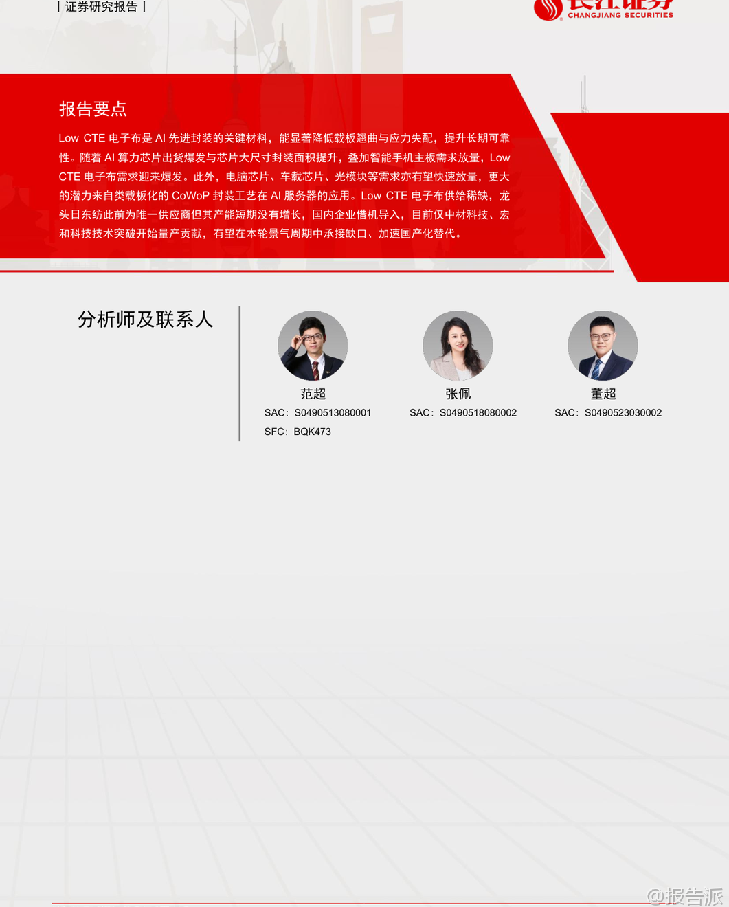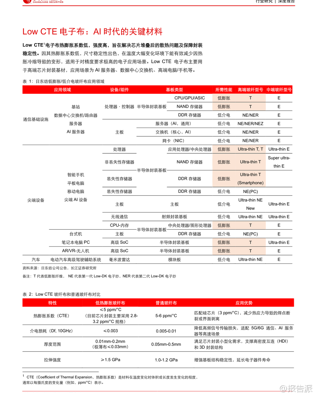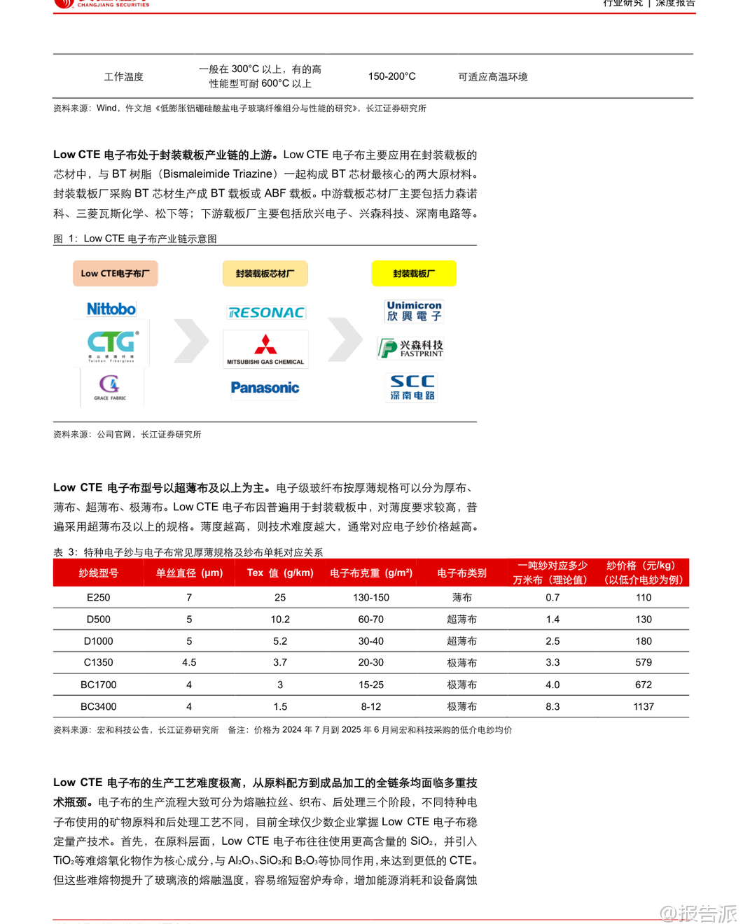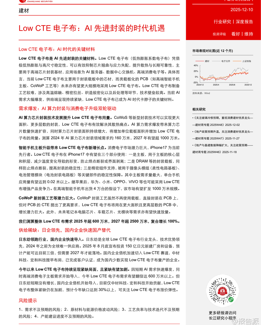 | 在人工智能算力需求爆发的推动下,Low CTE(低热膨胀系数)电子布正成为高端芯片封装领域的关键材料。 这种特种电子布凭借其极低的热膨胀系数(通常为2.8–3.2 ppm/°C),能有效匹配硅芯片的热膨胀特性,显著降低封装载板在温度变化过程中的翘曲与应力失配,从而提升封装的长期可靠性。 随着AI服务器、数据中心交换机以及高端消费电子产品的快速发展,Low CTE电子布的需求正在迎来前所未有的增长周期。 当前,全球Low CTE电子布市场高度集中,日本日东纺(Nittobo)长期占据主导地位,其T-glass产品已成为行业标准。 然而,面对AI算力芯片出货量激增和智能手机主板升级带来的双重需求拉动,日东纺短期内产能难以快速扩张,导致供应链持续紧张。 2025年以来,已有多个消息显示Low CTE电子布出现短缺,影响了英伟达、AMD等大厂的AI芯片交付节奏。 为此,日东纺虽已宣布投资150亿日元扩产,预计2027年初投产后产能可达现有三倍,但短期内供给缺口仍难以缓解。 这一供需错配为国内企业提供了历史性机遇。 中材科技与宏和科技作为国产替代的先行者,已成功突破技术壁垒,实现Low CTE电子布的量产并获得力森诺科、三菱瓦斯化学、台光电子等国际头部客户的认证。 其中,宏和科技自2024年起逐步放量,2025年8月月产能已达12.1万米,月销量接近10万米,较上半年增长近三倍。 公司具备从玻纤纱到织布的一体化生产能力,Low CTE纱线全部自供,毛利率高达约66%,展现出强劲的盈利能力和成长潜力。 需求端来看,Low CTE电子布的核心应用场景正从AI算力芯片封装向智能手机主板延伸。 以iPhone17为例,预计将首次在AP主板和RF板中大规模采用SLP(类载板)工艺,并引入Low CTE电子布以应对高密度集成带来的热变形问题。 单台手机用量有望超过0.02米,在高端智能手机年出货4亿台的假设下,仅此一项就将带来超1000万米的市场需求。 此外,DRAM等存储芯片的封装载板、摄像头模组、电池管理模块等精密组件也在逐步导入该材料,进一步拓宽应用边界。 更长远的增长潜力来自CoWoP(Chip-on-Wafer-on-PCB)等新型封装工艺的发展。 该技术跳过传统载板,直接将芯片封装在高性能PCB上,对基材的热稳定性提出更高要求。 尽管目前尚未大规模商用,但包括英伟达在内的头部厂商已在预研阶段,一旦落地将大幅增加Low CTE电子布的使用面积和层数,推动需求跃升。 据测算,2024年全球Low CTE电子布总需求约为342万米,2025年有望突破660万米,2027年或将超过2500万米,复合增长率接近100%。 而供给端受限于技术门槛高、窑炉建设周期长等因素,新增产能释放缓慢,预计2025年供需缺口仍将超过30%。 在此背景下,具备先发优势和技术积累的国内企业有望加速国产替代进程,抢占高端电子材料市场的战略高地。 总体而言,Low CTE电子布正处于“技术+需求”双轮驱动的关键窗口期。 AI算力升级、消费电子创新与先进封装演进共同构筑了广阔的成长空间。 虽然面临原材料价格波动、良率控制及扩产进度不及预期等风险,但在国产替代趋势明确、下游客户认证通道打开的有利条件下,中国企业在这一高壁垒领域已迈出实质性步伐,未来有望在全球半导体材料供应链中占据更重要的位置。 本文由【报告派】研读,输出观点仅作为行业分析! 原文标题:2025-12-10-长江证券-长江证券-建材行业Low CTE电子布:AI先进封装的时代机遇 发布时间:2025年 报告出品方:长江证券 文档页数:30页