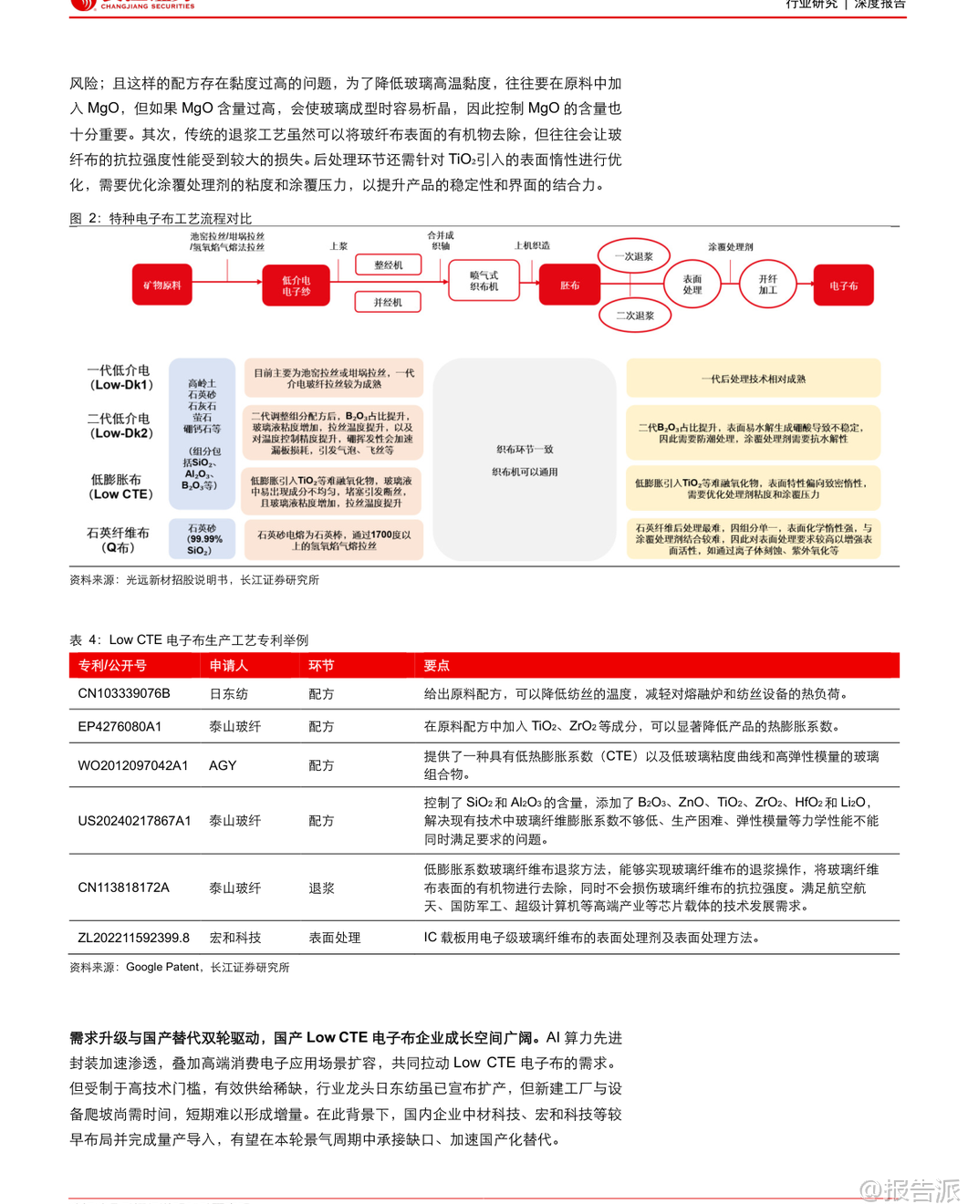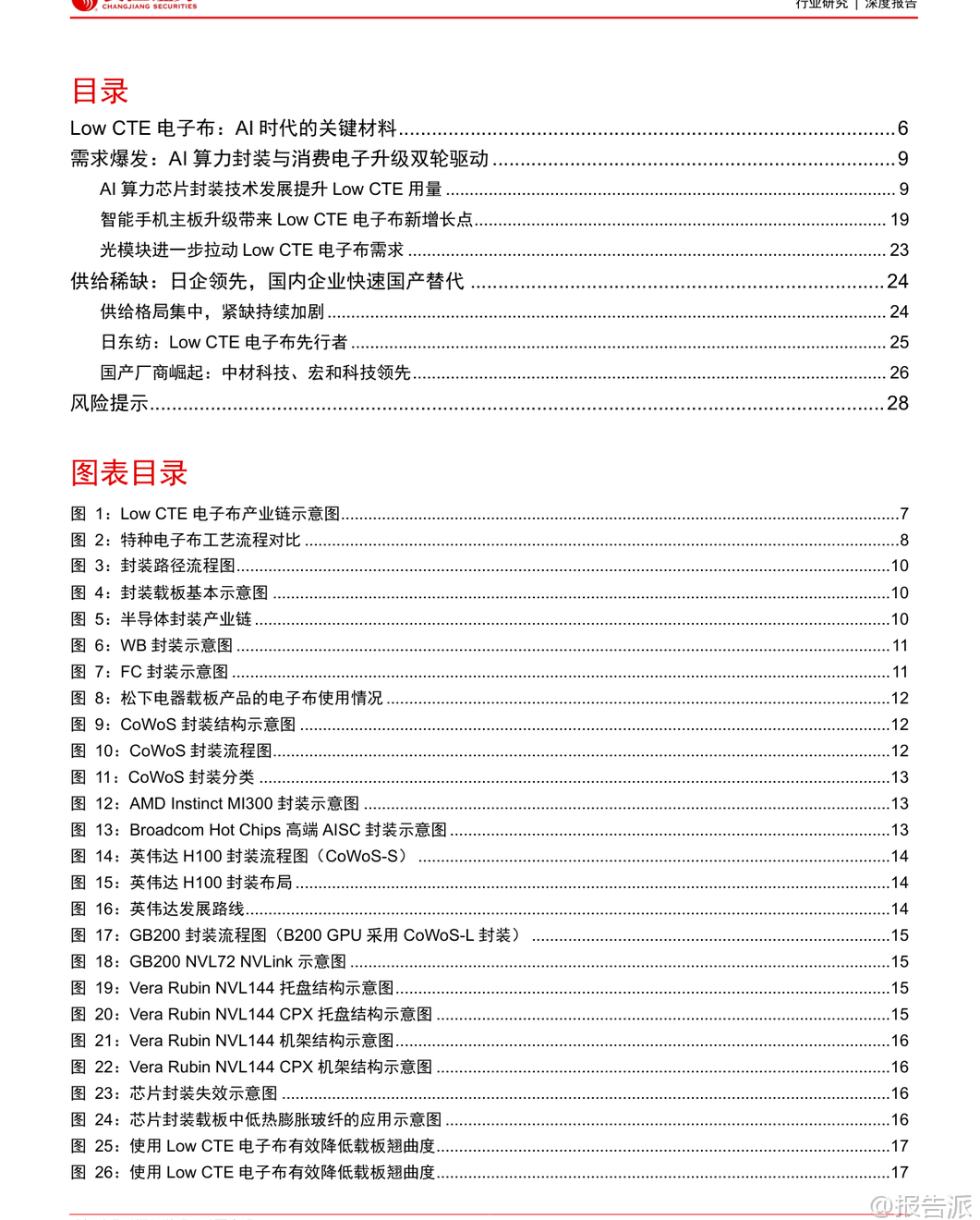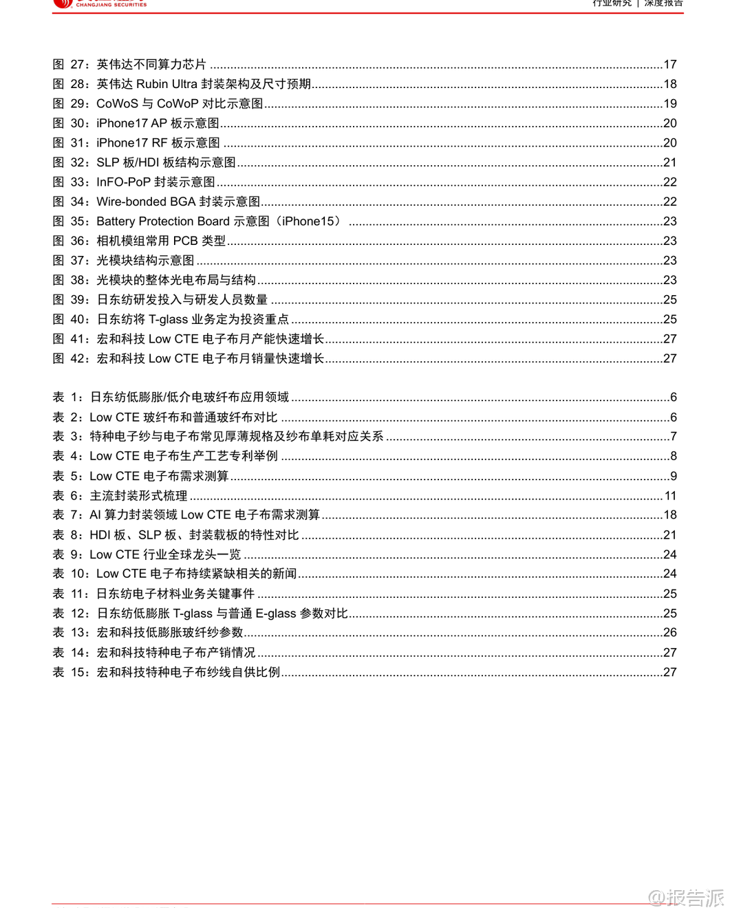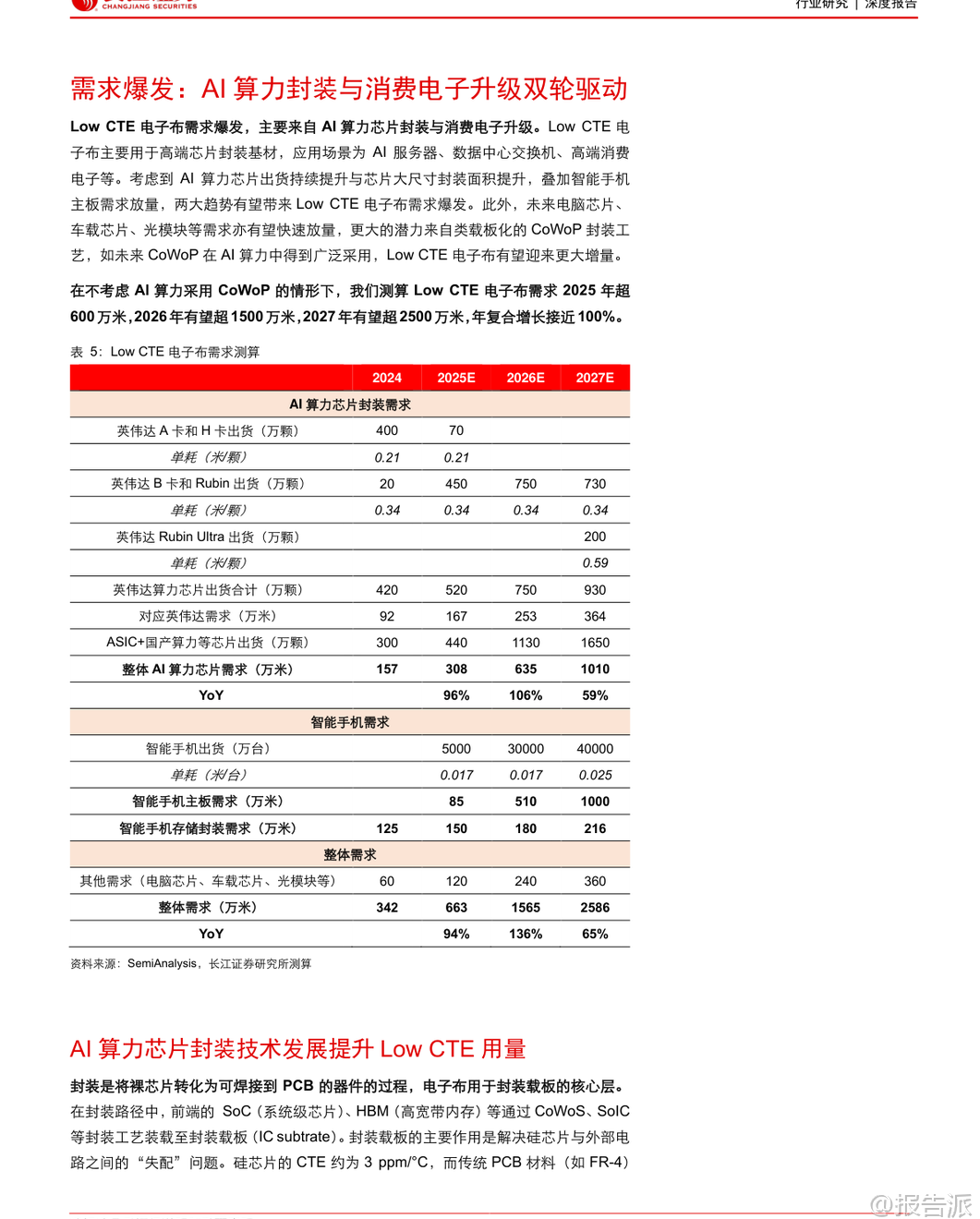 | 在人工智能算力需求爆发的推动下,Low CTE(低热膨胀系数)电子布正成为高端芯片封装领域的关键材料。 这种特种电子布凭借其极低的热膨胀系数(通常为2.8–3.2 ppm/°C),能有效匹配硅芯片的热膨胀特性,显著降低封装载板在温度变化过程中的翘曲与应力失配,从而提升封装的长期可靠性。 随着AI服务器、数据中心交换机以及高端消费电子产品的快速发展,Low CTE电子布的需求正在迎来前所未有的增长周期。 当前,全球Low CTE电子布市场高度集中,日本日东纺(Nittobo)长期占据主导地位,其T-glass产品已成为行业标准。 然而,面对AI算力芯片出货量激增和智能手机主板升级带来的双重需求拉动,日东纺短期内产能难以快速扩张,导致供应链持续紧张。 2025年以来,已有多个消息显示Low CTE电子布出现短缺,影响了英伟达、AMD等大厂的AI芯片交付节奏。 为此,日东纺虽已宣布投资150亿日元扩产,预计2027年初投产后产能可达现有三倍,但短期内供给缺口仍难以缓解。 这一供需错配为国内企业提供了历史性机遇。 中材科技与宏和科技作为国产替代的先行者,已成功突破技术壁垒,实现Low CTE电子布的量产并获得力森诺科、三菱瓦斯化学、台光电子等国际头部客户的认证。 其中,宏和科技自2024年起逐步放量,2025年8月月产能已达12.1万米,月销量接近10万米,较上半年增长近三倍。 公司具备从玻纤纱到织布的一体化生产能力,Low CTE纱线全部自供,毛利率高达约66%,展现出强劲的盈利能力和成长潜力。 需求端来看,Low CTE电子布的核心应用场景正从AI算力芯片封装向智能手机主板延伸。 以iPhone17为例,预计将首次在AP主板和RF板中大规模采用SLP(类载板)工艺,并引入Low CTE电子布以应对高密度集成带来的热变形问题。 单台手机用量有望超过0.02米,在高端智能手机年出货4亿台的假设下,仅此一项就将带来超1000万米的市场需求。 此外,DRAM等存储芯片的封装载板、摄像头模组、电池管理模块等精密组件也在逐步导入该材料,进一步拓宽应用边界。 更长远的增长潜力来自CoWoP(Chip-on-Wafer-on-PCB)等新型封装工艺的发展。 该技术跳过传统载板,直接将芯片封装在高性能PCB上,对基材的热稳定性提出更高要求。 尽管目前尚未大规模商用,但包括英伟达在内的头部厂商已在预研阶段,一旦落地将大幅增加Low CTE电子布的使用面积和层数,推动需求跃升。 据测算,2024年全球Low CTE电子布总需求约为342万米,2025年有望突破660万米,2027年或将超过2500万米,复合增长率接近100%。 而供给端受限于技术门槛高、窑炉建设周期长等因素,新增产能释放缓慢,预计2025年供需缺口仍将超过30%。 在此背景下,具备先发优势和技术积累的国内企业有望加速国产替代进程,抢占高端电子材料市场的战略高地。 总体而言,Low CTE电子布正处于“技术+需求”双轮驱动的关键窗口期。 AI算力升级、消费电子创新与先进封装演进共同构筑了广阔的成长空间。 虽然面临原材料价格波动、良率控制及扩产进度不及预期等风险,但在国产替代趋势明确、下游客户认证通道打开的有利条件下,中国企业在这一高壁垒领域已迈出实质性步伐,未来有望在全球半导体材料供应链中占据更重要的位置。 本文由【报告派】研读,输出观点仅作为行业分析! 原文标题:2025-12-10-长江证券-长江证券-建材行业Low CTE电子布:AI先进封装的时代机遇 发布时间:2025年 报告出品方:长江证券 文档页数:30页