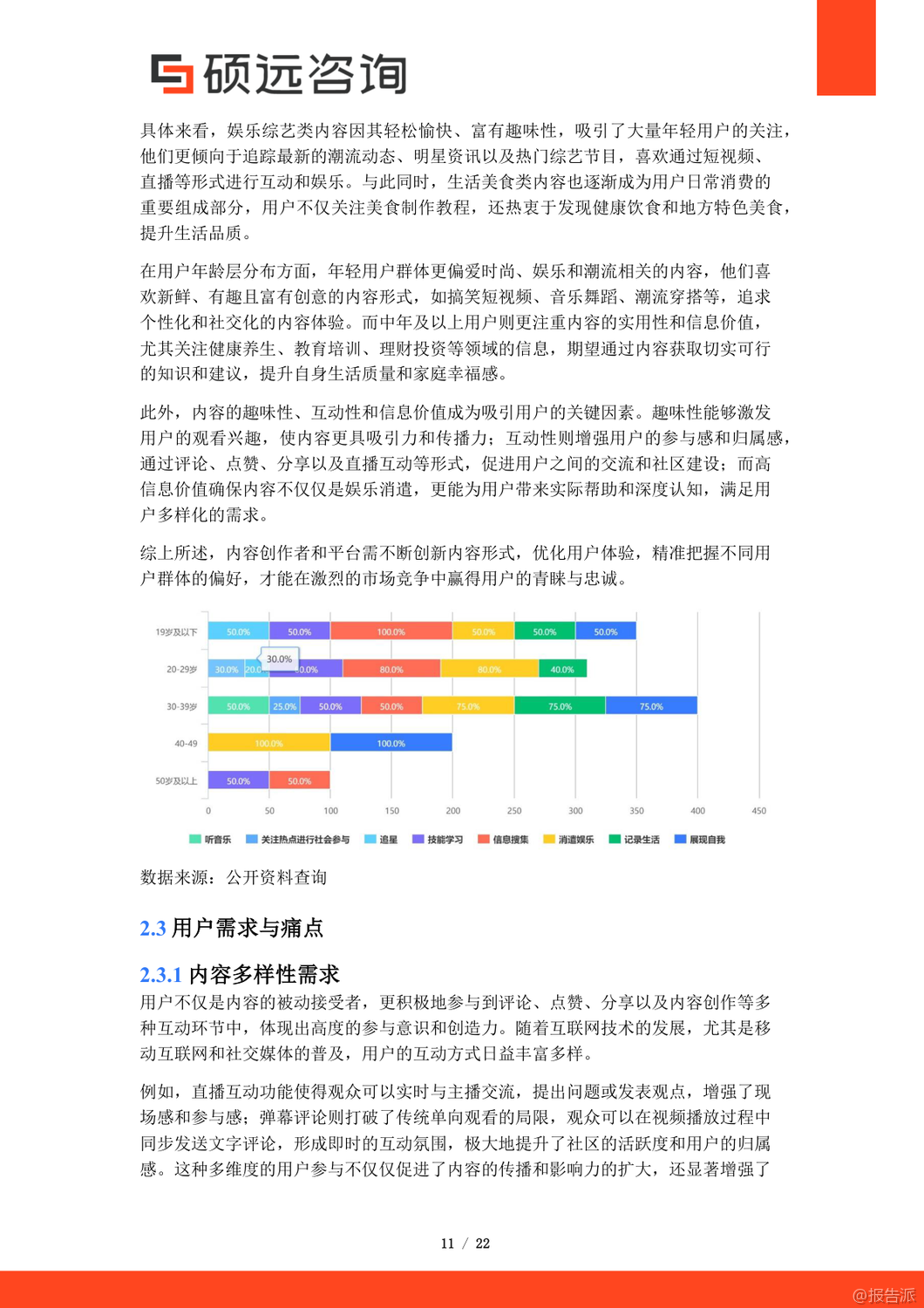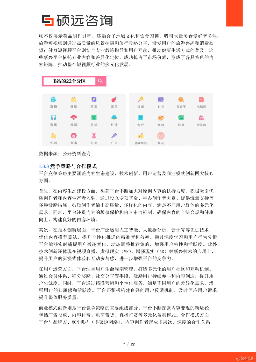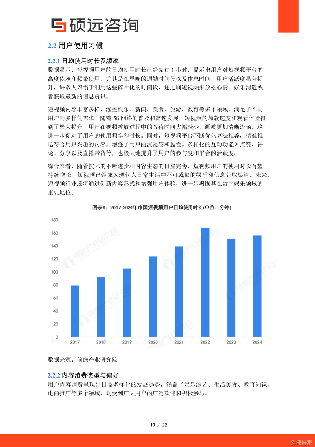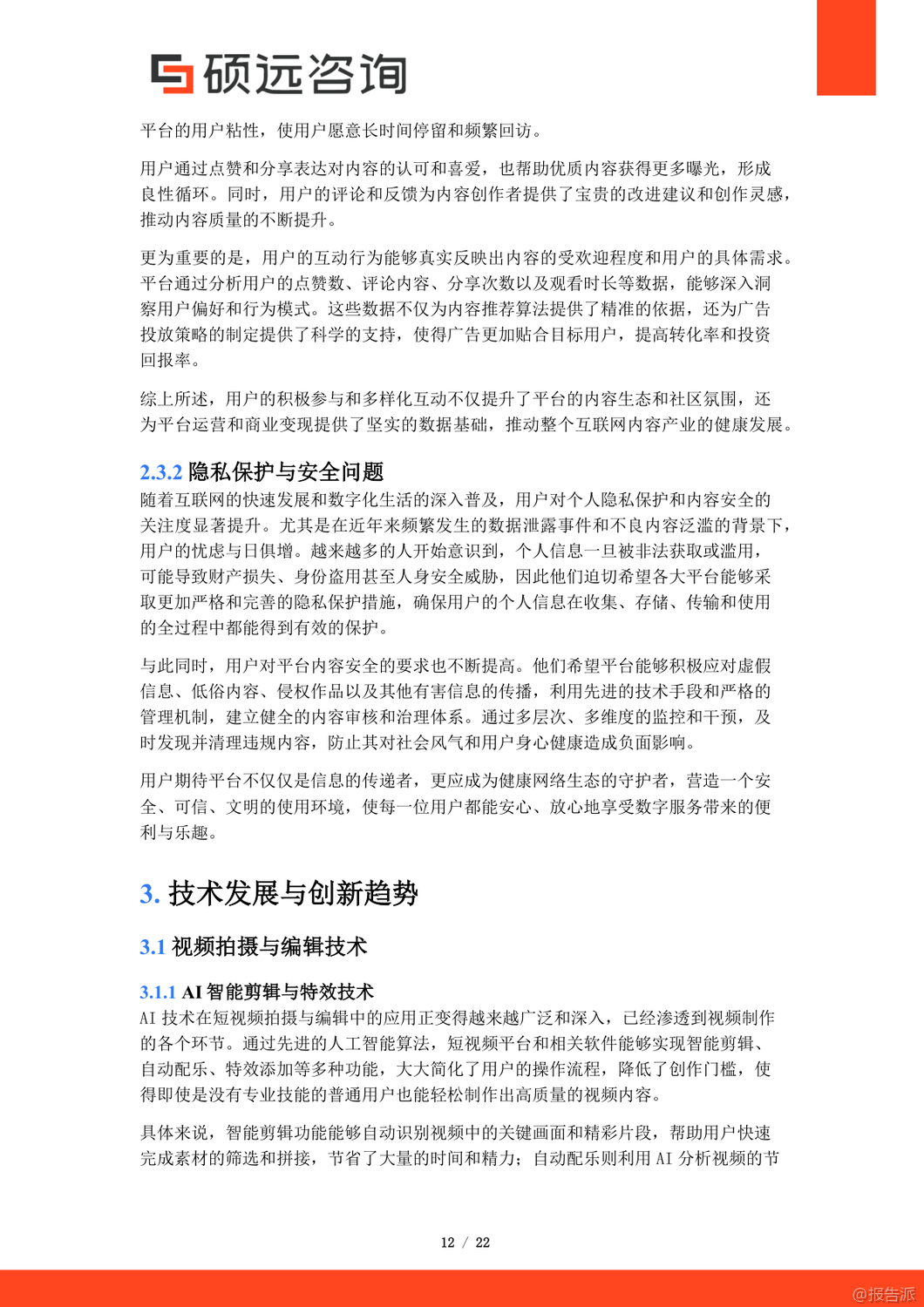 | 2025年中国短视频行业正处于规模化、智能化与多元化深度融合的关键发展阶段。 根据最新行业洞察,短视频已从最初的娱乐工具演变为集内容消费、社交互动、电商转化和知识传播于一体的综合性数字生态平台。 预计到2025年,中国短视频市场规模将突破数千亿元人民币,持续保持两位数增长。 这一增长得益于5G技术的全面普及、人工智能算法的深度应用以及用户需求的不断升级。 5G网络带来的高速率与低延迟,显著提升了高清乃至超高清视频的流畅播放体验,推动4K/8K内容加速落地;AI技术则在内容推荐、智能剪辑、自动配乐和特效生成等方面发挥核心作用,极大降低了创作门槛,提升了内容生产效率与个性化分发精度。 用户层面,短视频平台已形成鲜明的用户画像结构。 核心用户集中于18至35岁的年轻群体,性别分布趋于均衡,尤其在美妆、时尚等领域女性用户增长迅猛。 地域上呈现“全域渗透”特征:一线城市用户偏好高品质、潮流化内容,而三线及以下城市和农村地区用户规模增长最快,更关注生活技巧、本地资讯和实用型内容。 日均使用时长已超过1小时,通勤、休息等碎片化时间成为主要使用场景,反映出短视频已成为现代人信息获取与休闲娱乐的刚需入口。 在内容生态方面,娱乐综艺、生活美食、教育知识和电商推广构成四大主流赛道。 其中,知识类内容崛起显著,语言学习、职业技能培训等满足了用户“自我提升”的深层需求,推动平台向“学习型社交”延伸。 与此同时,短视频与直播深度融合,“直播带货”模式已形成完整的商业闭环,成为品牌营销的核心阵地。 创作者生态呈现“头部引领+新兴崛起”的双轮驱动格局。 抖音、快手、西瓜视频等头部平台合计占据主要市场份额,分别凭借算法推荐、社区氛围和专业内容形成差异化竞争优势。 哔哩哔哩、微博视频号等新兴平台则在垂直领域发力,聚焦二次元、社交传播、教育技能等细分市场,推动行业多元化发展。 技术驱动下,虚拟现实(VR)与增强现实(AR)技术正重塑用户互动体验,实现虚拟试穿、场景化展示等创新应用,提升电商转化效率。 平台通过深度学习与大数据分析构建精准用户画像,实现个性化内容推送与数据驱动的精准广告投放,显著提升用户粘性与商业变现能力。 然而,行业也面临内容同质化、隐私泄露、虚假信息传播等合规挑战。 国家通过《网络安全法》《广告法》及短视频内容管理规定加强监管,要求平台强化内容审核、保护用户数据、维护版权秩序。 总体来看,2025年中国短视频行业将在技术创新、内容深化与合规治理的共同推动下,迈向更加健康、可持续的发展新阶段,成为数字经济时代最具活力的内容生态之一。 出品方:硕远咨询 发布时间:2025年 文档页数:22页