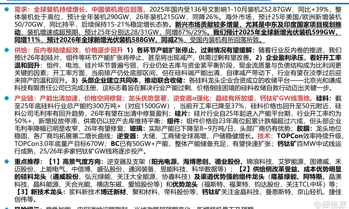 : 本文由【报告派】研读,输出观点仅作为行业分析!原文标题:2025-12-14-东吴证券-东吴证券-电力设备与新能源行业2026年光伏策略报告:供给侧拐点已至,供需逐步修复发布时间:2025年报告出品方:东吴证券 以上截图 ...