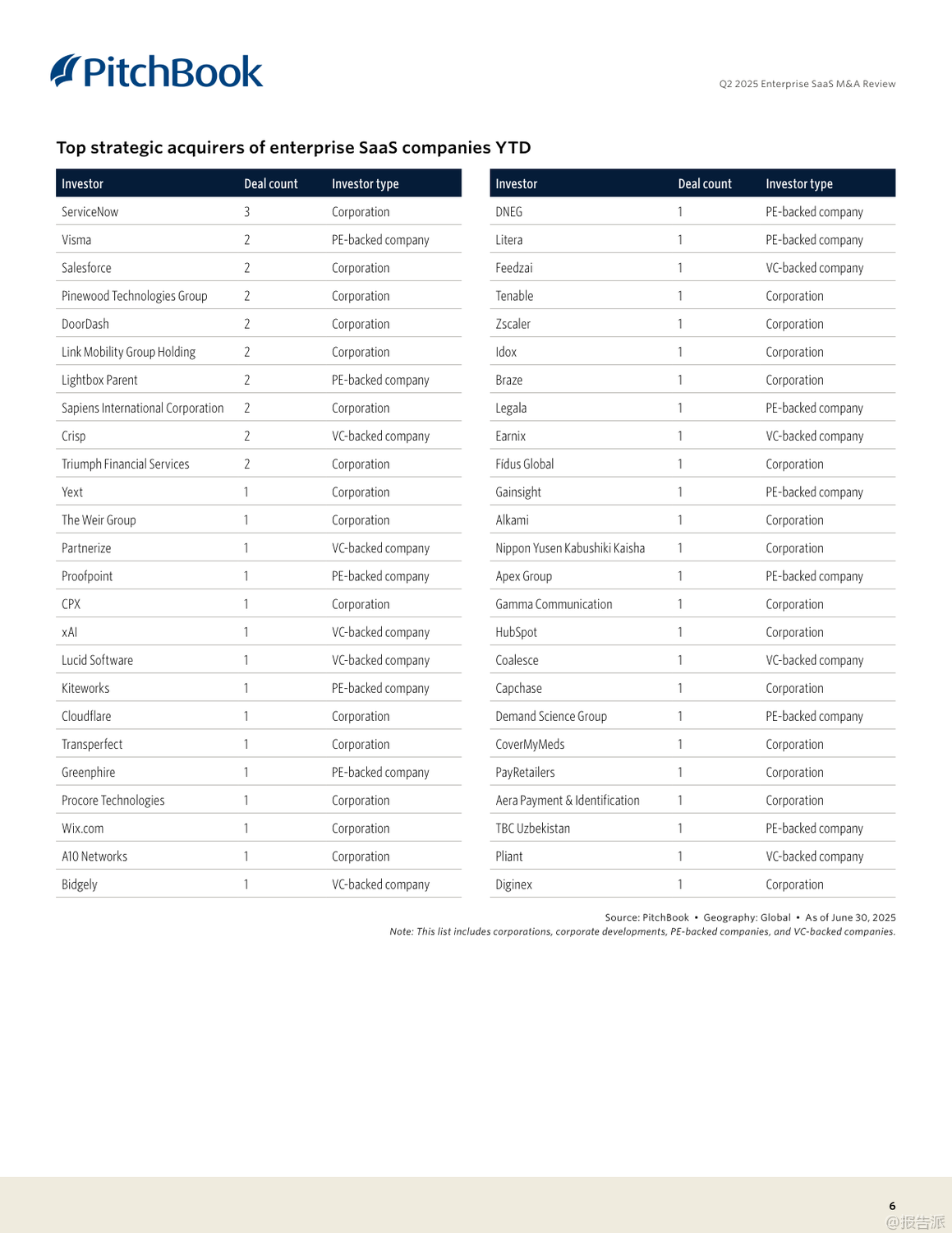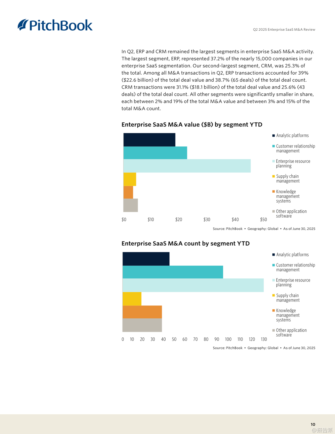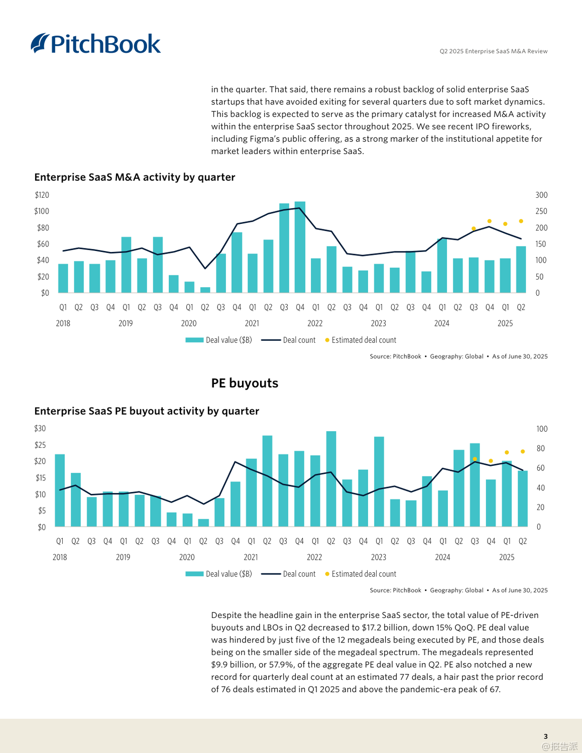 | 2025年第二季度,全球企业SaaS并购市场迎来强劲反弹,总交易额环比大幅增长36.8%,达到580亿美元,创下近年来新高。 这一增长主要由12笔超10亿美元的“ mega deal”推动,这些大型交易合计贡献了本季度75.1%的总价值,显示出市场集中度显著提升。 其中,最大三笔交易分别为Fidelity National Information Services以135亿美元收购Total System Services、Salesforce以80亿美元拿下Informatica,以及Siemens以51亿美元并购Dotmatics。 剔除这12笔巨额头寸后,其余交易的平均规模仅为9.24亿美元,反映出非头部企业的估值仍受高利率和市场不确定性压制。 从买家结构来看,企业级战略收购(Corporate M&A)成为主导力量,交易总额环比激增84%至408亿美元,得益于七笔超十亿级并购的集中落地。 相比之下,私募股权(PE)虽在交易数量上创下77宗的历史新高,但总金额同比下降15%至172亿美元,且仅有五笔mega deal参与,显示其在大规模整合中相对保守。 值得注意的是,尽管PE交易体量收缩,TA Associates、Warburg Pincus、Hg和Thoma Bravo等机构仍是活跃主力,展现出对优质SaaS资产的持续布局意愿。 从被投企业背景看,PE-backed公司在退出价值上占据绝对优势——上半年已实现451亿美元的并购退出总额,超过2024全年水平。 而VC-backed企业则在交易数量上保持高速增长,预计全年同比增长可达30.5%,说明早期创新项目仍在加速进入收获期。 与此同时,公开上市及无明确背书的企业并购活动明显放缓,同比下滑22%-43%,凸显资本向有成熟财务支持的标的聚集的趋势。 细分赛道方面,CRM与AP(分析平台)表现尤为亮眼。 CRM领域并购额环比飙升273.2%至181亿美元,主要受益于Salesforce等行业巨头的战略扩张;AP板块也录得36.7%的增长至108亿美元。 虽然ERP仍以226亿美元的交易额维持第一大细分领域的地位,但其领先优势正被迅速缩小。 从子领域看,数字商务(Digital Commerce)以148亿美元交易额位居榜首,制造与运营(Manufacturing & Operations)、分析与商业智能平台紧随其后,成为并购最活跃的方向。 整体而言,2025年Q2的企业SaaS并购呈现出“强者恒强”的格局:大型科技公司借助资金与政策环境改善加快整合步伐,PE机构则通过高频中小规模收购积累筹码。 随着AI技术深化应用与企业数字化转型持续推进,并购热潮有望贯穿全年,尤其在客户关系管理、数据分析与垂直行业解决方案等领域将持续释放交易机会。 同时,IPO市场的回暖也为后续并购提供了更多退出路径选择,形成良性循环。 出品方:PitchBook 发布时间:2025年