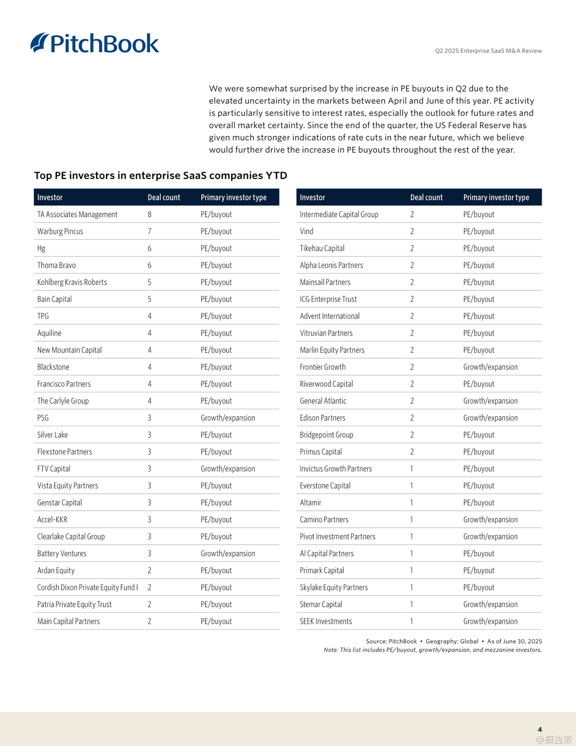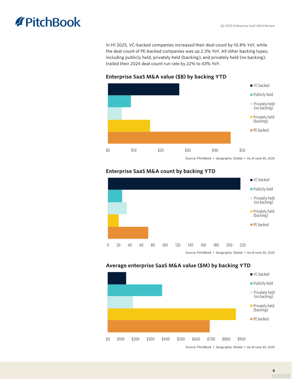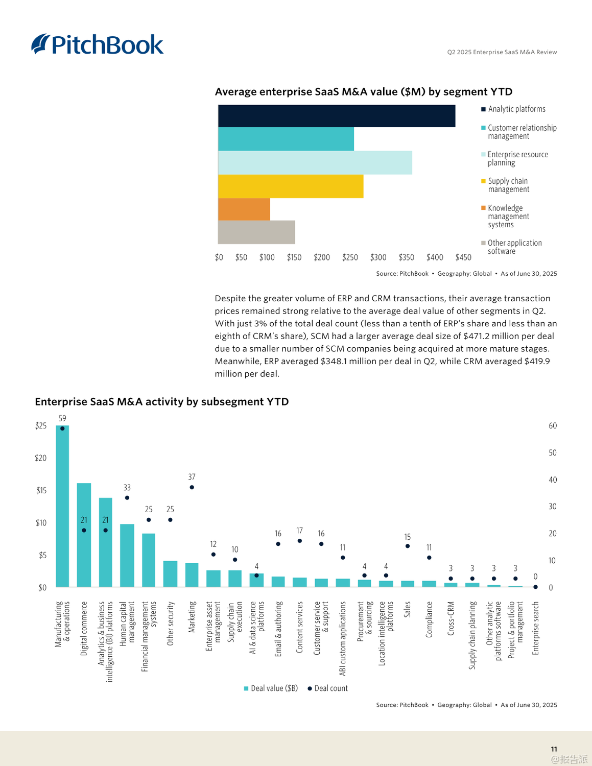 | 2025年第二季度,全球企业SaaS并购市场迎来强劲反弹,总交易额环比大幅增长36.8%,达到580亿美元,创下近年来新高。 这一增长主要由12笔超10亿美元的“ mega deal”推动,这些大型交易合计贡献了本季度75.1%的总价值,显示出市场集中度显著提升。 其中,最大三笔交易分别为Fidelity National Information Services以135亿美元收购Total System Services、Salesforce以80亿美元拿下Informatica,以及Siemens以51亿美元并购Dotmatics。 剔除这12笔巨额头寸后,其余交易的平均规模仅为9.24亿美元,反映出非头部企业的估值仍受高利率和市场不确定性压制。 从买家结构来看,企业级战略收购(Corporate M&A)成为主导力量,交易总额环比激增84%至408亿美元,得益于七笔超十亿级并购的集中落地。 相比之下,私募股权(PE)虽在交易数量上创下77宗的历史新高,但总金额同比下降15%至172亿美元,且仅有五笔mega deal参与,显示其在大规模整合中相对保守。 值得注意的是,尽管PE交易体量收缩,TA Associates、Warburg Pincus、Hg和Thoma Bravo等机构仍是活跃主力,展现出对优质SaaS资产的持续布局意愿。 从被投企业背景看,PE-backed公司在退出价值上占据绝对优势——上半年已实现451亿美元的并购退出总额,超过2024全年水平。 而VC-backed企业则在交易数量上保持高速增长,预计全年同比增长可达30.5%,说明早期创新项目仍在加速进入收获期。 与此同时,公开上市及无明确背书的企业并购活动明显放缓,同比下滑22%-43%,凸显资本向有成熟财务支持的标的聚集的趋势。 细分赛道方面,CRM与AP(分析平台)表现尤为亮眼。 CRM领域并购额环比飙升273.2%至181亿美元,主要受益于Salesforce等行业巨头的战略扩张;AP板块也录得36.7%的增长至108亿美元。 虽然ERP仍以226亿美元的交易额维持第一大细分领域的地位,但其领先优势正被迅速缩小。 从子领域看,数字商务(Digital Commerce)以148亿美元交易额位居榜首,制造与运营(Manufacturing & Operations)、分析与商业智能平台紧随其后,成为并购最活跃的方向。 整体而言,2025年Q2的企业SaaS并购呈现出“强者恒强”的格局:大型科技公司借助资金与政策环境改善加快整合步伐,PE机构则通过高频中小规模收购积累筹码。 随着AI技术深化应用与企业数字化转型持续推进,并购热潮有望贯穿全年,尤其在客户关系管理、数据分析与垂直行业解决方案等领域将持续释放交易机会。 同时,IPO市场的回暖也为后续并购提供了更多退出路径选择,形成良性循环。 出品方:PitchBook 发布时间:2025年