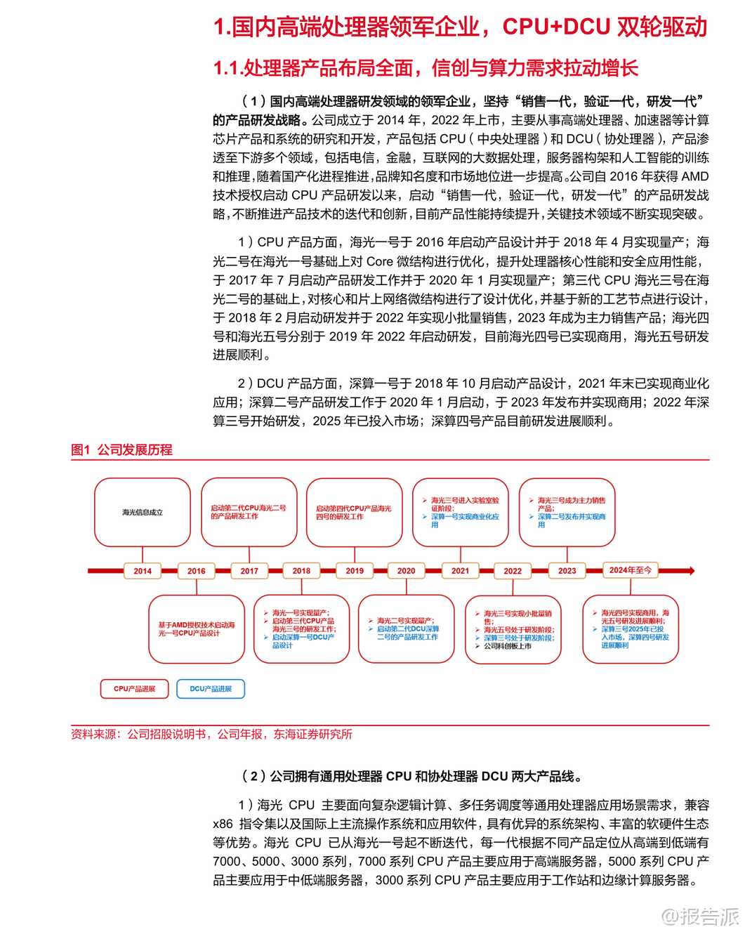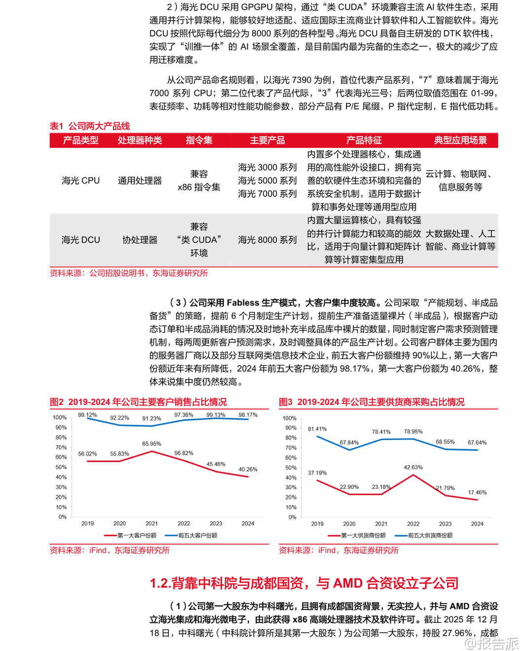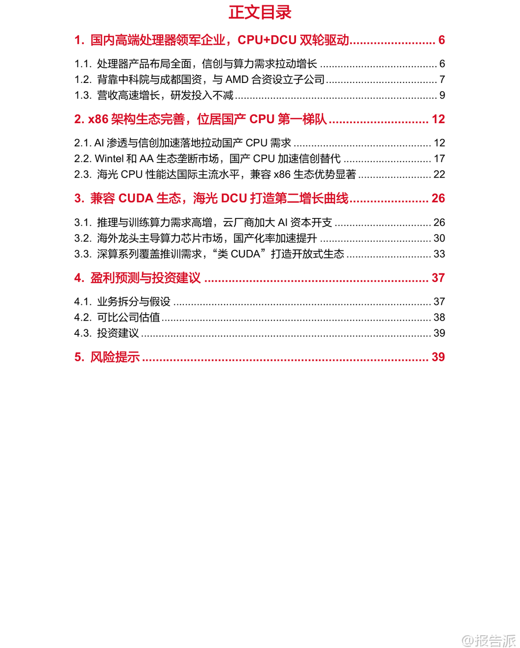 | 海光信息作为国内高端处理器领域的领军企业,凭借CPU与DCU双轮驱动,在信创加速和AI算力需求爆发的背景下展现出强劲增长潜力。 公司成立于2014年,2022年上市,核心产品包括兼容x86架构的海光CPU和基于GPGPU路线的海光DCU,已形成从研发、设计到生态建设的完整布局。 在CPU领域,海光通过早期与AMD的技术合作获得x86授权,并在此基础上实现自主迭代创新。 目前产品已发展至第五代——海光五号,其中海光四号已实现商业化应用。 产品按应用场景划分为三大系列:7000系列面向数据中心高性能场景,5000系列定位于行业客户中端市场,3000系列则主打高性价比多场景应用。 其性能经测试已达国际主流水平,尤其在整型与浮点计算方面表现优异。 更重要的是,x86架构带来的强大软硬件生态兼容性大幅降低了国产化迁移成本,使海光在金融、电信等对系统稳定性要求极高的行业中占据主导地位。 随着党政信创向行业信创纵深推进,2026年中国信创硬件市场规模预计同比增长38.6%,海光有望持续受益于这一结构性机遇。 在DCU(协处理器)方向,海光走的是GPGPU技术路径,对标英伟达、AMD等国际巨头。 深算一号于2018年启动研发,目前已迭代至深算三号并投入市场,深算四号研发进展顺利。 作为国内少有的具备全精度浮点及常见整型数据计算能力的GPGPU产品,海光DCU算子覆盖度超99%,可满足从十亿级模型推理到千亿级大模型训练的全场景需求。 其最大优势在于采用“类CUDA”通用并行计算架构,能够显著降低CUDA用户的迁移门槛。 同时,公司构建了自主开放的DTK软件栈,全面支持TensorFlow、PyTorch、PaddlePaddle等主流深度学习框架,实现了与文心一言、LLaMA、ChatGLM等国内外主流大模型的全面适配。 当前全球AI算力需求呈现爆发式增长。 2025年全球AI服务器出货量预计增长24.3%,AI芯片市场规模有望达到920亿美元,同比增长29.58%。 尽管英伟达仍占据数据中心GPU市场90%以上份额,但地缘政治因素推动国产替代进程加速。 2025年中国本土AI芯片供应商市场份额有望提升至40%。 在此背景下,海光DCU凭借卓越的生态兼容性和性能表现,已与字节跳动、腾讯、阿里、百度等头部互联网厂商建立深度合作关系,广泛应用于AI训练/推理、科学计算、金融风控等核心场景。 财务层面,公司营收进入高速增长通道。 2025年前三季度营收已超越2024全年,同比增速达54.65%;归母净利润同比增长28.56%。 毛利率连续多年提升,2024年首次突破60%,2025年前三季度维持在60.10%的高位,显著高于Intel、AMD等行业龙头。 这得益于高端产品占比提升和规模效应显现。 公司研发投入持续加码,研发费用同比增速保持40%以上,研发人员占比超90%,硕士及以上学历者占75%以上,为长期竞争力提供坚实支撑。 未来增长动能来自两大方面:一是下一代海光五号CPU发布,将在性能、安全性和能效比上进一步优化,巩固在信创市场的领先地位;二是深算四号DCU量产放量,将打开AI算力芯片千亿蓝海市场。 此外,公司牵头成立异构计算标准工作部,发布HSL 1.0总线互联协议,并联合6000余家合作伙伴打造“光合组织”生态联盟,完成1.5万个软硬件适配,形成“芯片—整机—软件—应用”的闭环生态,极大增强了客户粘性和系统集成效率。 东海证券预测,2025-2027年公司营收将分别达143.05亿元、207.76亿元、287.59亿元,归母净利润分别为30.57亿元、44.90亿元、64.58亿元,复合增速可观。 尽管面临产品研发进度、客户集中度较高及地缘政治等风险,但凭借技术自主性、生态领先性和市场需求共振,海光信息正稳步成长为国产算力底座的核心支柱企业。 本文由【报告派】研读,输出观点仅作为行业分析! 原文标题:2025-12-23-东海证券-东海证券-海光信息(688041)公司深度报告:国产CPU领军企业,DCU卡位算力芯片千亿蓝海 发布时间:2025年 出品方:东海证券 文档页数:41页