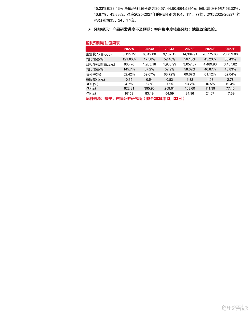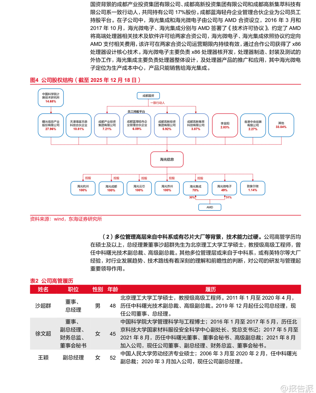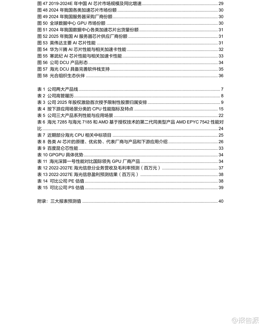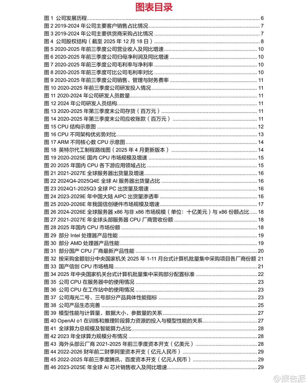 | 海光信息作为国内高端处理器领域的领军企业,凭借CPU与DCU双轮驱动,在信创加速和AI算力需求爆发的背景下展现出强劲增长潜力。 公司成立于2014年,2022年上市,核心产品包括兼容x86架构的海光CPU和基于GPGPU路线的海光DCU,已形成从研发、设计到生态建设的完整布局。 在CPU领域,海光通过早期与AMD的技术合作获得x86授权,并在此基础上实现自主迭代创新。 目前产品已发展至第五代——海光五号,其中海光四号已实现商业化应用。 产品按应用场景划分为三大系列:7000系列面向数据中心高性能场景,5000系列定位于行业客户中端市场,3000系列则主打高性价比多场景应用。 其性能经测试已达国际主流水平,尤其在整型与浮点计算方面表现优异。 更重要的是,x86架构带来的强大软硬件生态兼容性大幅降低了国产化迁移成本,使海光在金融、电信等对系统稳定性要求极高的行业中占据主导地位。 随着党政信创向行业信创纵深推进,2026年中国信创硬件市场规模预计同比增长38.6%,海光有望持续受益于这一结构性机遇。 在DCU(协处理器)方向,海光走的是GPGPU技术路径,对标英伟达、AMD等国际巨头。 深算一号于2018年启动研发,目前已迭代至深算三号并投入市场,深算四号研发进展顺利。 作为国内少有的具备全精度浮点及常见整型数据计算能力的GPGPU产品,海光DCU算子覆盖度超99%,可满足从十亿级模型推理到千亿级大模型训练的全场景需求。 其最大优势在于采用“类CUDA”通用并行计算架构,能够显著降低CUDA用户的迁移门槛。 同时,公司构建了自主开放的DTK软件栈,全面支持TensorFlow、PyTorch、PaddlePaddle等主流深度学习框架,实现了与文心一言、LLaMA、ChatGLM等国内外主流大模型的全面适配。 当前全球AI算力需求呈现爆发式增长。 2025年全球AI服务器出货量预计增长24.3%,AI芯片市场规模有望达到920亿美元,同比增长29.58%。 尽管英伟达仍占据数据中心GPU市场90%以上份额,但地缘政治因素推动国产替代进程加速。 2025年中国本土AI芯片供应商市场份额有望提升至40%。 在此背景下,海光DCU凭借卓越的生态兼容性和性能表现,已与字节跳动、腾讯、阿里、百度等头部互联网厂商建立深度合作关系,广泛应用于AI训练/推理、科学计算、金融风控等核心场景。 财务层面,公司营收进入高速增长通道。 2025年前三季度营收已超越2024全年,同比增速达54.65%;归母净利润同比增长28.56%。 毛利率连续多年提升,2024年首次突破60%,2025年前三季度维持在60.10%的高位,显著高于Intel、AMD等行业龙头。 这得益于高端产品占比提升和规模效应显现。 公司研发投入持续加码,研发费用同比增速保持40%以上,研发人员占比超90%,硕士及以上学历者占75%以上,为长期竞争力提供坚实支撑。 未来增长动能来自两大方面:一是下一代海光五号CPU发布,将在性能、安全性和能效比上进一步优化,巩固在信创市场的领先地位;二是深算四号DCU量产放量,将打开AI算力芯片千亿蓝海市场。 此外,公司牵头成立异构计算标准工作部,发布HSL 1.0总线互联协议,并联合6000余家合作伙伴打造“光合组织”生态联盟,完成1.5万个软硬件适配,形成“芯片—整机—软件—应用”的闭环生态,极大增强了客户粘性和系统集成效率。 东海证券预测,2025-2027年公司营收将分别达143.05亿元、207.76亿元、287.59亿元,归母净利润分别为30.57亿元、44.90亿元、64.58亿元,复合增速可观。 尽管面临产品研发进度、客户集中度较高及地缘政治等风险,但凭借技术自主性、生态领先性和市场需求共振,海光信息正稳步成长为国产算力底座的核心支柱企业。 本文由【报告派】研读,输出观点仅作为行业分析! 原文标题:2025-12-23-东海证券-东海证券-海光信息(688041)公司深度报告:国产CPU领军企业,DCU卡位算力芯片千亿蓝海 发布时间:2025年 出品方:东海证券 文档页数:41页