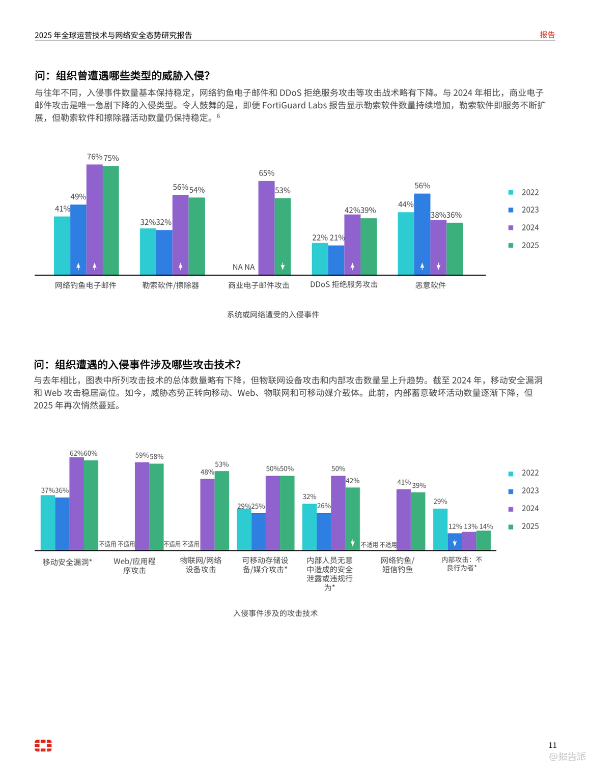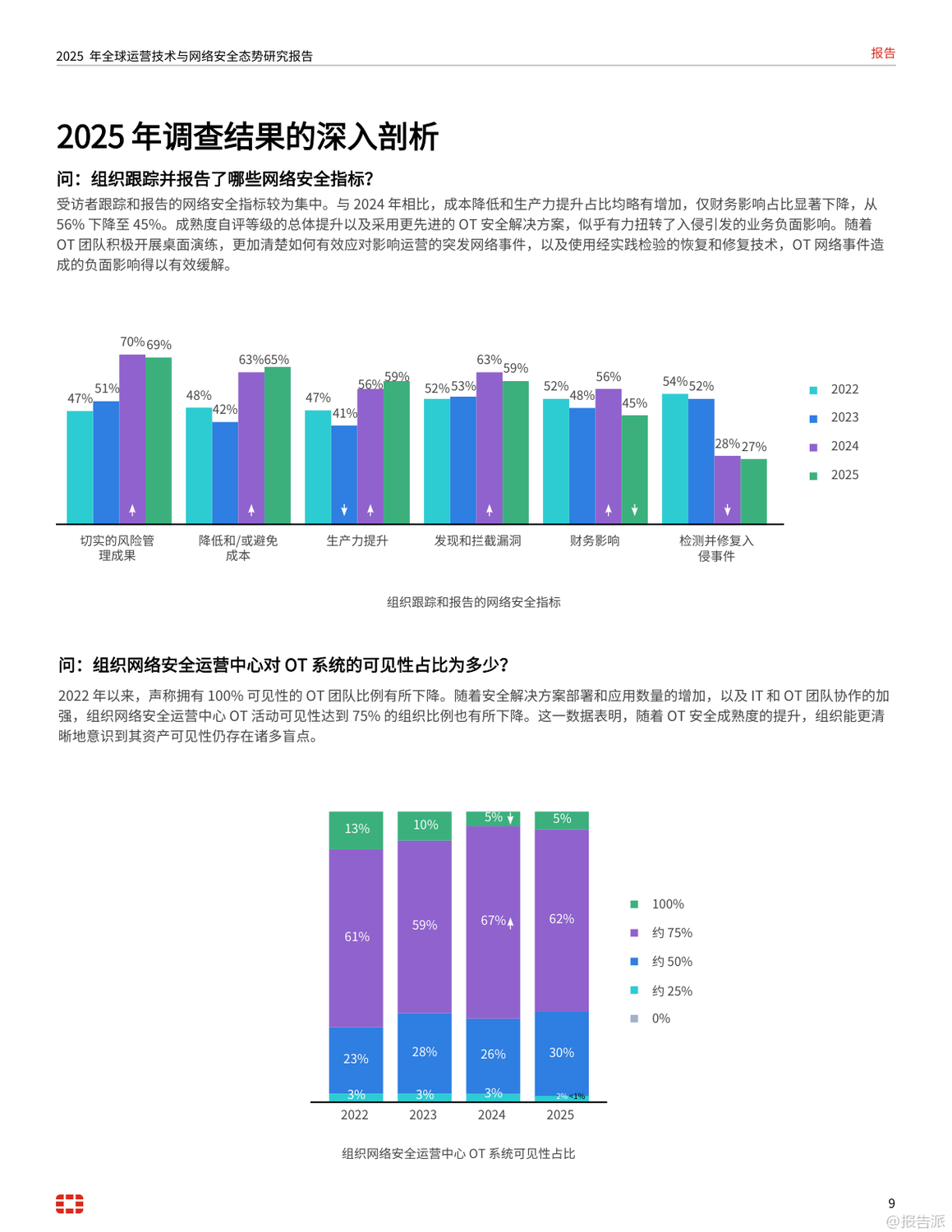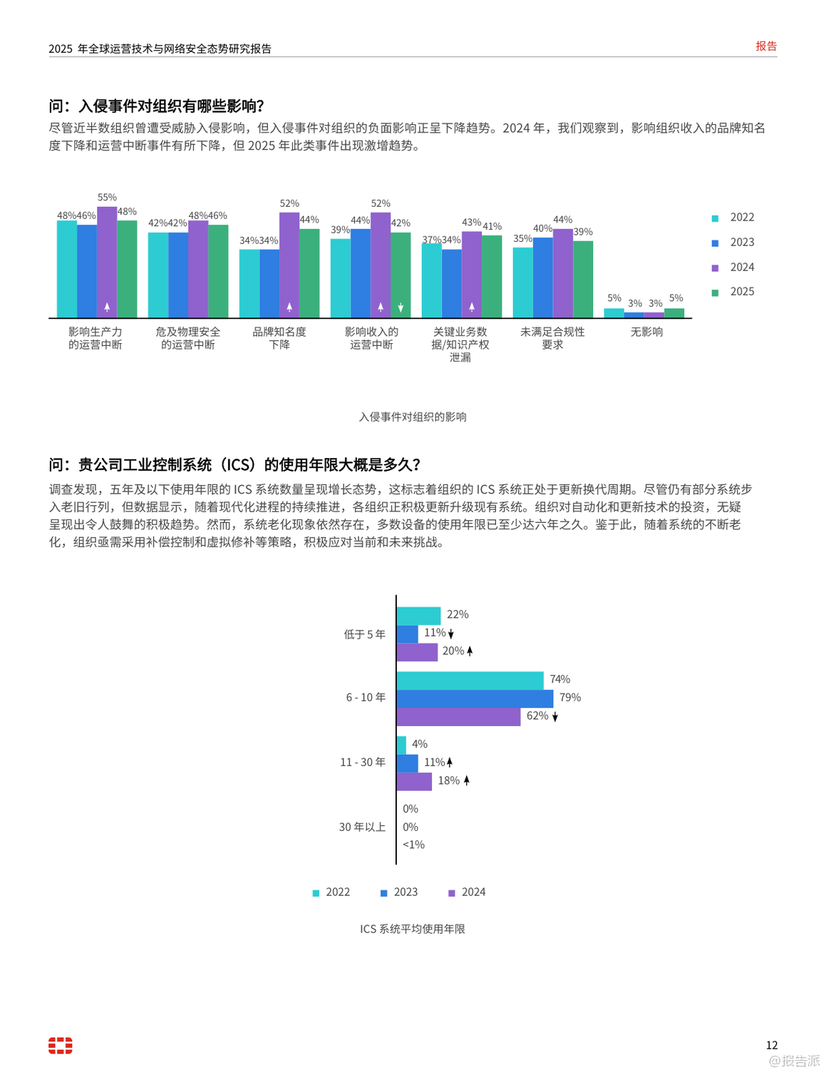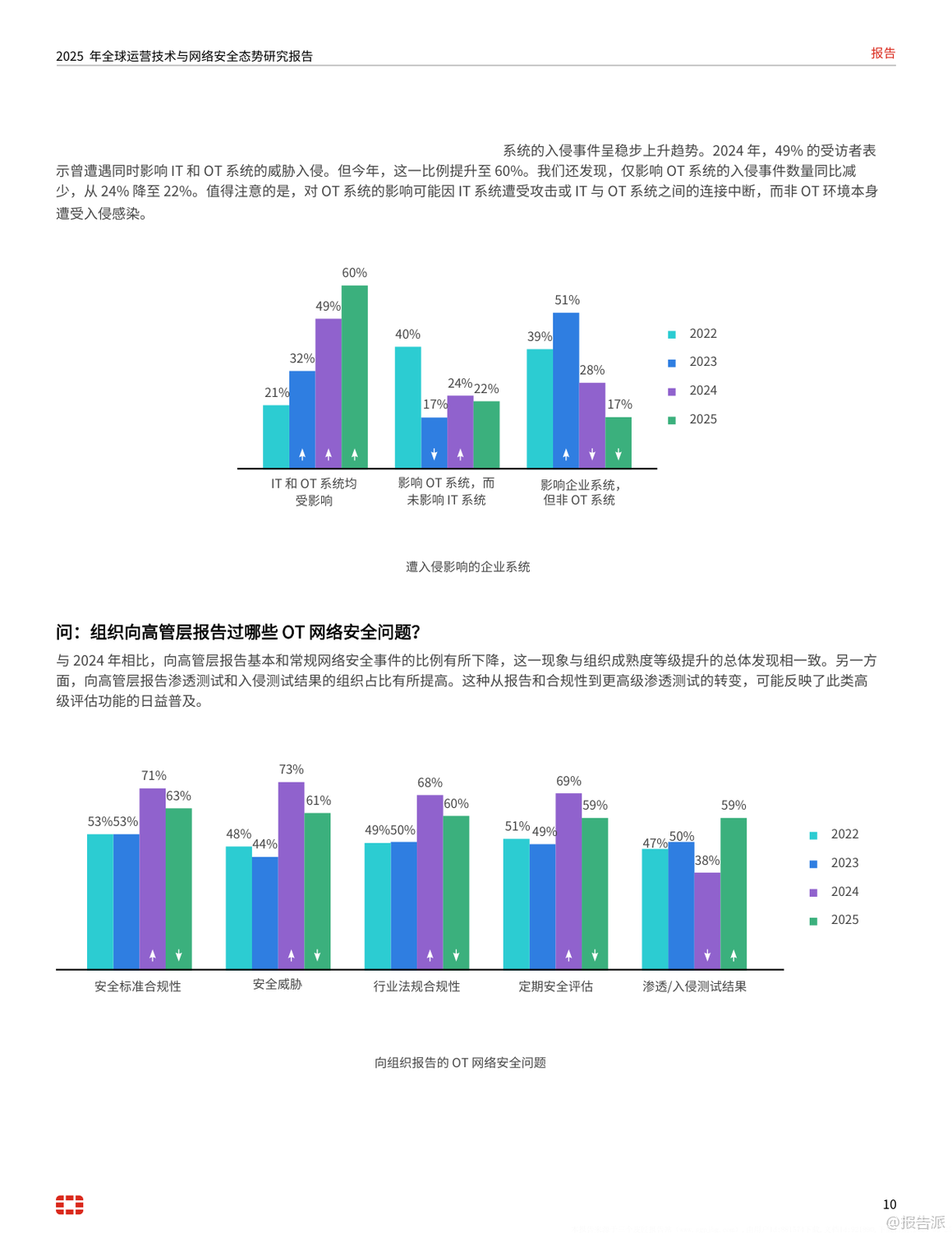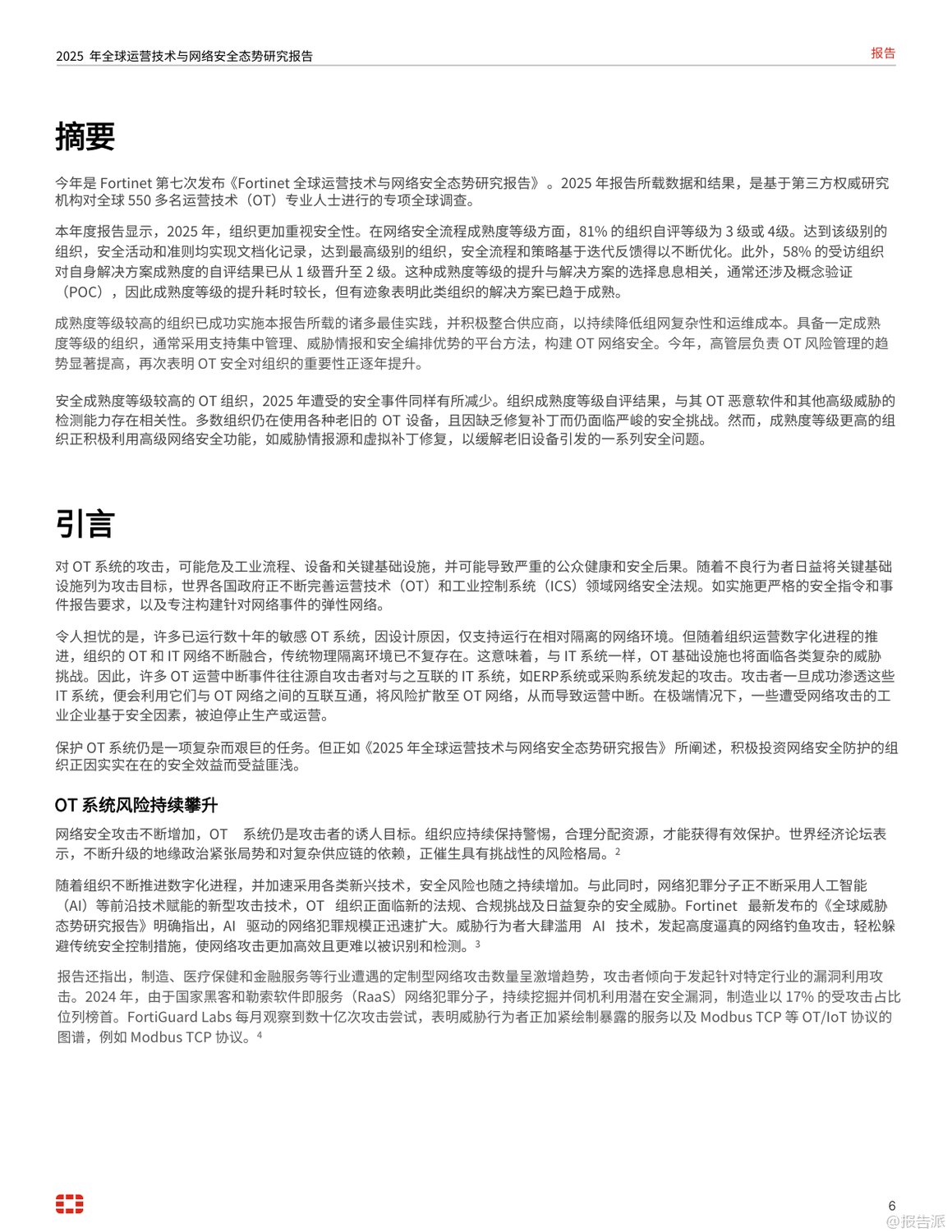 | 近日,Fortinet发布了《2025年全球运营技术与网络安全态势研究报告》,通过对全球550多名OT(运营技术)专业人士的调研,揭示了当前工业控制系统和关键基础设施面临的网络安全挑战与发展趋势。 报告指出,全球OT网络安全成熟度正在持续提升,安全管理责任正加速向高管层转移。 2025年,已有52%的组织将OT网络安全管理权移交至首席信息安全官(CISO),这一比例较2022年的16%大幅提升,且未来12个月内计划移交的比例更是高达80%,显示出OT安全已成为企业战略级议题。 在安全成熟度方面,组织的网络安全流程和解决方案正逐步走向规范化与智能化。 近半数(49%)受访组织的网络安全计划已达到第4级成熟度,意味着其安全流程基于反馈持续优化,并融合了威胁情报与自动化事件管理。 解决方案层面,44%的组织已实现网络分段与基本可见性,26%达到更高级别的安全访问与分析能力。 值得注意的是,成熟度越高的组织,遭受安全入侵的概率越低。 2025年,零入侵组织占比从2022年的6%跃升至52%,而在成熟度等级为4的组织中,这一比例高达65%,充分证明了体系化安全建设的有效性。 尽管整体态势向好,挑战依然严峻。 报告指出,50%的组织在过去一年中仍遭遇过至少一次安全事件,其中勒索软件和恶意软件仍是主要威胁,尤其针对制造业的攻击频发。 国家支持的黑客组织正试图渗透关键基础设施,为未来发动大规模攻击做准备。 与此同时,IT与OT系统的深度融合也带来了新的风险路径——2025年,60%的入侵事件同时影响IT与OT系统,远高于2022年的49%,表明攻击者正通过IT侧突破口横向移动至生产网络。 面对复杂威胁,报告总结出五大最佳实践:一是部署网络分段,构建纵深防御体系;二是强化资产可见性并实施补偿控制,特别是针对老旧设备的虚拟补丁技术;三是采用专用于OT环境的威胁情报,提升对工业协议攻击的检测能力;四是将OT安全纳入整体安全运营与应急响应流程,建立跨部门协同机制;五是采用平台化安全架构,整合多厂商工具,提升管理效率与响应速度。 此外,报告还关注到合规趋势的变化。 66%的组织预计未来五年内将面临更严格的OT安全监管,推动企业提前布局。 同时,供应商整合成为新趋势,78%的组织仅使用1至4家OT设备供应商,反映出企业在降低复杂性、提升安全可控性方面的努力。 总体来看,《2025年全球运营技术与网络安全态势研究报告》传递出一个明确信号:OT安全已从技术问题上升为战略议题,唯有系统性投入与高层推动,才能真正筑牢工业数字化转型的安全底座。 出品方:Fortinet 发布时间:2025年
