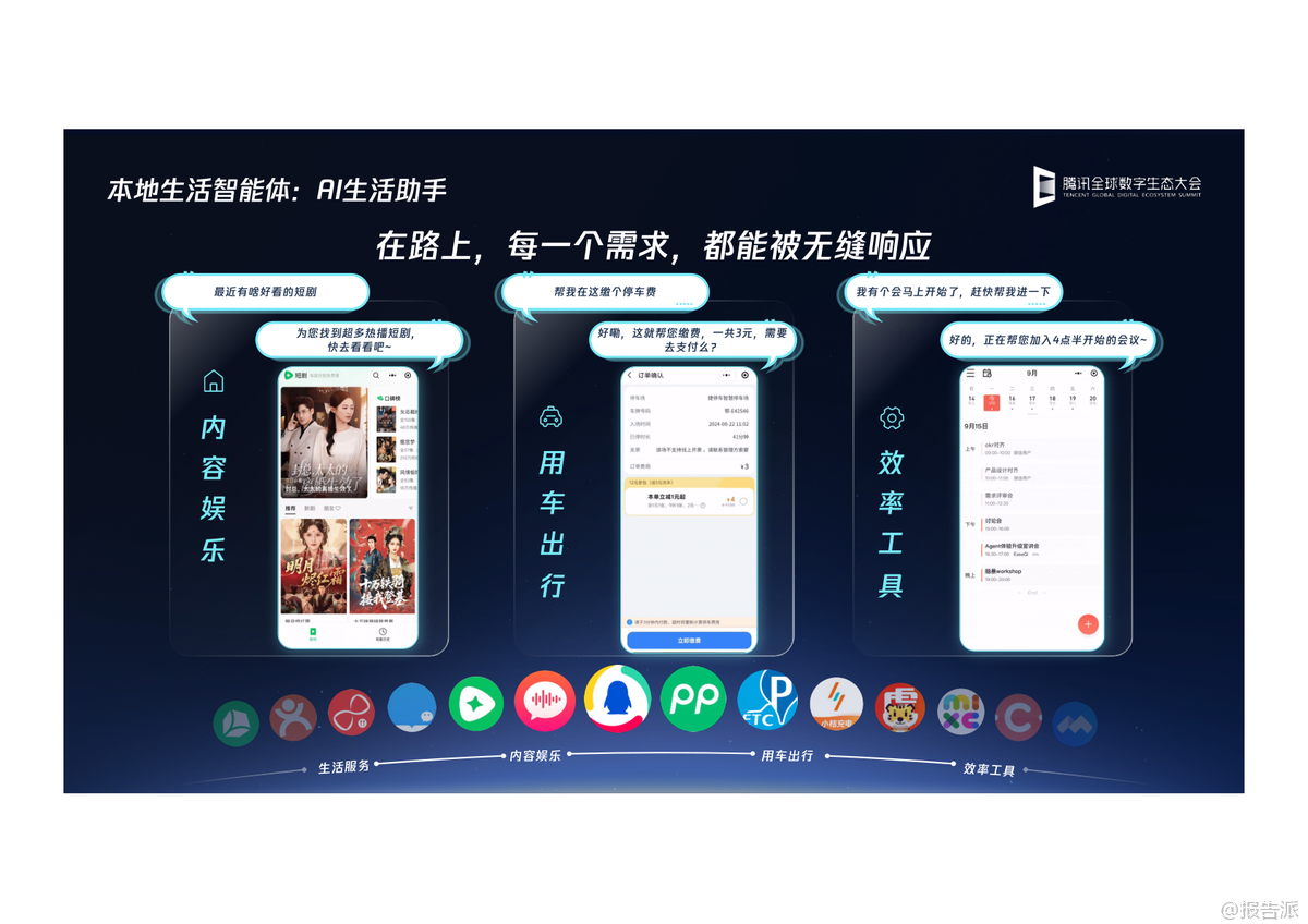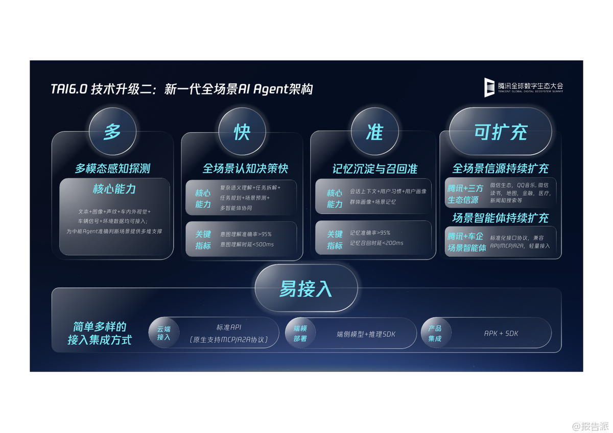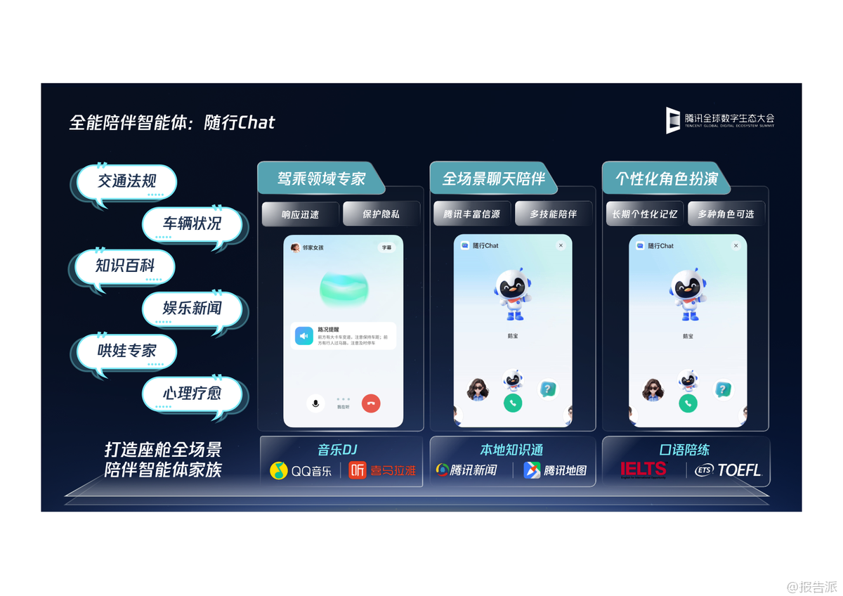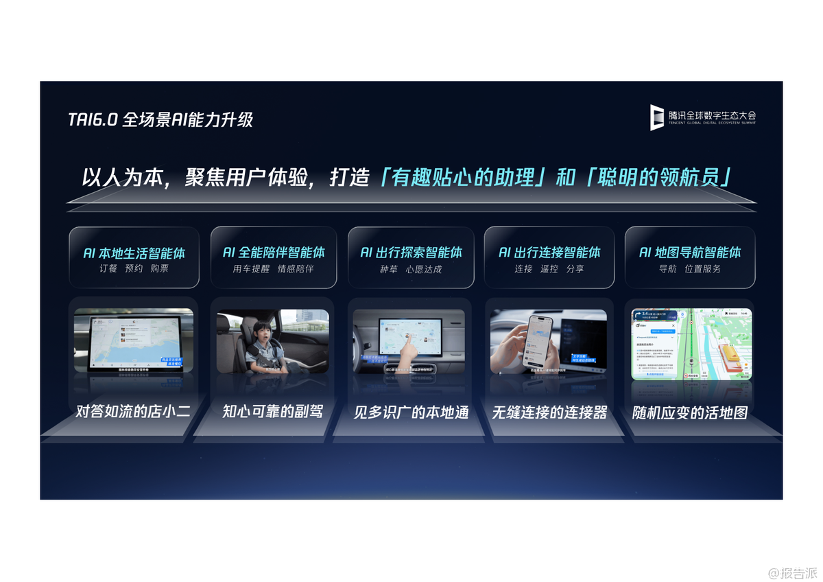 | 在2025年腾讯全球数字生态大会上,腾讯智慧出行正式发布了TAI6.0——腾讯智能座舱全场景AI智能体,标志着智能汽车交互体验迈入全新阶段。 作为腾讯智能座舱解决方案(TAI)的第六代升级,TAI6.0不再局限于功能堆砌,而是以AI为核心驱动力,重新定义人车关系,致力于打造“有趣贴心的助理”与“聪明的领航员”两大核心角色,全面重构智能座舱的用户体验。 TAI6.0的最大突破在于其全场景AI能力的系统性升级。 它通过构建“新一代全模态座舱大模型矩阵”,实现了云侧与端侧的协同进化。 云侧依托腾讯混元大模型体系,具备强大的语言理解(LLM)、多模态识别(VLM)和长上下文处理能力,预训练数据经过万级别座舱专属数据增强,关键性能如解码速度提升81%,上下文长度翻倍。 端侧则部署了轻量化的小尺寸模型,可在低至550MB内存下运行多模态大模型,确保在无网络环境下依然能完成车辆信号理解、疲劳监测、儿童状态识别等实时任务,真正做到“快、准、稳”。 在此技术底座之上,TAI6.0推出了五大AI智能体,形成覆盖出行全生命周期的服务闭环。 首先是“AI生活助手”,它能像真人店员一样主动关怀,基于用户历史偏好推荐咖啡、火锅,并一键完成订座、缴费等复杂操作,实现“一句话全搞定”。 其次是“全能陪伴智能体”随行Chat,它集知识百科、驾乘顾问、心理疗愈于一体,支持个性化角色扮演,让旅途充满情感温度。 第三是“出行探索智能体”——“哪儿值得去”,它不仅能发现周边兴趣点,更能规划主题路线,如“北京红墙一日游”,并在接近心愿地点时主动提醒购票、播放讲解,让每一次出行都有故事感。 第四大智能体“随行互连”解决了车内协作难题。 通过微信扫码,乘客可秒变“出行遥控器”,跨账号分享目的地、歌单、图片等内容,实现娱乐资源的无缝流转与乘客平权。 最后是全面进化的“AI地图导航智能体”,腾讯地图车机版9.0不仅提供精准的智能车道导航和恶劣天气预警,更融入“AI服务”与“AI陪伴”。 它能一键组队、共享位置,支持小程序直连订座;同时通过全自研渲染引擎,实现24小时光影变化与四季景观还原,让导航界面也拥有沉浸式美感。 此外,AI还能讲笑话、介绍景点历史,让枯燥的驾驶变得生动有趣。 TAI6.0还构建了开放的生态矩阵,深度整合微信、QQ音乐、腾讯新闻、腾讯医典等内部资源,并通过标准化API接口兼容第三方服务,推动“手机-汽车”生态的丝滑连接。 从开箱即用的APK/SDK,到支持MCP/R2R协议的轻量接入,腾讯为车企提供了灵活的合作模式。 总体来看,TAI6.0不仅是技术的迭代,更是理念的跃迁。 它将AI从单一功能模块升维为贯穿用车全场景的“智能体集群”,真正实现了从“有求必应”到“未呼先应”的跨越。 随着汽车行业智能化竞争进入深水区,腾讯凭借其在AI、内容生态与社交领域的深厚积累,正为智能座舱树立新的标杆。 出品方:腾讯 发布时间:2025年