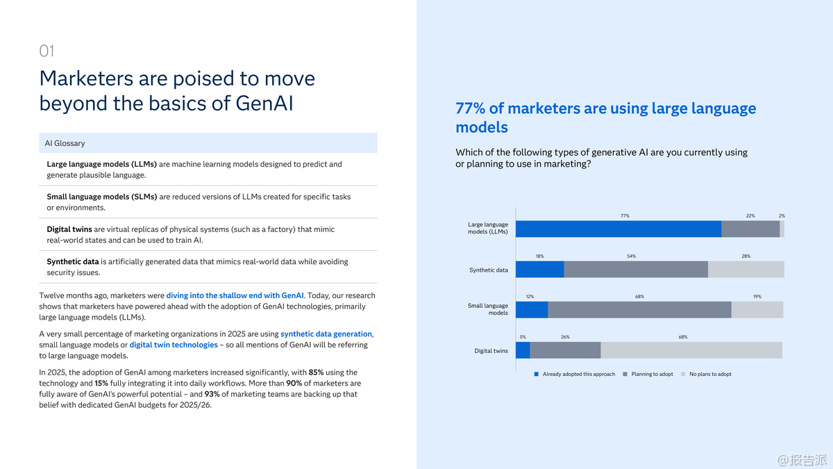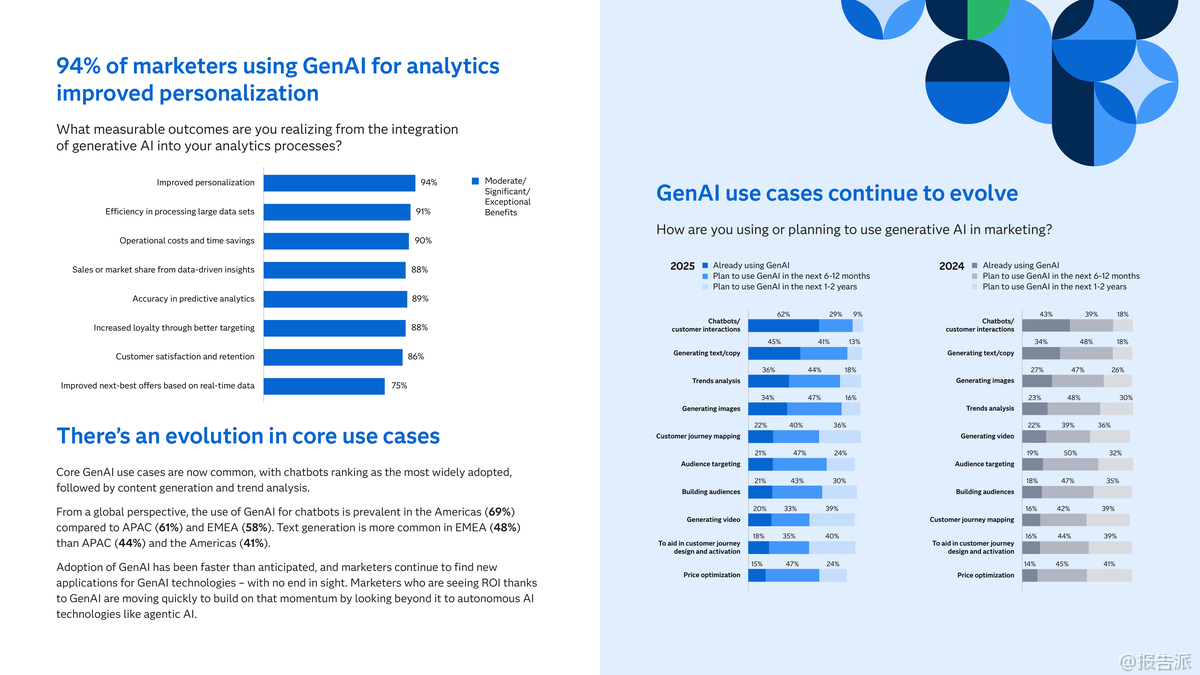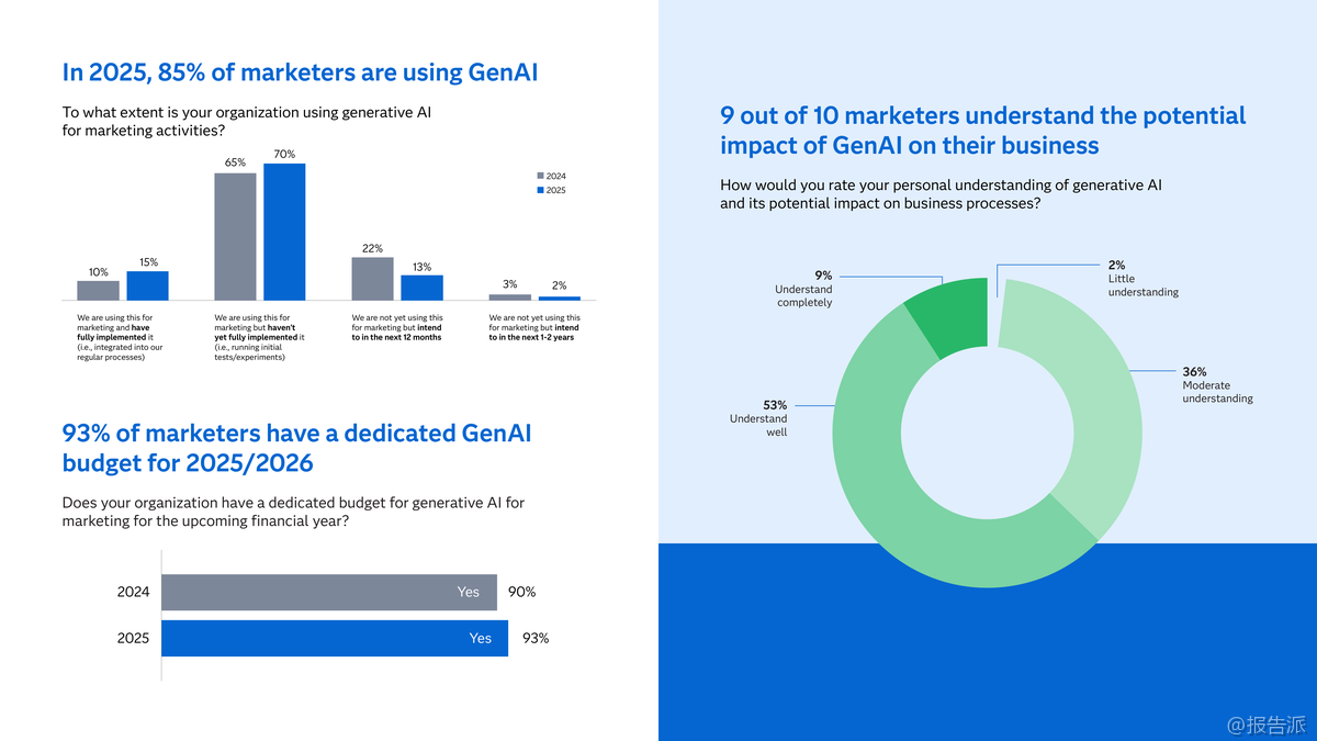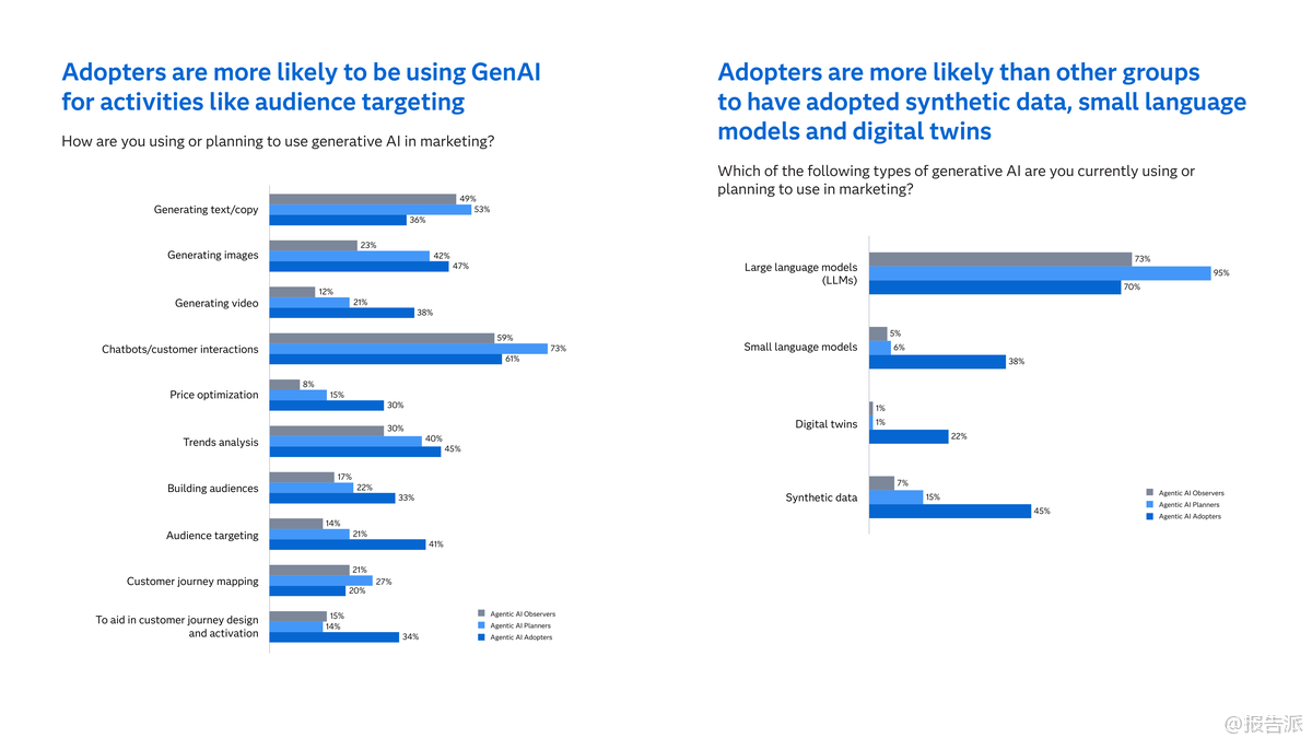 | 2025年,全球营销领域正迎来人工智能技术的深刻变革。 根据对300家企业的调研显示,85%的营销组织已采用生成式AI(GenAI),其中15%已将其全面融入日常流程,93%的企业为GenAI设立了专项预算,标志着GenAI已成为营销领域的“新常态”。 与此同时,具备先发优势的“采纳者”群体正在向更具自主性的“代理型AI”(agentic AI)迈进,开启新一轮竞争格局。 所谓代理型AI,是指能够自主决策、无需人工干预即可执行复杂任务的人工智能系统。 目前已有21%的营销团队在真实环境中测试该技术,73%计划在未来两年内部署。 美国市场领先一步,28%的营销人员已开展相关实践。 研究将企业分为三类:采纳者(已部署)、规划者(一年内计划部署)、观察者(未来两年内计划)。 数据显示,采纳者不仅在GenAI应用成熟度上遥遥领先——92%实现全流程整合,远高于观察者的58%,更在投资回报率(ROI)方面表现突出:98%的采纳者已看到GenAI带来的实际收益,而这一比例在观察者中仅为63%。 采纳者之所以领先,关键在于其构建了坚实的数据基础设施、具备较高的AI素养,并建立了风险治理机制。 他们更倾向于将AI用于高阶场景,如受众定位、客户旅程设计和价格优化,同时在合成数据、小型语言模型和数字孪生等前沿技术的应用上也更为积极。 相比之下,观察者仍停留在基础内容生成阶段,缺乏整体战略规划,仅25%拥有全企业级AI战略,远低于采纳者的63%。 迈向代理型AI的过程中,企业面临四大挑战:一是AI基础设施与人才储备不足;二是缺乏清晰的战略路径;三是治理框架不健全;四是信任机制缺失。 调研发现,尽管79%的营销人员认为组织具备一定程度的AI治理能力,但仅有8%表示“非常有信心”。 采纳者已超越传统治理思维,更加关注内部员工对AI的信任以及伦理影响。 此外,90%的受访者认为人类监督至关重要,近一半主张所有AI决策都需经人工审核,仅5%愿意完全放手。 值得注意的是,随着AI演进,量子计算正逐步进入视野。 31%的采纳者预计其将在两年内应用于营销,49%对该技术有较深理解,半数已将其纳入数字化创新路线图。 金融、保险、医疗等行业尤其看好其在预测分析、实时客户模拟和超个性化方面的潜力。 总体来看,营销AI的竞争已从“是否使用”转向“如何深化”。 未来属于那些能系统化推进AI落地、平衡自动化与人文控制、并提前布局下一代计算技术的企业。 真正的竞争优势,不仅来自技术本身,更源于组织能力、战略远见与信任文化的综合构建。 出品方:SAS 发布时间:2025年