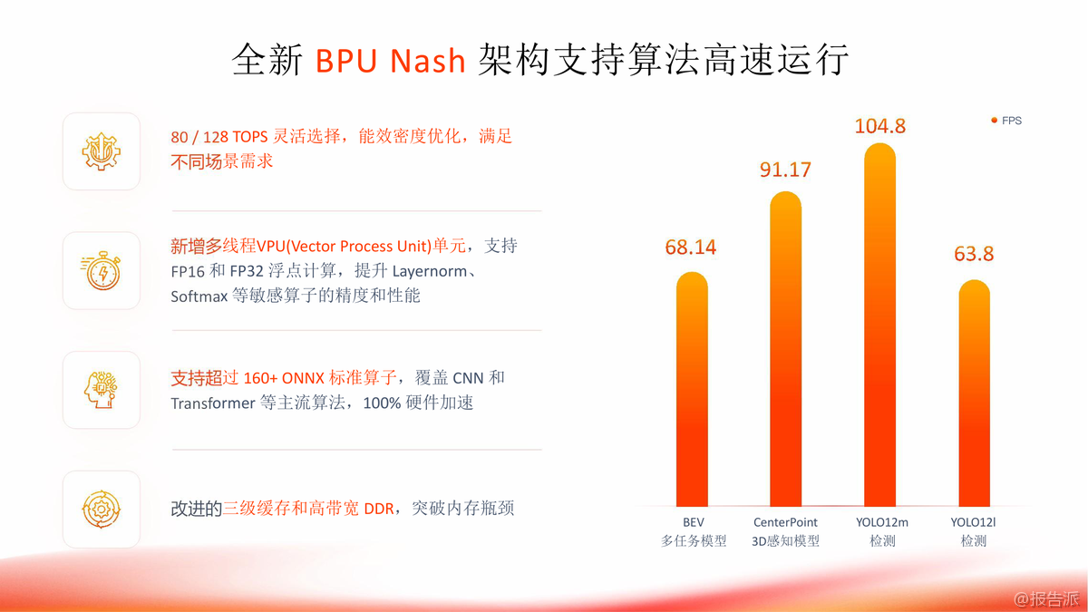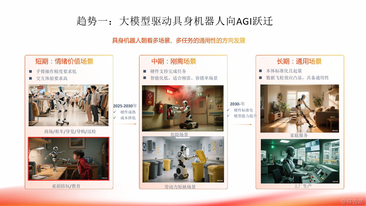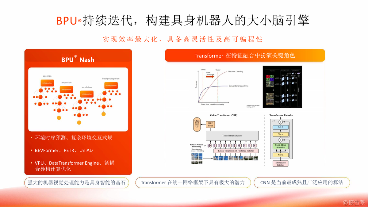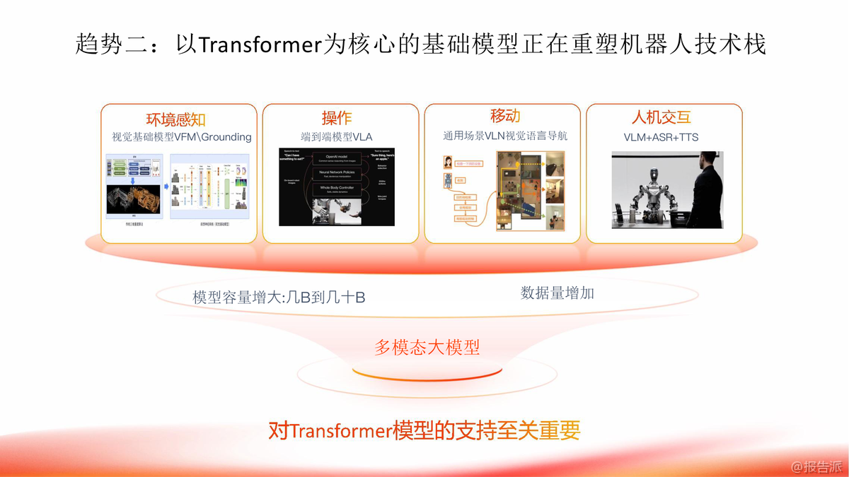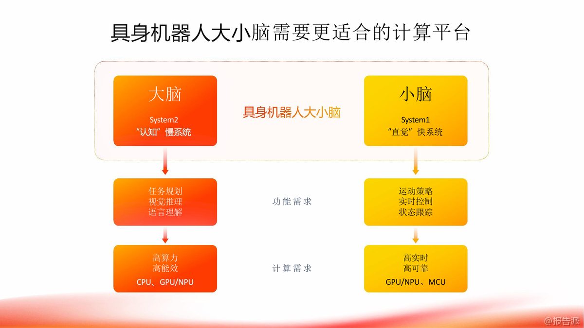 | 在人工智能迈向通用智能(AGI)的关键节点,具身智能正被视为堪比‘计算机诞生’级别的颠覆性创新。 近日发布的《大算力异构芯片赋能具身智能:从实时控制到空间计算》深度揭示了当前机器人技术演进的核心路径——以大模型驱动、Transformer架构重构和异构计算平台支撑的三位一体发展范式。 报告指出,具身机器人正经历从G1基础自动化向G5通用人工智能跃迁的五个阶段。 当前行业正处于G2向G3过渡的关键期,依托端到端操作大模型与数据飞轮效应,机器人正逐步摆脱传统规则系统的局限,实现更高自由度的动作理解和任务泛化。 这一进程的背后,是硬件标准化、模型能力提升与成本下降的共同推动,预计在2025至2030年间,商场导览、家庭服务、危险作业等场景将率先规模化落地。 值得关注的是,以Transformer为核心的基础模型正在全面重塑机器人技术栈。 视觉语言导航(VLN)、视觉语言模型(VLM)与语音识别(ASR)的深度融合,使得机器人具备更强的语义理解与环境交互能力。 与此同时,BEVFormer、PETR等基于Transformer的感知模型,正在推动3D环境建模向更高精度迈进,为复杂动态场景下的决策提供支撑。 支撑这一切的技术底座,则是专为具身智能设计的大算力异构芯片。 报告重点介绍了S100算控一体化计算平台,其采用“大脑-小脑”协同架构,集成BPU、CPU与MCU三大核心:BPU负责高算力AI推理,支持80~128TOPS算力;A78AE CPU承担任务规划与语言理解等System2“慢思考”任务;而R52+ MCU则专注实时运动控制,确保毫秒级响应。 这种异构设计实现了计算资源的最优分配,在实测中将CPU资源占用降低高达376%,显著提升系统能效与可靠性。 不仅如此,该平台还支持TSN时间敏感网络与EtherCAT实时通信,保障多传感器精确同步,并通过RDK S100开发者套件实现开箱即用。 配套的全栈工具链支持PyTorch等主流框架模型一键转换、量化与部署,大幅降低开发门槛。 目前,相关方案已在双机械臂叠衣、四足机器人步态切换、人形机器人运动控制等多个场景实现开源,覆盖多家头部具身智能企业。 未来,随着BPU架构持续迭代与多模态大模型的深化融合,具身智能将不仅局限于动作执行,更将走向真正的环境理解与自主决策。 这场由大算力芯片驱动的认知革命,或将重新定义机器与人类的协作边界,开启智能体真正融入物理世界的新纪元。 出品方:地瓜机器人 发布时间:2025年