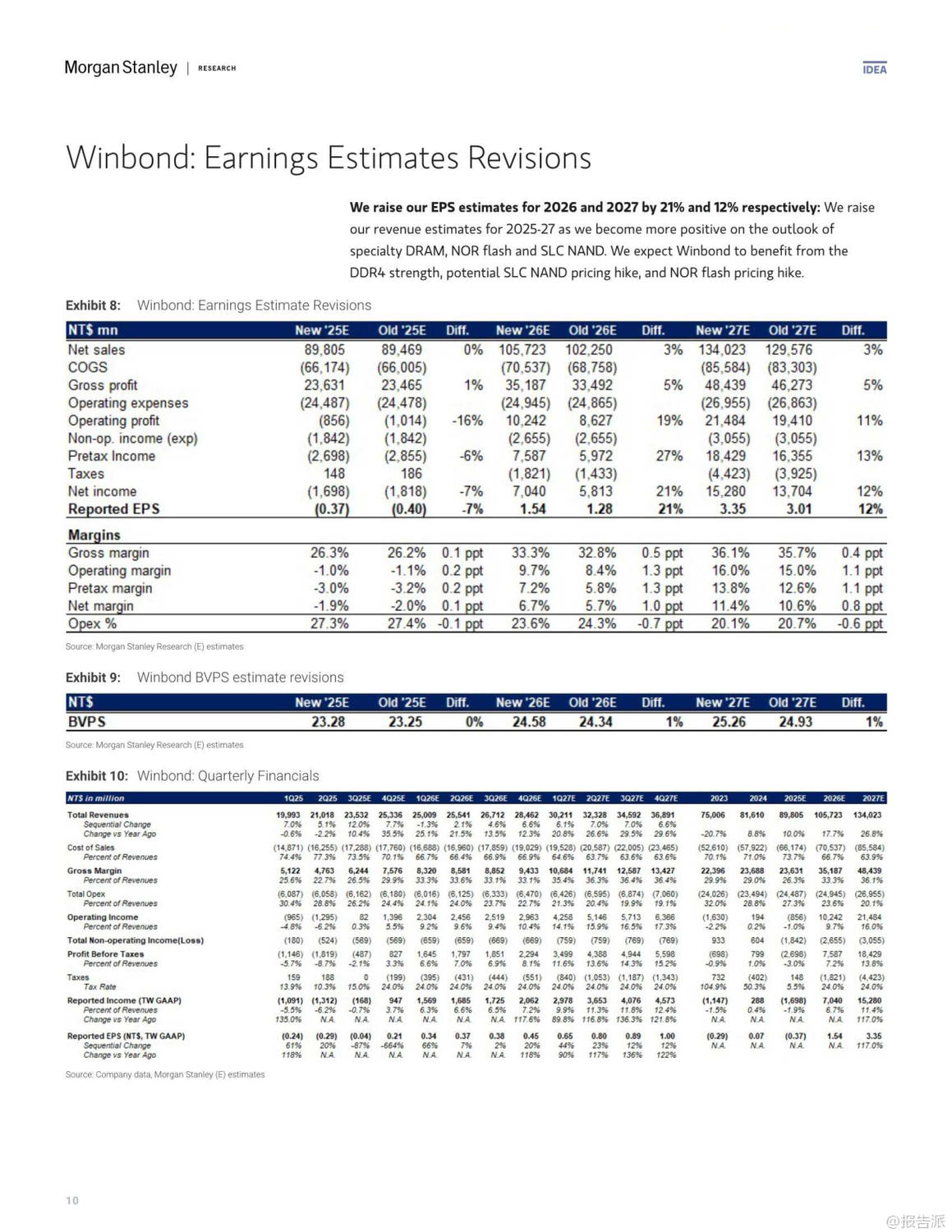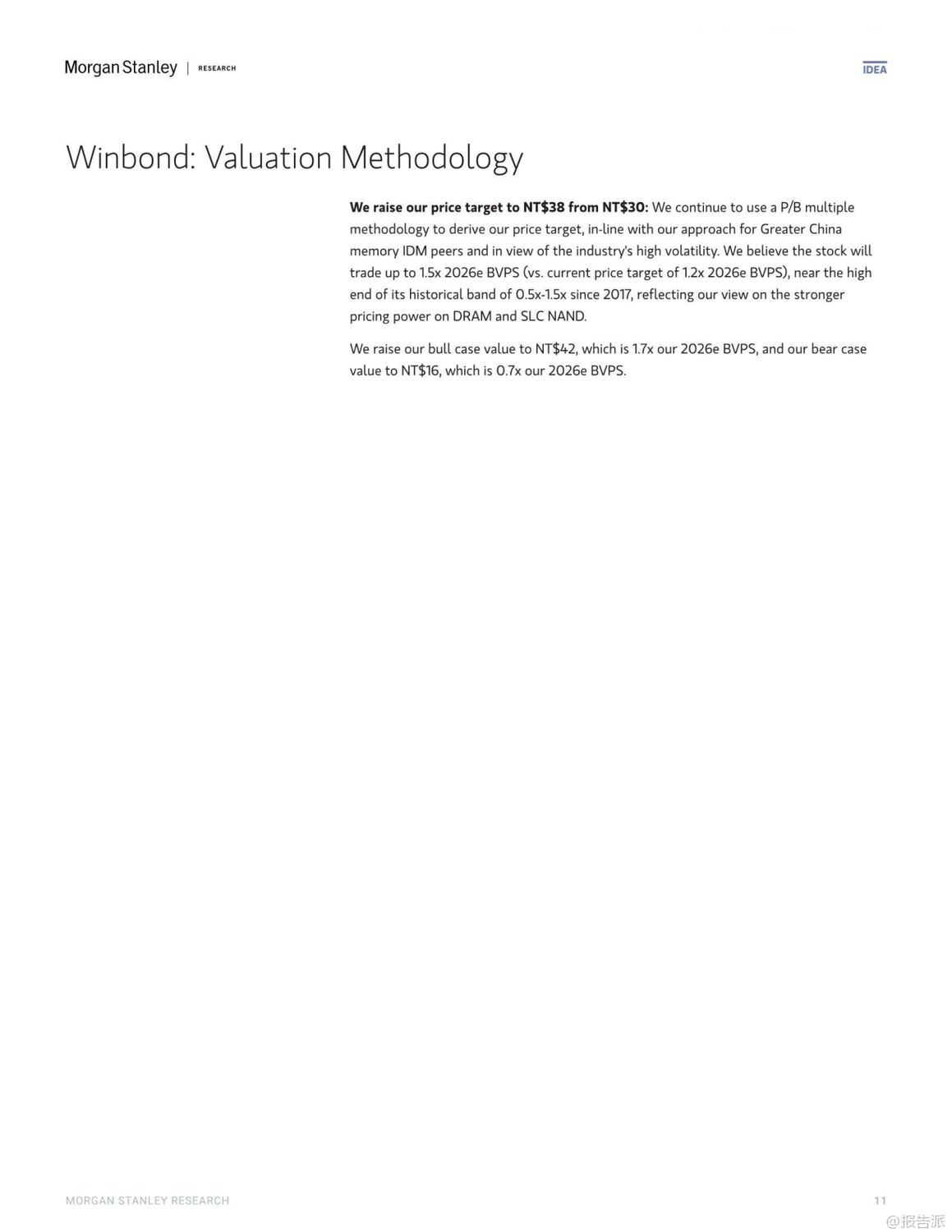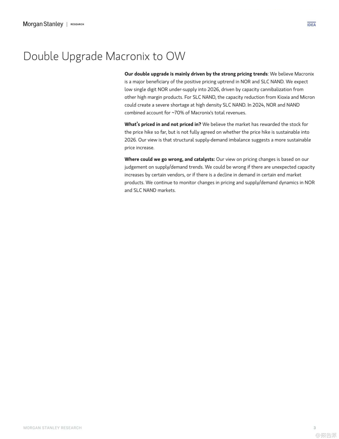 | 人工智能(AI)的迅猛发展正深刻重塑全球半导体产业格局,其增长效应已从高端芯片逐步渗透至传统存储领域。 摩根士丹利最新发布的《大中华区半导体行业:AI增长效应渗透至传统存储领域》报告指出,2026年主流存储器供需错配的局面正在向“老旧存储”(Old Memories)蔓延,尤其是SLC NAND和NOR Flash等利基型闪存市场,正面临供应紧张与价格上行的双重驱动。 报告核心观点认为,由于AI服务器对高利润的eSSD(采用TLC/QLC NAND)需求持续强劲,全球主要NAND供应商如铠侠(Kioxia)和美光(Micron)正主动缩减老旧NOR及SLC NAND的产能,以腾出资源投向更具增长潜力的市场。 这一“产能蚕食”效应将导致SLC NAND出现严重短缺,预计供应缺口可能达到两位数百分比。 与此同时,NOR Flash市场同样不容乐观,受后端测试产能被GPU等高优先级产品抢占的影响,预计将出现低个位数的供应不足,推动价格在2026年上半年持续上涨。 在动态随机存取存储器(DRAM)方面,DDR4市场正迎来结构性拐点。 随着三星、SK海力士等巨头宣布停产计划,DDR4合约价有望追平现货价,叠加DDR5因云服务商抢购而价格坚挺,DDR4厂商将在2025年第四季度迎来显著的毛利率扩张。 这一趋势利好专注于该领域的台湾厂商。 基于上述判断,摩根士丹利上调了多家存储厂商的目标价,并作出关键评级调整。 其中,华邦电(Winbond)作为首选股(Top Pick),目标价由新台币30元上调至38元。 公司不仅受益于DDR4、NOR及SLC NAND的价格上涨,其在MCU业务上的稳定表现以及Cube平台的长期机遇也备受看好。 另一家关键标的则是旺宏电子(Macronix),其评级被罕见地“双升级”至“增持”(Overweight),目标价大幅提升至29元。 报告明确指出,旺宏是NOR与SLC NAND涨价周期的主要受益者,预计公司有望在2026年实现扭亏为盈。 此外,兆易创新(GigaDevice)和力晶科技(PSMC)的目标价也获得上调,反映了分析师对特种DRAM及整体存储市场复苏的共同预期。 整体来看,此轮由AI驱动的存储景气周期,已从高带宽内存(HBM)等尖端领域,扩散至更为广泛的传统利基市场,形成全面共振。 对于投资者而言,那些在NOR Flash、SLC NAND及特种DRAM领域拥有稳固地位的企业,正站在新一轮产业红利的风口之上,值得高度关注。 出品方:摩根士丹利 发布时间:2025年