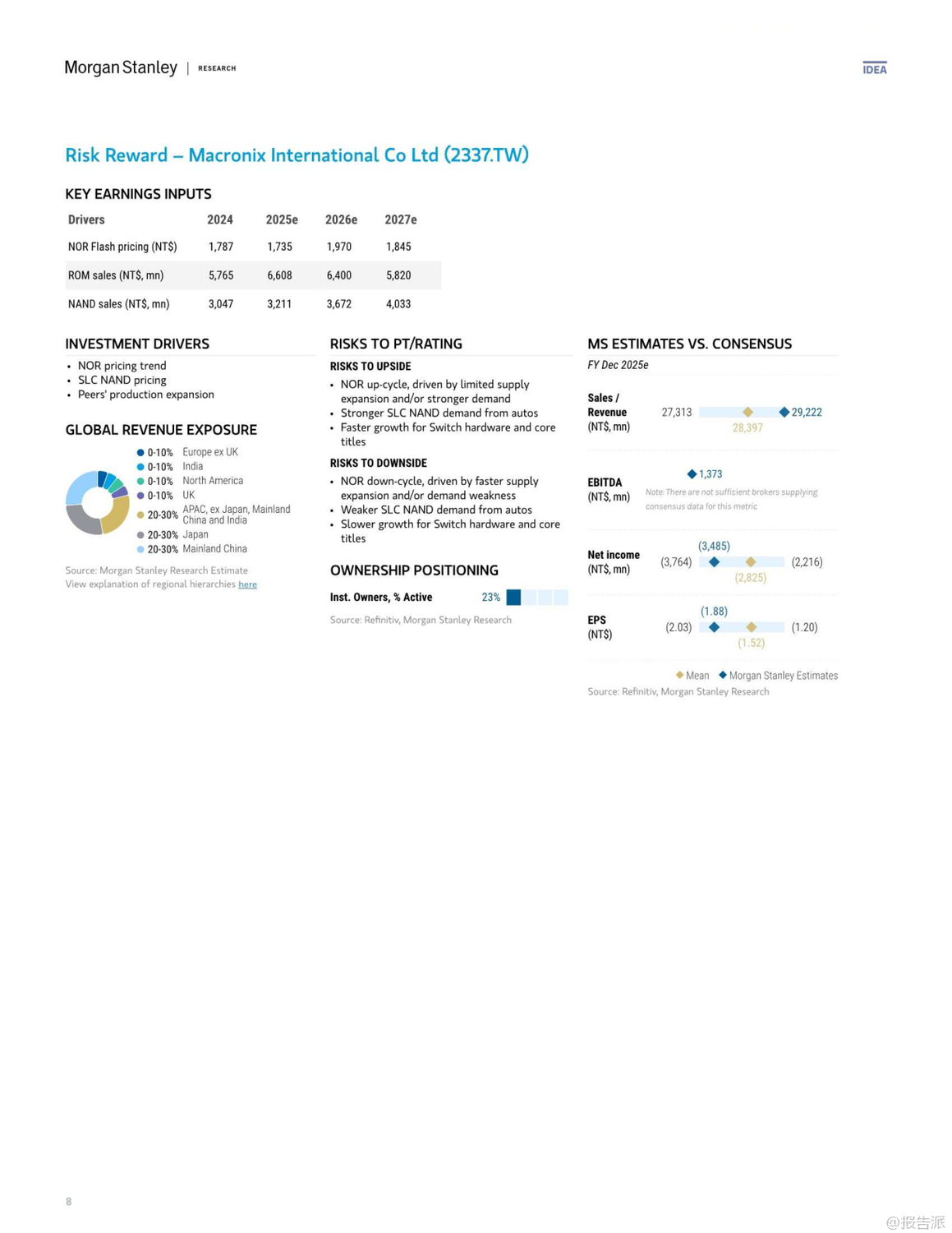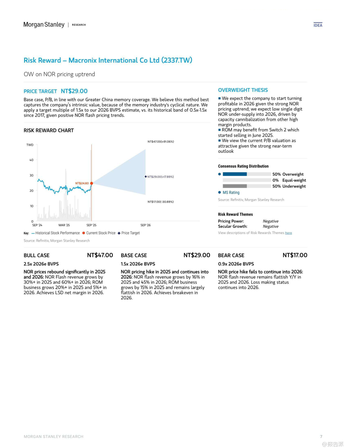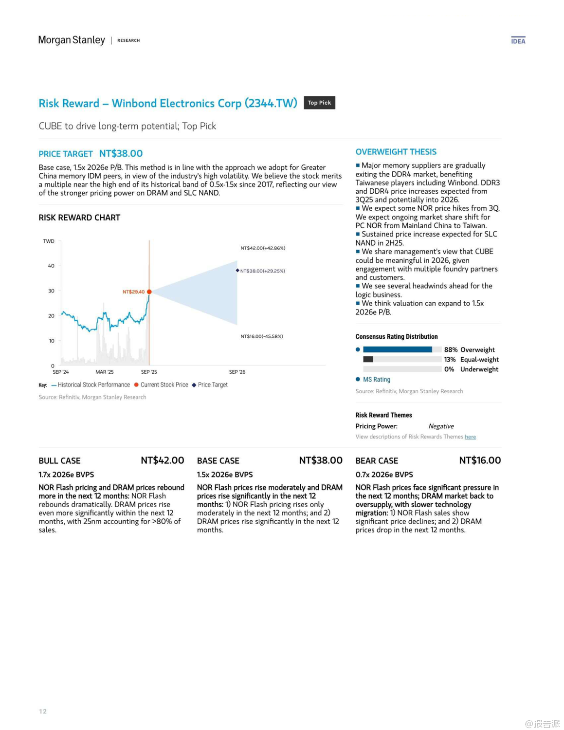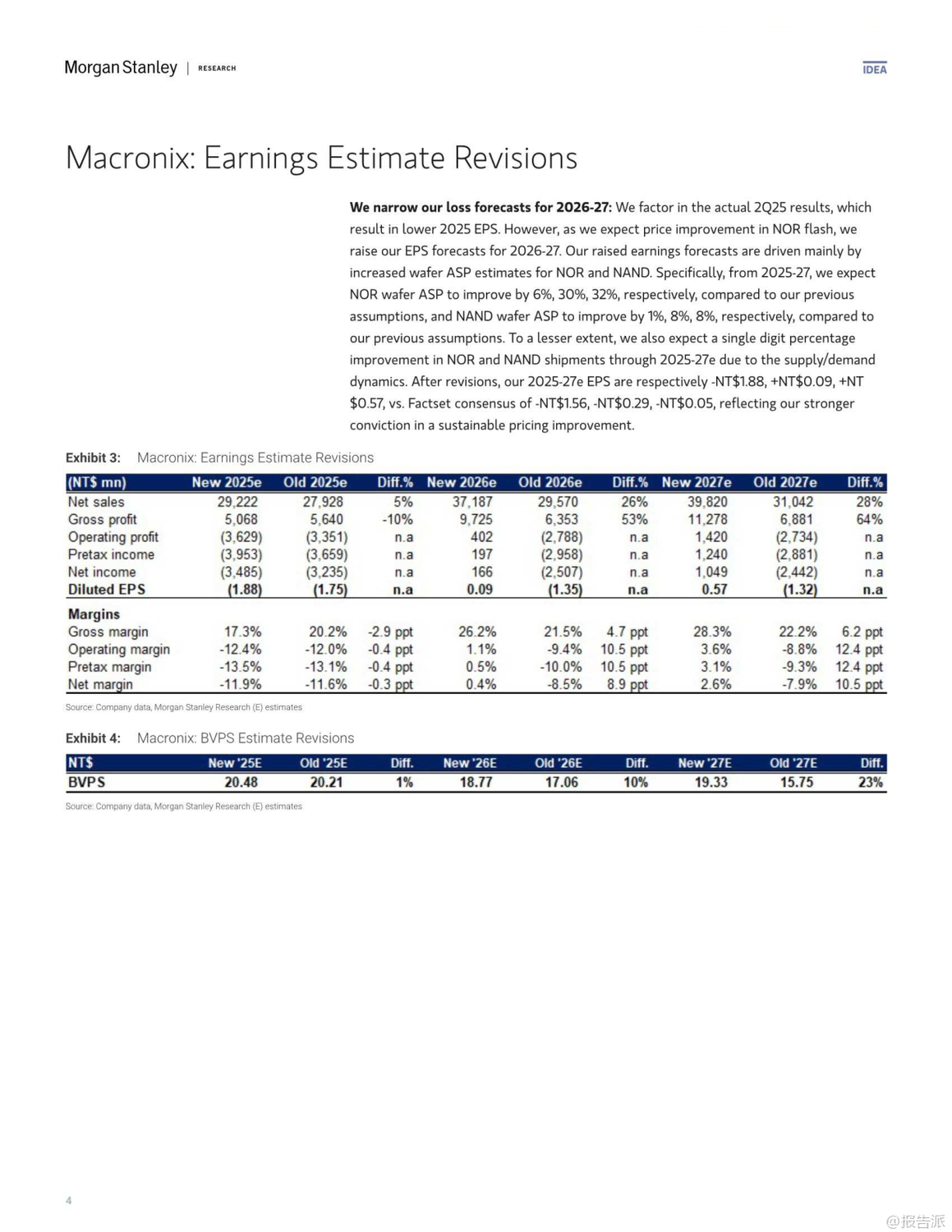 | 人工智能(AI)的迅猛发展正深刻重塑全球半导体产业格局,其增长效应已从高端芯片逐步渗透至传统存储领域。 摩根士丹利最新发布的《大中华区半导体行业:AI增长效应渗透至传统存储领域》报告指出,2026年主流存储器供需错配的局面正在向“老旧存储”(Old Memories)蔓延,尤其是SLC NAND和NOR Flash等利基型闪存市场,正面临供应紧张与价格上行的双重驱动。 报告核心观点认为,由于AI服务器对高利润的eSSD(采用TLC/QLC NAND)需求持续强劲,全球主要NAND供应商如铠侠(Kioxia)和美光(Micron)正主动缩减老旧NOR及SLC NAND的产能,以腾出资源投向更具增长潜力的市场。 这一“产能蚕食”效应将导致SLC NAND出现严重短缺,预计供应缺口可能达到两位数百分比。 与此同时,NOR Flash市场同样不容乐观,受后端测试产能被GPU等高优先级产品抢占的影响,预计将出现低个位数的供应不足,推动价格在2026年上半年持续上涨。 在动态随机存取存储器(DRAM)方面,DDR4市场正迎来结构性拐点。 随着三星、SK海力士等巨头宣布停产计划,DDR4合约价有望追平现货价,叠加DDR5因云服务商抢购而价格坚挺,DDR4厂商将在2025年第四季度迎来显著的毛利率扩张。 这一趋势利好专注于该领域的台湾厂商。 基于上述判断,摩根士丹利上调了多家存储厂商的目标价,并作出关键评级调整。 其中,华邦电(Winbond)作为首选股(Top Pick),目标价由新台币30元上调至38元。 公司不仅受益于DDR4、NOR及SLC NAND的价格上涨,其在MCU业务上的稳定表现以及Cube平台的长期机遇也备受看好。 另一家关键标的则是旺宏电子(Macronix),其评级被罕见地“双升级”至“增持”(Overweight),目标价大幅提升至29元。 报告明确指出,旺宏是NOR与SLC NAND涨价周期的主要受益者,预计公司有望在2026年实现扭亏为盈。 此外,兆易创新(GigaDevice)和力晶科技(PSMC)的目标价也获得上调,反映了分析师对特种DRAM及整体存储市场复苏的共同预期。 整体来看,此轮由AI驱动的存储景气周期,已从高带宽内存(HBM)等尖端领域,扩散至更为广泛的传统利基市场,形成全面共振。 对于投资者而言,那些在NOR Flash、SLC NAND及特种DRAM领域拥有稳固地位的企业,正站在新一轮产业红利的风口之上,值得高度关注。 出品方:摩根士丹利 发布时间:2025年