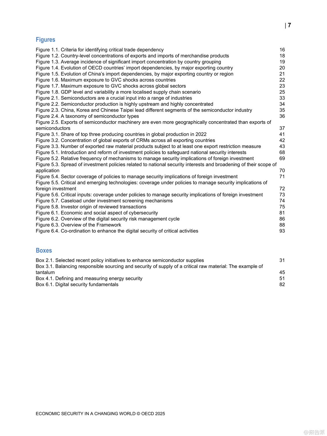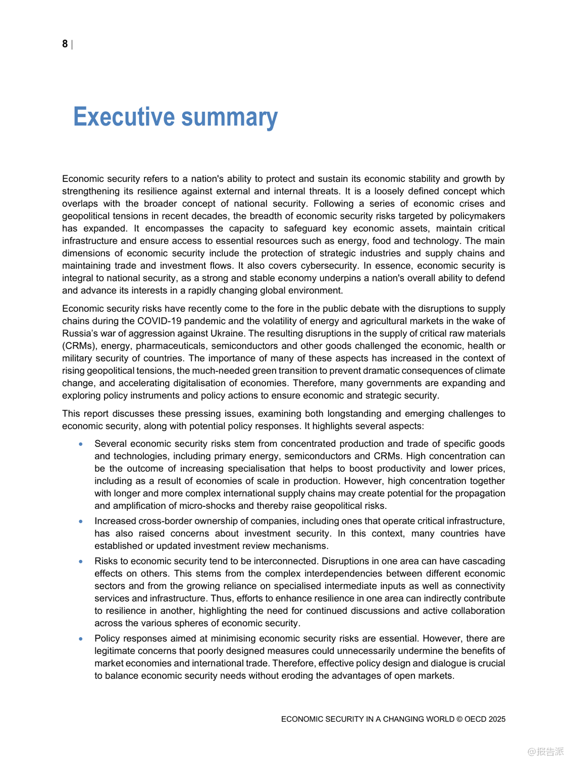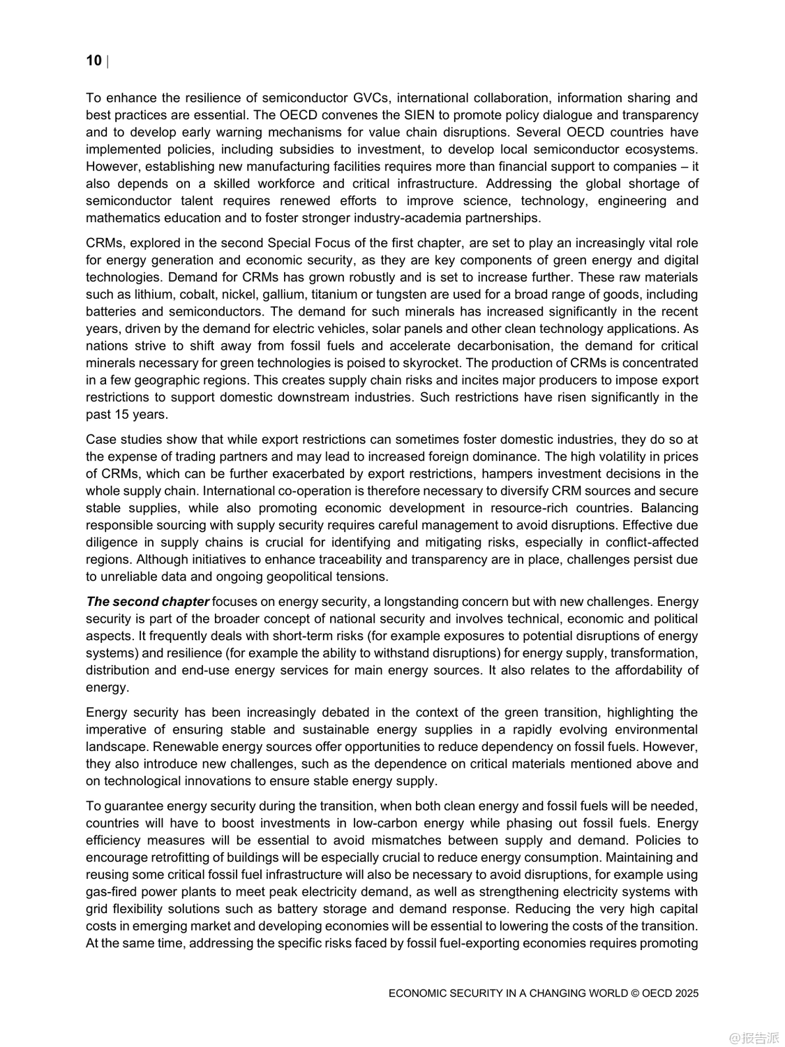 | 在当今高度互联的世界中,经济安全已成为各国政府和企业关注的核心议题。 最新发布的《变化世界中的经济安全》报告由经合组织(OECD)于2025年发布,深入探讨了在全球地缘政治紧张、绿色转型加速以及数字化进程不断深化背景下,如何应对日益复杂的经济安全挑战。 这份长达百页的研究不仅揭示了当前全球供应链、能源系统与网络安全面临的脆弱性,更提出了构建韧性经济体系的关键路径。 报告指出,近年来新冠疫情和俄乌冲突等重大事件暴露出国际供应链的高度集中风险。 特别是在半导体和关键原材料领域,生产集中在少数几个国家和地区,一旦发生中断将对全球经济造成严重冲击。 例如,超过90%的先进逻辑芯片由台积电一家公司在台湾地区生产,而锂、钴、稀土等绿色能源所需的关键矿产也主要由中国、刚果(金)等国主导供应。 这种地理上的不均衡分布使得许多国家面临“卡脖子”的困境。 面对这些挑战,各国纷纷采取措施提升自身经济安全性。 美国通过《芯片与科学法案》投入巨额资金支持本土半导体制造;欧盟推出《欧洲芯片法案》,旨在将其全球市场份额从目前的10%提高到2030年的20%。 与此同时,日本、韩国等亚洲经济体也在加大投资力度,试图重塑区域产业链格局。 然而,报告警告称,过度追求自给自足可能导致全球贸易碎片化,反而削弱整体效率并推高成本。 能源安全同样是报告重点关注的内容。 随着清洁能源转型推进,传统化石燃料依赖度虽有所下降,但新型能源系统的稳定性问题日益凸显。 风能、太阳能等可再生能源受天气影响大,需要强大的储能技术和灵活电网支撑。 此外,氢能、碳捕集利用与封存(CCUS)等低碳技术的发展也为未来能源结构带来新变数。 报告强调,确保能源供应多元化、加强跨国电力互联是提升区域能源韧性的有效手段。 在网络空间方面,数字化带来的便利同时伴随着巨大安全隐患。 勒索软件攻击频发,针对金融、医疗、交通等关键基础设施的网络威胁持续升级。 为此,OECD提出建立以风险管理为核心的数字安全框架,倡导“零信任”架构,并推动产品和服务全生命周期的安全设计。 同时呼吁加强国际合作,共同打击跨境网络犯罪活动。 值得注意的是,上述三大领域并非孤立存在,而是相互交织、彼此影响。 一个领域的危机可能迅速传导至其他领域,形成连锁反应。 因此,报告建议各国应摒弃单打独斗思维,转而构建多边协作机制,在保持开放市场的同时增强集体防御能力。 唯有如此,才能真正实现可持续且包容的经济繁荣。 出品方:OECD 发布时间:2025年 文档页数:100页