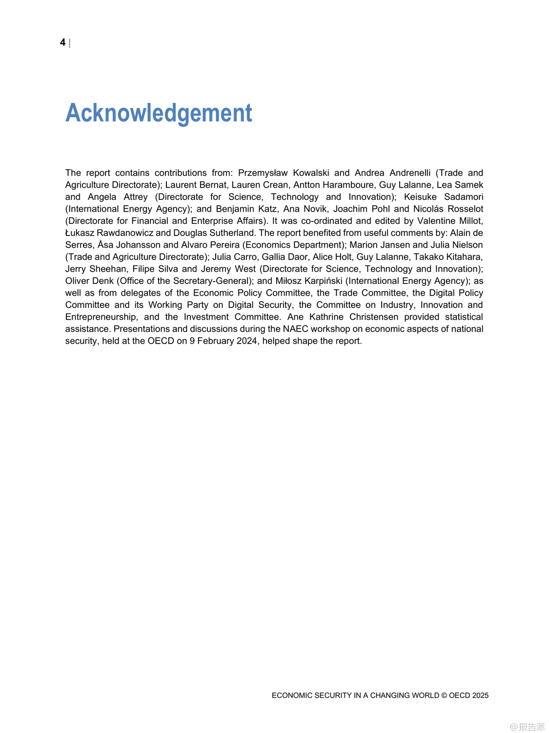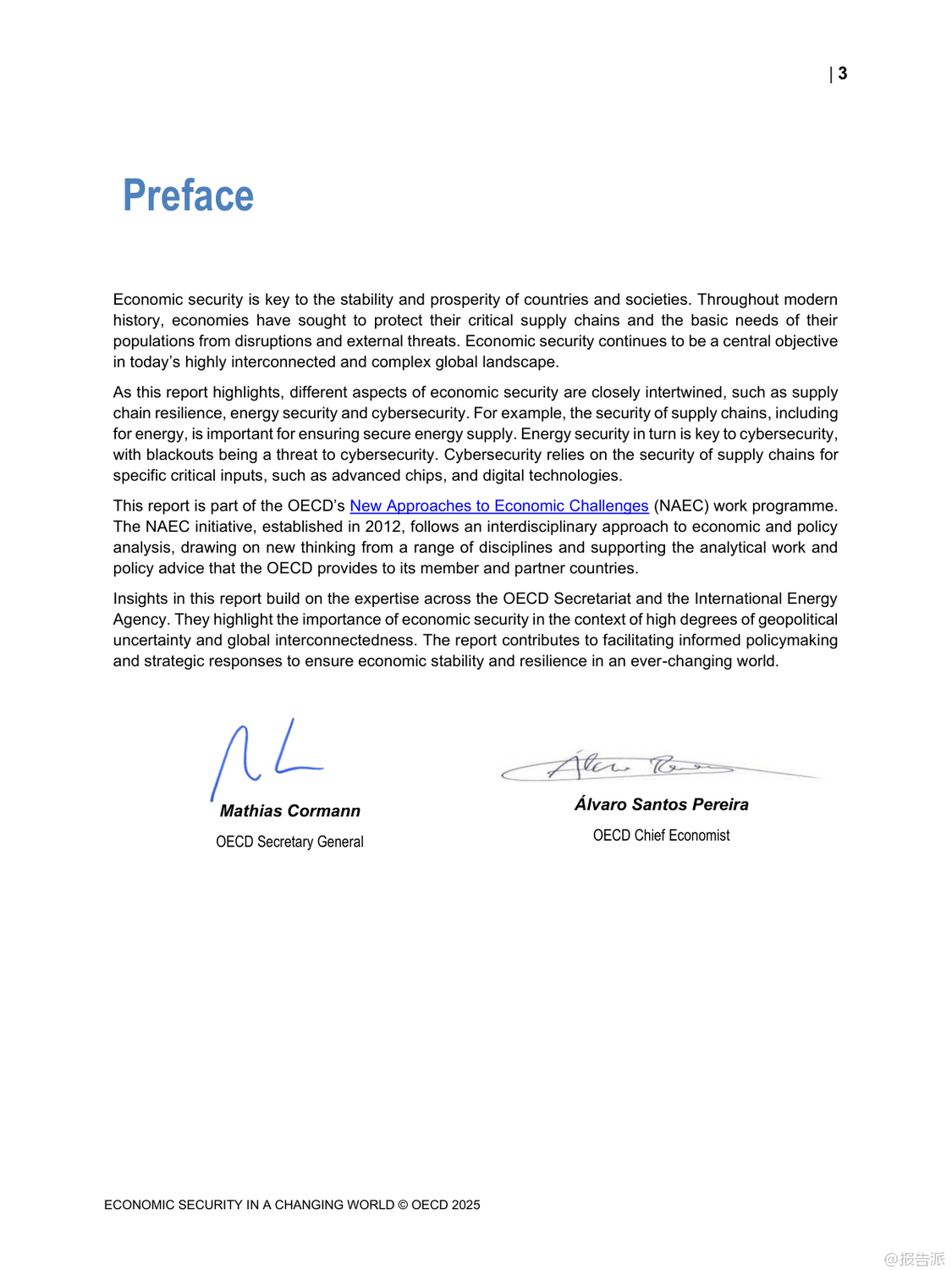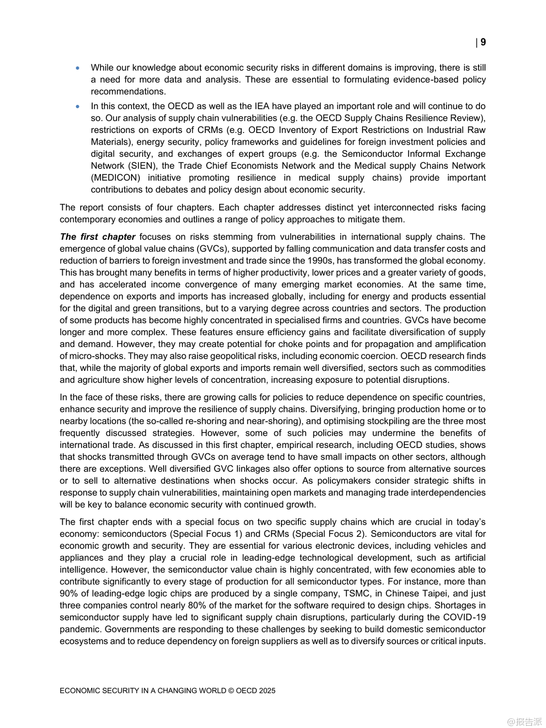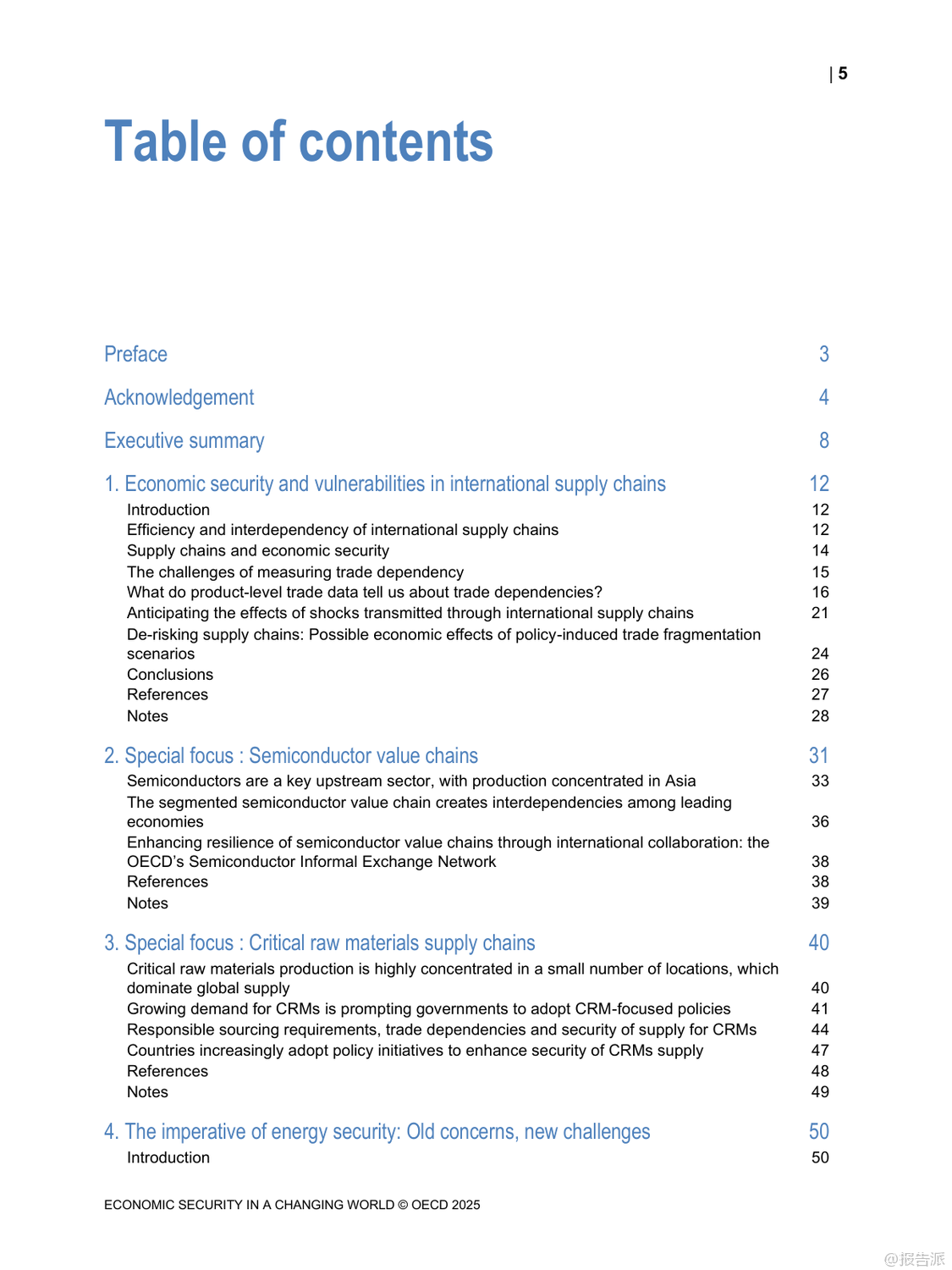 | 在当今高度互联的世界中,经济安全已成为各国政府和企业关注的核心议题。 最新发布的《变化世界中的经济安全》报告由经合组织(OECD)于2025年发布,深入探讨了在全球地缘政治紧张、绿色转型加速以及数字化进程不断深化背景下,如何应对日益复杂的经济安全挑战。 这份长达百页的研究不仅揭示了当前全球供应链、能源系统与网络安全面临的脆弱性,更提出了构建韧性经济体系的关键路径。 报告指出,近年来新冠疫情和俄乌冲突等重大事件暴露出国际供应链的高度集中风险。 特别是在半导体和关键原材料领域,生产集中在少数几个国家和地区,一旦发生中断将对全球经济造成严重冲击。 例如,超过90%的先进逻辑芯片由台积电一家公司在台湾地区生产,而锂、钴、稀土等绿色能源所需的关键矿产也主要由中国、刚果(金)等国主导供应。 这种地理上的不均衡分布使得许多国家面临“卡脖子”的困境。 面对这些挑战,各国纷纷采取措施提升自身经济安全性。 美国通过《芯片与科学法案》投入巨额资金支持本土半导体制造;欧盟推出《欧洲芯片法案》,旨在将其全球市场份额从目前的10%提高到2030年的20%。 与此同时,日本、韩国等亚洲经济体也在加大投资力度,试图重塑区域产业链格局。 然而,报告警告称,过度追求自给自足可能导致全球贸易碎片化,反而削弱整体效率并推高成本。 能源安全同样是报告重点关注的内容。 随着清洁能源转型推进,传统化石燃料依赖度虽有所下降,但新型能源系统的稳定性问题日益凸显。 风能、太阳能等可再生能源受天气影响大,需要强大的储能技术和灵活电网支撑。 此外,氢能、碳捕集利用与封存(CCUS)等低碳技术的发展也为未来能源结构带来新变数。 报告强调,确保能源供应多元化、加强跨国电力互联是提升区域能源韧性的有效手段。 在网络空间方面,数字化带来的便利同时伴随着巨大安全隐患。 勒索软件攻击频发,针对金融、医疗、交通等关键基础设施的网络威胁持续升级。 为此,OECD提出建立以风险管理为核心的数字安全框架,倡导“零信任”架构,并推动产品和服务全生命周期的安全设计。 同时呼吁加强国际合作,共同打击跨境网络犯罪活动。 值得注意的是,上述三大领域并非孤立存在,而是相互交织、彼此影响。 一个领域的危机可能迅速传导至其他领域,形成连锁反应。 因此,报告建议各国应摒弃单打独斗思维,转而构建多边协作机制,在保持开放市场的同时增强集体防御能力。 唯有如此,才能真正实现可持续且包容的经济繁荣。 出品方:OECD 发布时间:2025年 文档页数:100页