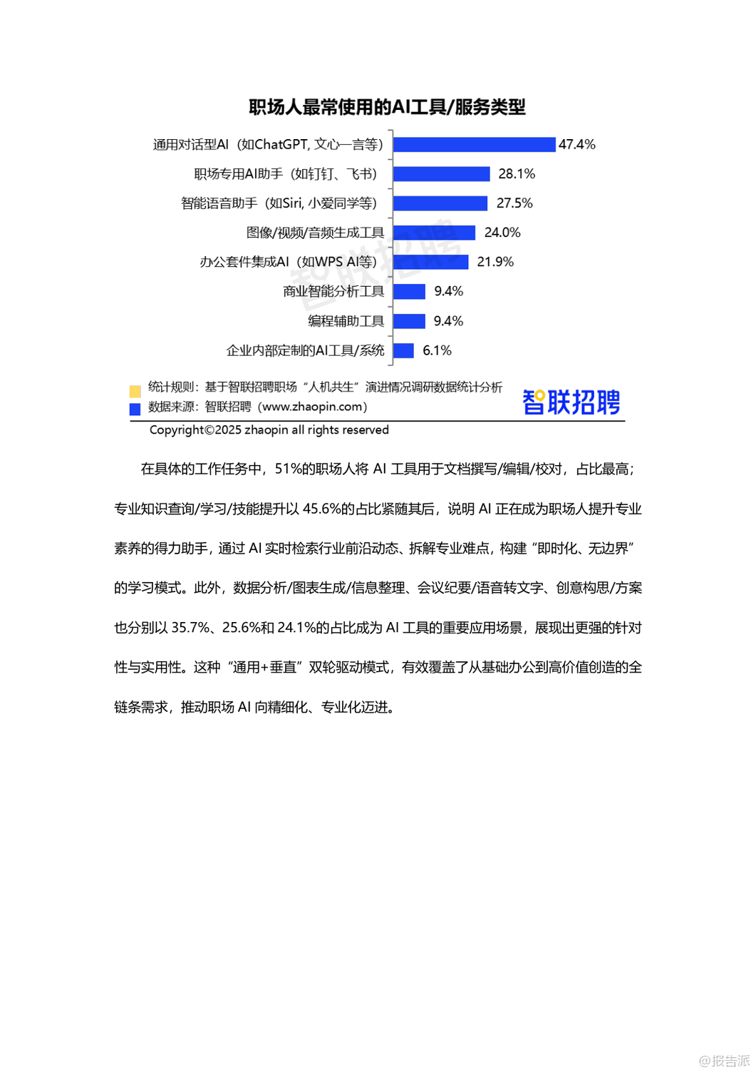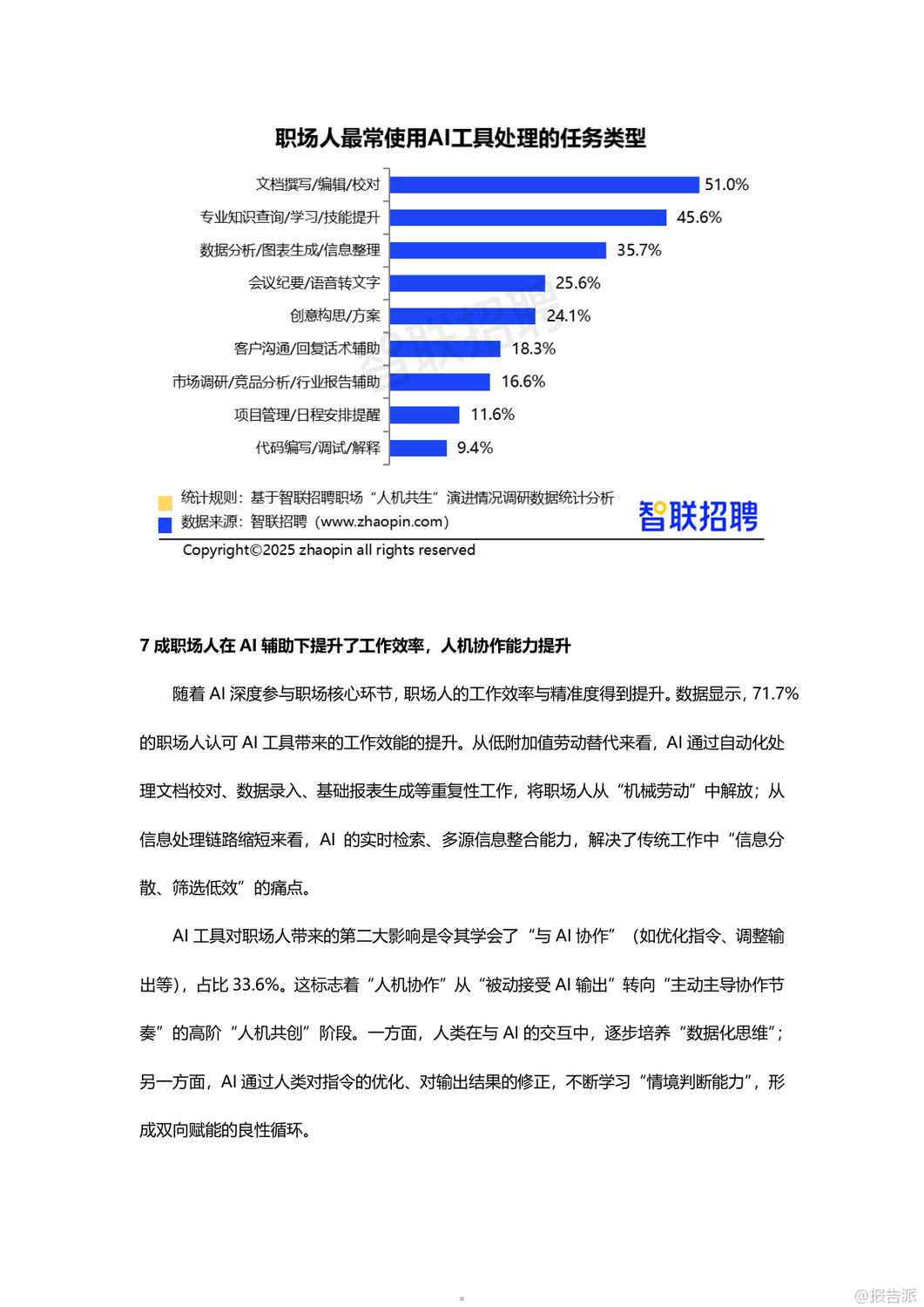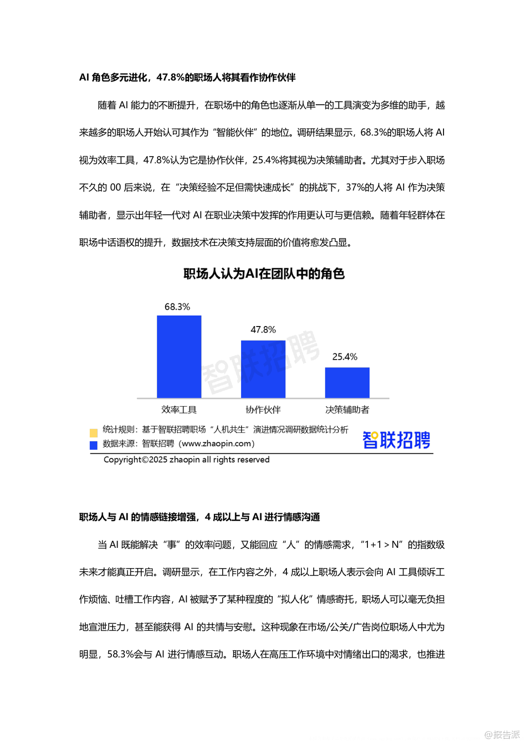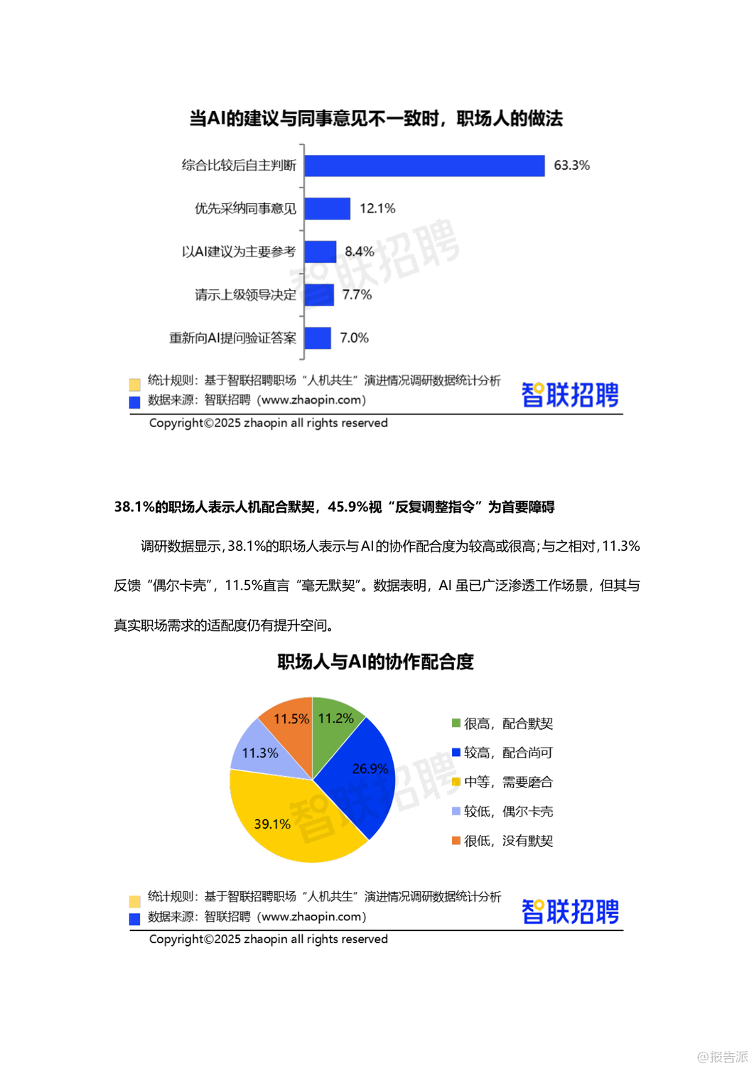 | 在人工智能技术日益成熟的2025年,AI已深度融入职场生态,从“工具”演变为“伙伴”,推动“人机共生”进入新阶段。 智联招聘通过对3112名职场人的调研,发布了《职场“人机共生”演进情况调研报告》,揭示了当前AI在职场中的应用现状、价值跃升、信任构建与未来发展路径。 调研显示,高达78.2%的职场人每周都会使用AI工具,其中27.8%每周使用1-2次,18.9%使用3-5次,更有31.5%几乎每天都在使用,AI已成为职场标配。 在工具类型上,47.4%的职场人首选通用对话型AI(如ChatGPT、文心一言),其次是职场专用AI助手(28.1%)、智能语音助手(27.5%)和图像/视频生成工具(24%)。 AI的应用场景广泛,51%用于文档撰写与校对,45.6%用于专业知识学习,35.7%用于数据分析,25.6%用于会议纪要生成,显示出AI已覆盖从基础办公到专业创作的全流程。 AI的价值不仅体现在效率提升上,更在于重构职场协作模式。 71.7%的职场人认为AI提升了工作效率,64.9%表示能在AI辅助下完成原本需要同事协助的任务,形成“一人+AI”的独立工作单元,推动团队协作向扁平化、智能化转变。 与此同时,AI的角色也在进化:68.3%视其为效率工具,47.8%认为是协作伙伴,25.4%将其当作决策辅助者,尤其是00后群体中,37%依赖AI做职业决策,反映出年轻一代对AI的高度信任。 更值得关注的是,AI正在承担情感支持功能。 超过四成职场人会向AI倾诉工作压力,市场/公关/广告从业者中这一比例高达58.3%,AI逐渐成为职场人的情绪出口,增强了“人机情感链接”。 然而,人机互信仍处磨合期。 面对AI与同事意见冲突时,63.3%的职场人选择综合判断后自主决策,仅8.4%以AI建议为主。 38.2%的人经常验证AI输出,45.9%抱怨“需反复调整指令”,33.1%认为结果仍需大量修改,反映出AI在理解意图和交付质量上的不足。 此外,信息滞后(46%)、复杂问题处理能力弱(43.3%)、“幻觉”编造内容(34.7%)等问题仍是主要瓶颈。 企业层面正积极构建“人机共生”生态。 25.3%的职场人已被明确要求具备AI能力,55%呼吁建立AI质量管理体系,53.4%期待数据安全与合规保障。 企业推进措施中,27.6%开展专业培训,27.2%创新管理机制,24.6%升级基础设施。 但文化建设和激励机制覆盖率不足15%,表明企业在软性支持上仍有欠缺。 展望未来,AI正从“可用”迈向“好用”,职场人需提升指令优化与结果验证能力,企业则需完善培训体系、质量管控与伦理规范。 唯有技术与组织协同进化,才能真正实现“人机共创”的深度共生,塑造更具韧性与创造力的未来职场。 出品方:智联招聘 发布时间:2025年