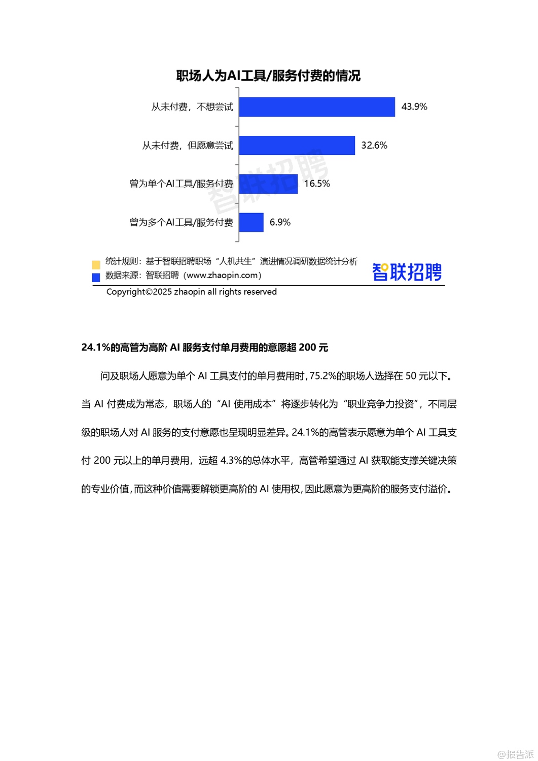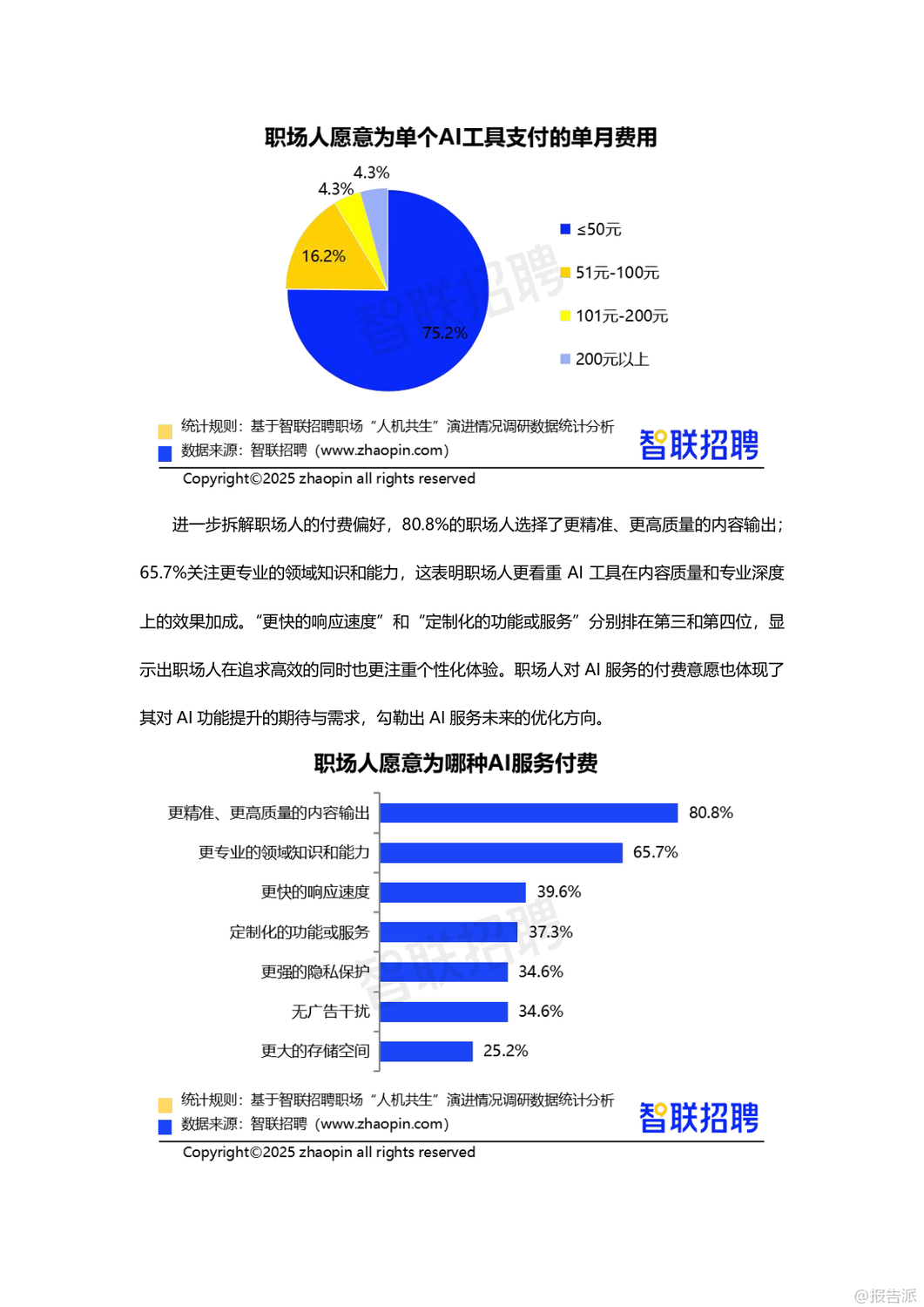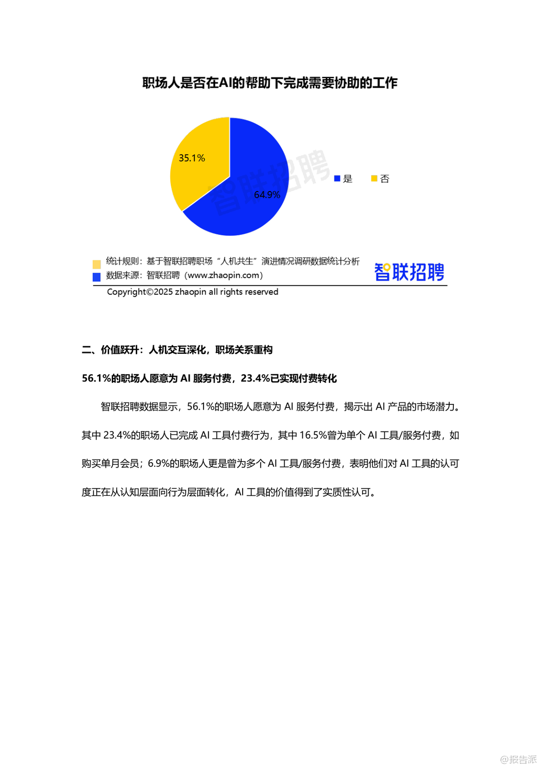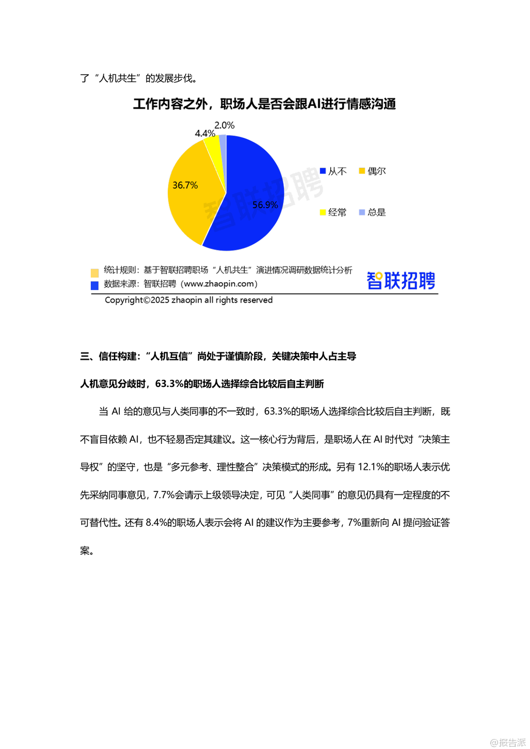 | 在人工智能技术日益成熟的2025年,AI已深度融入职场生态,从“工具”演变为“伙伴”,推动“人机共生”进入新阶段。 智联招聘通过对3112名职场人的调研,发布了《职场“人机共生”演进情况调研报告》,揭示了当前AI在职场中的应用现状、价值跃升、信任构建与未来发展路径。 调研显示,高达78.2%的职场人每周都会使用AI工具,其中27.8%每周使用1-2次,18.9%使用3-5次,更有31.5%几乎每天都在使用,AI已成为职场标配。 在工具类型上,47.4%的职场人首选通用对话型AI(如ChatGPT、文心一言),其次是职场专用AI助手(28.1%)、智能语音助手(27.5%)和图像/视频生成工具(24%)。 AI的应用场景广泛,51%用于文档撰写与校对,45.6%用于专业知识学习,35.7%用于数据分析,25.6%用于会议纪要生成,显示出AI已覆盖从基础办公到专业创作的全流程。 AI的价值不仅体现在效率提升上,更在于重构职场协作模式。 71.7%的职场人认为AI提升了工作效率,64.9%表示能在AI辅助下完成原本需要同事协助的任务,形成“一人+AI”的独立工作单元,推动团队协作向扁平化、智能化转变。 与此同时,AI的角色也在进化:68.3%视其为效率工具,47.8%认为是协作伙伴,25.4%将其当作决策辅助者,尤其是00后群体中,37%依赖AI做职业决策,反映出年轻一代对AI的高度信任。 更值得关注的是,AI正在承担情感支持功能。 超过四成职场人会向AI倾诉工作压力,市场/公关/广告从业者中这一比例高达58.3%,AI逐渐成为职场人的情绪出口,增强了“人机情感链接”。 然而,人机互信仍处磨合期。 面对AI与同事意见冲突时,63.3%的职场人选择综合判断后自主决策,仅8.4%以AI建议为主。 38.2%的人经常验证AI输出,45.9%抱怨“需反复调整指令”,33.1%认为结果仍需大量修改,反映出AI在理解意图和交付质量上的不足。 此外,信息滞后(46%)、复杂问题处理能力弱(43.3%)、“幻觉”编造内容(34.7%)等问题仍是主要瓶颈。 企业层面正积极构建“人机共生”生态。 25.3%的职场人已被明确要求具备AI能力,55%呼吁建立AI质量管理体系,53.4%期待数据安全与合规保障。 企业推进措施中,27.6%开展专业培训,27.2%创新管理机制,24.6%升级基础设施。 但文化建设和激励机制覆盖率不足15%,表明企业在软性支持上仍有欠缺。 展望未来,AI正从“可用”迈向“好用”,职场人需提升指令优化与结果验证能力,企业则需完善培训体系、质量管控与伦理规范。 唯有技术与组织协同进化,才能真正实现“人机共创”的深度共生,塑造更具韧性与创造力的未来职场。 出品方:智联招聘 发布时间:2025年