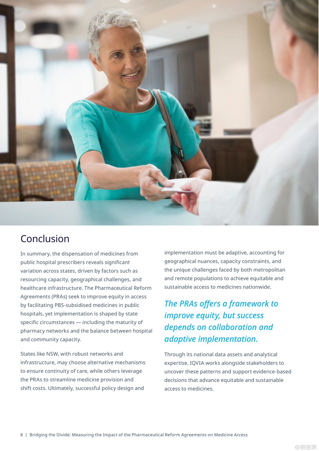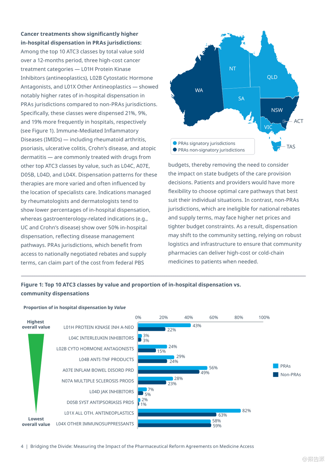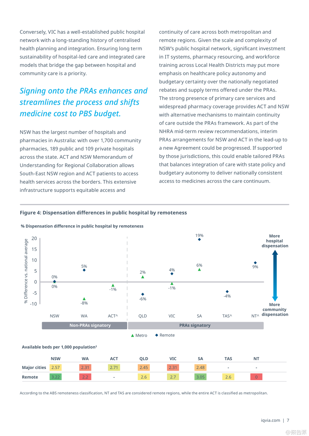 | 近日,艾昆纬(IQVIA)发布了一份题为《弥合分歧:衡量药品改革协议对药品获取的影响》的白皮书,深入分析了澳大利亚各州和地区在实施 Pharmaceutical Reform Agreements(PRAs,药品改革协议)后,对患者获取PBS(Pharmaceutical Benefits Scheme,药品福利计划)药物的影响。 该报告基于IQVIA全国性数据资产,聚焦政策差异如何影响医疗公平性、系统效率及患者管理路径,为未来医疗体系整合提供了重要参考。 PRAs是澳大利亚联邦政府与各州及领地之间的双边协议,旨在提升公立医院住院患者出院后、非住院患者以及当日入院患者的PBS药物可及性。 目前,昆士兰(QLD)、维多利亚(VIC)、塔斯马尼亚(TAS)、南澳(SA)和北领地(NT)已签署协议,享受全国统一药价、供应保障及通过保密回扣实现成本回收等优势。 而新南威尔士(NSW)、首都领地(ACT)和西澳(WA)尚未加入,导致这些地区的公立医院无法常规以联邦补贴价格获取PBS药物,患者面临更大的用药障碍。 报告指出,PRAs显著改变了药物分发模式。 在签署地区,超过53%的医院处方药物在院内药房直接配药,患者仅需支付标准共付额,如同在社区药店购药。 这有助于实现从医院到社区的无缝过渡,增强治疗连续性。 而在未签署地区,医院通常只能提供3至5天的短期药物供应,后续治疗需患者自行前往外部机构续药,易造成护理中断。 研究特别关注高成本药物的分发差异。 在癌症治疗领域,如蛋白激酶抑制剂(L01H)、细胞毒性激素拮抗剂(L02B)等类别,签署PRAs的地区院内配药比例分别高出9%至21%。 对于免疫介导炎症性疾病(IMIDs),分发模式则更多受专科诊疗地点影响,胃肠类疾病因管理路径依赖,院内配药率普遍超50%。 值得注意的是,尽管PRAs和非PRAs地区的医院处方总量相近,但在费用分布上存在巨大差异:签署地区34%的药物成本由医院承担,而未签署地区这一比例仅为16%,意味着84%的高值药物支出转移至PBS公共预算,反映出财政机制对医疗服务供给的深刻影响。 地理与基础设施因素同样关键。 在偏远地区如西澳、南澳和北领地,由于社区药房覆盖不足,医院成为主要药物供给方,院内配药比例高于全国平均水平。 相反,塔州和昆州虽属PRAs地区,但因床位紧张,远程患者仍被导向社区配药。 报告最后强调,PRAs为提升医疗公平提供了框架,但成功实施需因地制宜。 像NSW这样拥有庞大医疗网络的地区,可能更重视政策自主权与预算可控性,而非全国统一分销机制。 未来可通过定制化协议,在保障国家一致性的同时尊重地方特殊需求。 艾昆纬认为,唯有通过数据驱动的协作与灵活执行,才能真正实现全民公平、可持续的药物获取目标。 出品方:艾昆纬 发布时间:2025年