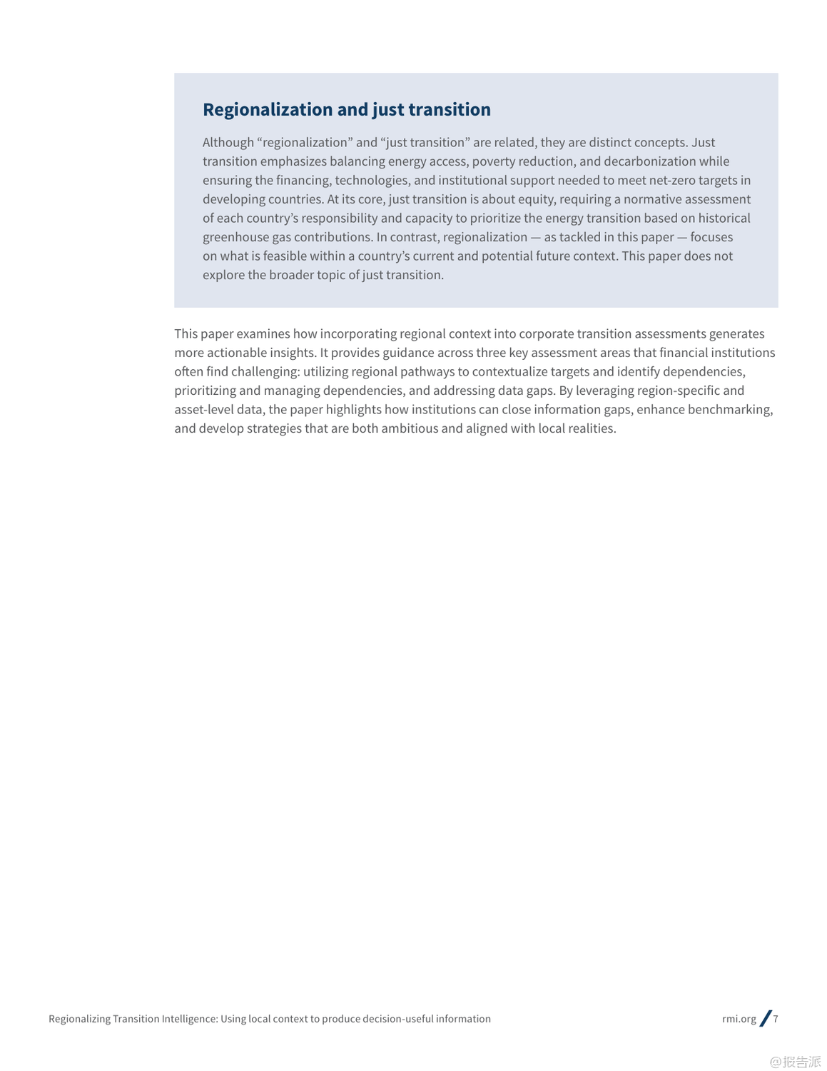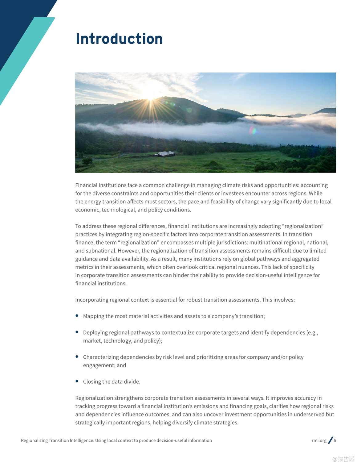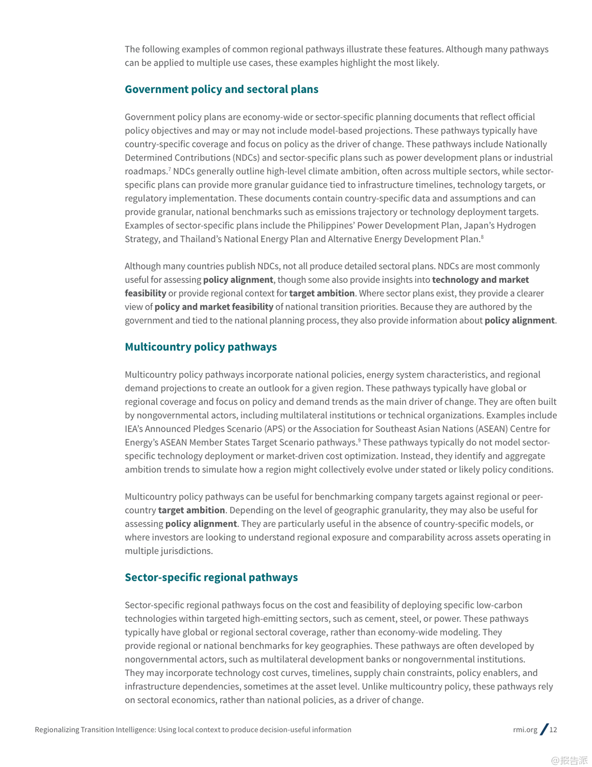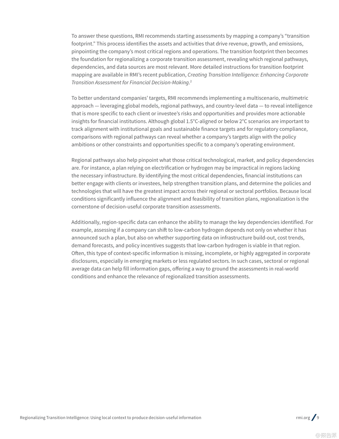 | 在全球加速推进碳中和目标的背景下,金融机构在支持企业绿色转型过程中面临一个核心挑战:如何将企业的脱碳计划置于真实的区域环境中进行评估。 这份由落基山研究所(RMI)发布的《区域化转型情报》报告指出,当前多数企业披露的气候目标缺乏对本地政策、基础设施、技术条件等关键因素的考量,导致金融风险判断失真、投资决策脱离实际。 报告提出,必须通过“区域化”方式重构企业转型评估体系,才能真正提升决策的有效性。 所谓“区域化”,是指将跨国、国家及次国家级别的经济、政策与技术现实纳入评估框架,避免简单套用全球统一模型带来的误判。 为此,报告系统梳理了三大实践前沿:第一,利用区域性转型路径校准企业目标。 报告强调,不能仅依赖国际能源署(IEA)的全球净零情景(NZE)来衡量企业雄心。 例如,一家日本电力公司计划到2030年实现400gCO₂/kWh的排放强度,虽远高于IEA NZE标准(≤100gCO₂/kWh),但若结合日本本国的国家自主贡献(NDC)和东盟政策展望(APS)来看,其目标反而具备高度可行性与政策协同性。 这说明,区域性路径能更真实反映企业在地运营的实际约束与机遇。 第二,识别并管理关键依赖关系。 所有企业转型都依赖外部条件,如氢能基础设施建设、可持续航空燃料(SAF)供应链成熟度、电网扩容进度等。 报告构建了一个三步评估框架:优先级排序、时间演化预测、企业可控性分析。 以欧盟航空公司为例,其SAF战略高度依赖ReFuelEU法规下的燃料供应网络建设,而单个航司对此类基础设施影响有限,因此构成重大外部风险,需提前预警并推动多方协作。 第三,弥合数据鸿沟。 尤其在新兴市场,企业披露往往不完整。 报告建议采用替代数据填补空白,包括政府规划文件、行业平均值、第三方数据库等。 例如,拉美某电力公司未公开具体清洁能源装机目标,但通过整合公开项目清单与区域发电效率数据,可推算其清洁电力供给仅能满足未来需求增长的一半,从而揭示其减排目标缺乏可信支撑。 总体而言,该报告呼吁金融机构采取分层、风险导向的方法,优先聚焦高影响力企业与关键资产,借助区域化工具提升评估精度。 长远看,建立完善的区域数据生态系统需要监管机构、企业、研究组织与资本市场的共同投入。 唯有如此,绿色金融才能从口号走向精准落地,真正驱动全球公正且可行的能源转型进程。 出品方:落基山研究所 发布时间:2025年 文档页数:31页