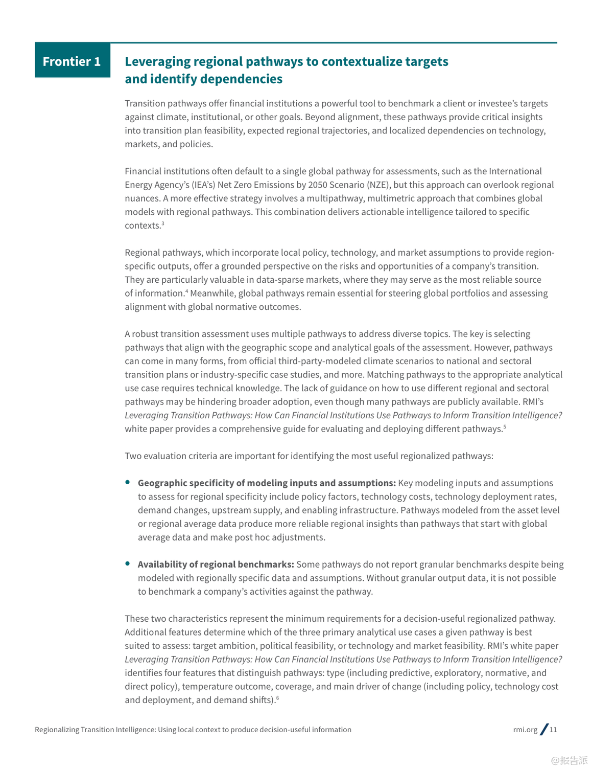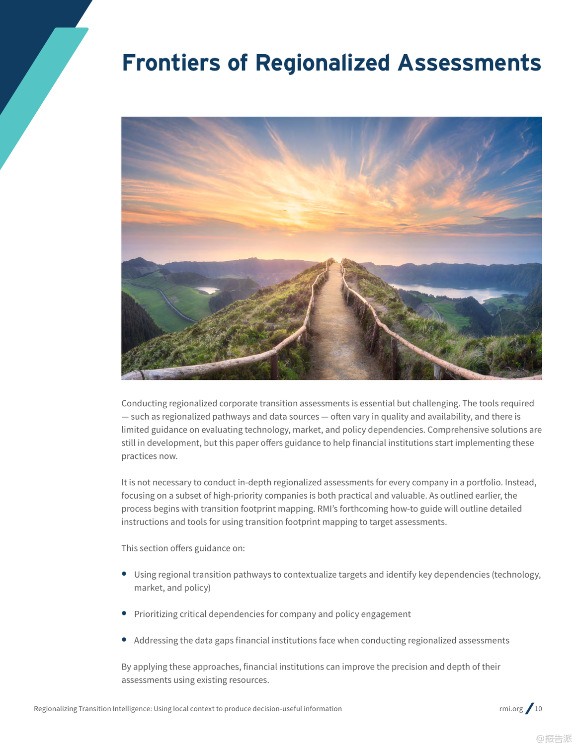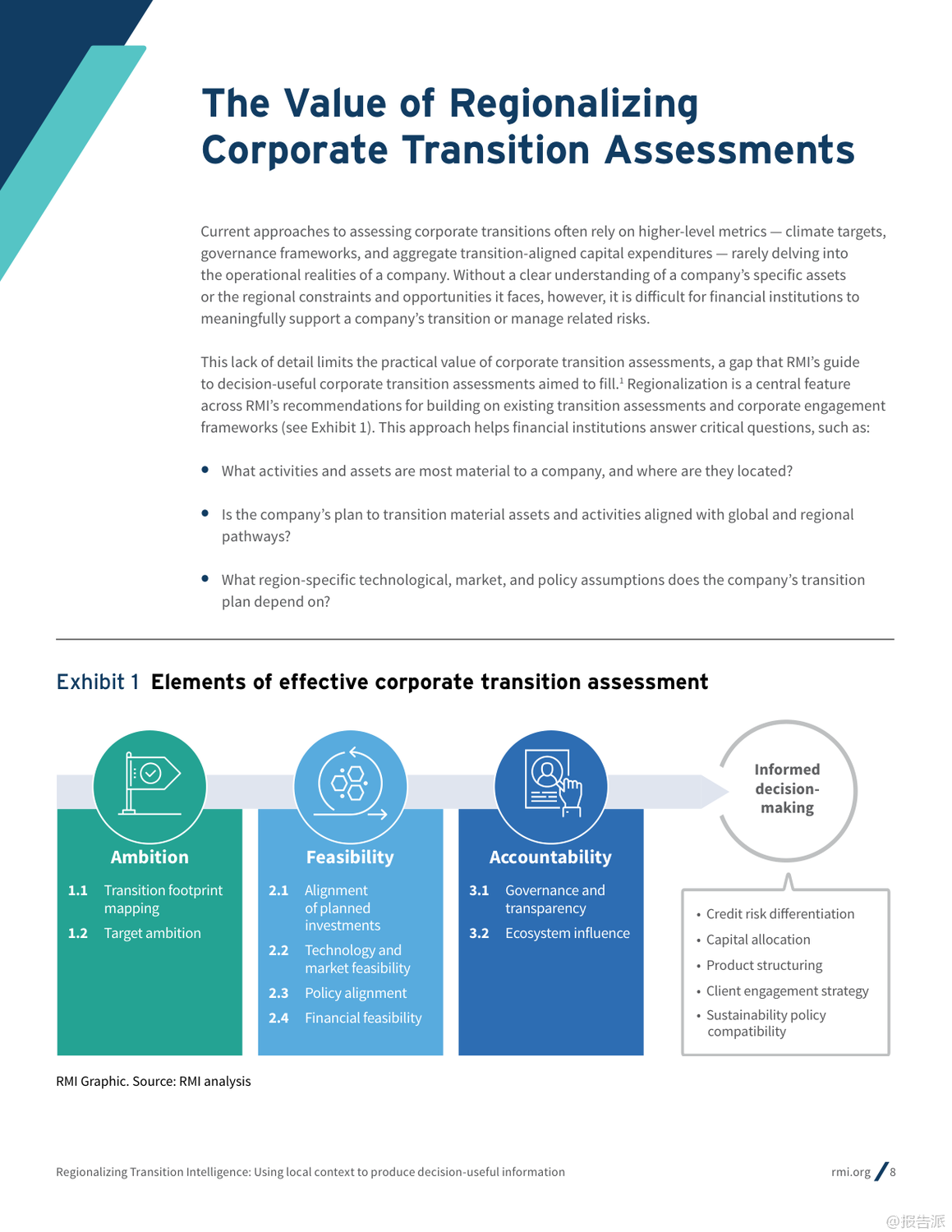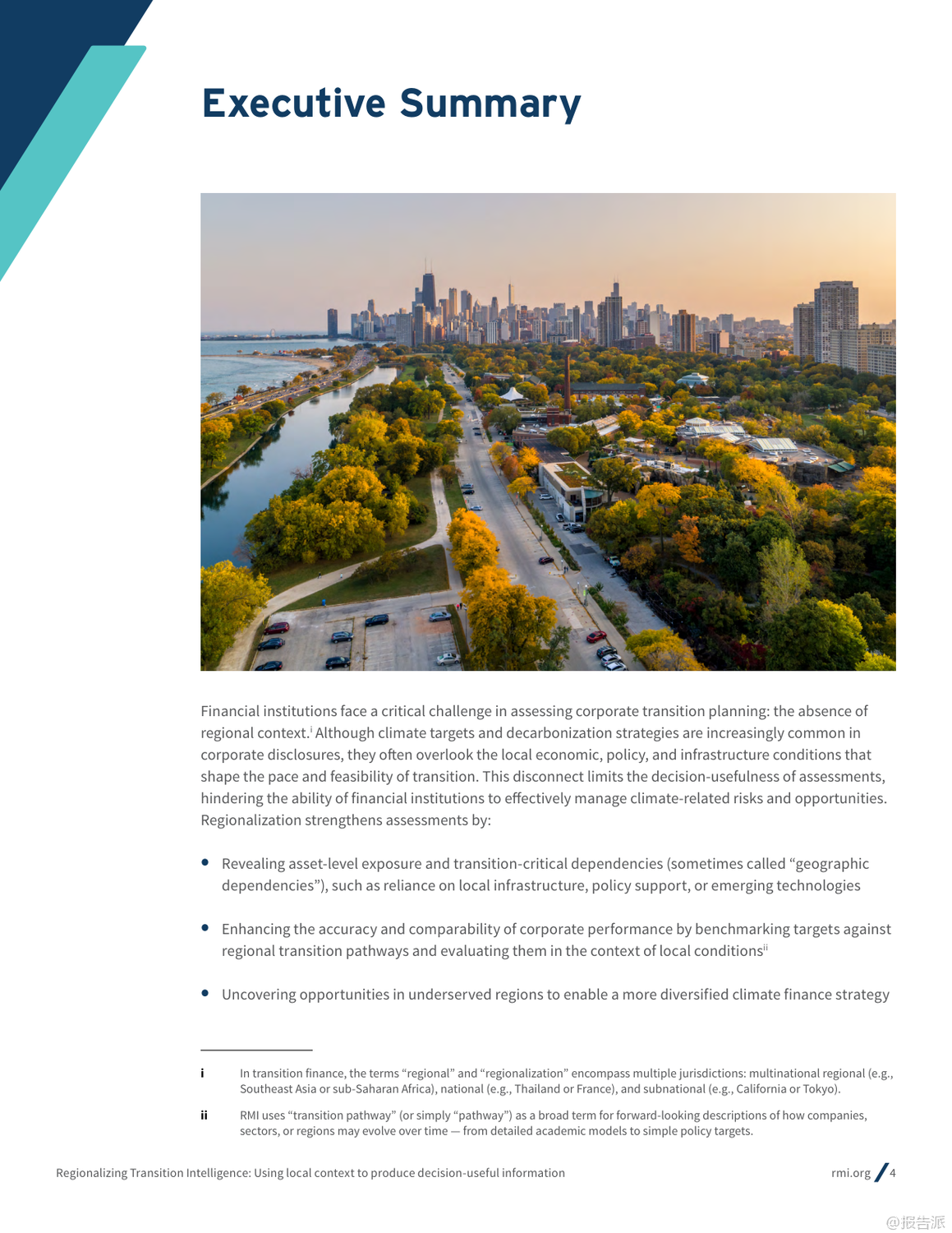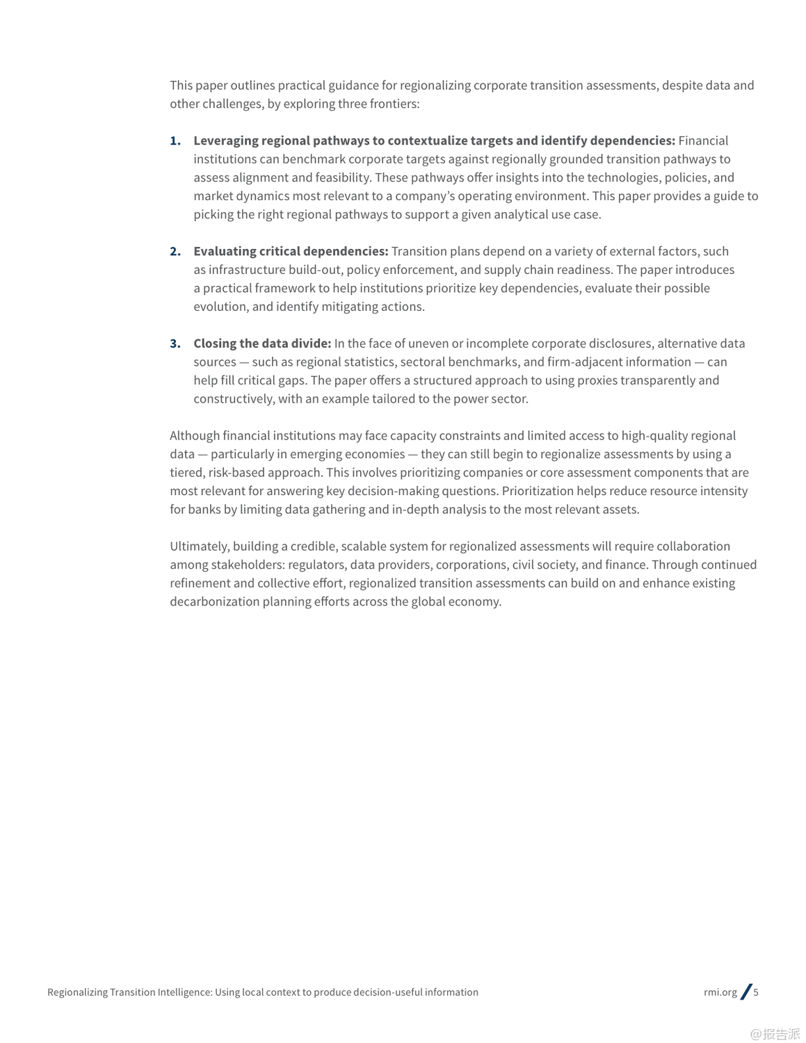 | 在全球加速推进碳中和目标的背景下,金融机构在支持企业绿色转型过程中面临一个核心挑战:如何将企业的脱碳计划置于真实的区域环境中进行评估。 这份由落基山研究所(RMI)发布的《区域化转型情报》报告指出,当前多数企业披露的气候目标缺乏对本地政策、基础设施、技术条件等关键因素的考量,导致金融风险判断失真、投资决策脱离实际。 报告提出,必须通过“区域化”方式重构企业转型评估体系,才能真正提升决策的有效性。 所谓“区域化”,是指将跨国、国家及次国家级别的经济、政策与技术现实纳入评估框架,避免简单套用全球统一模型带来的误判。 为此,报告系统梳理了三大实践前沿:第一,利用区域性转型路径校准企业目标。 报告强调,不能仅依赖国际能源署(IEA)的全球净零情景(NZE)来衡量企业雄心。 例如,一家日本电力公司计划到2030年实现400gCO₂/kWh的排放强度,虽远高于IEA NZE标准(≤100gCO₂/kWh),但若结合日本本国的国家自主贡献(NDC)和东盟政策展望(APS)来看,其目标反而具备高度可行性与政策协同性。 这说明,区域性路径能更真实反映企业在地运营的实际约束与机遇。 第二,识别并管理关键依赖关系。 所有企业转型都依赖外部条件,如氢能基础设施建设、可持续航空燃料(SAF)供应链成熟度、电网扩容进度等。 报告构建了一个三步评估框架:优先级排序、时间演化预测、企业可控性分析。 以欧盟航空公司为例,其SAF战略高度依赖ReFuelEU法规下的燃料供应网络建设,而单个航司对此类基础设施影响有限,因此构成重大外部风险,需提前预警并推动多方协作。 第三,弥合数据鸿沟。 尤其在新兴市场,企业披露往往不完整。 报告建议采用替代数据填补空白,包括政府规划文件、行业平均值、第三方数据库等。 例如,拉美某电力公司未公开具体清洁能源装机目标,但通过整合公开项目清单与区域发电效率数据,可推算其清洁电力供给仅能满足未来需求增长的一半,从而揭示其减排目标缺乏可信支撑。 总体而言,该报告呼吁金融机构采取分层、风险导向的方法,优先聚焦高影响力企业与关键资产,借助区域化工具提升评估精度。 长远看,建立完善的区域数据生态系统需要监管机构、企业、研究组织与资本市场的共同投入。 唯有如此,绿色金融才能从口号走向精准落地,真正驱动全球公正且可行的能源转型进程。 出品方:落基山研究所 发布时间:2025年 文档页数:31页