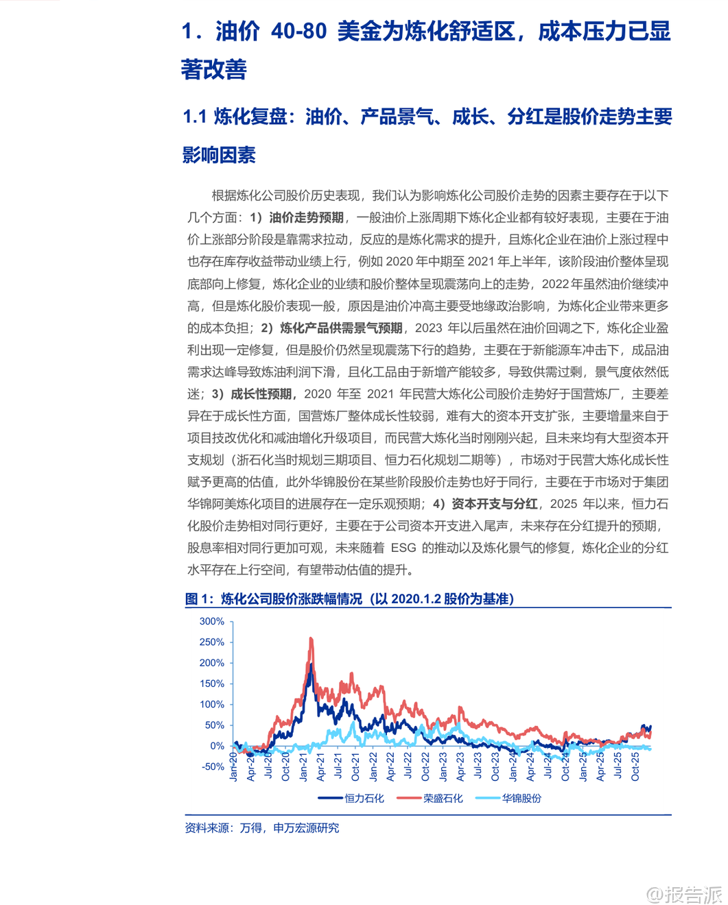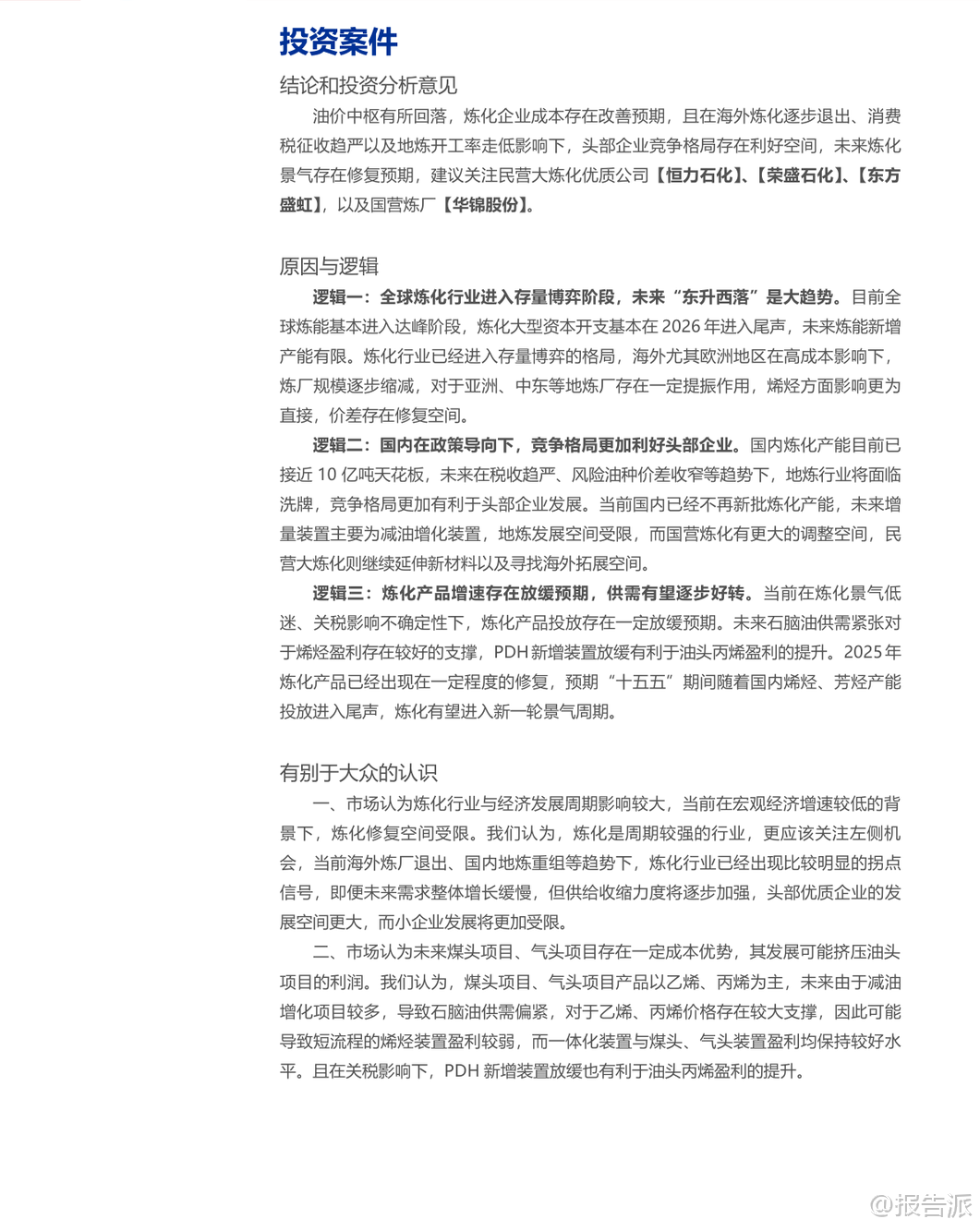 | 在2025年末,申万宏源发布了一份关于炼化行业的深度研究报告,全面剖析了当前行业所处的周期位置、未来发展趋势以及投资机会。 报告指出,炼化行业正站在新一轮景气周期的起点,成本端压力显著缓解,供需格局有望持续改善,头部企业将迎来发展机遇。 首先,从成本角度看,原油价格已回归至40-80美元/桶的“舒适区间”,这一价位既避免了高油价带来的成本冲击,又能在需求回升时带来库存收益,有利于炼化企业盈利修复。 OPEC+联盟逐步恢复产能,叠加非OPEC国家如美国、加拿大、巴西等产量持续增长,全球原油供应趋于宽松,支撑油价中枢维持中性水平。 此外,VLCC运费和沙特官价(OSP)等附加成本也趋于稳定或回落,进一步减轻了炼厂的成本负担。 其次,全球炼能格局呈现“东升西落”的鲜明特征。 以中国、印度为代表的东方国家正大力发展一体化、复杂度高的超级炼厂,满足本地能源安全与化工品需求。 而欧美地区则因设施老旧、维护成本高、碳排放压力大等原因,炼能持续萎缩,部分炼厂面临退出。 这种结构性变化为亚洲炼厂创造了更有利的外部环境,尤其在烯烃等化工品领域,海外产能退出将直接利好国内龙头企业,提升其市场份额和议价能力。 在国内层面,炼化行业正经历深刻的供给侧改革。 一方面,国内炼油总产能已接近10亿吨的“天花板”,新增炼油项目受到严格限制,行业进入存量博弈阶段。 另一方面,“减油增化”成为明确政策导向。 随着新能源车渗透率提升,汽油消费见顶;天然气重卡发展挤压柴油市场,成品油需求整体达峰。 在此背景下,炼厂必须向产业链下游延伸,增加乙烯、丙烷、芳烃等化工品产出,以提升附加值。 同时,消费税征收趋严和对落后产能的淘汰,加速了地炼行业的洗牌,开工率下滑,竞争力弱的小企业逐步退出,资源向恒力石化、荣盛石化、东方盛虹等头部民营大炼化和华锦股份等国营炼厂集中,行业集中度和竞争格局显著优化。 具体到细分产品,报告认为不同品类的景气度修复空间各异。 成品油方面,尽管短期受地炼开工率下降影响价差有所修复,但中长期需求萎缩趋势难改。 烯烃方面,新增供给增速放缓,尤其是PDH(丙烷脱氢)装置受关税等因素影响投放进度可能延迟,叠加石脑油供需偏紧,油头路线的盈利有望得到支撑和修复。 芳烃方面,受调油需求减弱影响,PX和纯苯的景气一度低迷,目前盈利基本触底。 未来随着PTA等下游行业资本开支周期结束,需求趋于稳定,而新增PX产能主要来自大型炼化项目,供给增长有限,芳烃板块有望迎来景气回升。 报告特别强调了头部企业的竞争优势和投资价值。 这些企业普遍具备三大优势:一是拥有先进的炼化一体化装置,抗风险能力强,产品结构更偏向高附加值的化工品而非油品;二是大规模资本开支高峰已过,未来将进入收获期,现金流充沛,分红能力和股息率有望提升;三是积极布局新材料、出海合作等第二增长曲线。 例如,恒力石化在可降解塑料、高性能膜材料等领域布局领先,ROE水平行业居首;荣盛石化与沙特阿美深度合作,不仅保障了原油供应,更打开了国际化发展空间;东方盛虹凭借国内最大的光伏级EVA产能,在新能源赛道占据有利地位。 综上所述,该报告认为,炼化行业已度过最困难时期,成本压力缓解、供需格局改善、行业集中度提升等多重利好因素叠加,行业正蓄势待发。 尽管面临宏观经济下行和全球需求不确定性的风险,但头部企业凭借其规模、技术和产业链优势,有望率先迎来业绩和估值的双重修复,是当前值得关注的投资方向。 本文由【报告派】研读,输出观点仅作为行业分析! 原文标题:原文标题:2025-12-30-申万宏源-炼化行业深度报告:成本及供需格局存在改善预期,炼化行业蓄势待发 发布时间:2025年 报告出品方:申万宏源 文档页数:54页