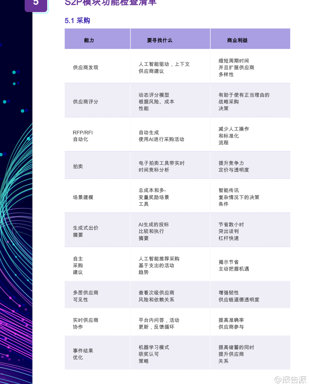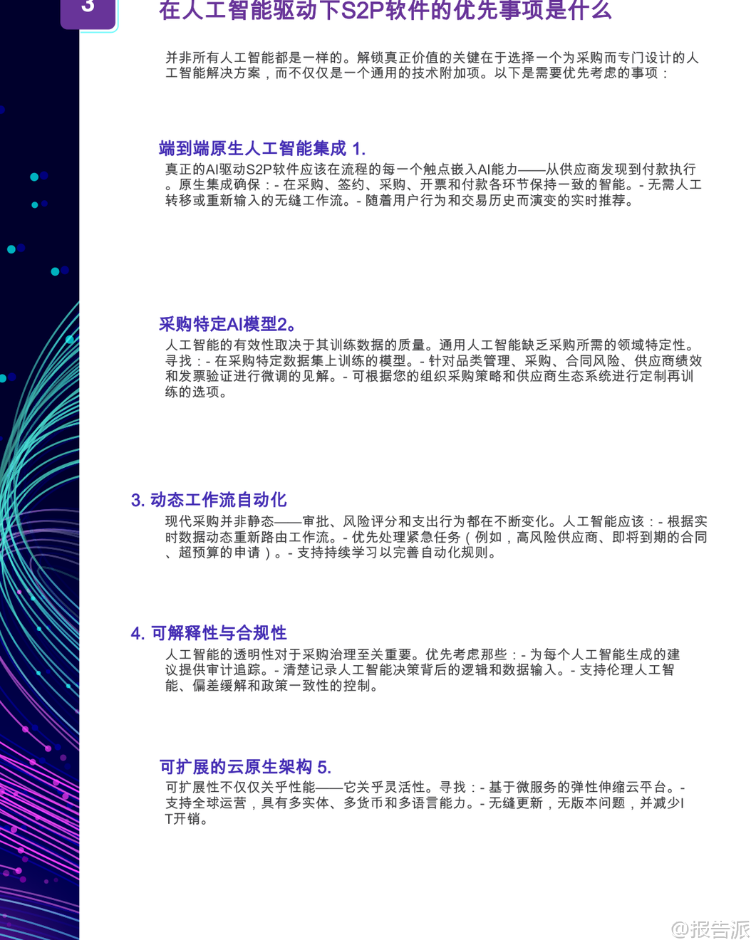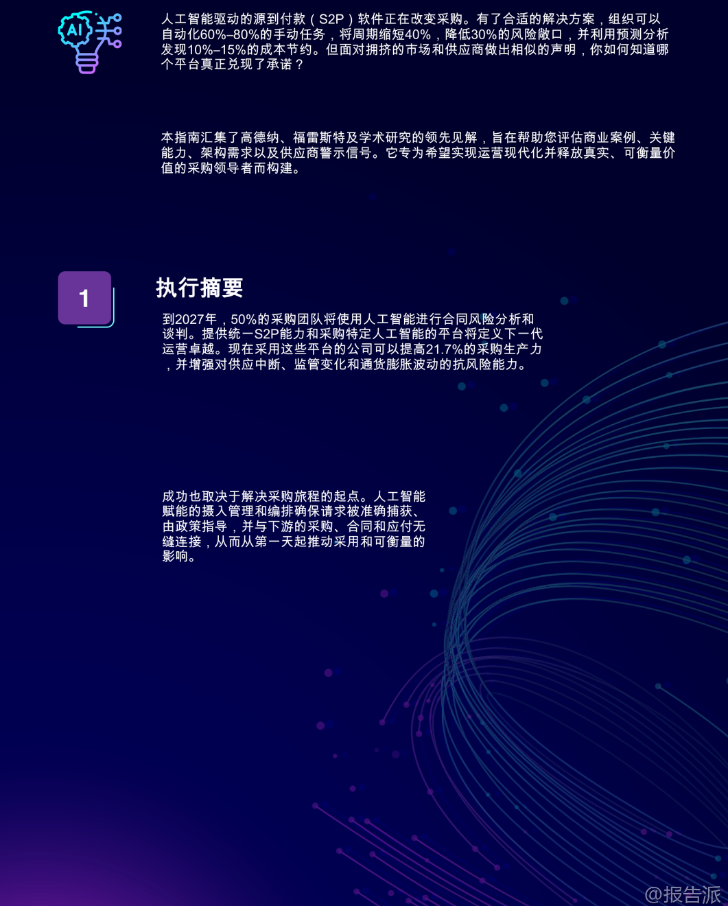 | 人工智能驱动的源到付款(S2P)采购软件正在重塑全球企业的采购运营模式。 根据GEP发布的《人工智能行业终极购买指南:人工智能支付采购软件》,到2027年,全球将有50%的采购团队采用人工智能进行合同风险分析与谈判决策。 这一趋势标志着采购职能从传统的成本控制角色,向战略价值创造和供应链韧性建设的核心转变。 本报告指出,真正具备竞争力的人工智能S2P平台并非简单的技术叠加,而是深度融合采购业务逻辑、数据架构与自动化能力的统一系统。 领先企业通过部署原生AI集成的S2P解决方案,已实现60%-80%的手动任务自动化,采购周期缩短40%,风险敞口降低30%,并挖掘出10%-15%的成本节约潜力。 这些成果的背后,是AI在需求捕获、流程编排、合同管理、发票处理及供应商风险管理等环节的深度渗透。 报告强调,企业在选型时应警惕“伪AI”陷阱——即仅在部分模块嵌入通用人工智能模型的拼凑式产品。 真正的价值来源于为采购领域专门训练的AI模型,结合端到端原生集成、可解释性、动态工作流和强大数据基础的四大核心能力。 例如,基于采购特定数据集训练的AI,在供应商评分、合同条款识别、异常检测等方面展现出远超通用模型的准确率和实用性。 在功能层面,报告详细拆解了AI赋能的七大S2P模块:采购、合同、采购执行、发票与应付款项、分析、供应商管理和类别管理。 每个模块均需具备AI原生支持。 以合同管理为例,AI不仅能自动识别高风险条款、生成标准化法律文本,还能通过历史谈判数据优化策略,并对即将到期或未履约的合同发出智能预警,显著提升合规性与执行效率。 对于间接物料采购,AI的关键作用体现在尾端支出控制、目录治理和引导式购买体验上。 通过自然语言处理(NLP),用户可用日常语言提交采购请求,系统自动匹配预算、政策与供应商,极大提升非专业用户的采纳率。 而在直接材料采购场景中,AI则深入BOM层级采购、原材料价格波动预测、多层供应链可见性与制造/外购决策支持,助力企业应对复杂供应链挑战。 报告特别指出,成功的AI采购转型不仅依赖技术本身,更取决于平台背后的供应商实力。 评估维度包括分析师认可度(如Gartner、Forrester)、行业相关性、客户成功案例、创新路线图以及长期所有权结构。 企业应优先选择在制造业、能源、医疗等垂直领域有深厚积累的供应商,确保解决方案具备行业适配性。 在架构设计上,云原生、微服务、多语言多币种支持成为标配。 平台需具备实时同步能力,与SAP、Oracle、Workday等主流ERP系统无缝对接,并兼容Kafka、REST API等事件驱动集成方式。 同时,LLM兼容性成为新焦点,允许企业在不同大模型间切换,避免厂商锁定,保持技术前瞻性。 数据基础是AI效能的基石。 报告建议平台必须具备统一数据模型、主数据管理(MDM)工具、结构化与非结构化数据摄入能力(如PDF、邮件),以及内置的数据清洗、分类与富集功能。 只有高质量、跨系统的数据流动,才能支撑起精准的预测分析与自动化决策。 然而,市场中仍存在诸多危险信号需警惕:高度依赖定制开发的集成方案、缺乏透明AI决策逻辑、无实际客户案例验证、封闭且不灵活的许可模式、上线后支持薄弱等。 这些问题往往导致项目延期、ROI不及预期甚至失败。 实施路径方面,报告倡导敏捷方法论,配合专业PMO支持、分阶段上线与持续变革管理。 上线后的 Adoption Metrics 跟踪、用户培训与专属成功经理服务,对最大化投资回报至关重要。 此外,治理与可审计性不容忽视,AI审计追踪、版本控制、活动日志等功能必须完备,以满足SOX等合规要求。 展望未来,生成式AI将成为竞争分水岭。 领先的平台已在探索AI辅助谈判、提示工程驱动的寻源策略生成、自主采购代理等前沿应用。 企业若能在当下布局具备清晰AI路线图的合作伙伴,将率先构建智能化采购护城河。 正如高德纳所言:“领导者今日执行,明日创新。 ” AI驱动的S2P平台不再是未来构想,而是当下重塑采购竞争力的关键基础设施。 选择一个真正为采购而生、兼具技术深度与行业理解的统一平台,将成为企业提升生产力21.7%、增强抗风险能力的战略支点。 本文由【报告派】研读,输出观点仅作为行业分析! 原文标题:原文标题:2025-12-31-GEP-人工智能行业终极购买指南:人工智能支付采购软件(英译中) 发布时间:2025年 报告出品方:GEP 文档页数:22页