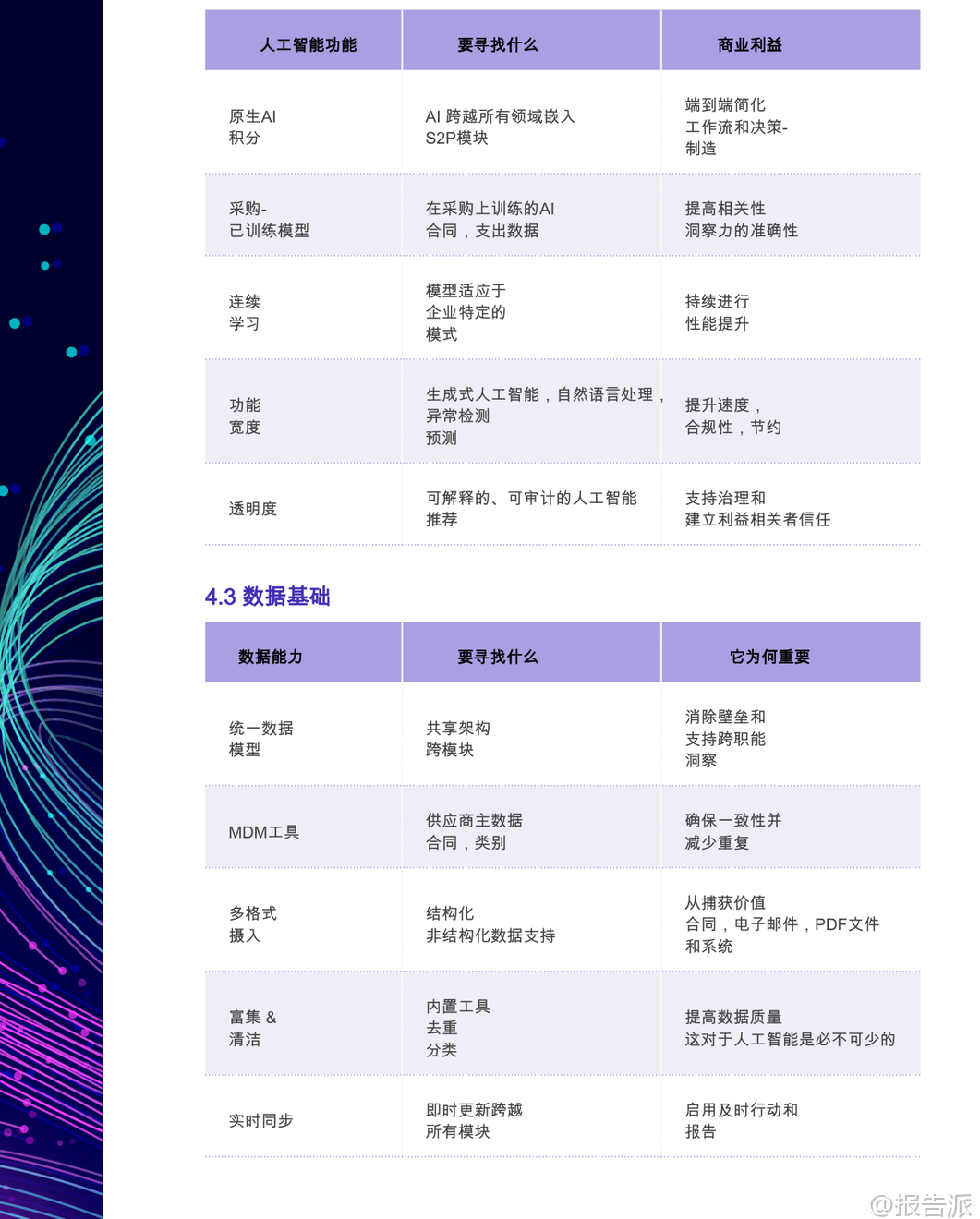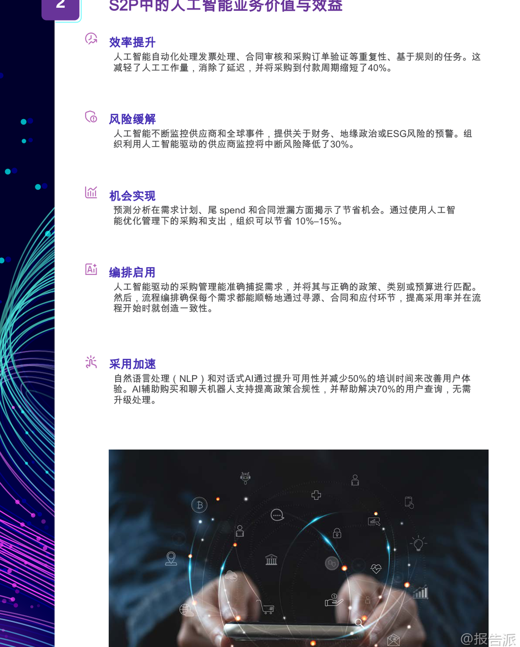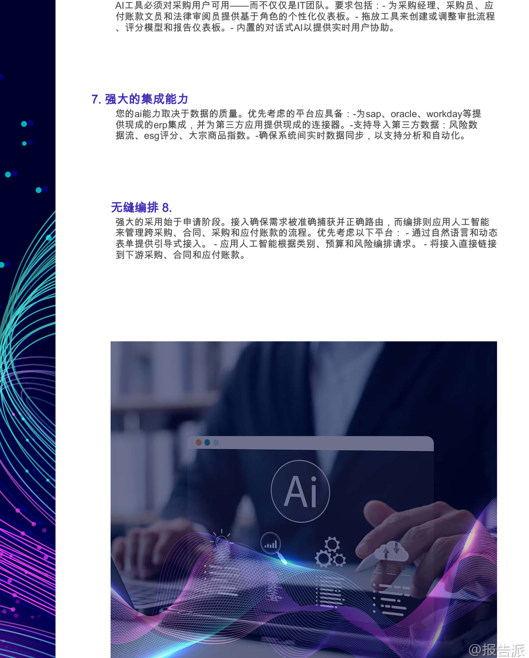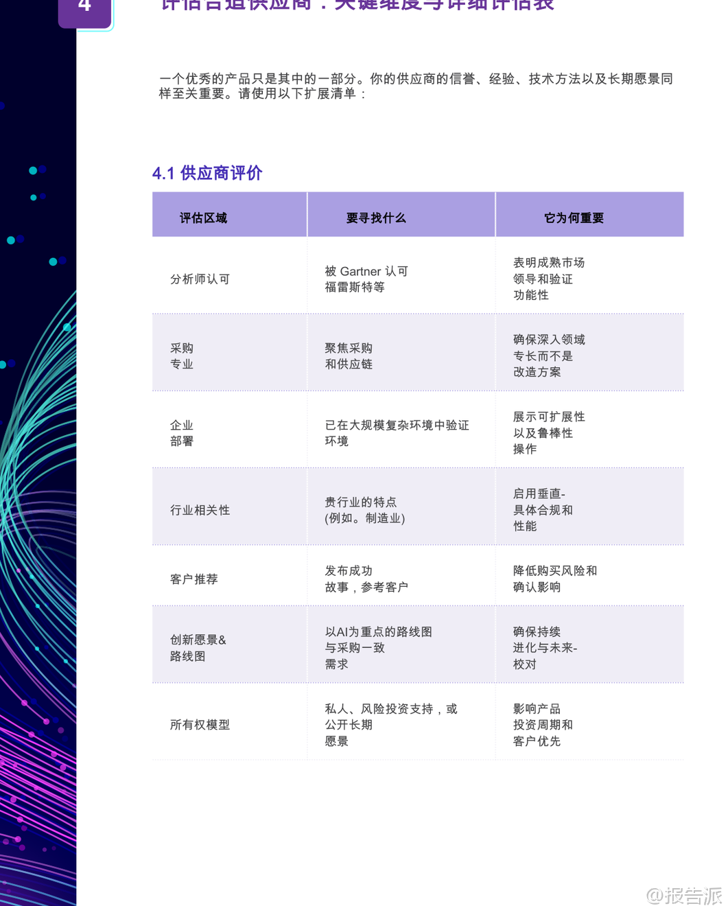 | 人工智能驱动的源到付款(S2P)采购软件正在重塑全球企业的采购运营模式。 根据GEP发布的《人工智能行业终极购买指南:人工智能支付采购软件》,到2027年,全球将有50%的采购团队采用人工智能进行合同风险分析与谈判决策。 这一趋势标志着采购职能从传统的成本控制角色,向战略价值创造和供应链韧性建设的核心转变。 本报告指出,真正具备竞争力的人工智能S2P平台并非简单的技术叠加,而是深度融合采购业务逻辑、数据架构与自动化能力的统一系统。 领先企业通过部署原生AI集成的S2P解决方案,已实现60%-80%的手动任务自动化,采购周期缩短40%,风险敞口降低30%,并挖掘出10%-15%的成本节约潜力。 这些成果的背后,是AI在需求捕获、流程编排、合同管理、发票处理及供应商风险管理等环节的深度渗透。 报告强调,企业在选型时应警惕“伪AI”陷阱——即仅在部分模块嵌入通用人工智能模型的拼凑式产品。 真正的价值来源于为采购领域专门训练的AI模型,结合端到端原生集成、可解释性、动态工作流和强大数据基础的四大核心能力。 例如,基于采购特定数据集训练的AI,在供应商评分、合同条款识别、异常检测等方面展现出远超通用模型的准确率和实用性。 在功能层面,报告详细拆解了AI赋能的七大S2P模块:采购、合同、采购执行、发票与应付款项、分析、供应商管理和类别管理。 每个模块均需具备AI原生支持。 以合同管理为例,AI不仅能自动识别高风险条款、生成标准化法律文本,还能通过历史谈判数据优化策略,并对即将到期或未履约的合同发出智能预警,显著提升合规性与执行效率。 对于间接物料采购,AI的关键作用体现在尾端支出控制、目录治理和引导式购买体验上。 通过自然语言处理(NLP),用户可用日常语言提交采购请求,系统自动匹配预算、政策与供应商,极大提升非专业用户的采纳率。 而在直接材料采购场景中,AI则深入BOM层级采购、原材料价格波动预测、多层供应链可见性与制造/外购决策支持,助力企业应对复杂供应链挑战。 报告特别指出,成功的AI采购转型不仅依赖技术本身,更取决于平台背后的供应商实力。 评估维度包括分析师认可度(如Gartner、Forrester)、行业相关性、客户成功案例、创新路线图以及长期所有权结构。 企业应优先选择在制造业、能源、医疗等垂直领域有深厚积累的供应商,确保解决方案具备行业适配性。 在架构设计上,云原生、微服务、多语言多币种支持成为标配。 平台需具备实时同步能力,与SAP、Oracle、Workday等主流ERP系统无缝对接,并兼容Kafka、REST API等事件驱动集成方式。 同时,LLM兼容性成为新焦点,允许企业在不同大模型间切换,避免厂商锁定,保持技术前瞻性。 数据基础是AI效能的基石。 报告建议平台必须具备统一数据模型、主数据管理(MDM)工具、结构化与非结构化数据摄入能力(如PDF、邮件),以及内置的数据清洗、分类与富集功能。 只有高质量、跨系统的数据流动,才能支撑起精准的预测分析与自动化决策。 然而,市场中仍存在诸多危险信号需警惕:高度依赖定制开发的集成方案、缺乏透明AI决策逻辑、无实际客户案例验证、封闭且不灵活的许可模式、上线后支持薄弱等。 这些问题往往导致项目延期、ROI不及预期甚至失败。 实施路径方面,报告倡导敏捷方法论,配合专业PMO支持、分阶段上线与持续变革管理。 上线后的 Adoption Metrics 跟踪、用户培训与专属成功经理服务,对最大化投资回报至关重要。 此外,治理与可审计性不容忽视,AI审计追踪、版本控制、活动日志等功能必须完备,以满足SOX等合规要求。 展望未来,生成式AI将成为竞争分水岭。 领先的平台已在探索AI辅助谈判、提示工程驱动的寻源策略生成、自主采购代理等前沿应用。 企业若能在当下布局具备清晰AI路线图的合作伙伴,将率先构建智能化采购护城河。 正如高德纳所言:“领导者今日执行,明日创新。 ” AI驱动的S2P平台不再是未来构想,而是当下重塑采购竞争力的关键基础设施。 选择一个真正为采购而生、兼具技术深度与行业理解的统一平台,将成为企业提升生产力21.7%、增强抗风险能力的战略支点。 本文由【报告派】研读,输出观点仅作为行业分析! 原文标题:原文标题:2025-12-31-GEP-人工智能行业终极购买指南:人工智能支付采购软件(英译中) 发布时间:2025年 报告出品方:GEP 文档页数:22页