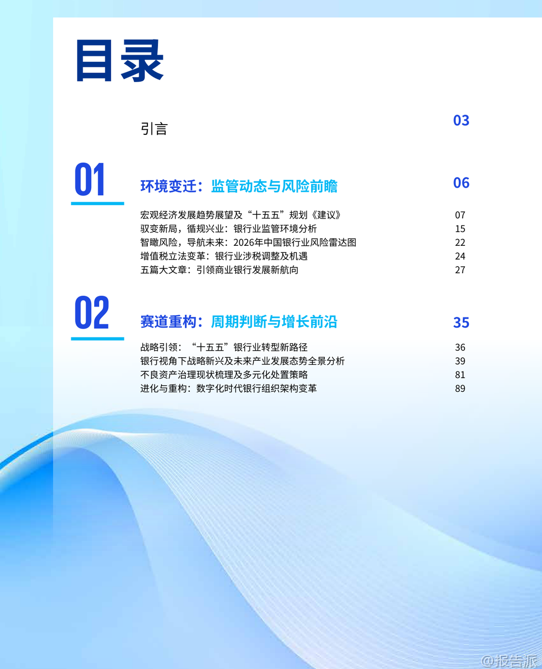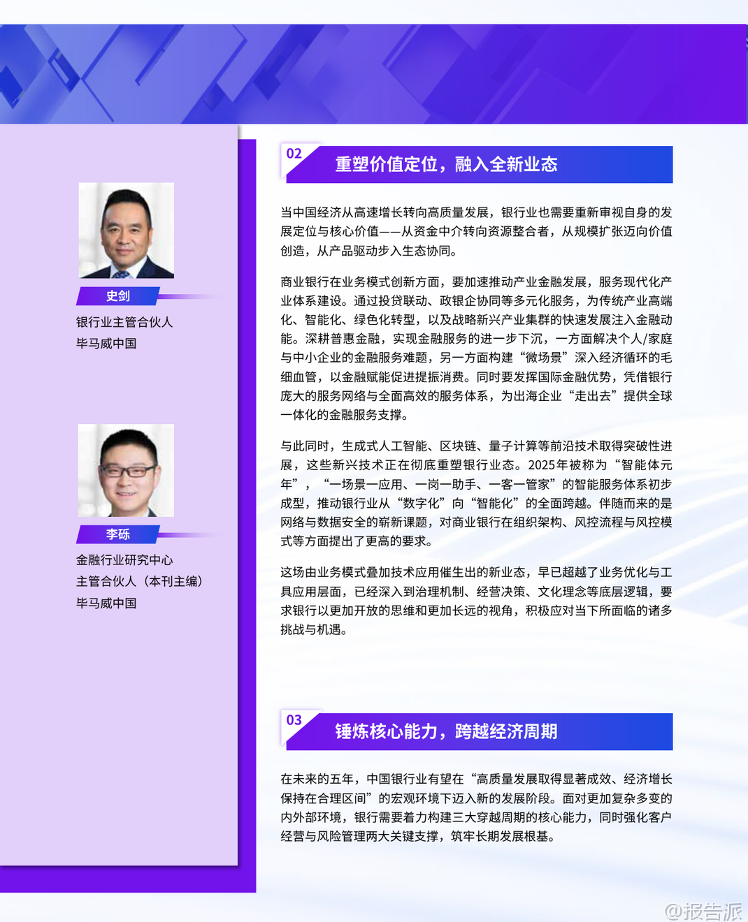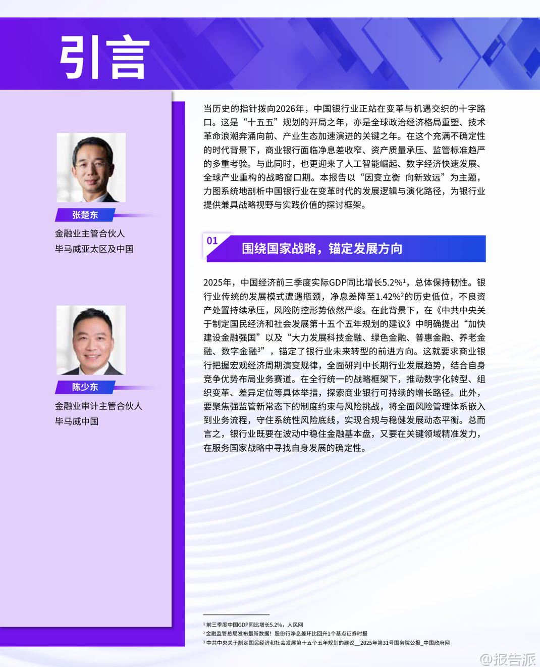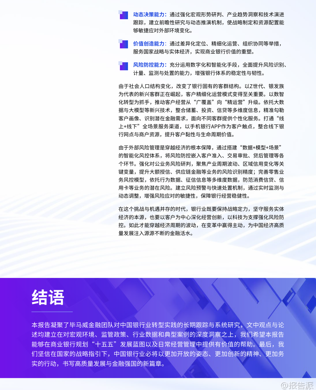 | 2026年是中国“十五五”规划的开局之年,也是中国银行业面临深刻变革与战略转型的关键节点。 毕马威发布的《2026年中国银行业展望报告》以“因变立衡,向新致远”为主题,系统剖析了当前银行业所处的宏观环境、监管动态、风险挑战及未来发展方向。 在宏观经济层面,2025年中国经济保持韧性,前三季度GDP同比增长5.2%,但经济运行呈现“前高后低”特征,消费、地产等内需领域出现放缓迹象。 与此同时,银行业传统发展模式遭遇瓶颈,净息差降至1.42%的历史低位,资产质量承压,盈利空间收窄。 在此背景下,“十五五”规划明确提出“加快建设金融强国”以及大力发展科技金融、绿色金融、普惠金融、养老金融、数字金融的“五篇大文章”,为银行业发展锚定了新航向。 监管环境持续趋严且精细化。 2025年以来,监管部门已发布百余项新规,覆盖信贷、资管、公司治理、数据安全等多个领域。 监管处罚力度显著加大,全年罚没金额超21亿元,个人问责比例上升,反映出监管从合规底线到治理效能的全面强化。 国际监管亦呈现“趋严”与“松绑”并存态势,巴塞尔III在全球范围内推进,气候相关金融风险监管加速制度化,加密资产监管则呈现明显分化,对银行跨境合规能力提出更高要求。 面对复杂环境,银行业正经历赛道重构与战略引领的双重转型。 报告指出,未来五年银行业将从“规模扩张”转向“质量优先”。 八大发展趋势包括:行业分化加剧,部分中小银行可能通过兼并重组退出市场;经营模式走向专业化、精细化经营;加大对AI和数字化的投入,重塑服务模式;优化收入结构,中间业务成为核心增长引擎;加快国际化步伐,服务中国企业出海;信贷投放更聚焦实体经济,重点支持科技创新与战略性新兴产业;绿色金融和养老金融释放巨大需求;风险定价能力成为核心竞争力。 在产业金融方面,银行角色正从“资金提供者”转变为“资源整合者”。 报告强调,银行需深度融入现代化产业体系,服务新能源、新材料、航空航天、低空经济等战略性新兴产业,并前瞻性布局量子科技、生物制造、氢能等未来产业。 通过对公风控大底盘建设,构建覆盖客户准入、尽调、审批、贷后的全流程标准化风控体系,提升对科创企业等新型客群的风险识别与管理能力。 客户经营也进入精耕时代。 零售端,银行需从“外求规模”转向“内观精耕”,通过OGSM目标管理工具和全渠道运营体系(如APP、远程银行、线下网点、企微),实现存量客户的精准营销与价值挖掘。 对公端,则应建立以客户综合价值为导向的分层经营体系,推行“一户一策”模式,提升综合服务能力。 科技赋能已成为银行转型的核心驱动力。 生成式AI推动2025年被称为“智能体元年”,“一场景一应用、一岗一助手”的智能化服务体系初步成型。 大模型在对公信贷领域的应用趋势显著,涵盖自动生成尽调报告、提炼非标准化数据风险、辅助贷后监测预警等场景。 同时,银行组织架构也在进化,从前中后台分离的科层制向敏捷化、平台化、人机协同的自适应组织演进。 然而,转型之路并非坦途。 银行面临多重挑战:净息差持续收窄压缩利润空间;不良资产处置压力加大,尤其是房地产及上下游产业链;中间业务虽成增长引擎,但受资本市场波动和监管降费影响,增长稳定性不足;数据孤岛、成本核算不清等问题制约精细化管理;复合型人才匮乏限制创新落地。 综上所述,2026年的中国银行业正处于变革与机遇交织的十字路口。 唯有坚守服务实体经济的本源,以客户为中心深化经营创新,以科技为支撑强化风险管理,才能穿越经济周期,在高质量发展的道路上行稳致远,真正实现从“规模银行”向“价值银行”的跃迁。 本文由【报告派】研读,输出观点仅作为行业分析! 原文标题:原文标题:2025-12-31-毕马威-2026年中国银行业展望报告:因变立衡,向新致远 发布时间:2025年 报告出品方:毕马威 文档页数:49页
