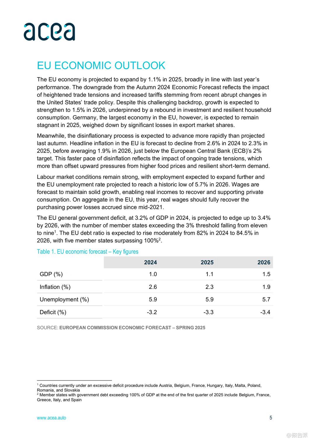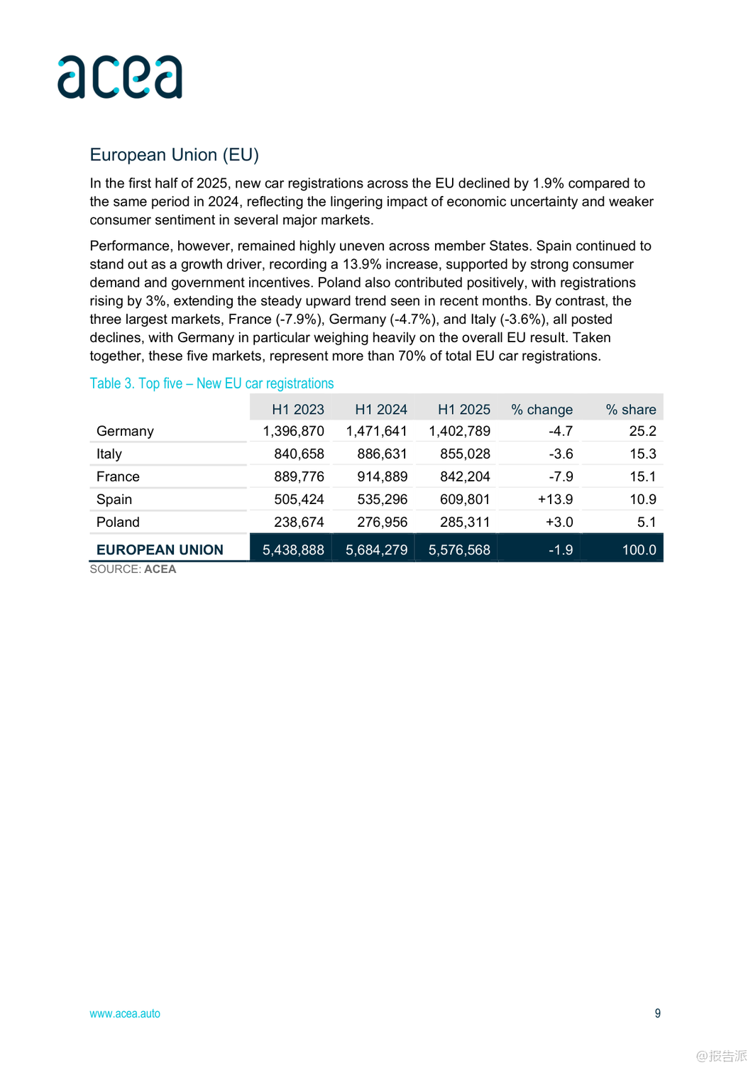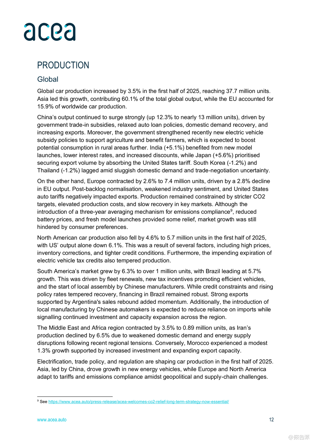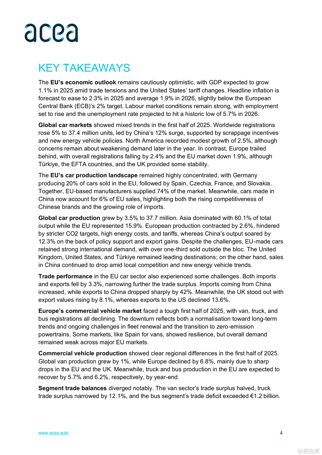 | 2025年上半年,全球及欧盟汽车行业呈现出复杂而分化的复苏态势。 整体来看,全球经济前景谨慎乐观,但区域间表现差异显著,尤其是在汽车生产、注册和贸易方面,中国、北美与欧洲之间的格局正在发生深刻变化。 首先,从宏观经济背景看,欧盟预计2025年GDP增长1.1%,通胀率将回落至2.3%,就业市场保持强劲,失业率有望在2026年降至历史低位5.7%。 然而,德国经济停滞、美国贸易政策变动以及高能源成本等因素持续对欧盟制造业构成压力。 在乘用车市场方面,全球新车注册量达3740万辆,同比增长5%。 中国成为最大增长引擎,注册量猛增12%,主要得益于政府推出的旧车置换补贴和新能源车激励政策。 日本和韩国也实现双位数增长。 相比之下,欧盟市场整体下滑1.9%,其中法国、德国、意大利三大核心市场分别下降7.9%、4.7%和3.6%,仅西班牙(+13.9%)和波兰(+3%)维持正增长。 值得注意的是,混合动力车型在欧盟市场份额已达34.8%,成为主流选择,而纯电动车占比提升至15.6%,显示出电动化转型加速。 生产端,全球汽车产量增长3.5%至3770万辆,亚洲占据60.1%的产能,中国产量同比大增12.3%。 反观欧盟,产量同比下降2.8%,主要受制于更严格的碳排放法规、高企的能源成本和外部需求疲软。 尽管如此,德国逆势增长4.4%,法国和斯洛伐克也实现两位数增长,凸显部分国家竞争力依然强劲。 在贸易层面,欧盟乘用车进出口双双下滑3.3%,但趋势分化明显:进口量增长3.5%,出口量下降5.5%。 来自中国的汽车进口额增长3.7%,数量激增36.2%,已占欧盟进口总量的17.6%;而欧盟对华汽车出口则暴跌42.2%,反映出中国本土品牌崛起带来的激烈竞争。 与此同时,英国仍是欧盟最大出口市场,对英出口增长8.1%,而对美出口下降13.6%。 商用车领域整体承压。 欧盟范围内,新轻型商用车(van)、卡车和客车注册量分别下降13.2%、15.4%和4.4%。 柴油仍主导市场,但电动化进程加快,电动货车市占率达9.5%,电动卡车和电动客车分别升至3.6%和21.6%。 荷兰在电动重卡推广上领先全欧。 总体而言,2025年上半年,中国汽车产业凭借政策支持和出口扩张强势崛起,深刻影响全球供应链格局;欧盟虽面临内需疲软与外部竞争双重挑战,但在高端制造和国际出口方面仍具韧性。 未来,如何应对来自中国的竞争压力、推动绿色转型并稳定外部市场,将是欧盟汽车产业的关键课题。 出品方:ACEA 发布时间:2025年 文档页数:28页