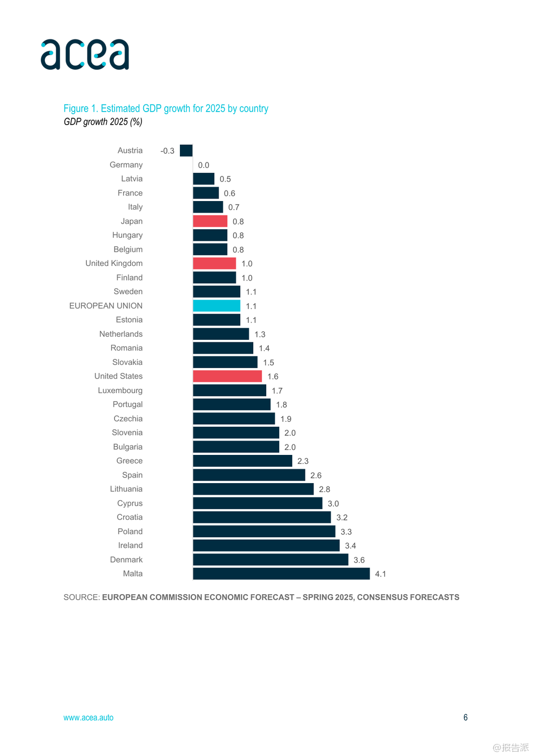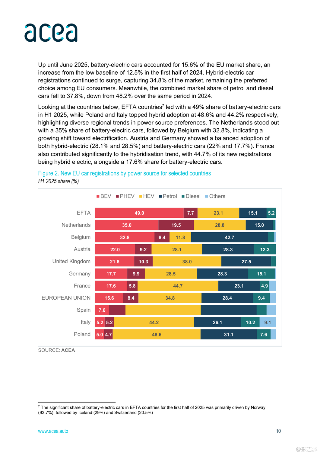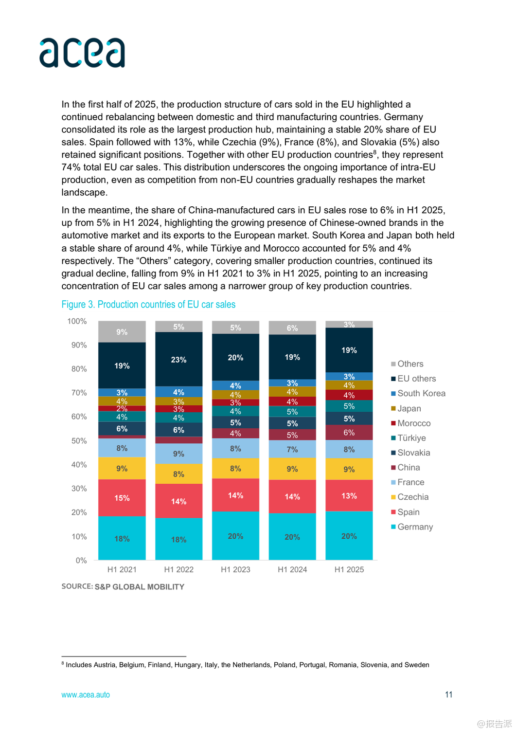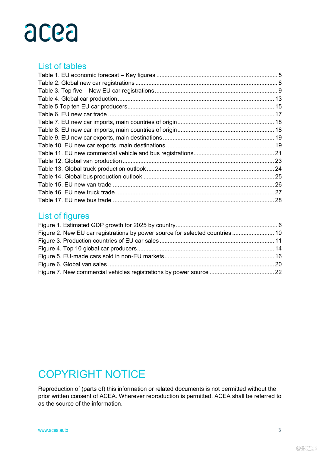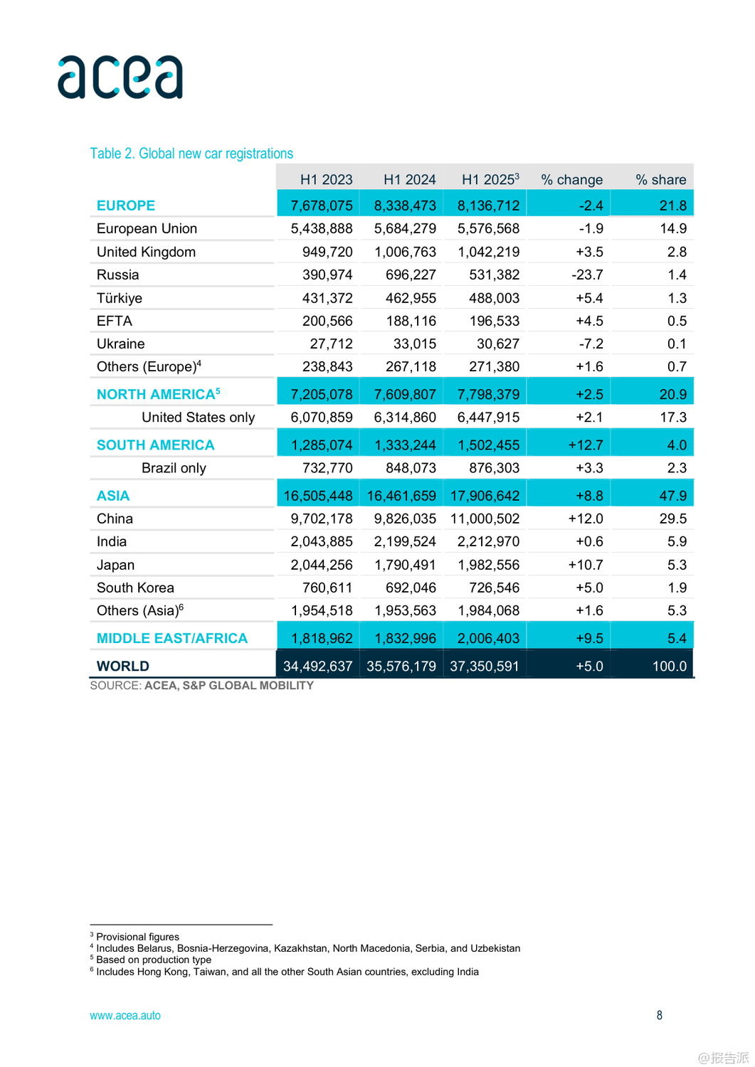 | 2025年上半年,全球及欧盟汽车行业呈现出复杂而分化的复苏态势。 整体来看,全球经济前景谨慎乐观,但区域间表现差异显著,尤其是在汽车生产、注册和贸易方面,中国、北美与欧洲之间的格局正在发生深刻变化。 首先,从宏观经济背景看,欧盟预计2025年GDP增长1.1%,通胀率将回落至2.3%,就业市场保持强劲,失业率有望在2026年降至历史低位5.7%。 然而,德国经济停滞、美国贸易政策变动以及高能源成本等因素持续对欧盟制造业构成压力。 在乘用车市场方面,全球新车注册量达3740万辆,同比增长5%。 中国成为最大增长引擎,注册量猛增12%,主要得益于政府推出的旧车置换补贴和新能源车激励政策。 日本和韩国也实现双位数增长。 相比之下,欧盟市场整体下滑1.9%,其中法国、德国、意大利三大核心市场分别下降7.9%、4.7%和3.6%,仅西班牙(+13.9%)和波兰(+3%)维持正增长。 值得注意的是,混合动力车型在欧盟市场份额已达34.8%,成为主流选择,而纯电动车占比提升至15.6%,显示出电动化转型加速。 生产端,全球汽车产量增长3.5%至3770万辆,亚洲占据60.1%的产能,中国产量同比大增12.3%。 反观欧盟,产量同比下降2.8%,主要受制于更严格的碳排放法规、高企的能源成本和外部需求疲软。 尽管如此,德国逆势增长4.4%,法国和斯洛伐克也实现两位数增长,凸显部分国家竞争力依然强劲。 在贸易层面,欧盟乘用车进出口双双下滑3.3%,但趋势分化明显:进口量增长3.5%,出口量下降5.5%。 来自中国的汽车进口额增长3.7%,数量激增36.2%,已占欧盟进口总量的17.6%;而欧盟对华汽车出口则暴跌42.2%,反映出中国本土品牌崛起带来的激烈竞争。 与此同时,英国仍是欧盟最大出口市场,对英出口增长8.1%,而对美出口下降13.6%。 商用车领域整体承压。 欧盟范围内,新轻型商用车(van)、卡车和客车注册量分别下降13.2%、15.4%和4.4%。 柴油仍主导市场,但电动化进程加快,电动货车市占率达9.5%,电动卡车和电动客车分别升至3.6%和21.6%。 荷兰在电动重卡推广上领先全欧。 总体而言,2025年上半年,中国汽车产业凭借政策支持和出口扩张强势崛起,深刻影响全球供应链格局;欧盟虽面临内需疲软与外部竞争双重挑战,但在高端制造和国际出口方面仍具韧性。 未来,如何应对来自中国的竞争压力、推动绿色转型并稳定外部市场,将是欧盟汽车产业的关键课题。 出品方:ACEA 发布时间:2025年 文档页数:28页