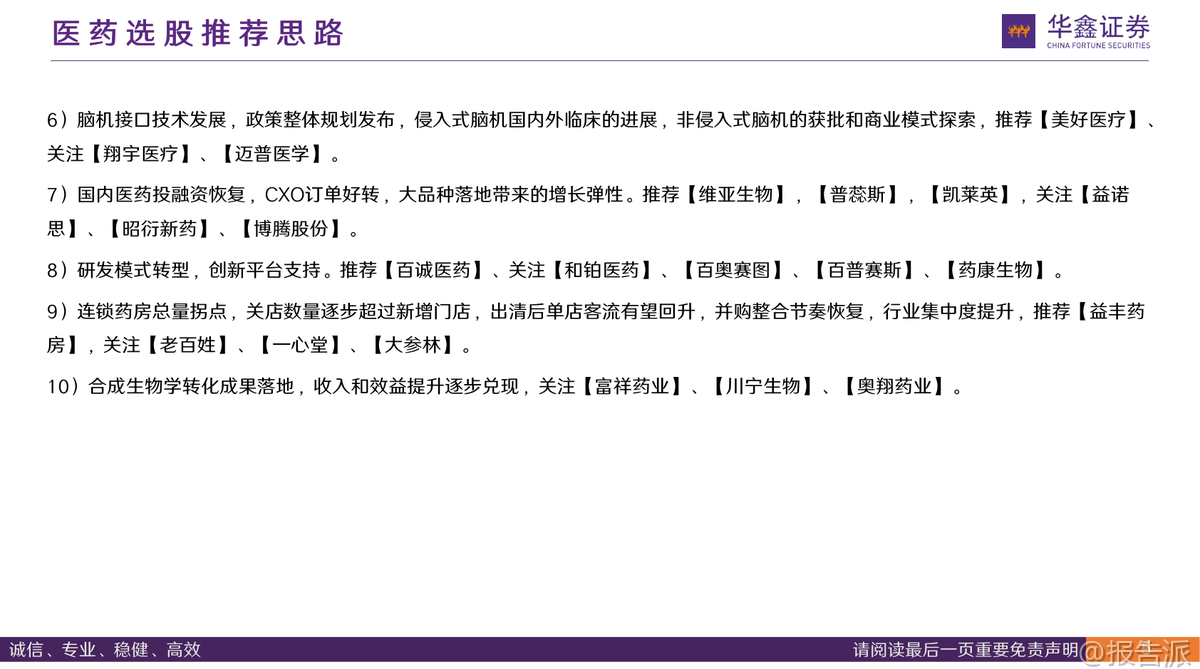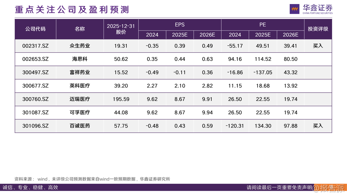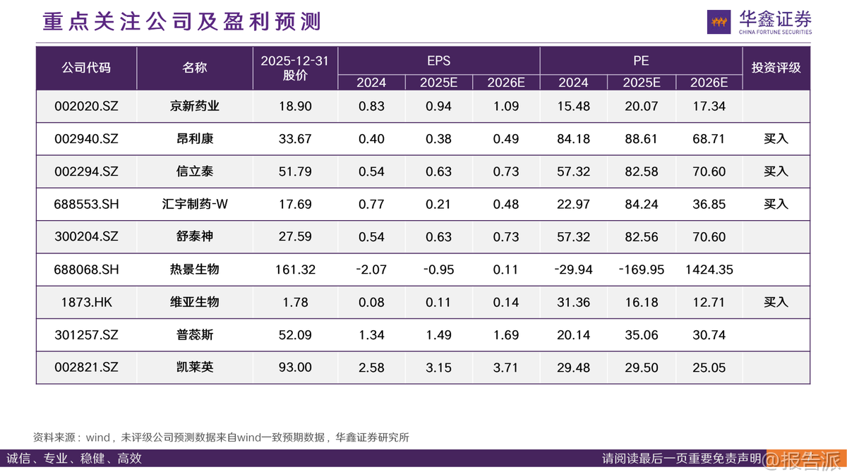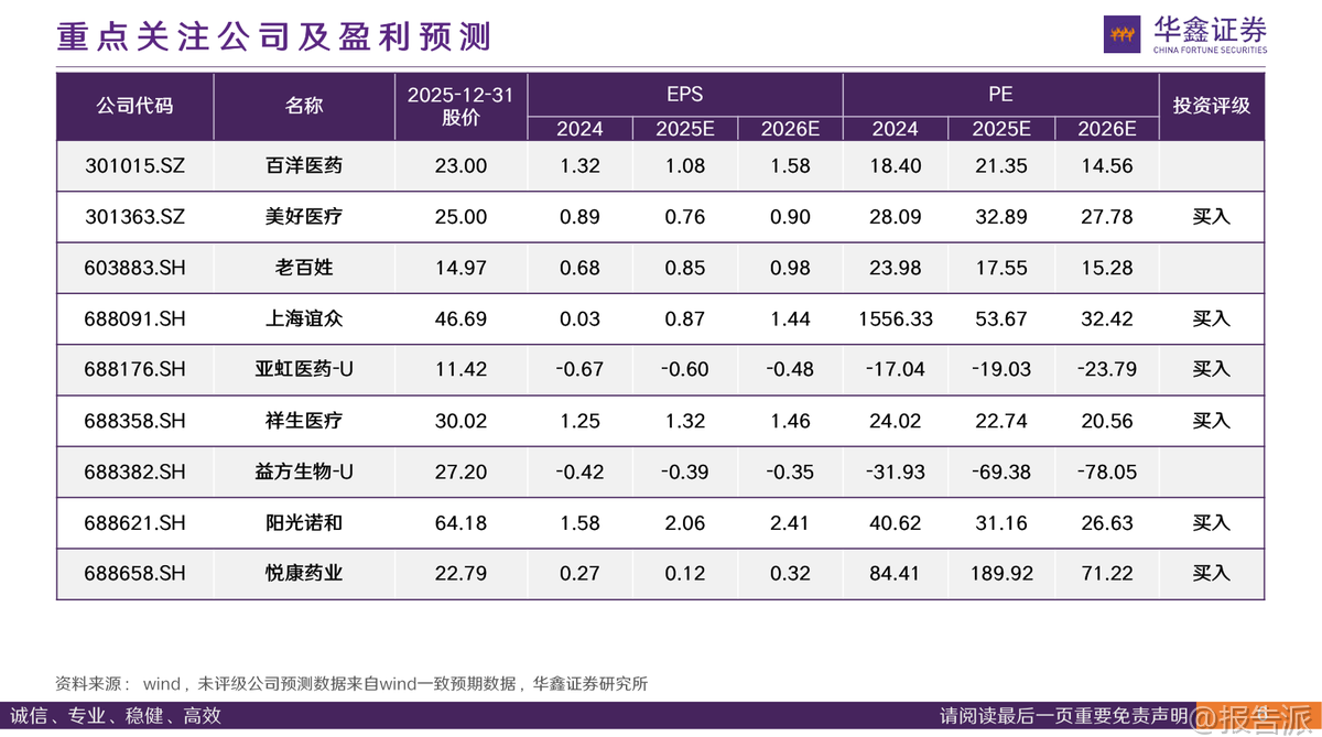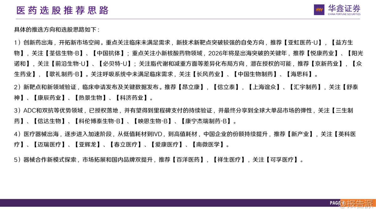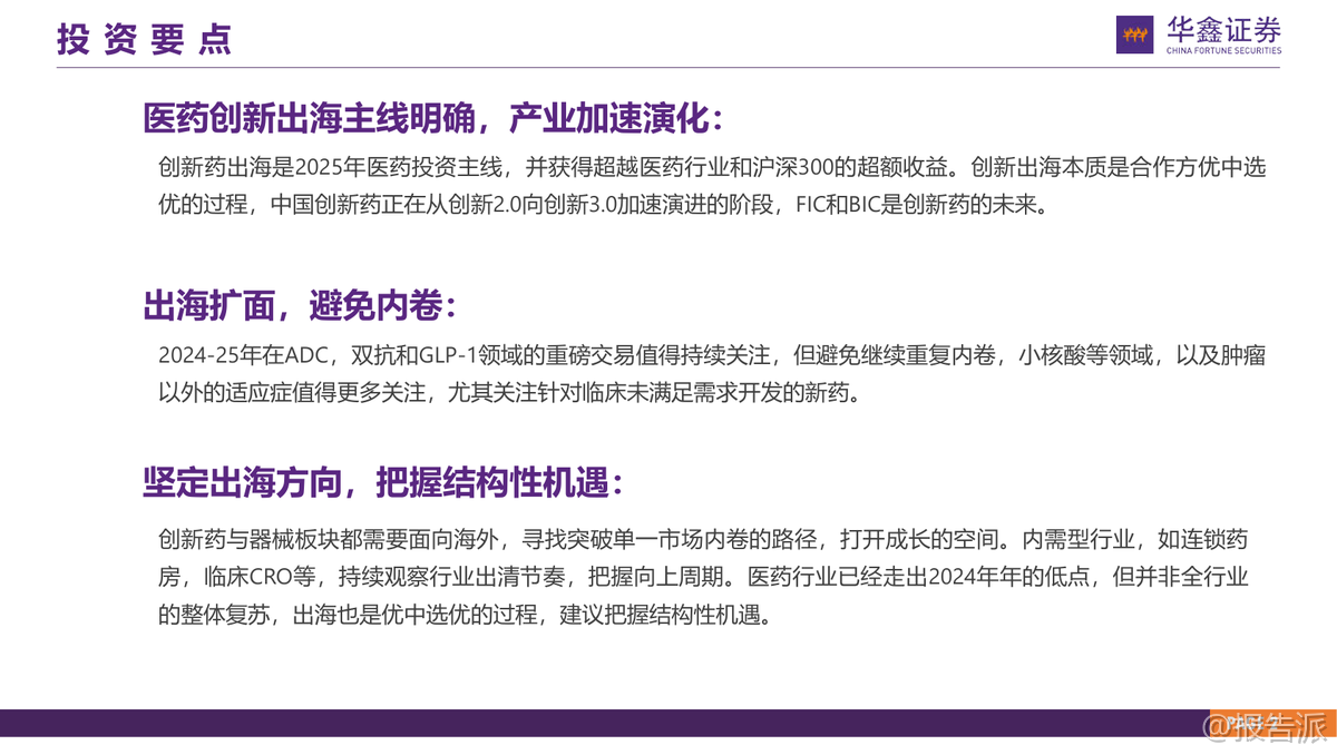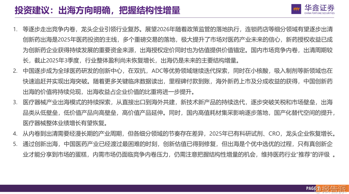 | 在刚刚过去的2025年,中国医药行业迎来了关键转折点——创新药出海成为贯穿全年的投资主线,并显著跑赢大盘。 根据华鑫证券发布的《医药行业2026年策略报告》,创新药指数全年涨幅达38.88%,相较医药生物指数超额收益超30个百分点,市场信心因多项重磅授权交易落地而大幅提振。 这份发布于2025年末的策略报告明确指出:出海已不再是备选项,而是破局内卷、打开成长天花板的核心路径。 报告深入剖析了当前中国医药产业的结构性变化。 一方面,国内市场竞争持续内卷,尤其在热门靶点和同质化研发领域,盈利恢复缓慢。 截至2025年三季度,行业整体盈利尚未实现增长,政策监管与集采压力仍在重塑格局。 另一方面,以ADC(抗体偶联药物)、双抗为代表的中国优势技术领域不断取得突破,小核酸、细胞与基因治疗等新兴平台也加速迈向国际化。 2025年前三季度,全球创新药TOP10交易中,有8项来自中国企业,首付款总额高达45.51亿美元,甚至超过同期一级市场融资总额,标志着“研发—出海—再投入”的正向循环正在形成。 出海的本质是“优中选优”。 报告强调,随着Me-too类药物面临激烈竞争,中国创新药正从“创新2.0”向“创新3.0”跃迁,即从快速跟进(Fast-follow)转向同类最优(BIC)和同类首创(FIC)。 对外授权不仅是资金来源,更成为估值的重要锚定点。 未来,只有真正具备源头创新能力的企业,才能在全球市场分得蛋糕。 值得关注的是,除肿瘤领域外,自免、代谢、呼吸系统等临床未满足需求巨大的非肿瘤适应症正成为MNC布局重点,为差异化创新提供广阔空间。 医疗器械领域的出海同样进入升级阶段。 从早期低值耗材的ODM/OEM模式,逐步向高值耗材、IVD及高端医疗设备延伸。 2025年上半年,高值耗材出口增速领先整体器械板块,在美国市场仍录得9%的增长。 尽管欧美认证壁垒高、投入周期长,但南微医学、春立医疗等企业已通过海外渠道建设实现境外收入复合增速超20%,出口正成为抵御国内市场波动的新引擎。 与此同时,内需型细分领域正处于出清与整合的关键期。 连锁药店行业首次出现关店数超过新开店数的拐点,头部企业如益丰药房、老百姓等主动优化门店结构,利润逐步回升。 药品追溯码政策将于2026年全面落地,有望从技术上杜绝虚假报销,推动行业公平竞争与集中度提升。 CRO/CDMO产业链复苏节奏分化,承接海外订单的CDMO企业率先回暖,而临床服务、安评等领域仍在出清尾声。 展望2026年,报告维持对医药行业的“推荐”评级,提出十大选股思路:一是聚焦创新药出海,推荐亚虹医药、益方生物、悦康药业、阳光诺和等;二是关注新靶点验证进展,推荐昂立康、信立泰等;三是跟踪ADC/双抗已授权品种的里程碑兑现;四是布局器械出海加速标的,如新产业、迈瑞医疗;五是探索器械合作新模式;六是前瞻脑机接口技术突破;七是把握CXO景气修复机会;八是关注研发平台型企业;九是优选连锁药房龙头;十是挖掘合成生物学产业化潜力。 风险方面,报告提示需警惕研发失败、销售不及预期、竞争加剧及政策变动等不确定性。 总体来看,中国医药产业已渡过最困难时期,创新价值正被全球重新定价。 2026年,唯有坚持真创新、坚定出海方向、把握结构性机遇的企业,方能在新一轮全球竞争中脱颖而出。 本文由【报告派】研读,输出观点仅作为行业分析! 原文标题:2025-12-31-华鑫证券-华鑫证券-医药行业2026年策略报告:坚定出海方向,把握结构性机遇 发布时间:2025年 报告出品方:华鑫证券