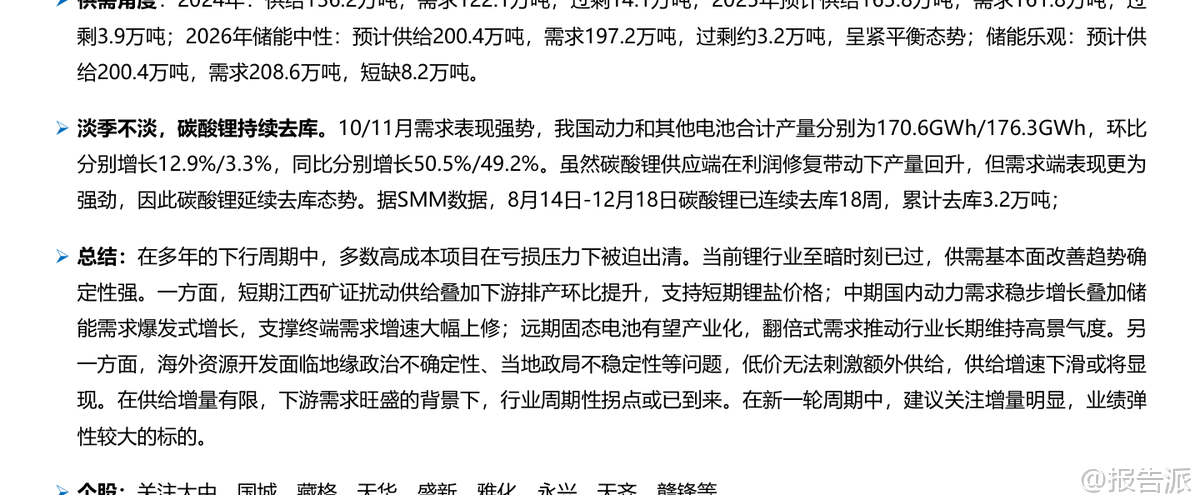 | 在经历了多年的下行周期后,锂行业正迎来关键拐点。 根据华福证券发布的《锂行业深度报告》,当前锂价已触底,供需格局正在加速修复,行业景气度有望迎来新一轮上行周期。 核心驱动因素来自储能需求的爆发式增长、固态电池产业化预期以及供给端增量有限的现实约束。 从供需基本面来看,2024年全球锂供给为136.2万吨LCE(碳酸锂当量),需求为122.1万吨,过剩14.1万吨,市场仍处于供大于求状态。 但进入2025年,供需关系显著改善,预计供给165.8万吨,需求161.8万吨,仅过剩3.9万吨,过剩量大幅收窄。 展望2026年,在储能“中性假设”下,供需将趋于紧平衡,过剩约3.2万吨;而在“乐观假设”下,需求或将达到208.6万吨,远超200.4万吨的供给,出现8.2万吨的短缺,这预示着锂价具备强劲的反弹基础。 一个重要的趋势是“储能”已成为拉动锂需求的“第二成长曲线”。 2024年,全球新型储能累计装机规模同比增长81.1%,其中锂离子电池占比高达97%。 中国作为全球最大的储能市场,新型储能装机同比大增126.5%。 报告预测,2025年全球储能电池需求将达到555GWh,2026年在乐观情景下有望飙升至943GWh。 这一领域的高速增长,有效对冲了新能源汽车增速放缓带来的影响,成为支撑终端需求增速大幅上修的核心动力。 与此同时,下游需求表现“淡季不淡”,持续推动库存去化。 2025年下半年,尽管传统上为淡季,但我国动力电池和其他电池产量依然保持强劲增长。 10月和11月合计产量分别达到170.6GWh和176.3GWh,同比增速均接近50%。 旺盛的需求使得碳酸锂延续去库态势,据SMM数据,自8月14日至12月18日,已连续18周去库,累计减少库存3.2万吨,反映出产业链的实际消耗能力远超市场预期。 供给端方面,未来增量相对有限且不确定性较高。 澳洲作为传统供应大国,其2025年的新增产能主要依赖于2024年投产项目的爬坡,预计仅能贡献1.28万吨LCE的增量。 而非洲虽有赣锋Goulamina、紫金Manono等项目陆续投产,成为重要增量来源,但部分国家政局动荡可能影响开工率。 国内盐湖提锂在青海已有较快放量,但未来增量主力将转向西藏,如藏格矿业麻米错、国能龙木错等项目,建设周期较长。 此外,江西宜春地区的锂云母矿山因矿权审批问题面临补缴权益金的压力,短期供给受到扰动。 综合来看,全球锂资源开发普遍面临地缘政治风险和项目审批的不确定性,低价难以刺激额外供给,供给增速存在下滑风险。 长期来看,固态电池的产业化被视为行业的“翻倍式需求”驱动力。 其凭借高安全性、高能量密度的优势,有望成为下一代动力电池技术的主流方向,尤其在高端电动车和低空经济领域应用前景广阔,这将为锂行业提供长期的高景气度支撑。 投资策略上,报告认为,在“成长(量)主导,周期(价)为贝塔”的逻辑下,应重点关注那些拥有明确增量、业绩弹性较大的标的。 这些企业不仅能受益于行业整体复苏,更能通过自身产能扩张获得超额收益。 报告建议关注的公司包括:大中矿业、国城矿业、藏格矿业、天华新能、盛新锂能、雅化集团、永兴材料、天齐锂业、赣锋锂业等。 总而言之,该报告传递出一个清晰的信号:锂行业的至暗时刻已经过去。 随着储能需求的强力拉动和供需关系的持续优化,锂价底部确立,反弹可期。 未来行业将进入一个由需求结构多元化和技术创新共同驱动的新周期,具备优质资源和稳定扩产能力的企业将迎来价值重估的机遇。 本文由【报告派】研读,输出观点仅作为行业分析! 原文标题:原文标题:2025-12-31-华福证券-华福证券-锂行业深度报告:储能成为锂第二成长曲线加速修复供需平衡表,锂价底部已至反弹可期 发布时间:2025年 报告出品方:华福证券 文档页数:41页