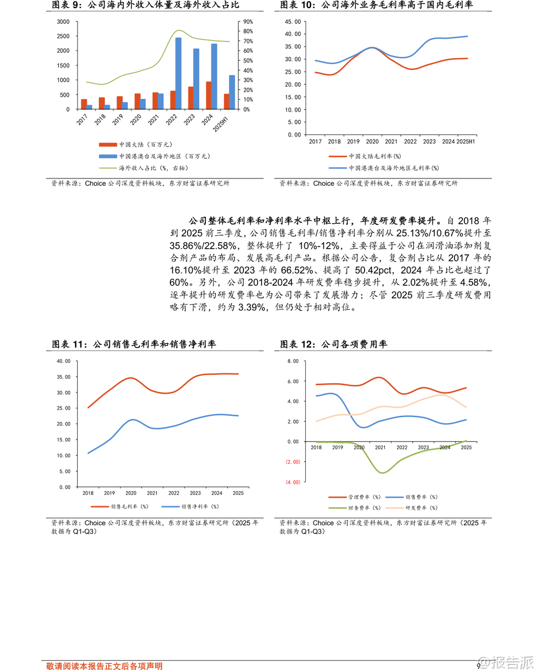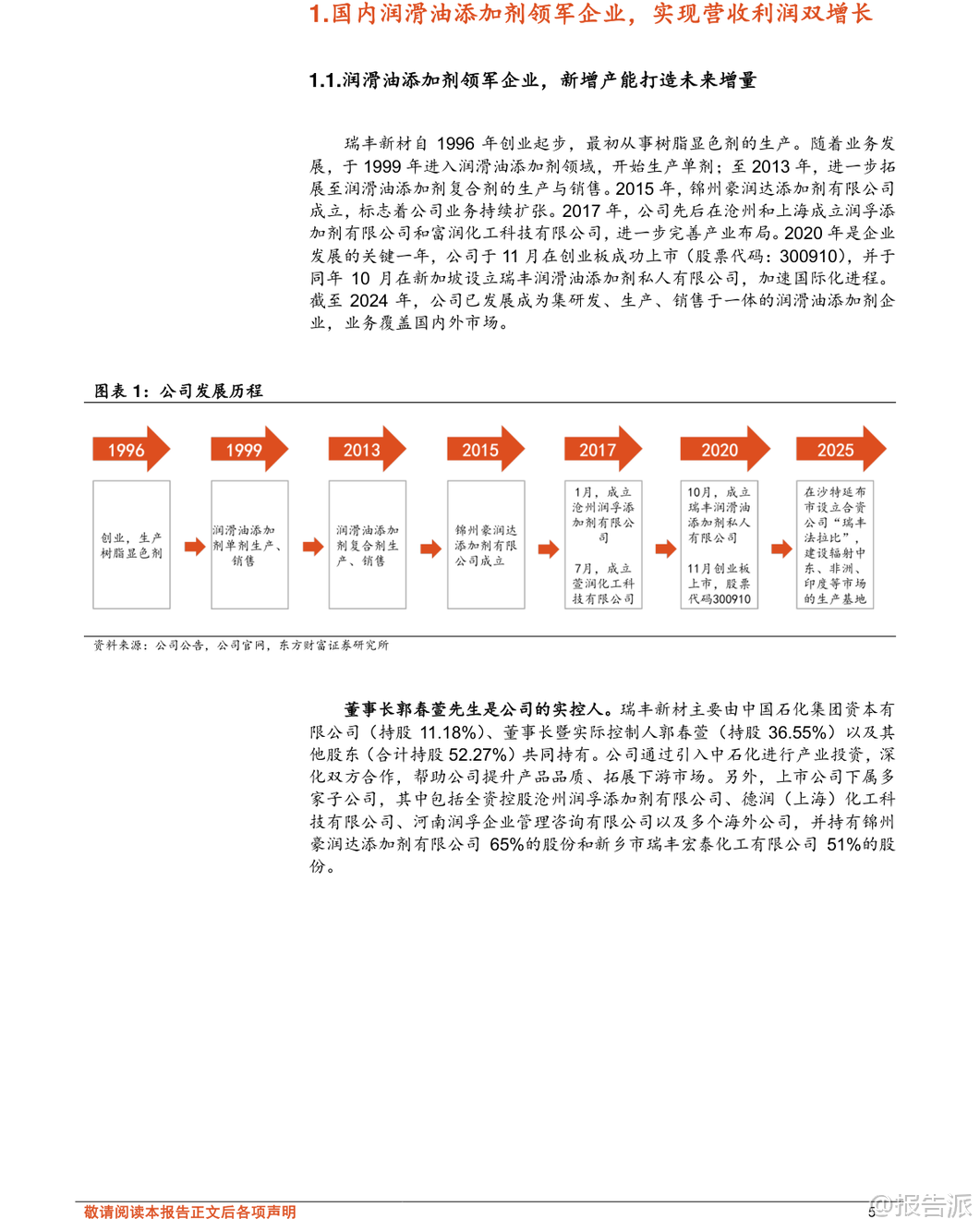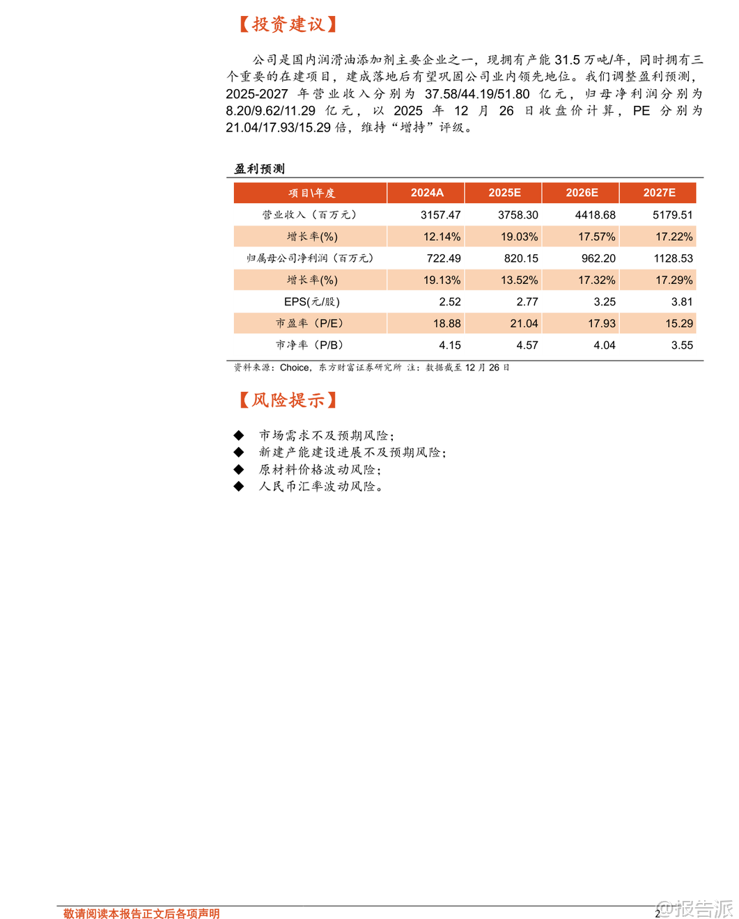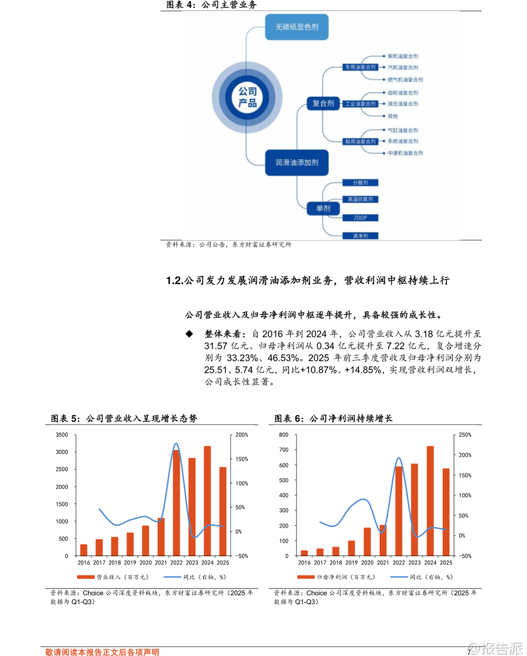 | 瑞丰新材(300910)作为国内润滑油添加剂行业的领军企业,近年来凭借技术积累与产能扩张,在全球市场中崭露头角。 公司自1996年创业起步,最初从事树脂显色剂生产,1999年进入润滑油添加剂领域,逐步从单剂向复合剂转型,并于2020年在创业板上市,标志着其发展迈入新阶段。 截至2024年底,公司现有产能达31.5万吨/年,另有在建产能43.5万吨/年,产能规模位居国内前列。 润滑油添加剂是提升润滑油性能的核心材料,广泛应用于汽车、船舶、工业设备等领域。 根据MRFR数据,2024年全球市场规模已达192.7亿美元,预计到2035年将增长至620.7亿美元,复合增速约11.22%。 目前全球市场由路博润、润英联、雪佛龙奥伦耐和雅富顿四大国际巨头主导,合计占据约85%的市场份额,形成高度集中的竞争格局。 而国内企业长期以生产单剂为主,复剂研发能力薄弱,进口依赖度高,国产替代空间巨大。 瑞丰新材正是在这一背景下实现突破。 公司不仅具备清净剂、分散剂、ZDDP、高温抗氧剂等主流单剂的完整自主生产能力,更成功向高附加值的复合剂领域转型。 目前已掌握CF-4、CH-4、CI-4、CK-4级柴油机油及SL、SM、SN、SP级汽油机油复合剂配方工艺,并通过多项国际权威第三方台架测试,获得多个OEM认证。 这意味着公司产品已具备进入全球主流供应链的技术门槛,打破了国外企业的长期垄断。 海外市场成为公司增长的重要引擎。 2022年,受益于国际局势变化带来的供应链重构机遇,瑞丰新材出口业务实现爆发式增长,当年海外收入达24.30亿元,同比大增367.80%,占总收入比重提升至79.77%。 尽管2023年因客户去库存导致短期回落,但2024年起恢复增长态势。 2025年上半年,中国港澳台及海外地区毛利达4.49亿元,占总毛利的74.35%,且毛利率持续高于国内市场约9-10个百分点,显示出强大的盈利能力与国际竞争力。 为巩固优势并拓展全球布局,公司在产能扩张方面动作频频。 当前有三大重点项目在建:新乡年产15万吨润滑油添加剂项目工程进度约75%,锦州10万吨项目进度约70%,另有一个年产46万吨项目进度约40%,预计将在2026年陆续投产。 这些项目落地后将进一步扩大产能优势,满足不断增长的国内外需求。 更具战略意义的是,公司正携手沙特阿拉伯Farabi Downstream Company,在延布市合资建设润滑油添加剂生产基地——瑞丰法拉比公司。 该项目计划总投资约2.46亿美元,分两至三期建设,涵盖核心单剂与主流复合剂品种,旨在辐射中东、非洲、印度等市场,贴近国际客户需求,提升本地化服务能力与响应效率。 此举不仅是产能输出,更是全球化品牌与服务体系的构建,有望显著增强客户粘性与长期竞争力。 财务表现上,公司营收与利润持续双增。 2016年至2024年,营业收入从3.18亿元增至31.57亿元,归母净利润从0.34亿元增至7.22亿元,复合增速分别达33.23%和46.53%。 2025年前三季度营收25.51亿元,同比增长10.87%;归母净利润5.74亿元,同比增长14.85%。 复合剂收入占比从2017年的16.10%大幅提升至2023年的66.52%,带动整体毛利率由2018年的25.13%上升至2025年前三季度的35.86%,净利率也提升至22.58%,反映出产品结构优化带来的盈利质量跃升。 尽管前景广阔,报告也提示了若干风险:一是市场需求受汽车、船舶等行业景气度影响,存在不及预期可能;二是新建产能建设或投产进度若滞后,将影响放量节奏;三是原材料如苯、烯烃等价格随原油波动,可能挤压利润;四是人民币汇率变动对高海外收入占比的企业带来汇兑损益压力。 综合来看,瑞丰新材已从一家区域性单剂厂商成长为具备全球竞争力的综合性添加剂供应商。 其“单剂+复剂”双轮驱动、“国内扩产+海外建厂”双线布局的战略清晰且执行力强。 在全球高端添加剂国产替代趋势加速、新能源车热管理与传动系统催生新型润滑需求的背景下,公司有望借助技术和产能优势,持续提升全球市占率。 东方财富证券预测,2025-2027年公司归母净利润将达8.20亿、9.62亿、11.29亿元,维持“增持”评级。 对于关注新材料、高端制造出海的投资人而言,瑞丰新材是一个值得长期跟踪的优质标的。 本文由【报告派】研读,输出观点仅作为行业分析! 原文标题:2025-12-30-东方财富证券-东方财富证券-瑞丰新材(300910)深度研究:润滑油添加剂领军企业,国内扩产&海外建设基地助力长期增长 发布时间:2025年 报告出品方:东方财富证券